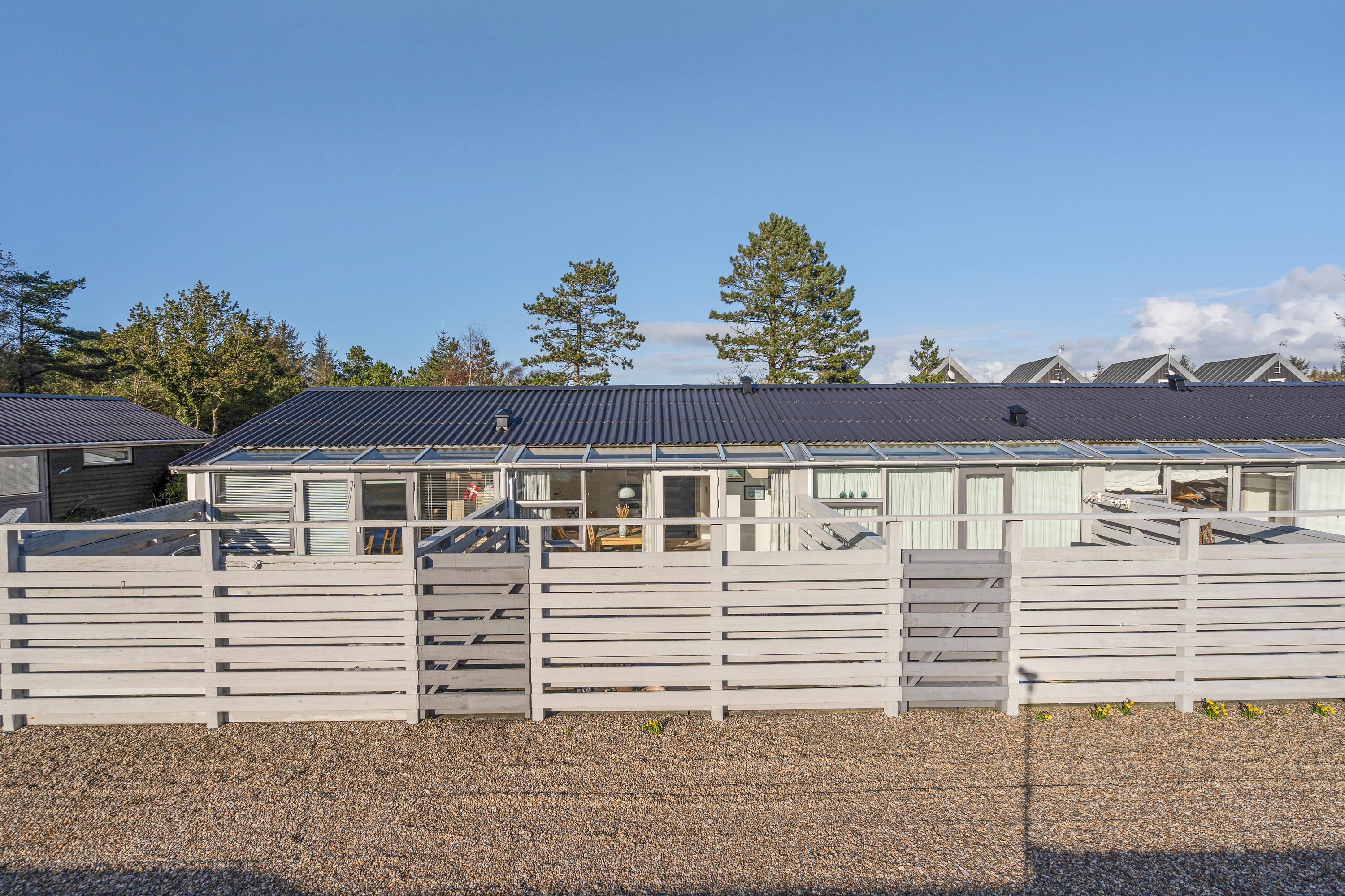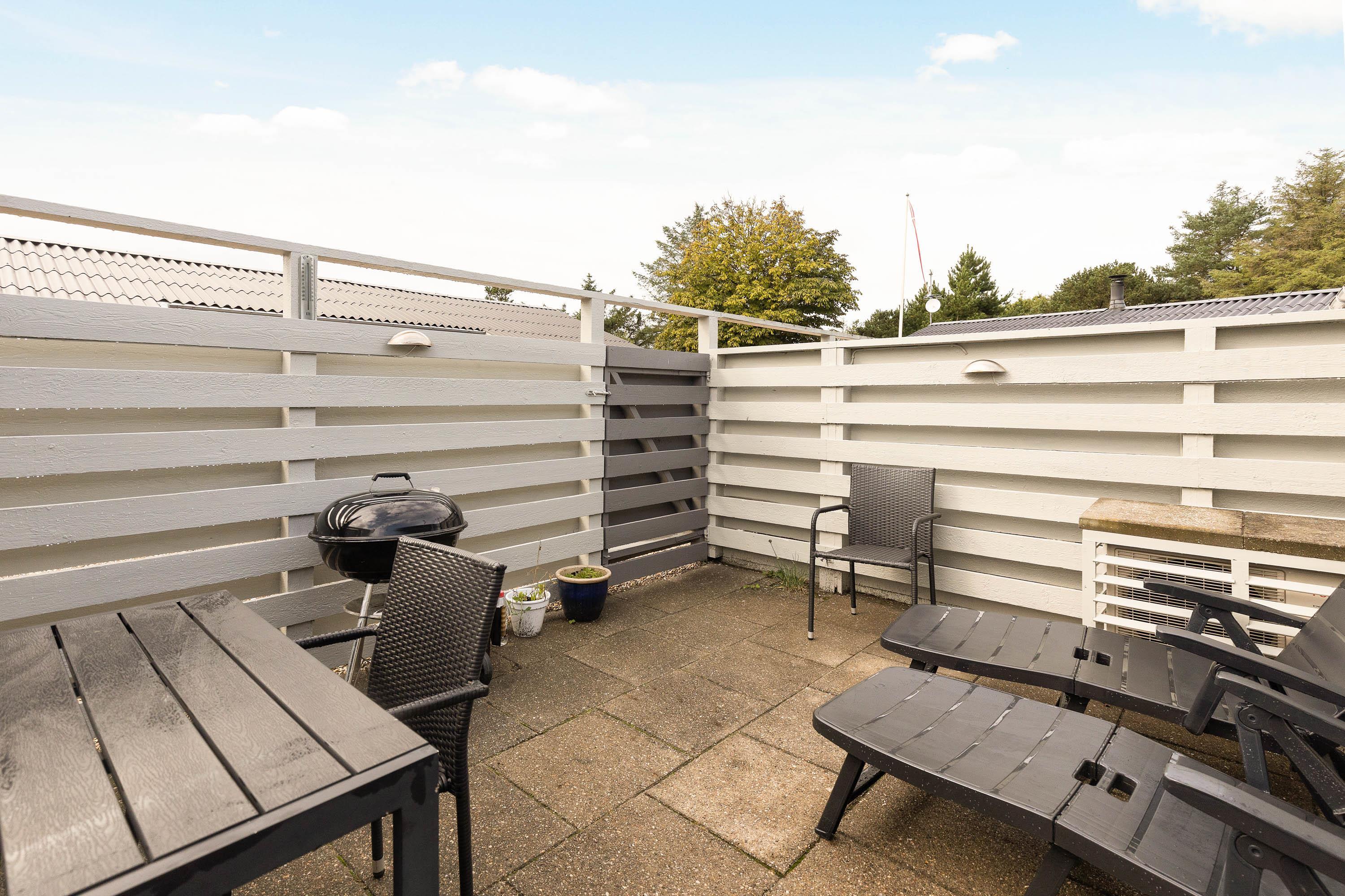 Fra ferielejlighedens alrum kan I træde direkte ud på den afskærmede, lukkede terrasse, hvor der står havemøbler og liggestole klar, som I kan sætte jer godt til rette i på de solrige feriedage, mens I nyder varmen og bare slapper helt af.