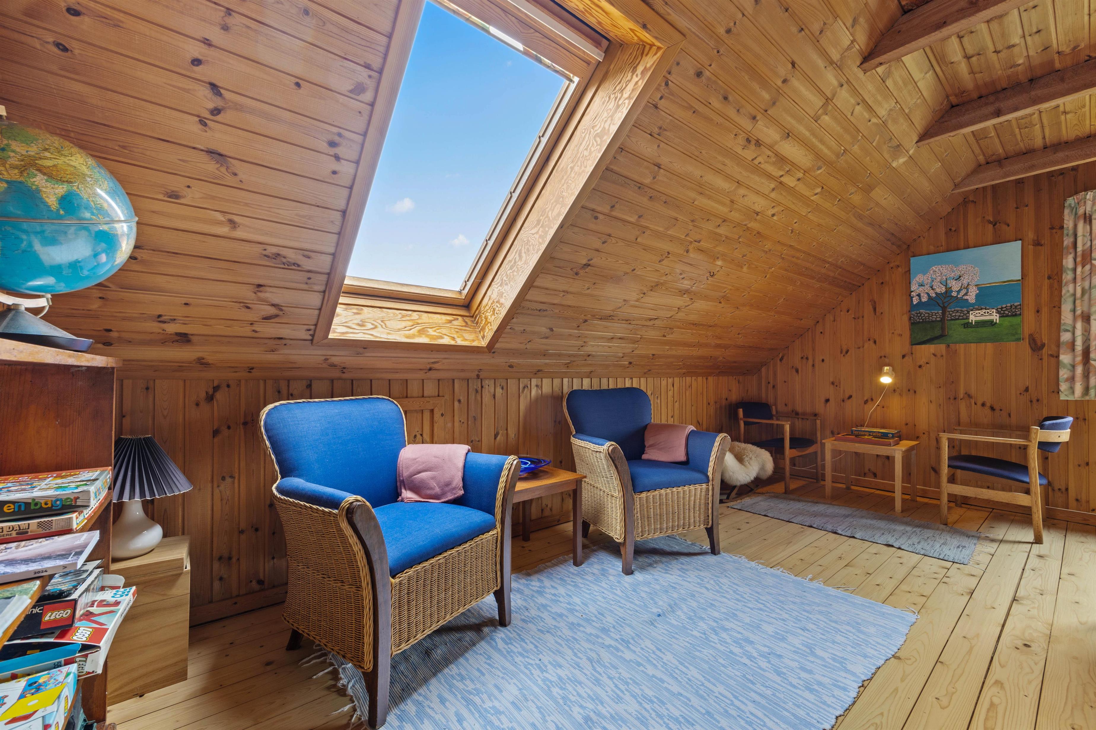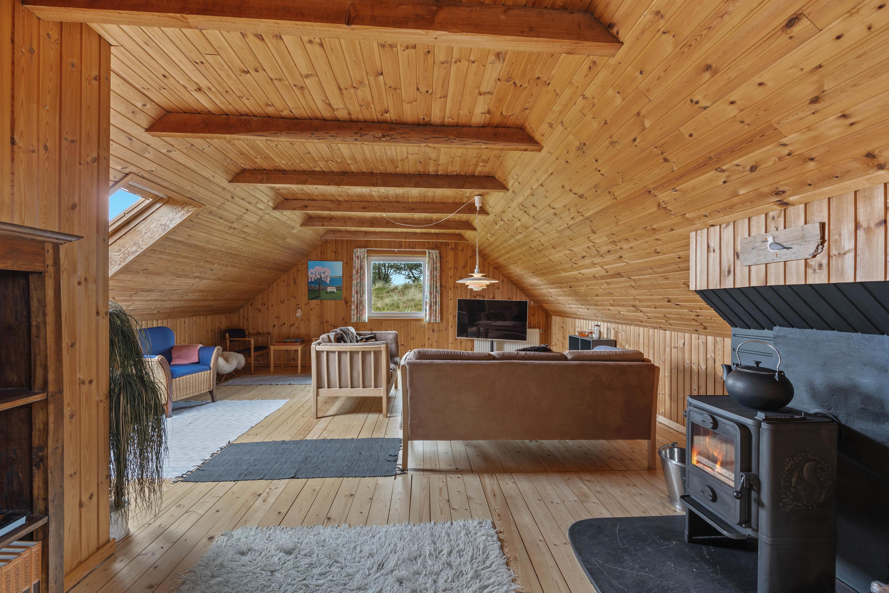 På 1. sal finder I en rummelig opholdsstue med skråvægge, gamle plankegulve og hyggelig indretning. Her kan I slappe af på sofaen foran fjernsynet, nyde den knitrende ild i brændeovnen eller spille en gang bordfodbold. I soveværelset ved siden af er en komfortabel dobbeltseng, hvor I kan få en god nattesøvn i den friske vesterhavsluft.