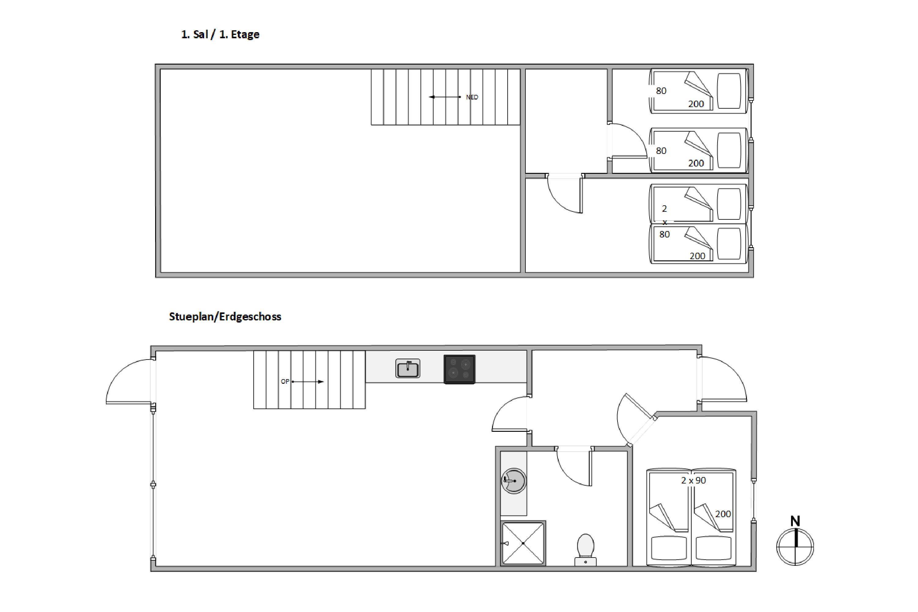 Lejligheden er fordelt på to etager, hvor du på første sal finder to soverum med en køjeseng og to enkeltsenge. Stueetagen byder på et lækkert soveværelse med en dobbeltseng og et dejligt lyst badeværelse. Derudover finder du det lækre og imødekommende køkken og stuen, som byder op til afslapning.