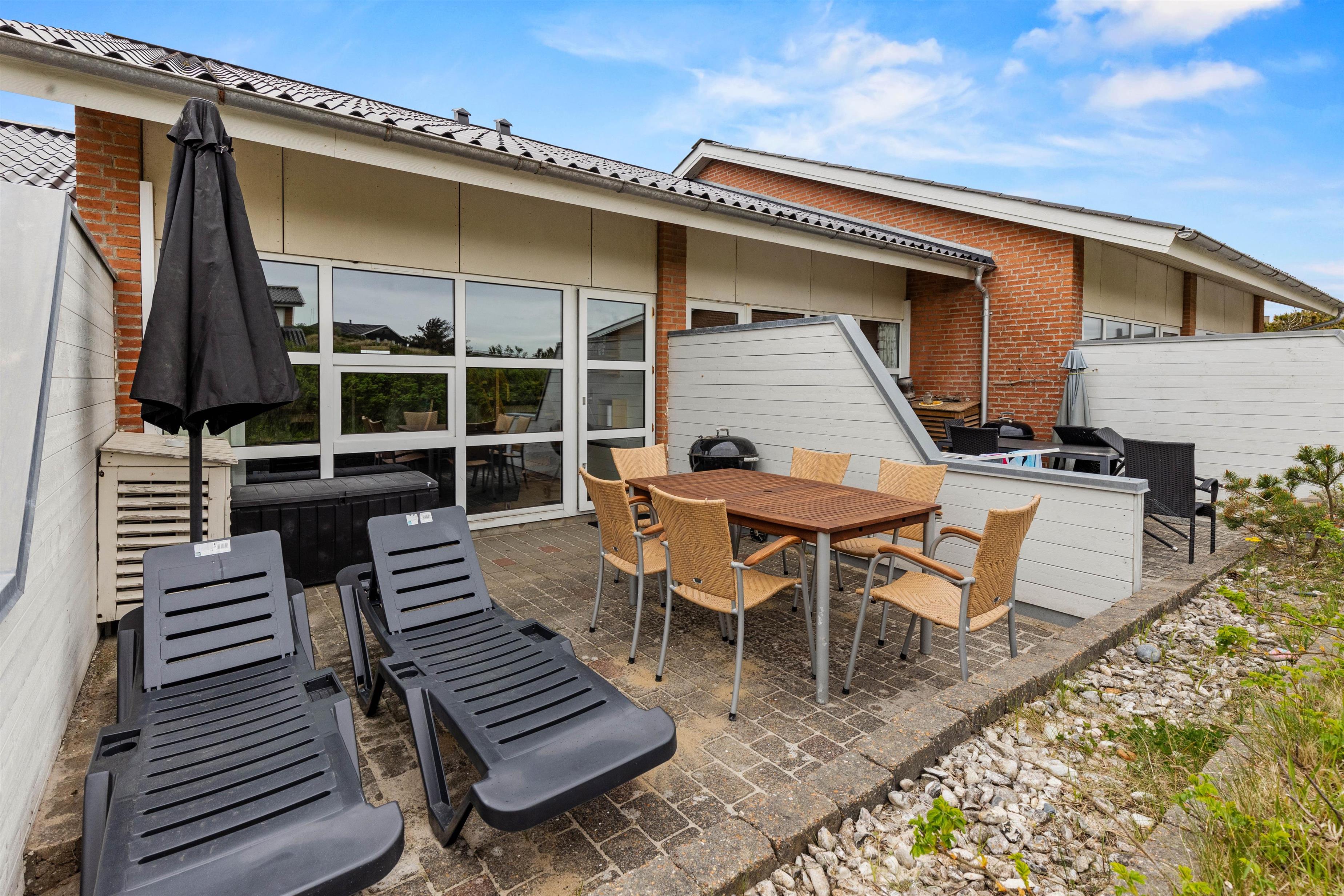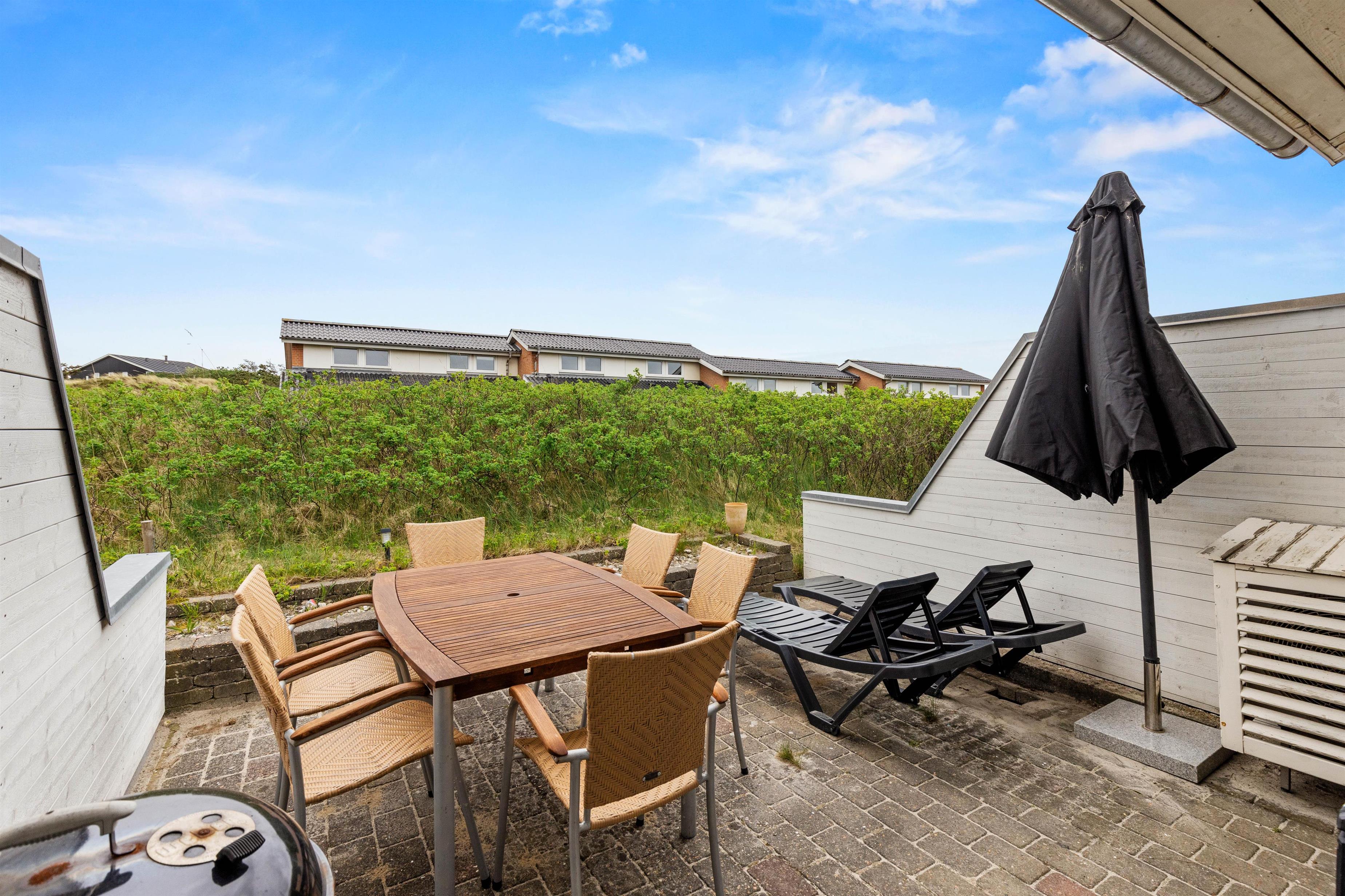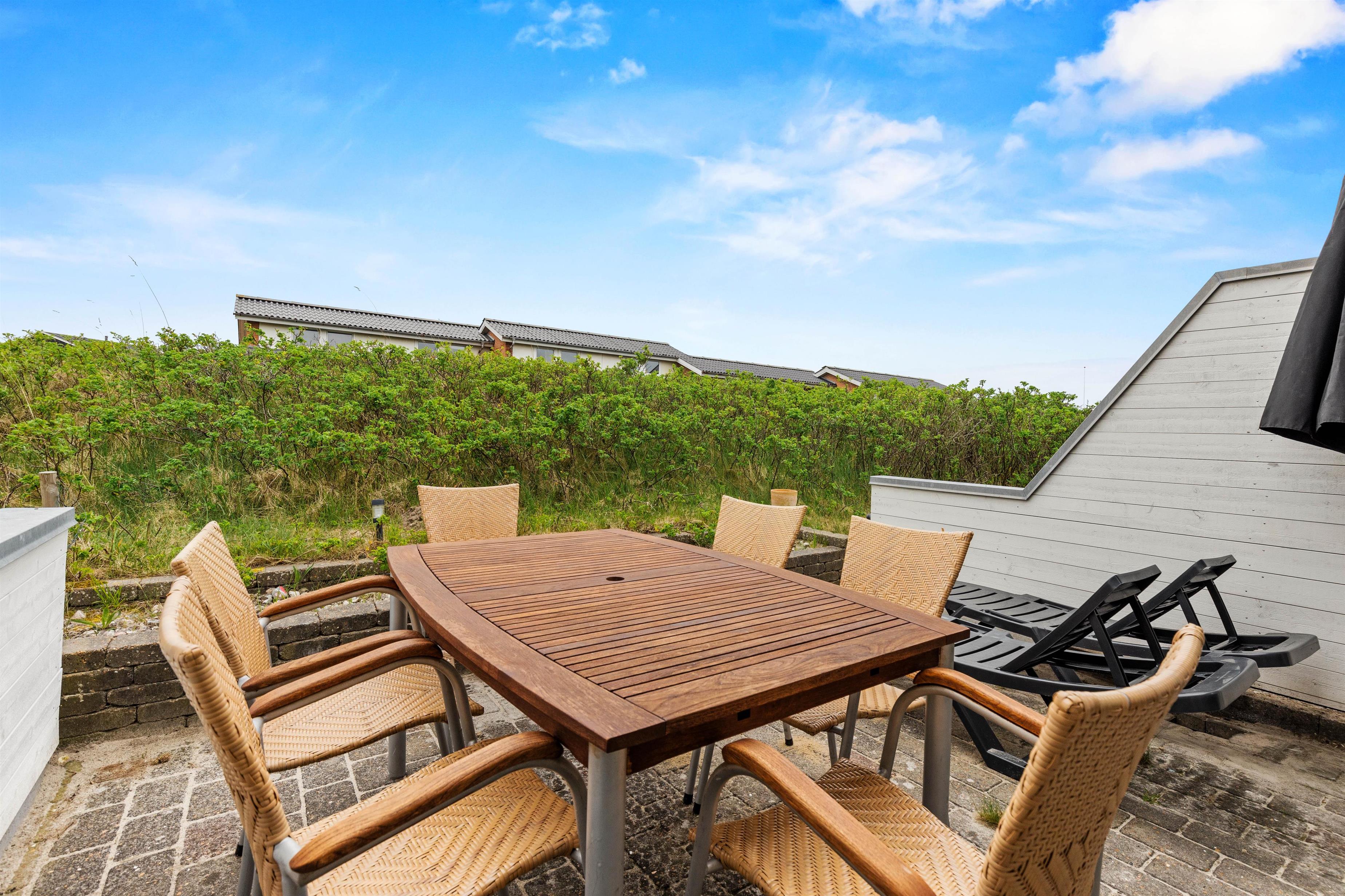 Fra stuen er der udgang til den afskærmede terrasse, som er det perfekte sted, at sætte sig til rette, lægge fødderne op og bare slappe af. Efter en lang dag med masser af frisk havluft og kilometer lange traveture med hunden langs stranden er der ikke noget skønnere end at åbne op ud til terrassen, finde en plads i læ og bare at slappe af og lade dagen gå på hæld med en kop te eller en kølig drink.