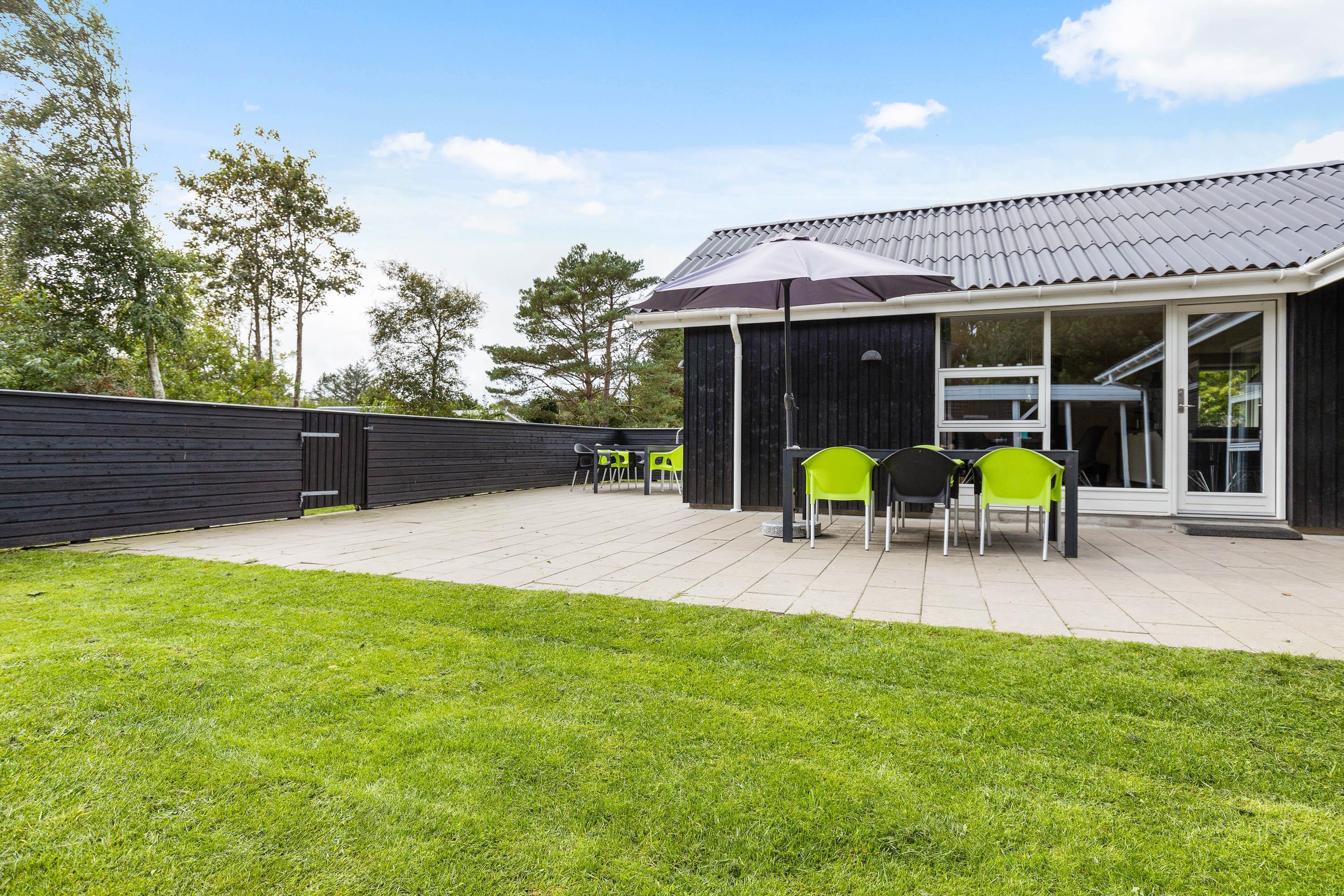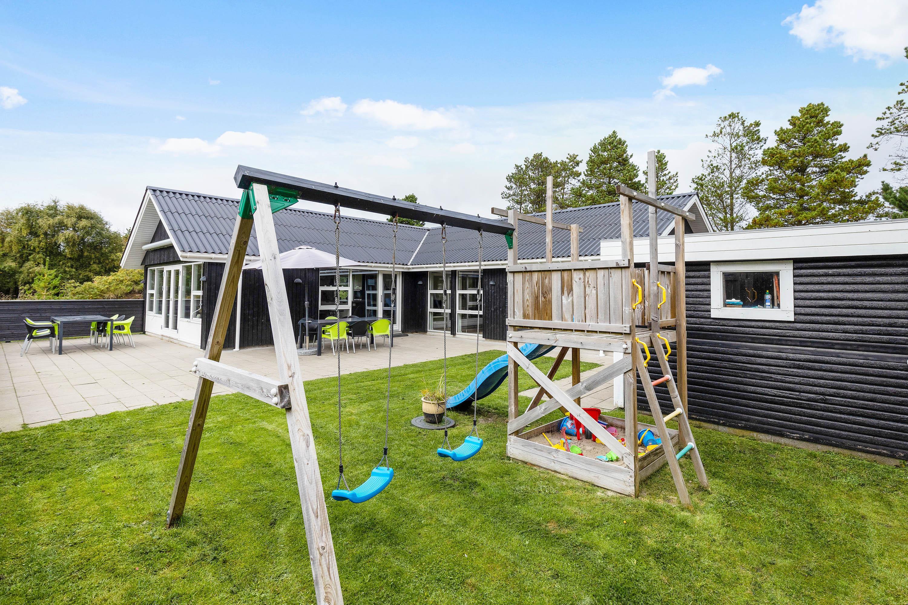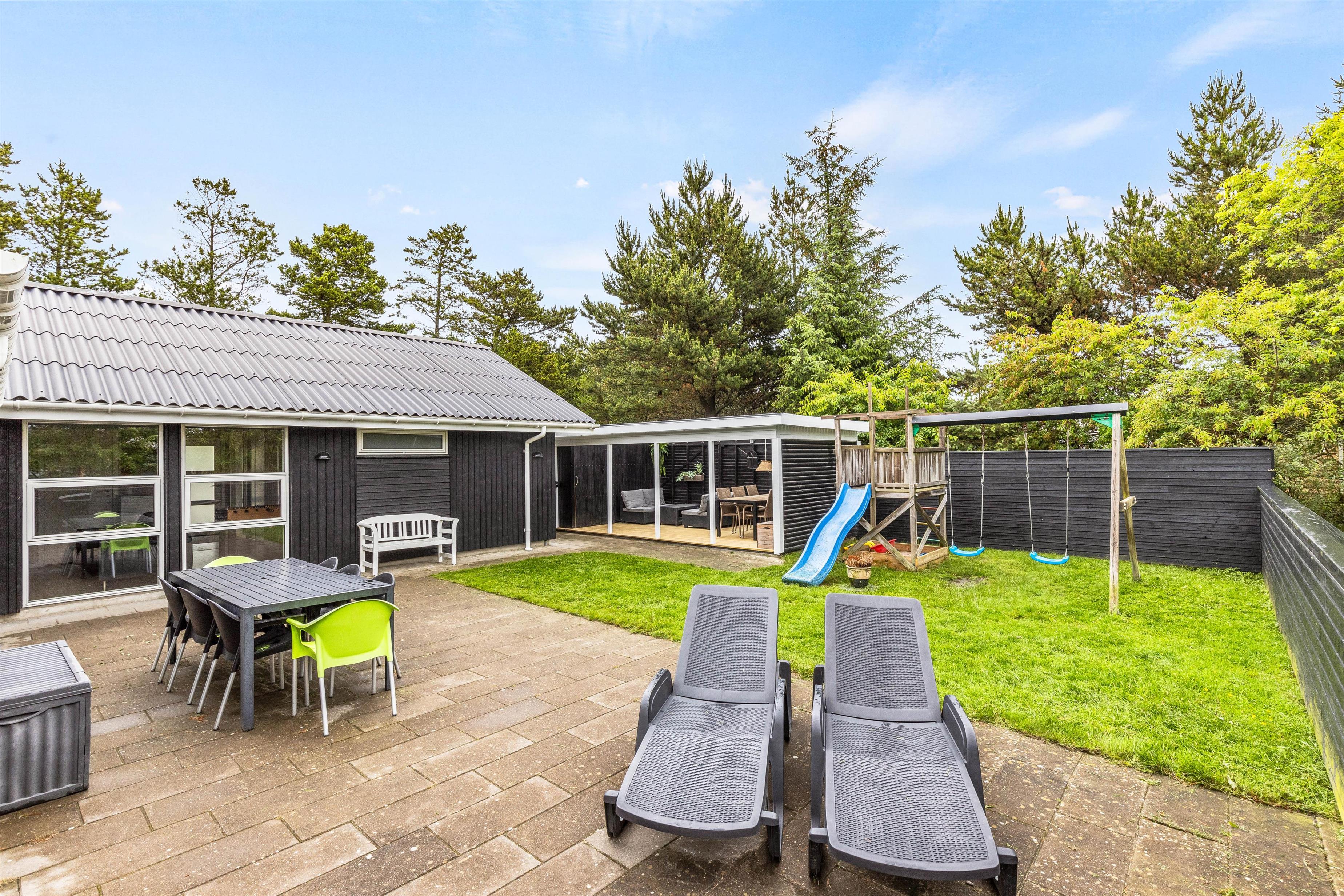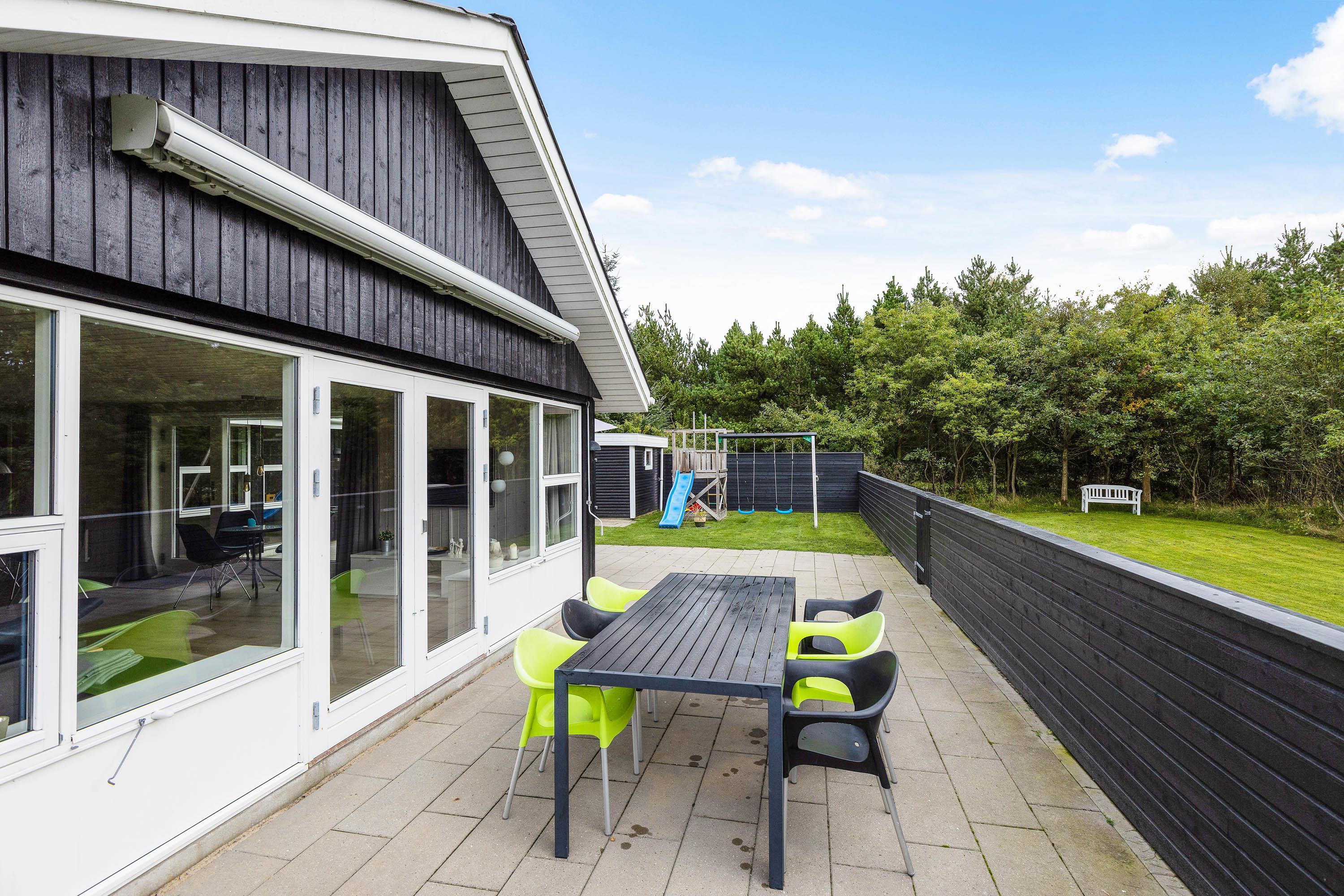Det er ikke kun indvendigt, sommerhuset er spækket med fede feriehighlights. I får også et helt fantastisk udendørsareal. En stor, lukket terrasse – med markise! – sørger for, at I roligt kan lade både børnene og hundene lege, mens I læser en god bog i solen. På terrassen befinder der sig desuden et stykke græsplæne og et legeområde til børnene.