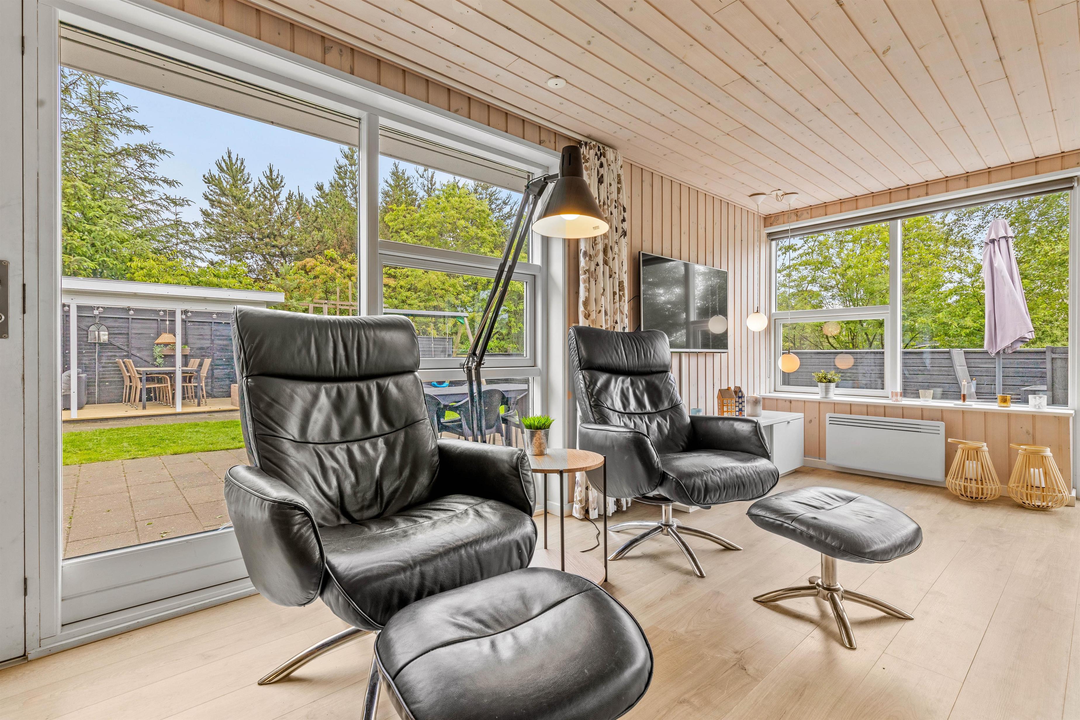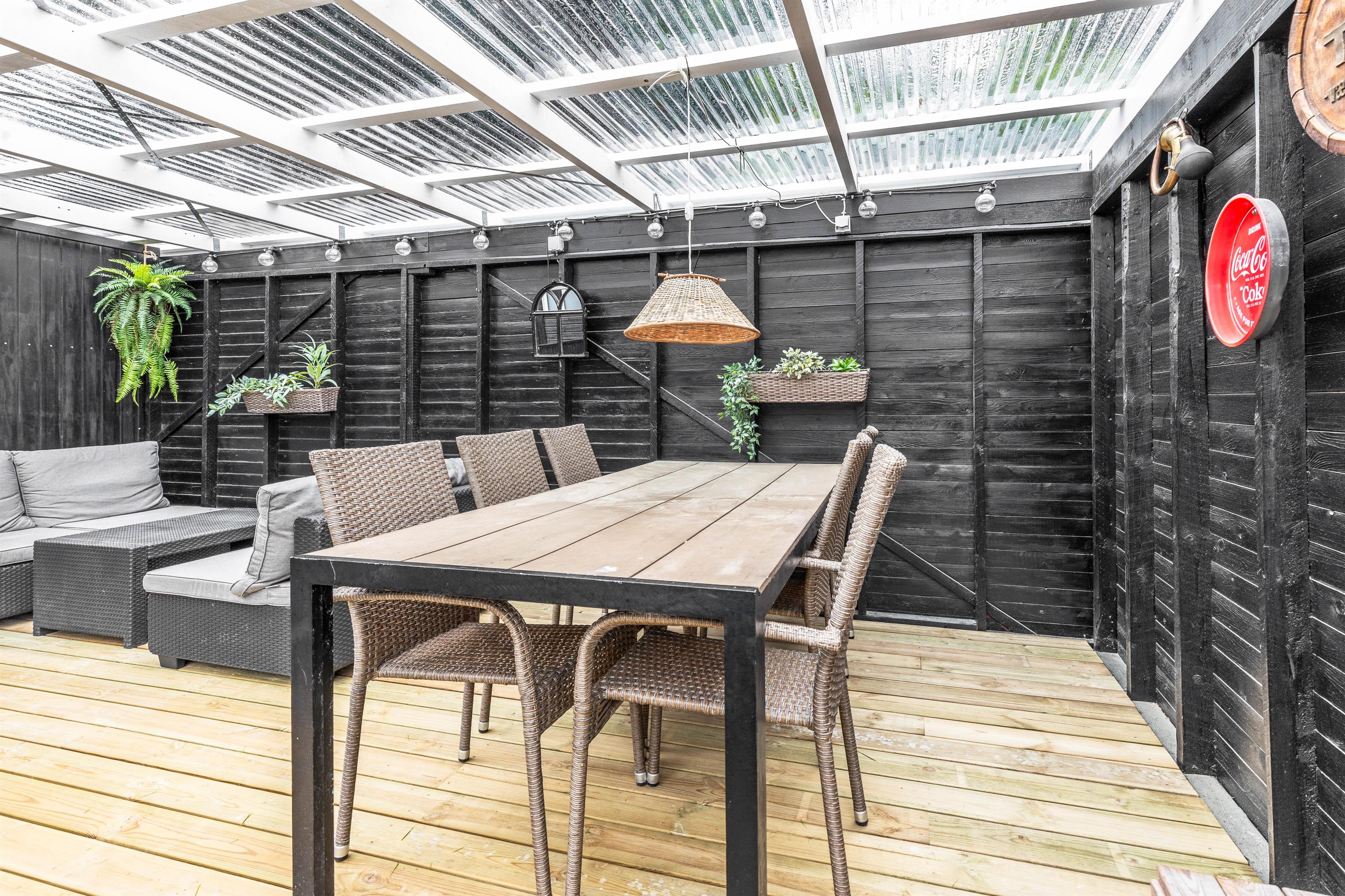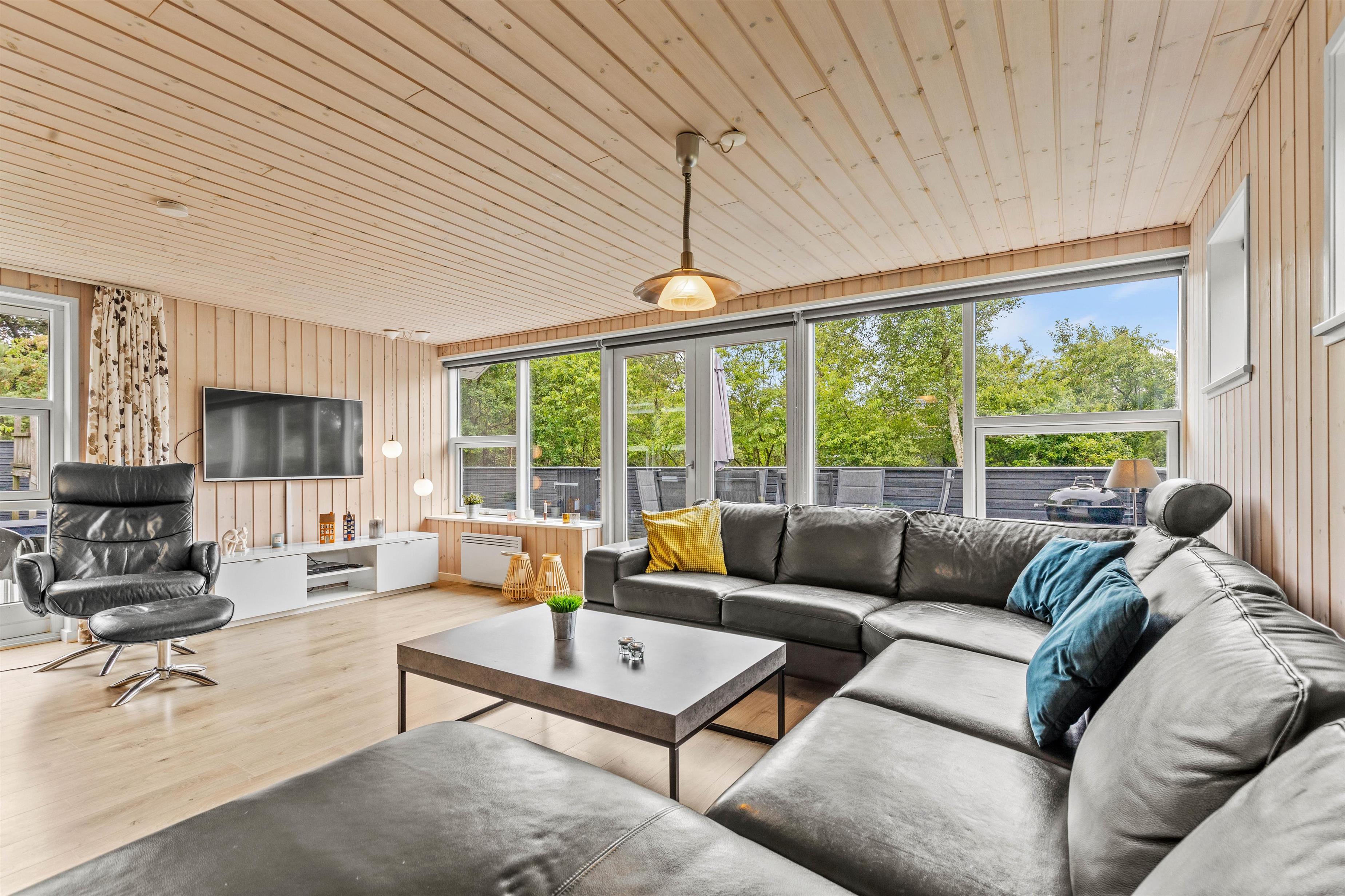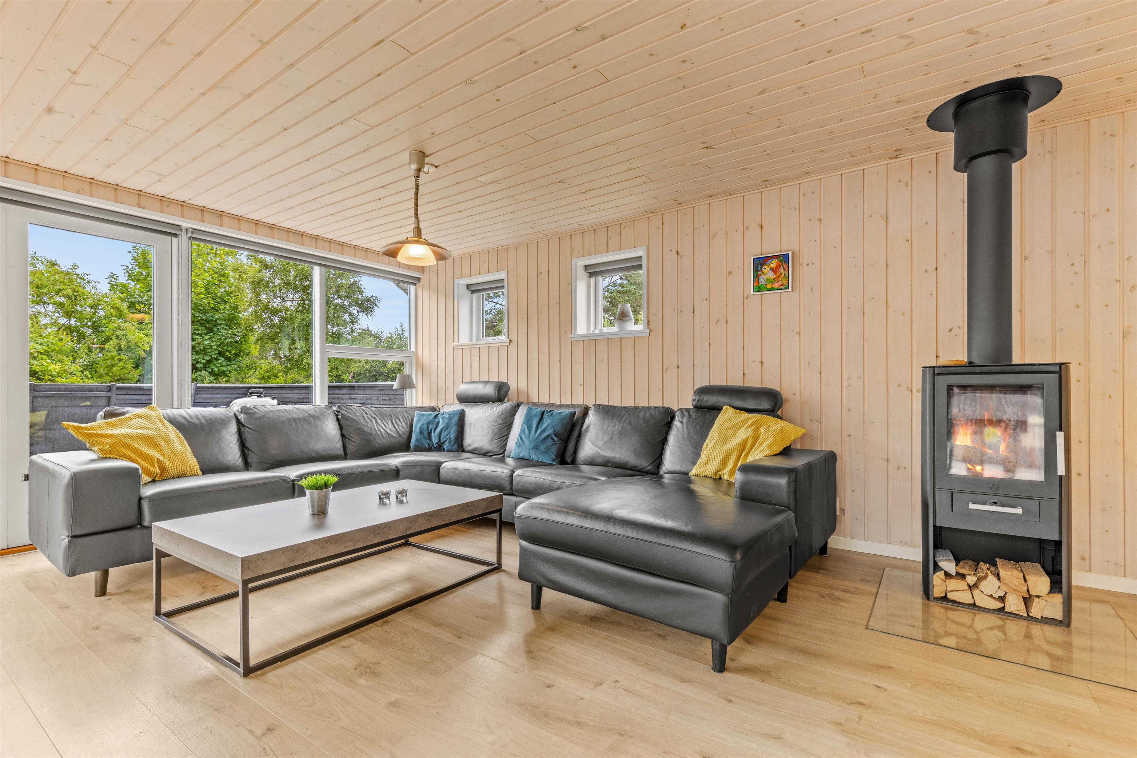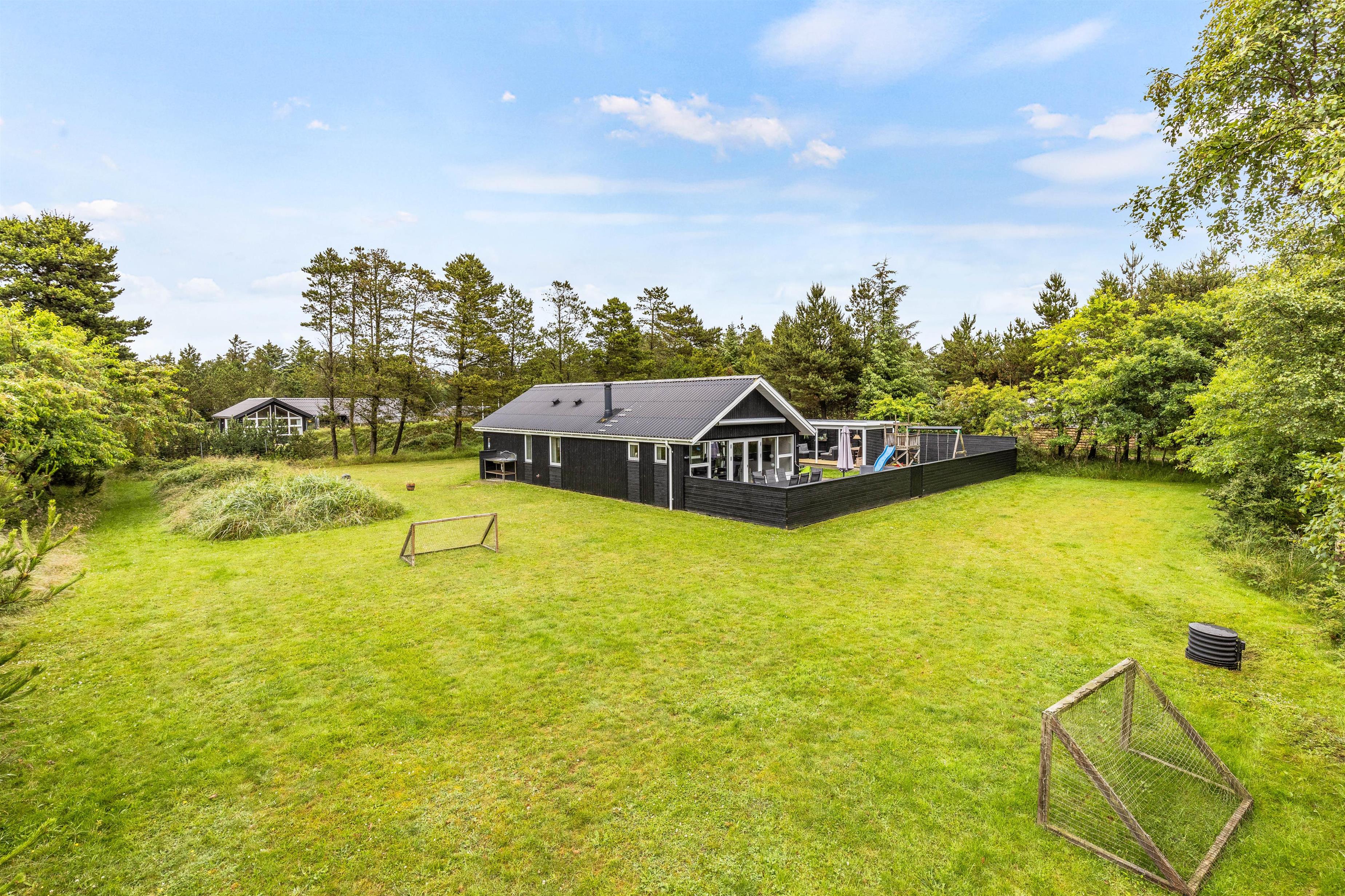 Det er ikke kun indvendigt, sommerhuset er spækket med fede feriehighlights. I får også et helt fantastisk udendørsareal. En stor, lukket terrasse – med markise! – sørger for, at I roligt kan lade både børnene og hundene lege, mens I læser en god bog i solen. På terrassen befinder der sig desuden et stykke græsplæne og et legeområde til børnene.