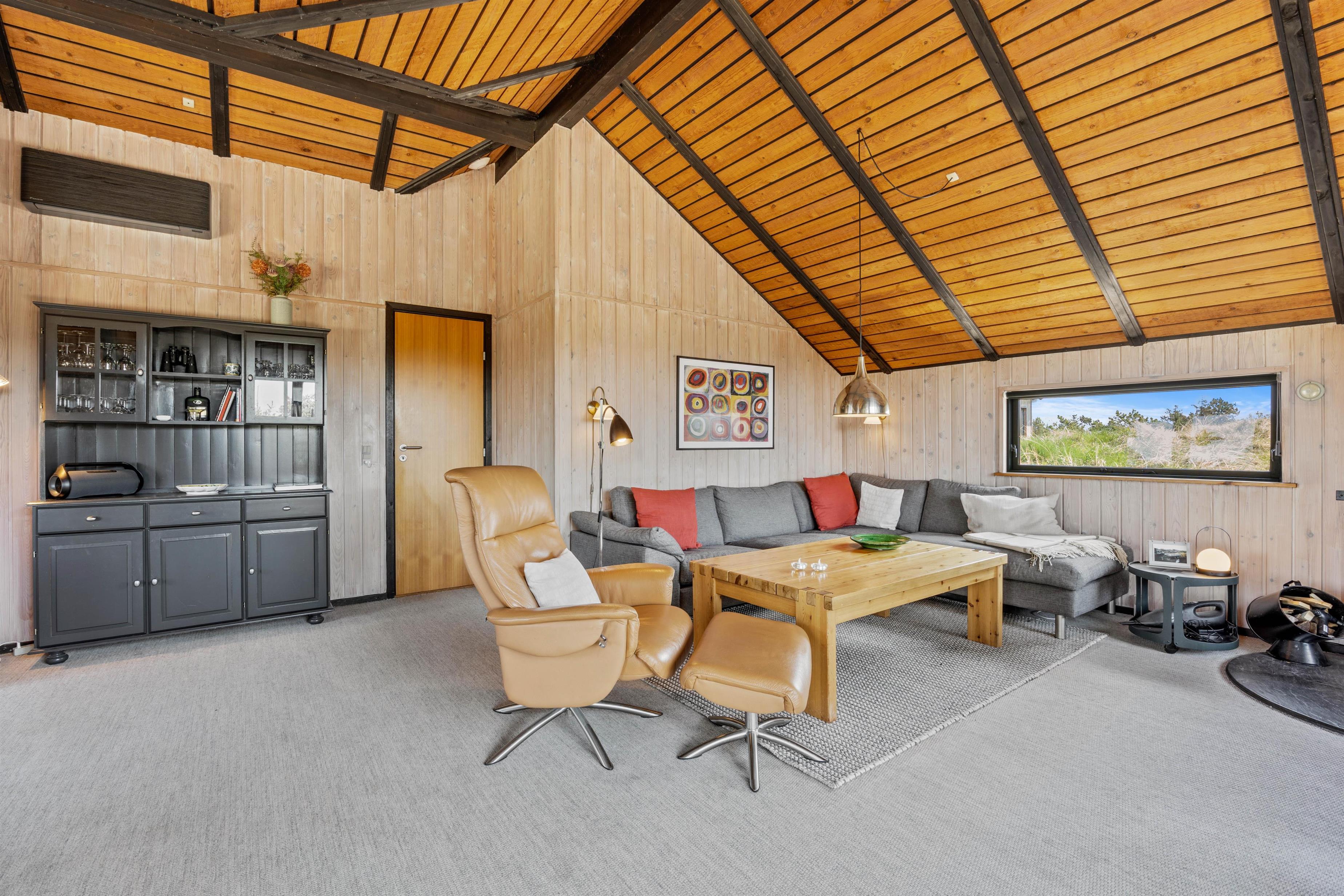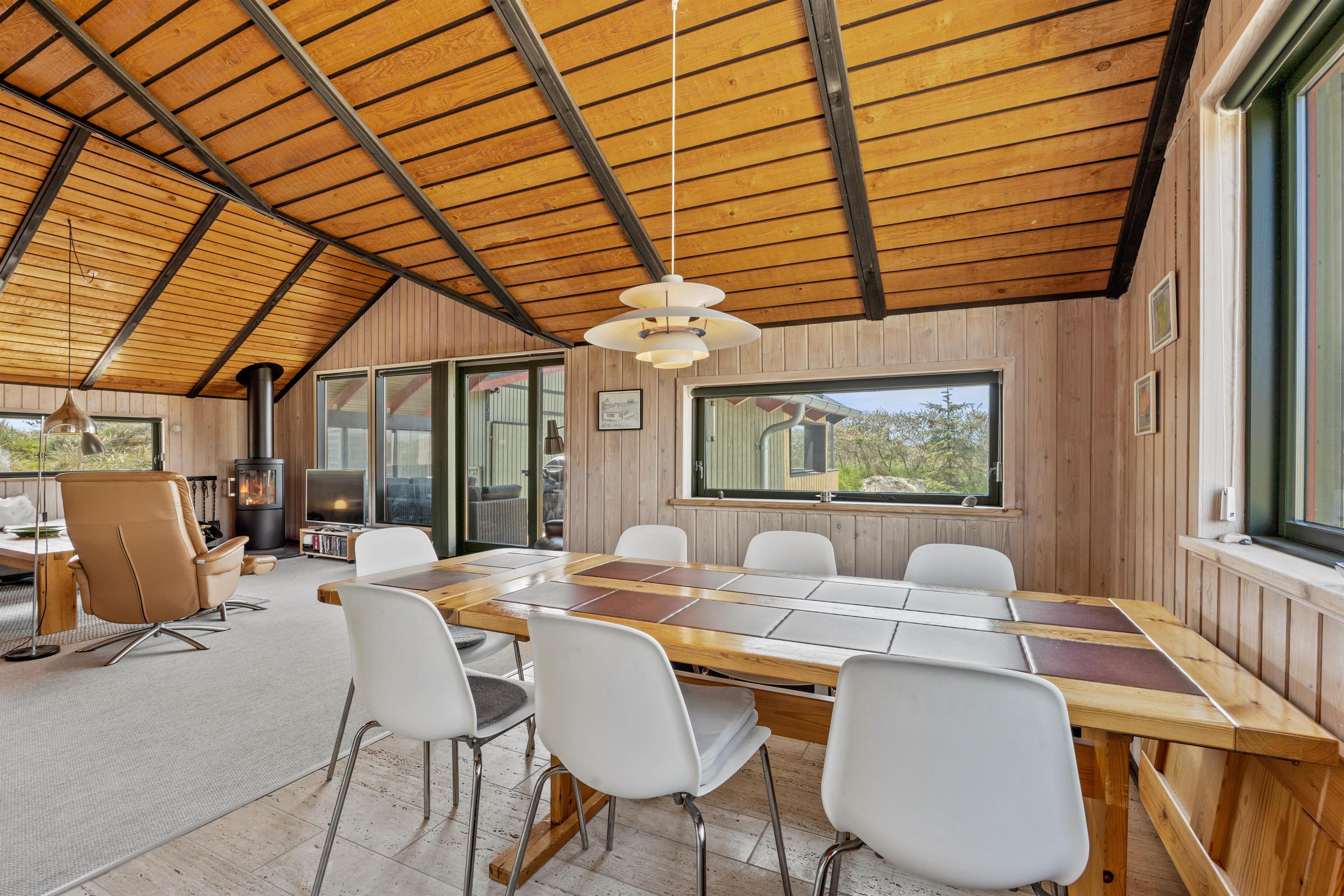 Velkommen i et charmerende og ur typisk feriehus, hvor stue og køkken-alrum går ud i et, og alt ånder hygge og afslapning, med personlig indretning og trævægge. Når det er råkoldt udenfor eller når mørket sænker sig over klit og hede, så tænd op i brændeovnen og hyg med familien i stuen eller ved spiseborde imens det varme skær fra ilden danser på trævæggene.