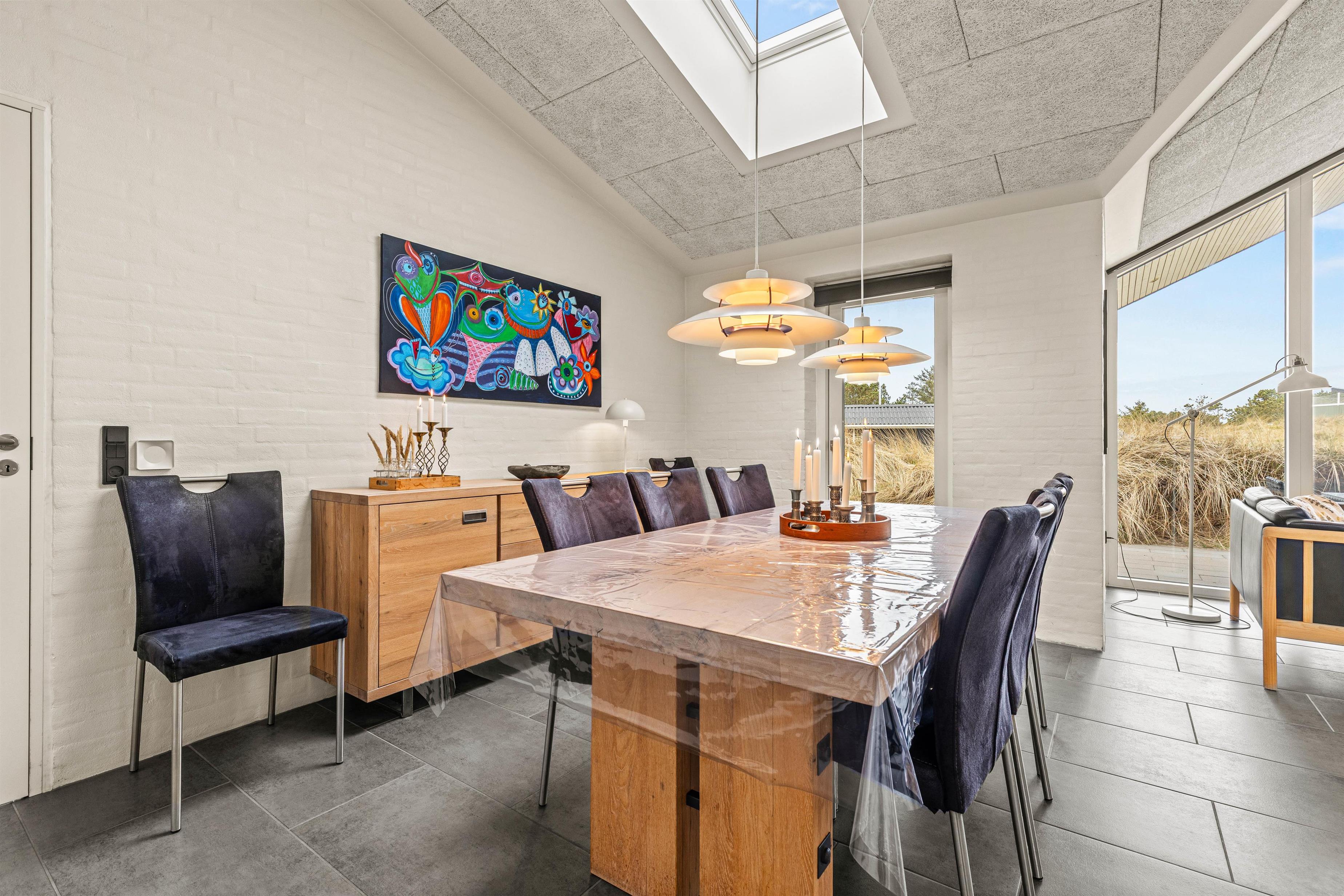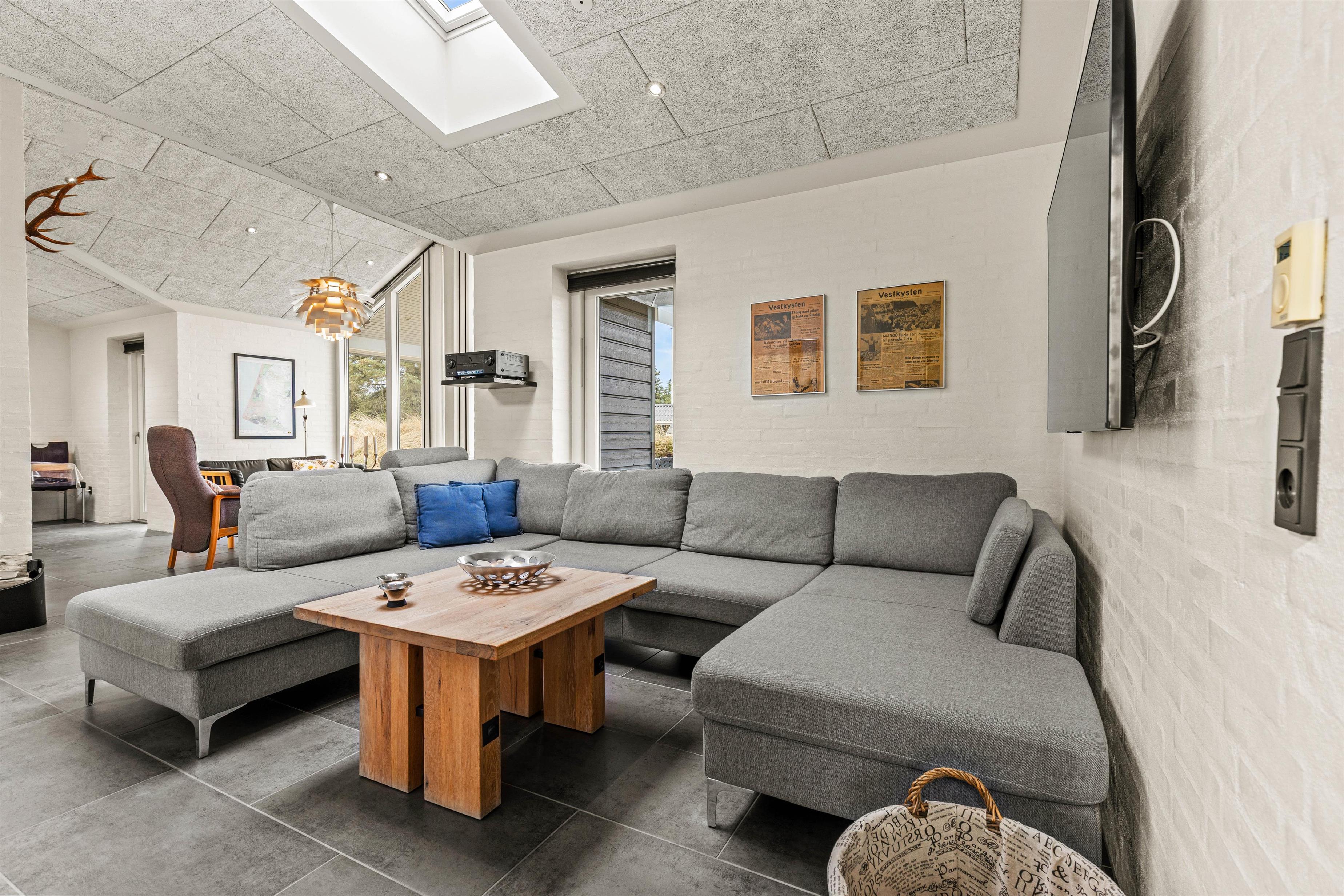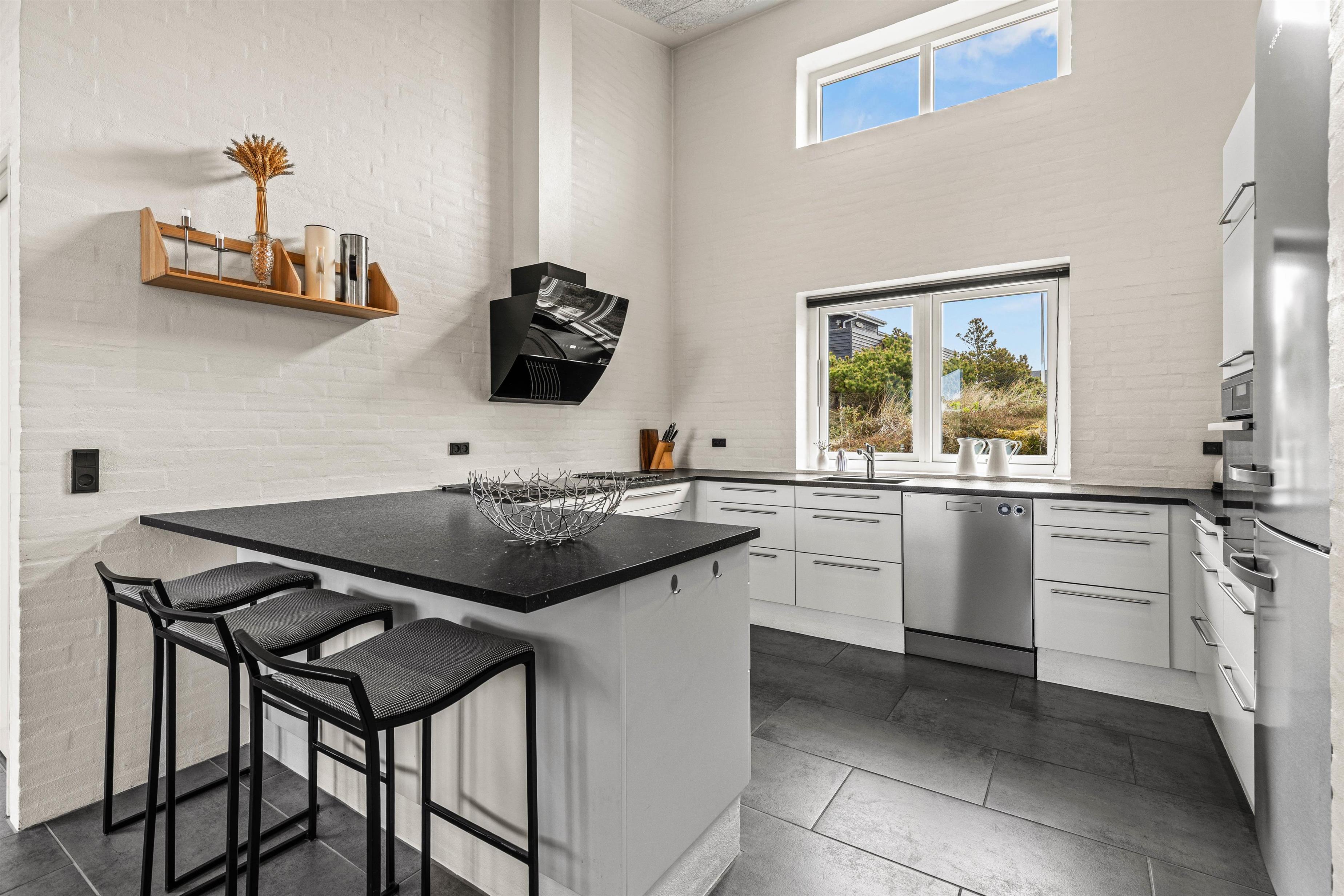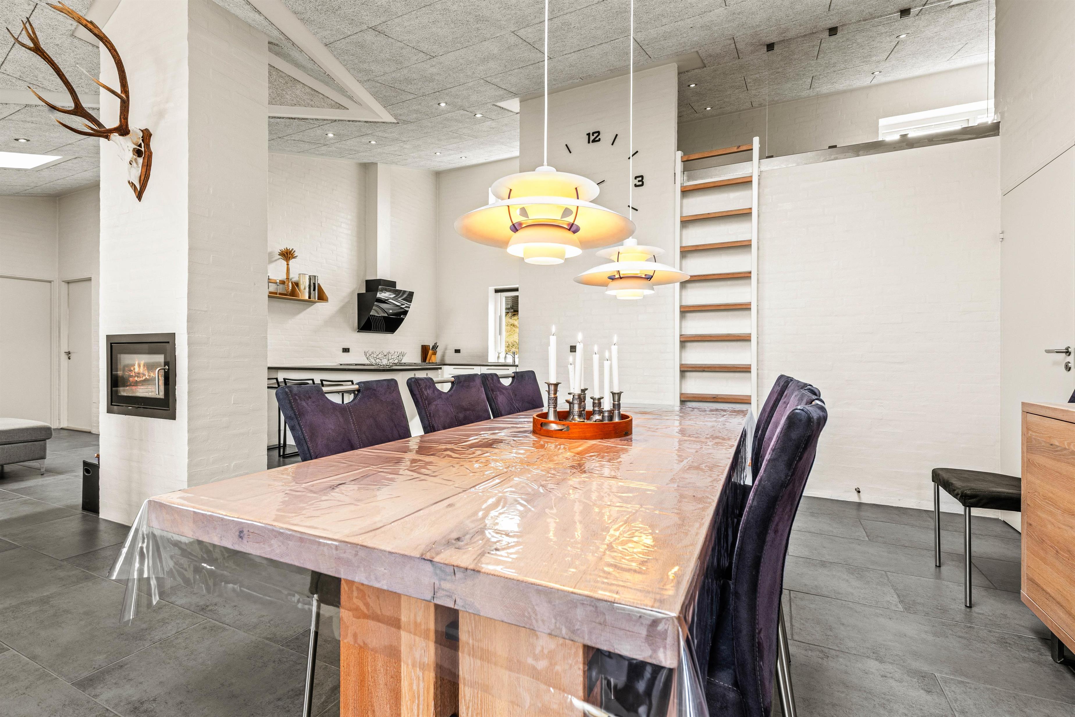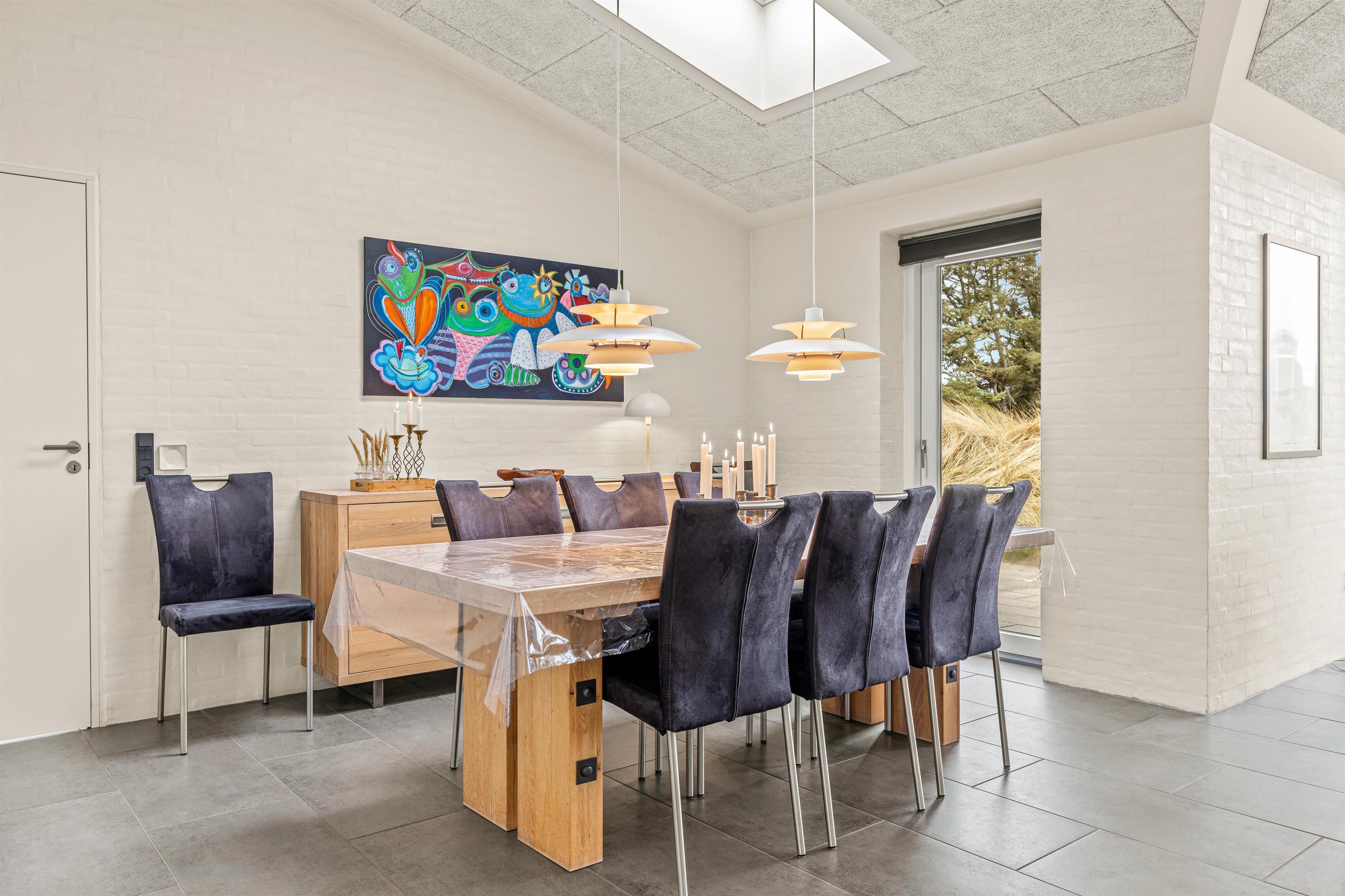Stilfuldt indrettet med masser af gode bekvemme siddemuligheder indbyder Risvej 8 til en dejlig ferie for op til 8 personer. Det store smukke fællesrum med det store moderne køkken er lyst og venligt indrettet og det har store vinduespartier for smuk udsigt og godt lysindfald. Om aftenen, når mørket falder på, så sørger en brændeovn for en hyggelig stemning.