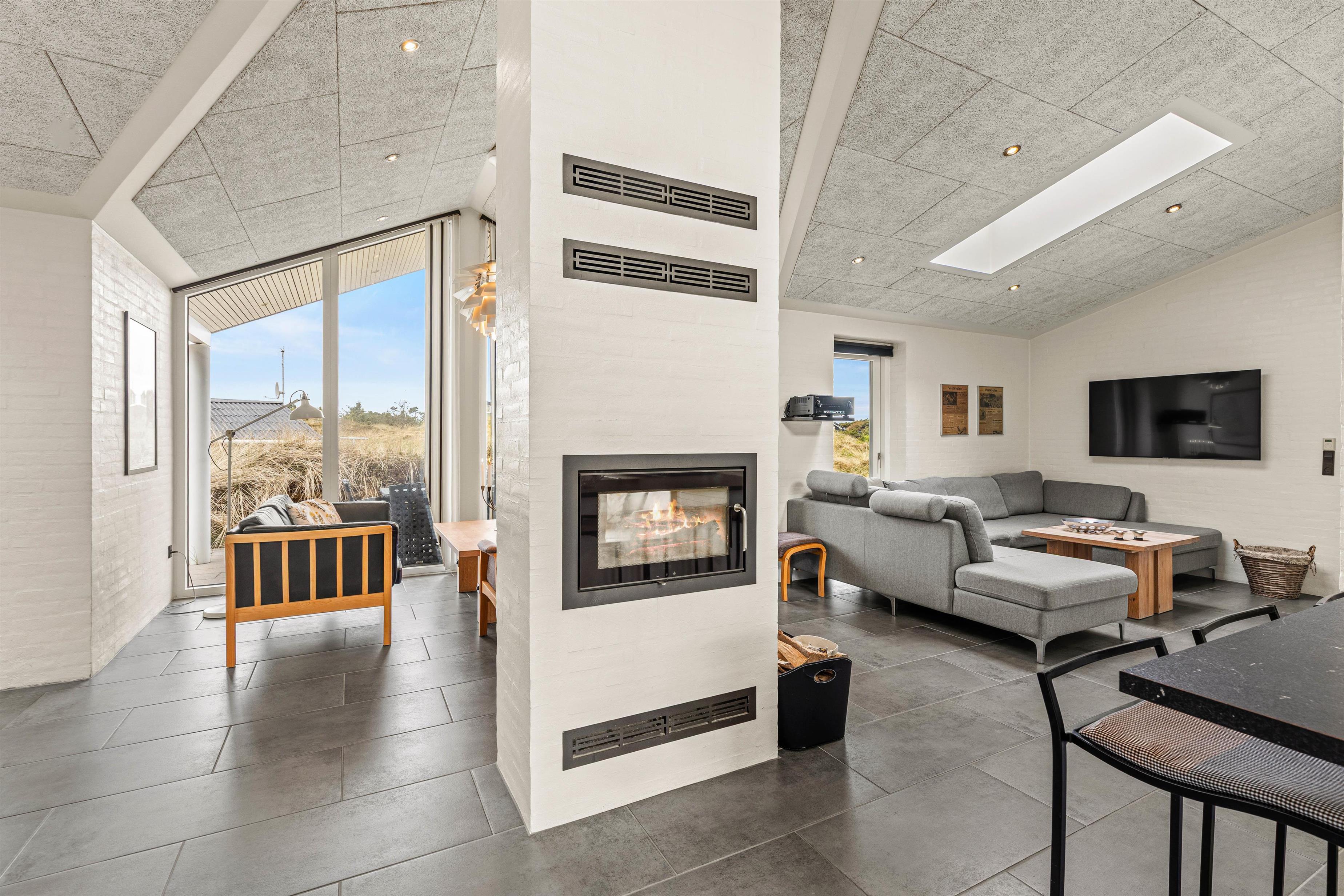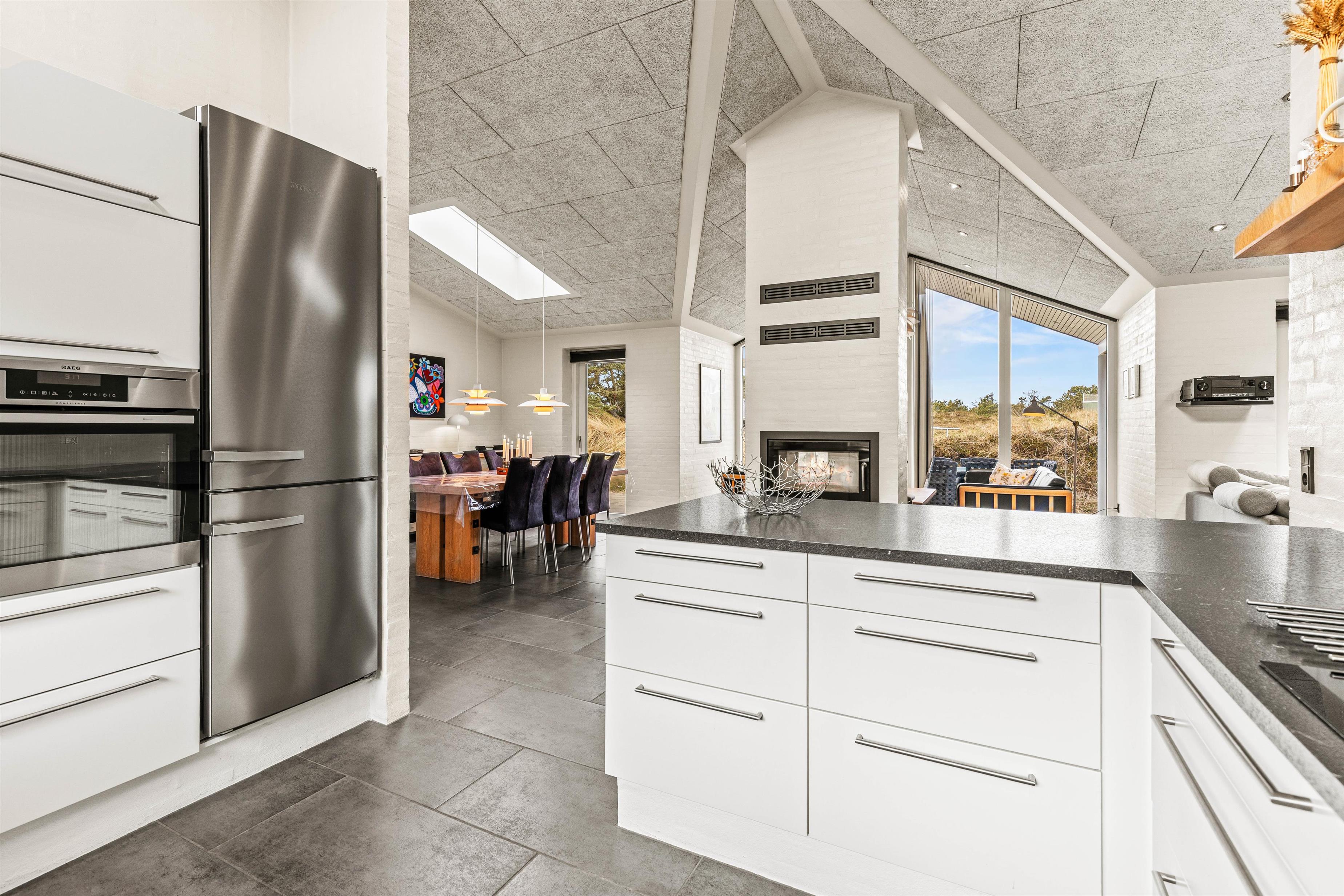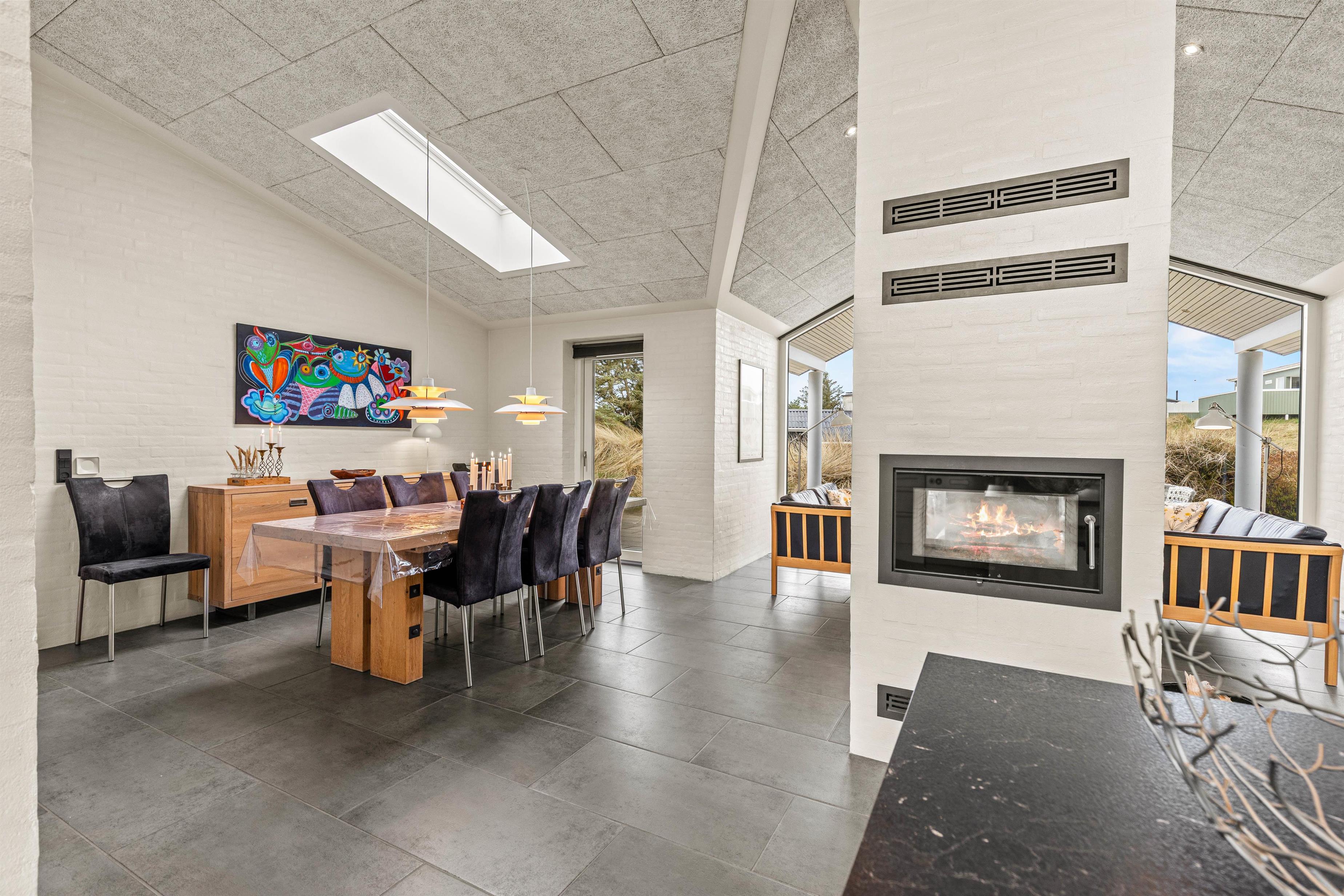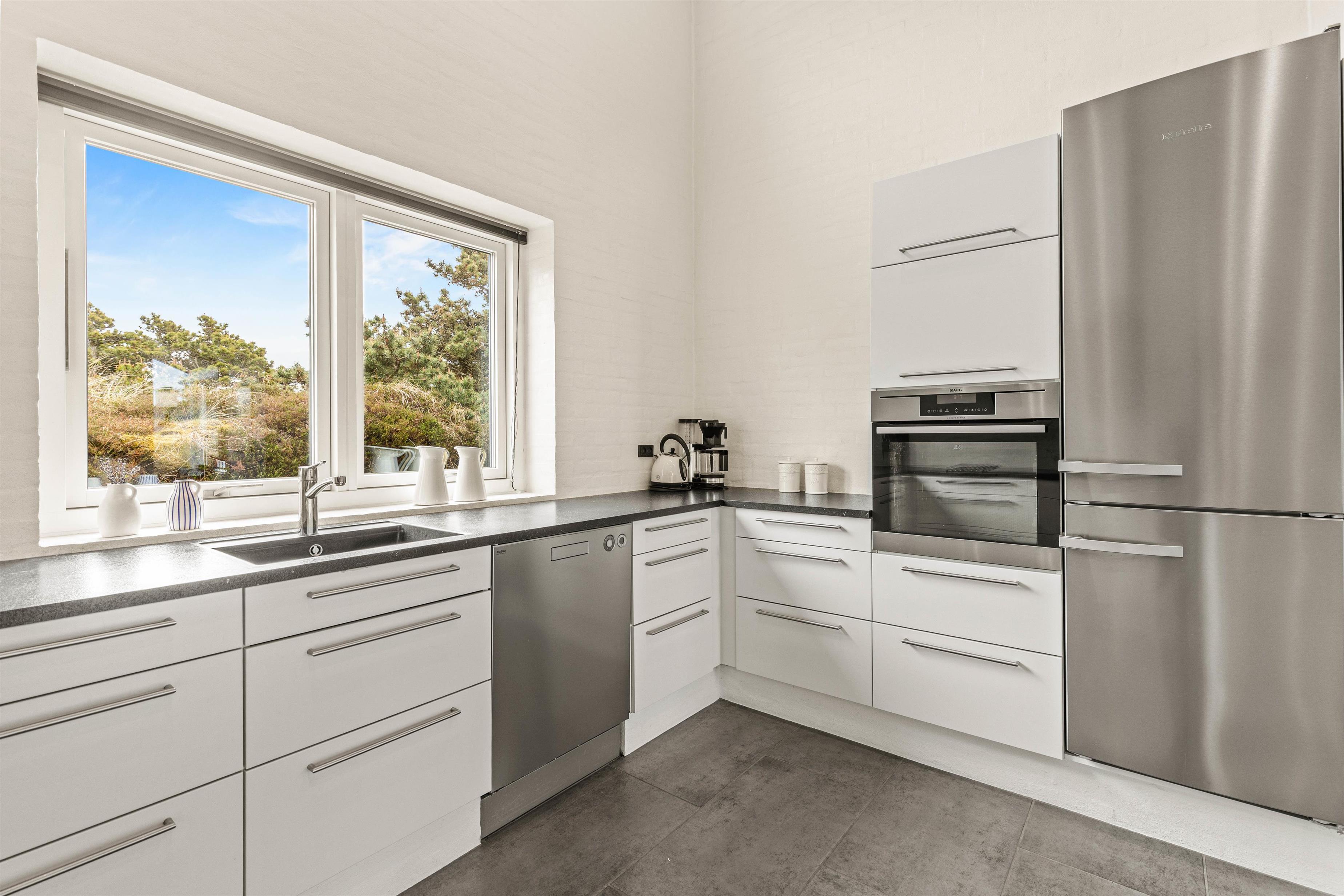 Stilfuldt indrettet med masser af gode bekvemme siddemuligheder indbyder Risvej 8 til en dejlig ferie for op til 8 personer. Det store smukke fællesrum med det store moderne køkken er lyst og venligt indrettet og det har store vinduespartier for smuk udsigt og godt lysindfald. Om aftenen, når mørket falder på, så sørger en brændeovn for en hyggelig stemning.