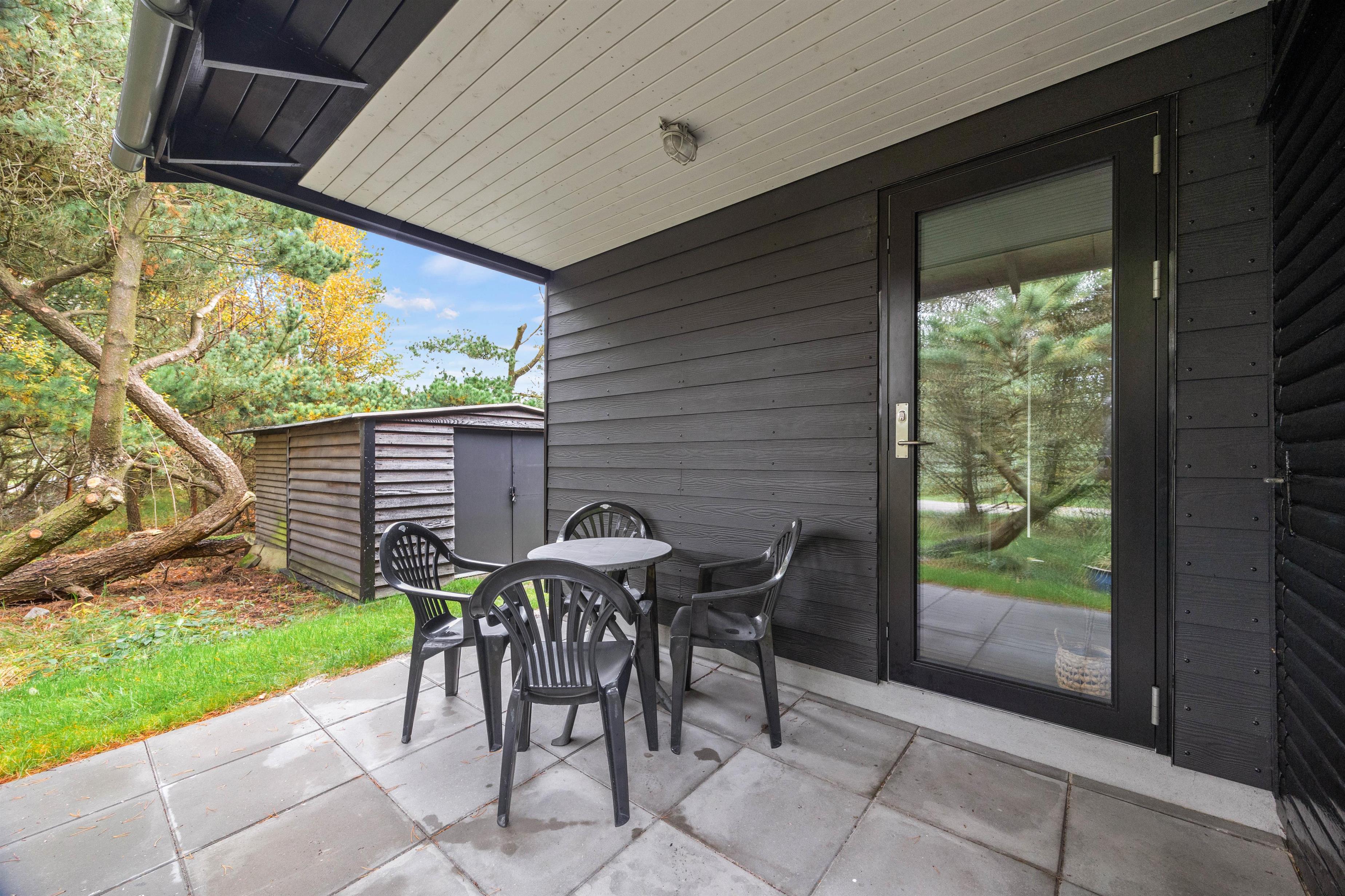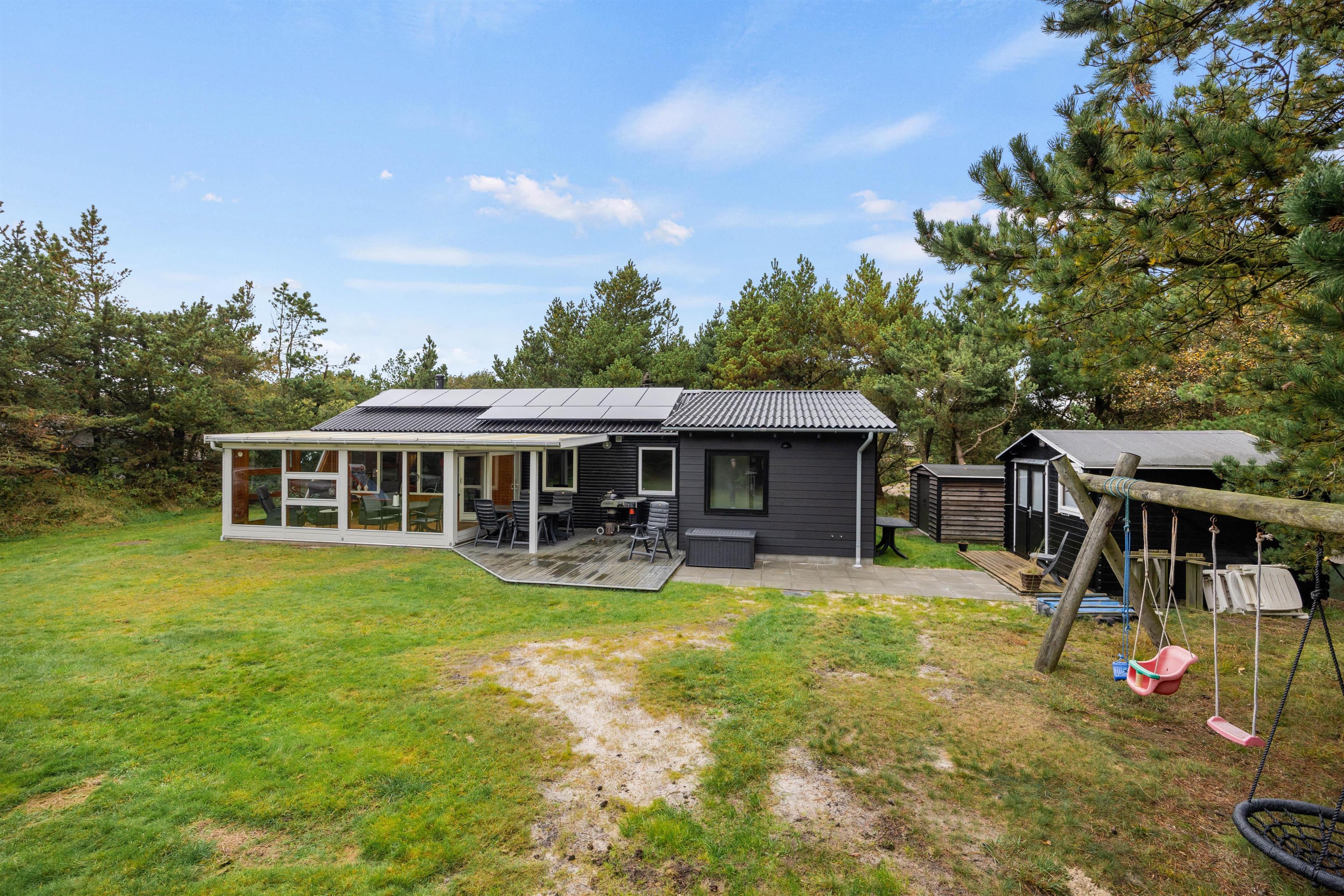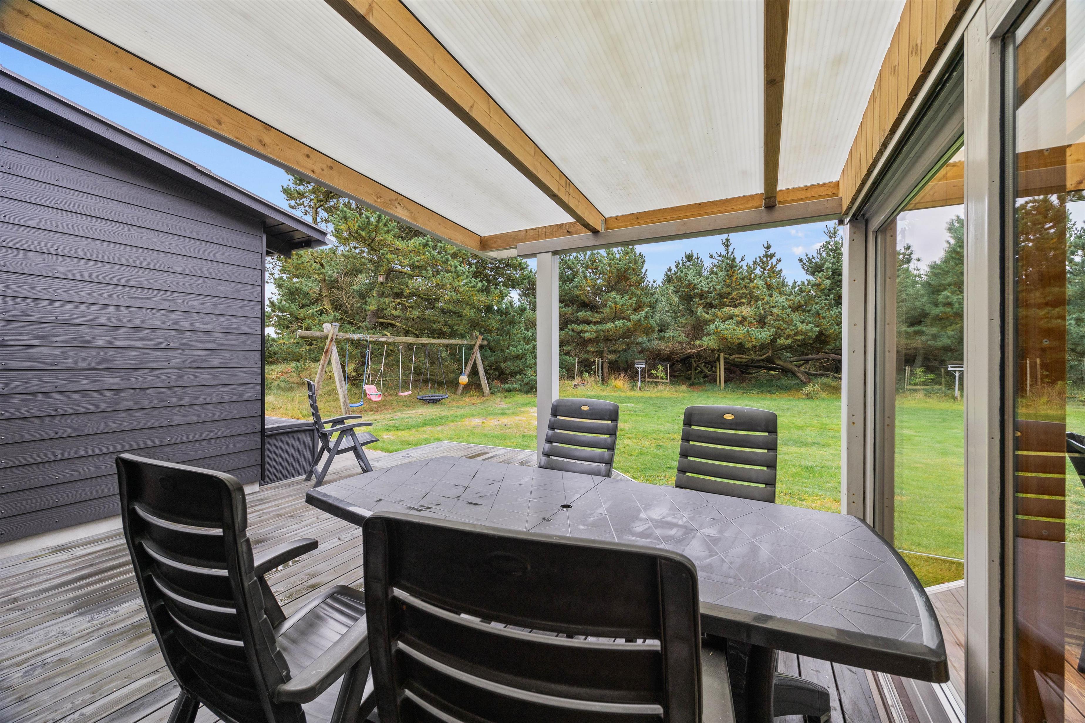 På den 1901 m² store grund kan jeres børn lege i sandkassen eller gynge på gyngestativet. Den delvist overdækkede terrasse udgør det idéelle sted at nyde lune sommeraftener på den danske vestkyst.