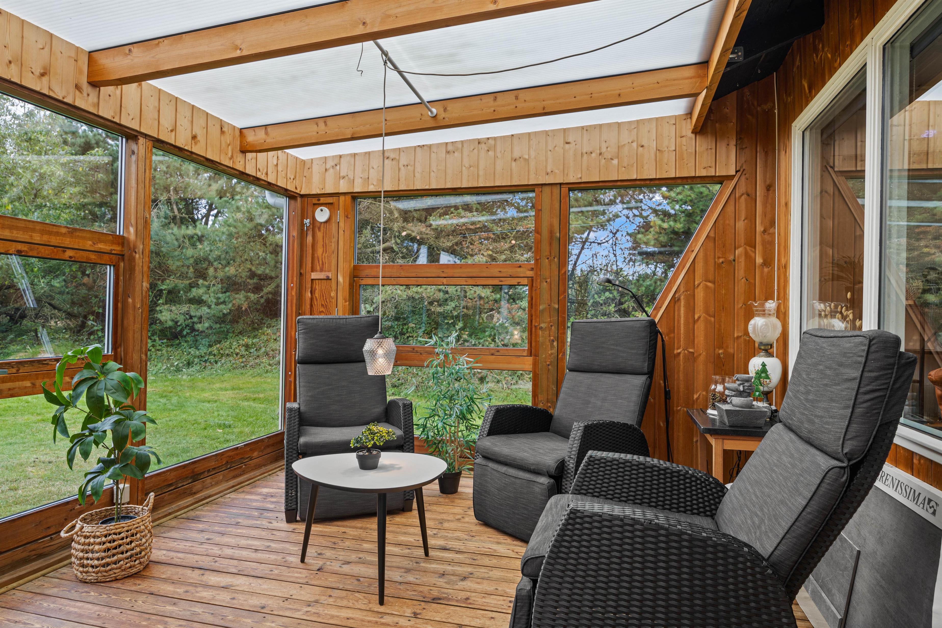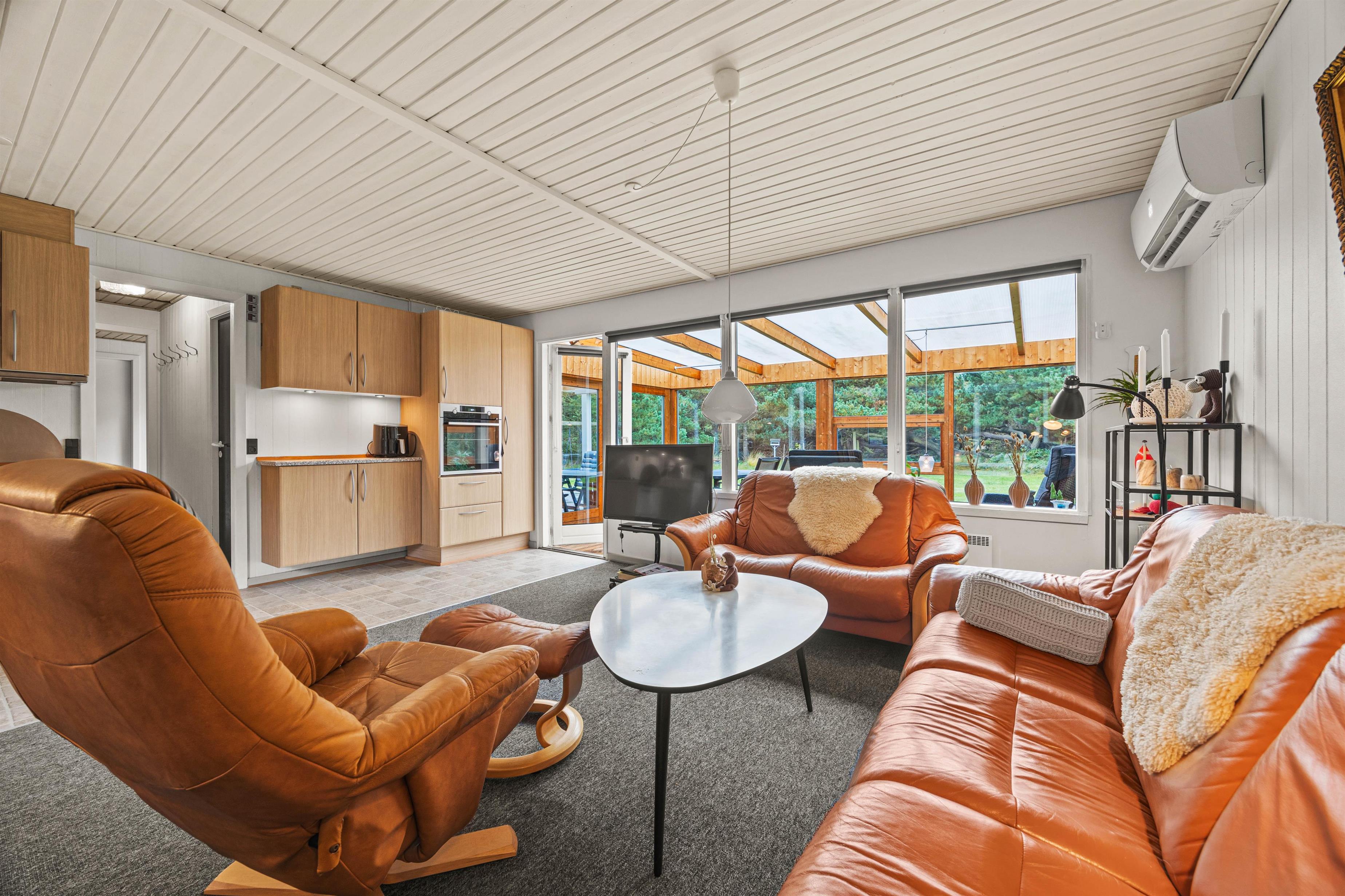 Slap af ved den knitrende brændeovn, eller brug den moderne varmepumpe til at holde varmen på køligere dage. De store vinduer i udestuen giver masser af naturligt lysindfald og bringer næsten den omkringliggende natur ind til dig i stuen.