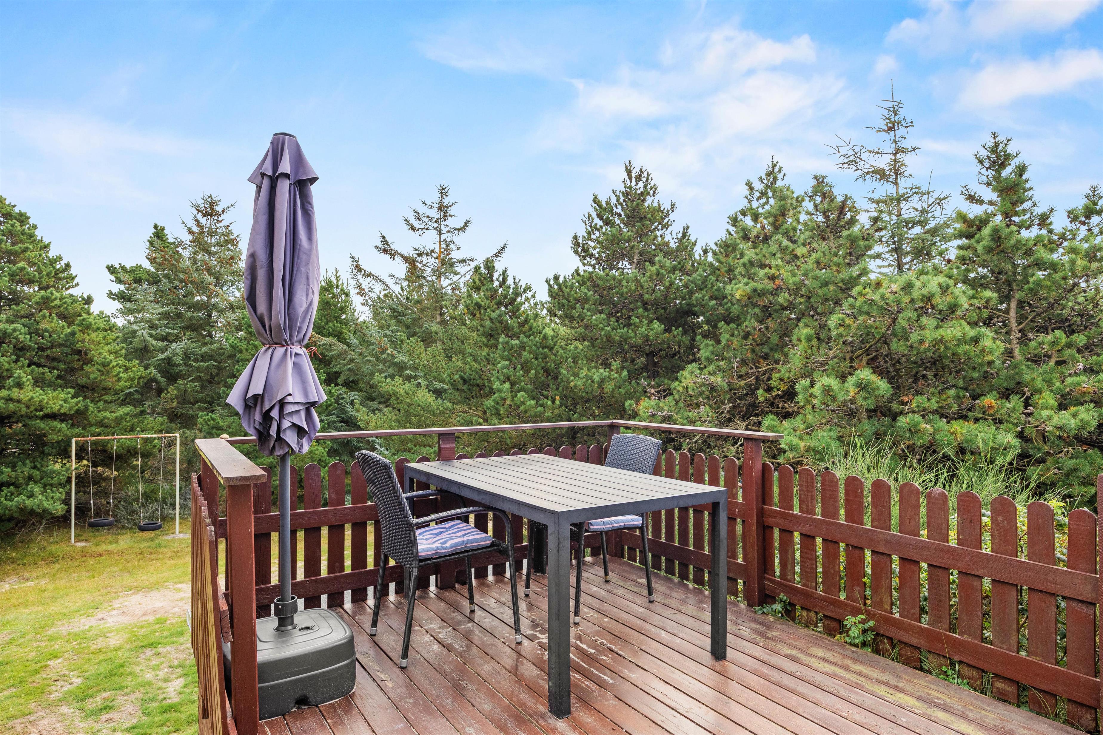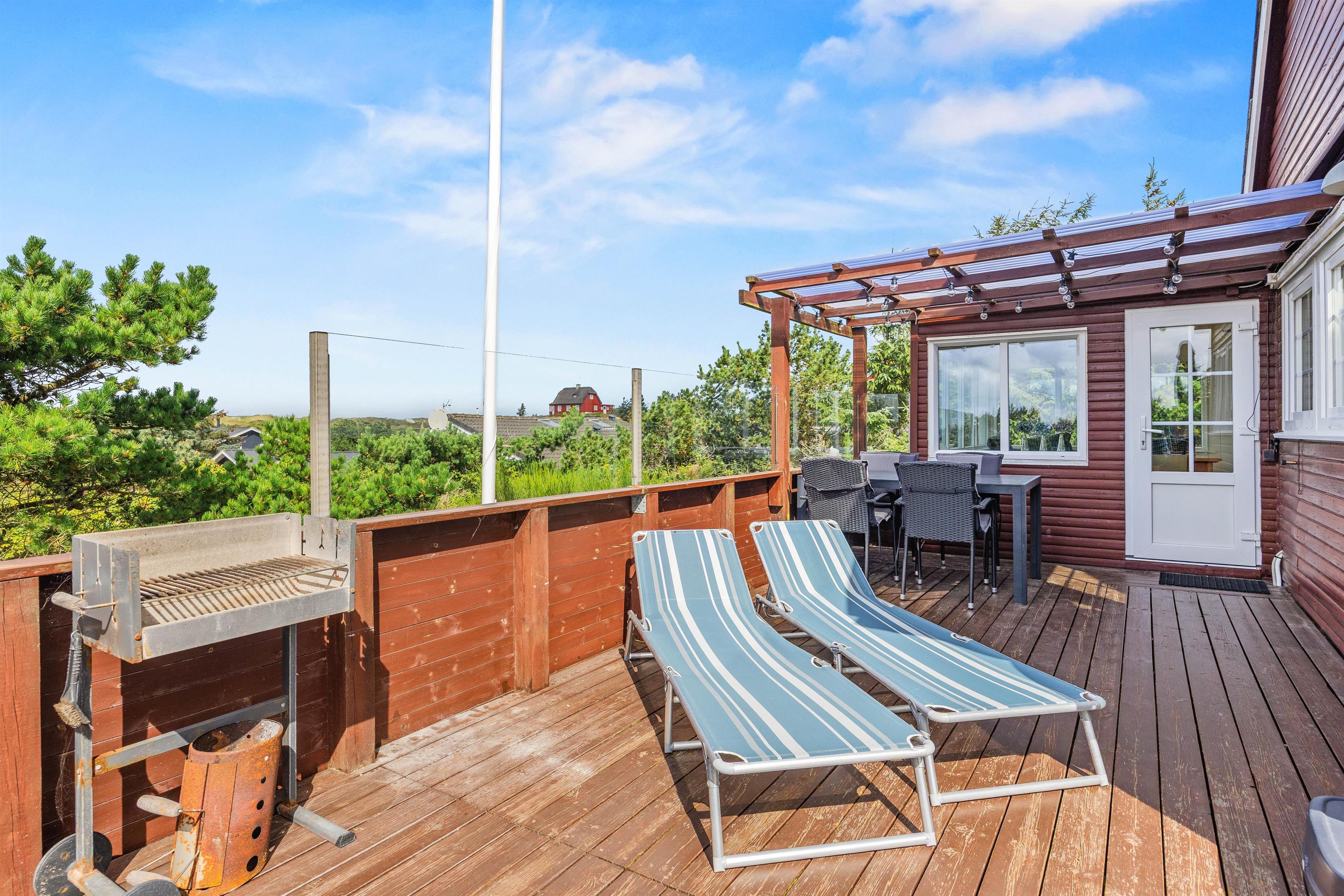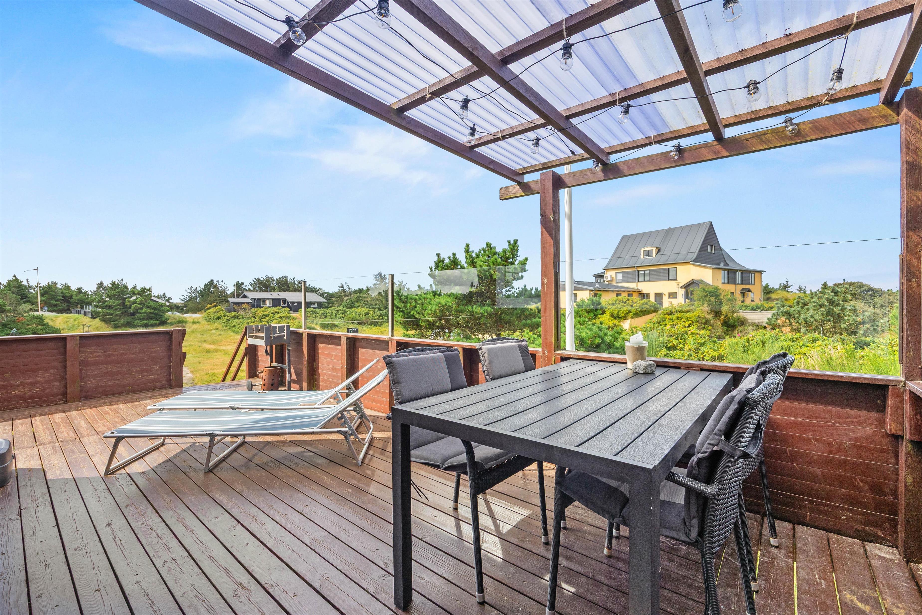 Sommerhuset ligger på en skøn naturgrund omgivet af klitter og marehalm. Den høje placering på klittoppen giver jer en særlig ro og en fin udsigt over det vestjyske landskab. På terrassen kan I nyde solen, drikke morgenkaffe i læ eller tænde op i grillen, mens aftenen falder på. Her er det nemt at lade tiden flyde og nyde den stille stemning.