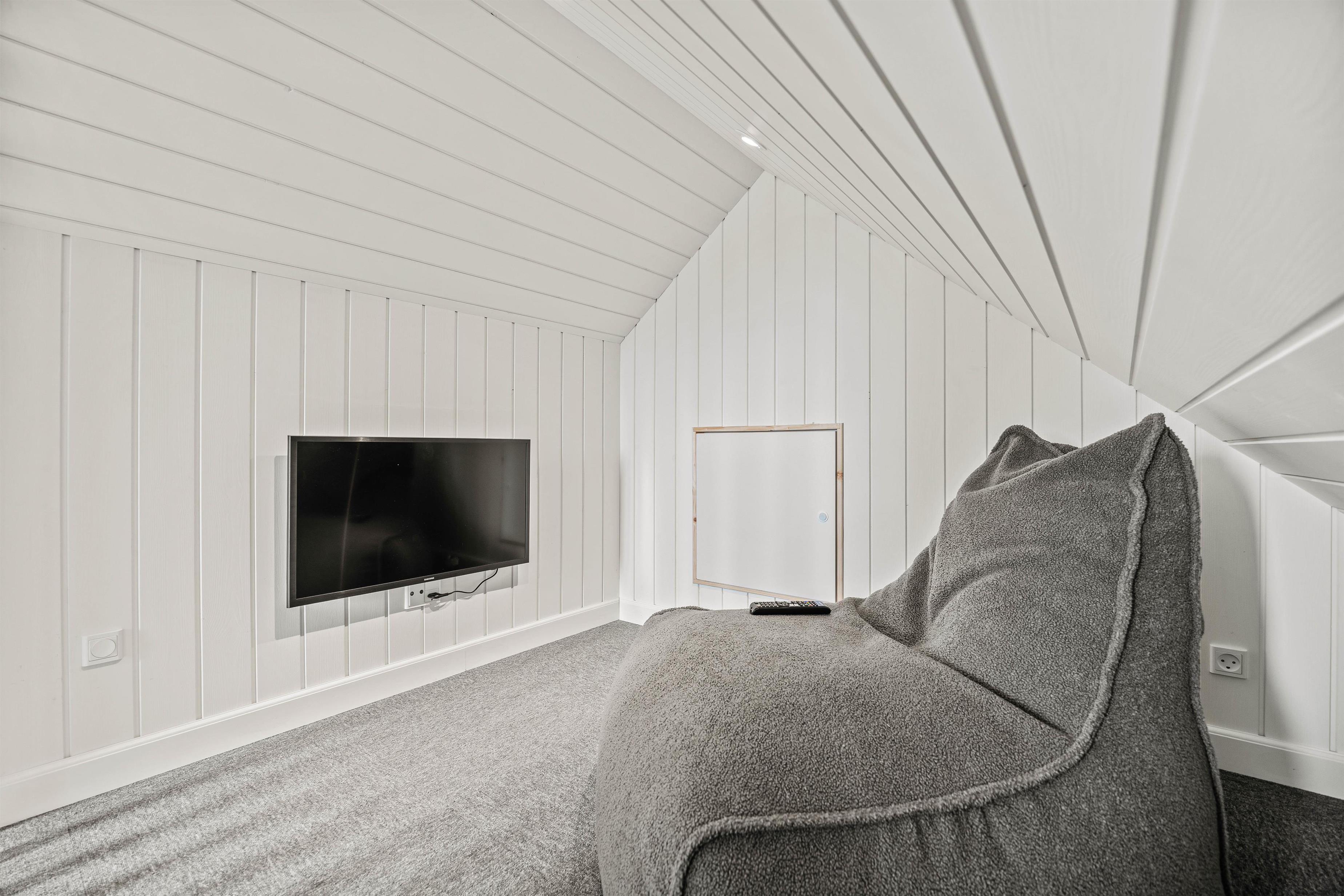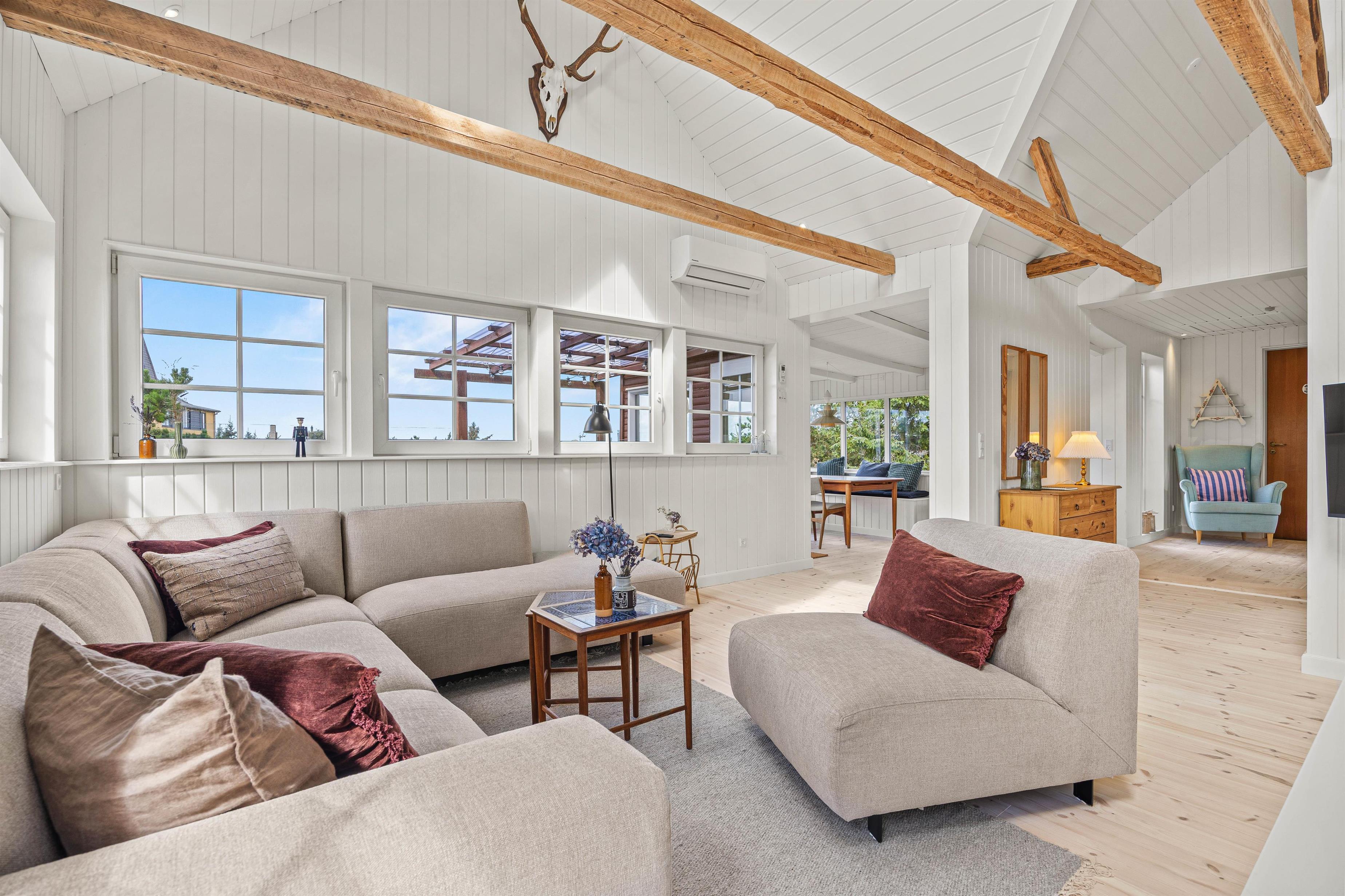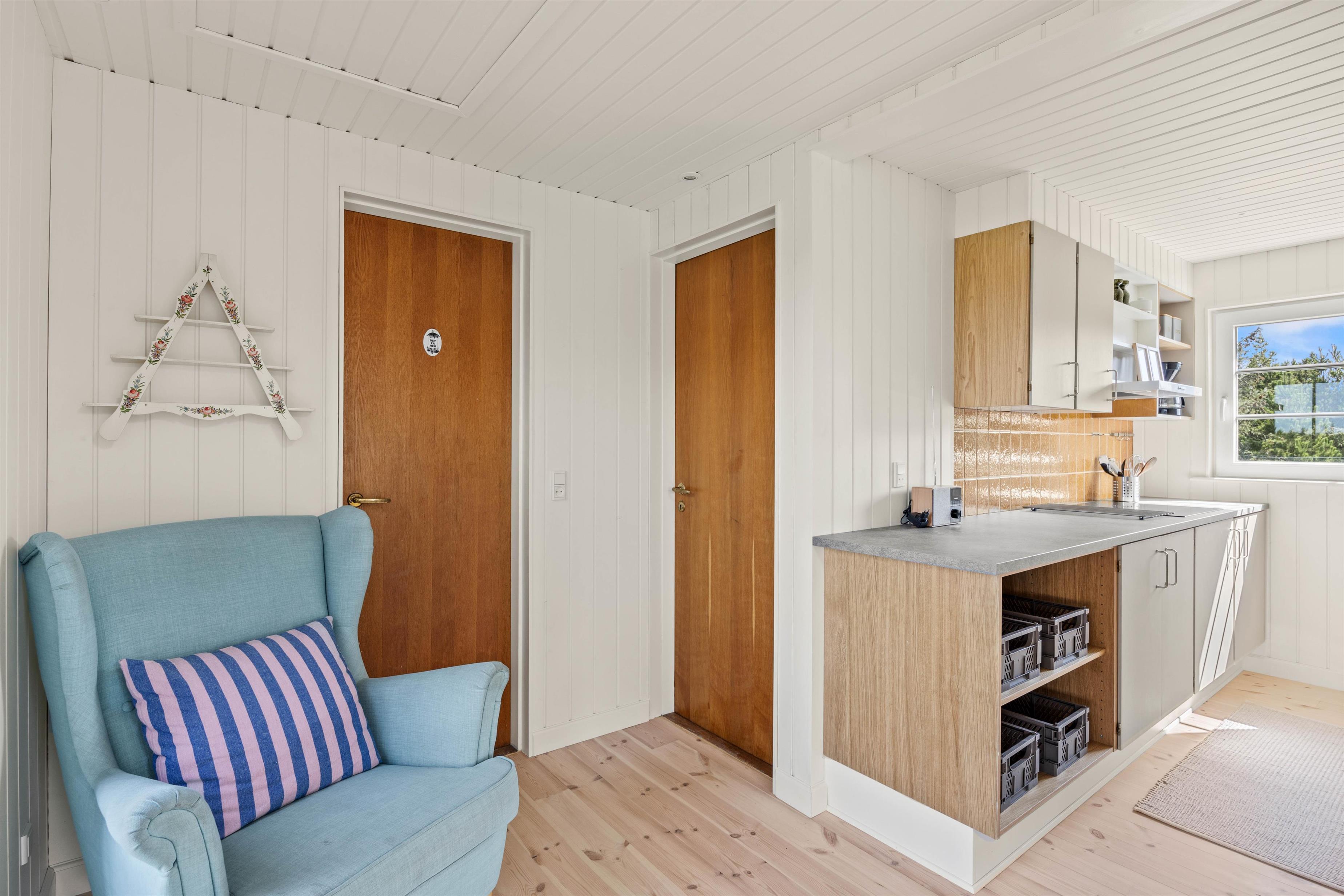 Indenfor bliver I mødt af en lys og venlig stemning. Opholdsrummet byder på en komfortabel sofa, en varmende brændeovn og et tv med danske kanaler – – perfekt til afslappende aftener med spil, film eller bare ro og nærvær. Udover brændeovnen sørger en energivenlig varmepumpe for behagelig varme, og på badeværelset giver gulvvarme ekstra komfort.