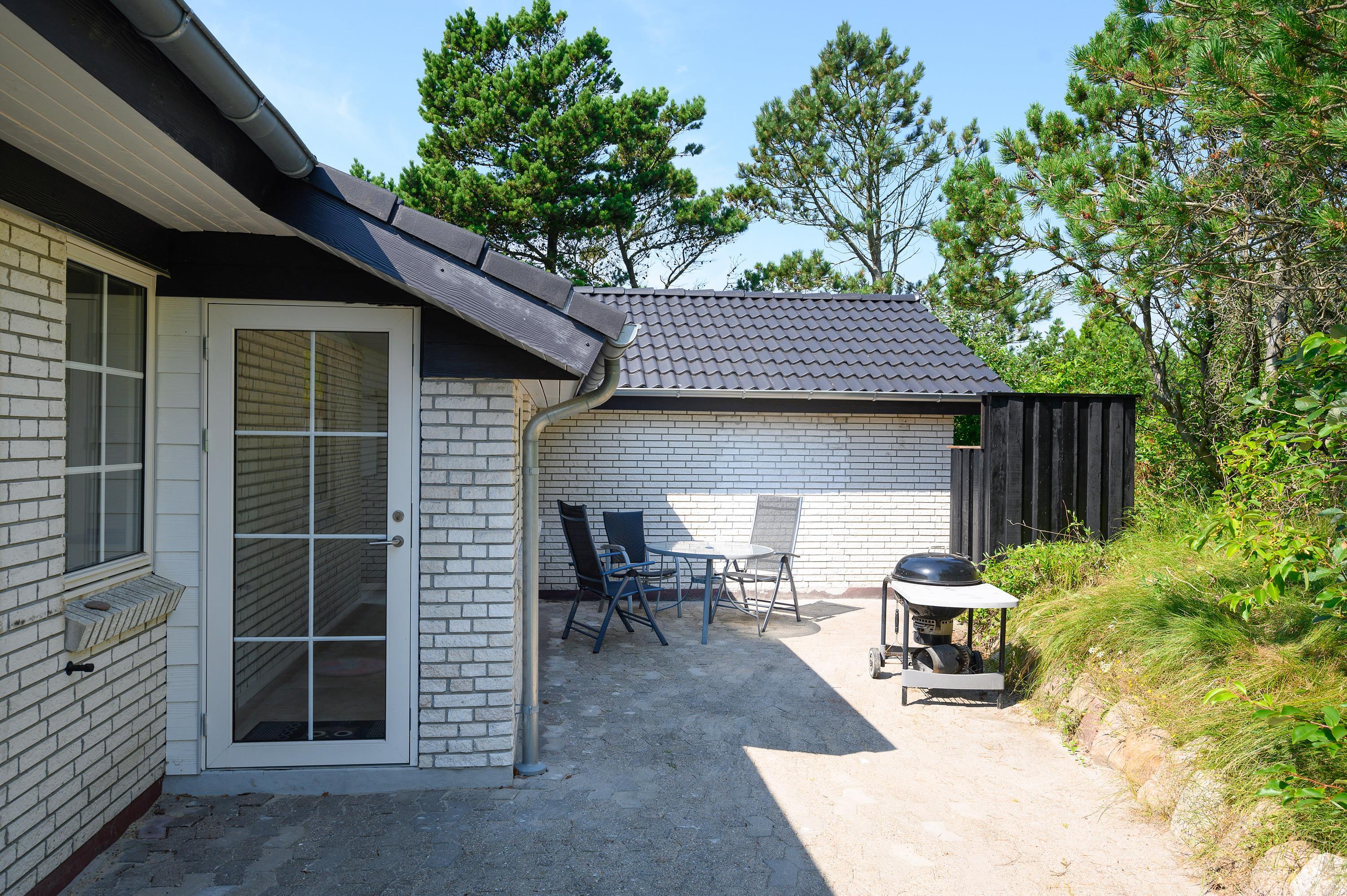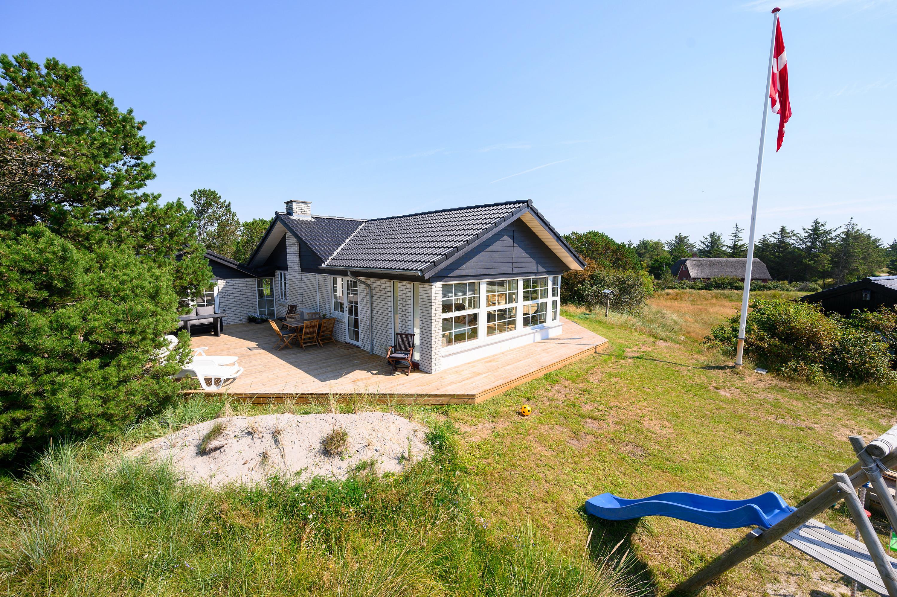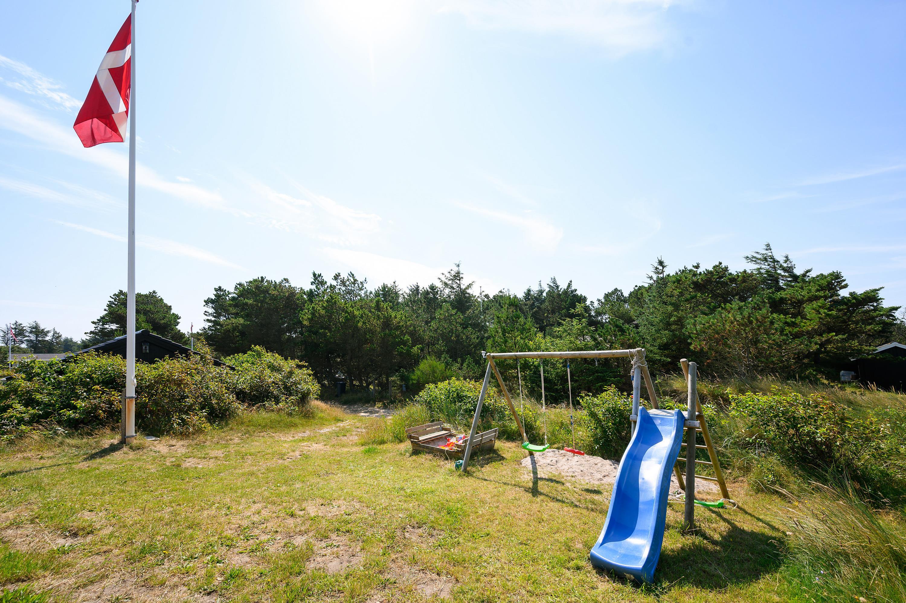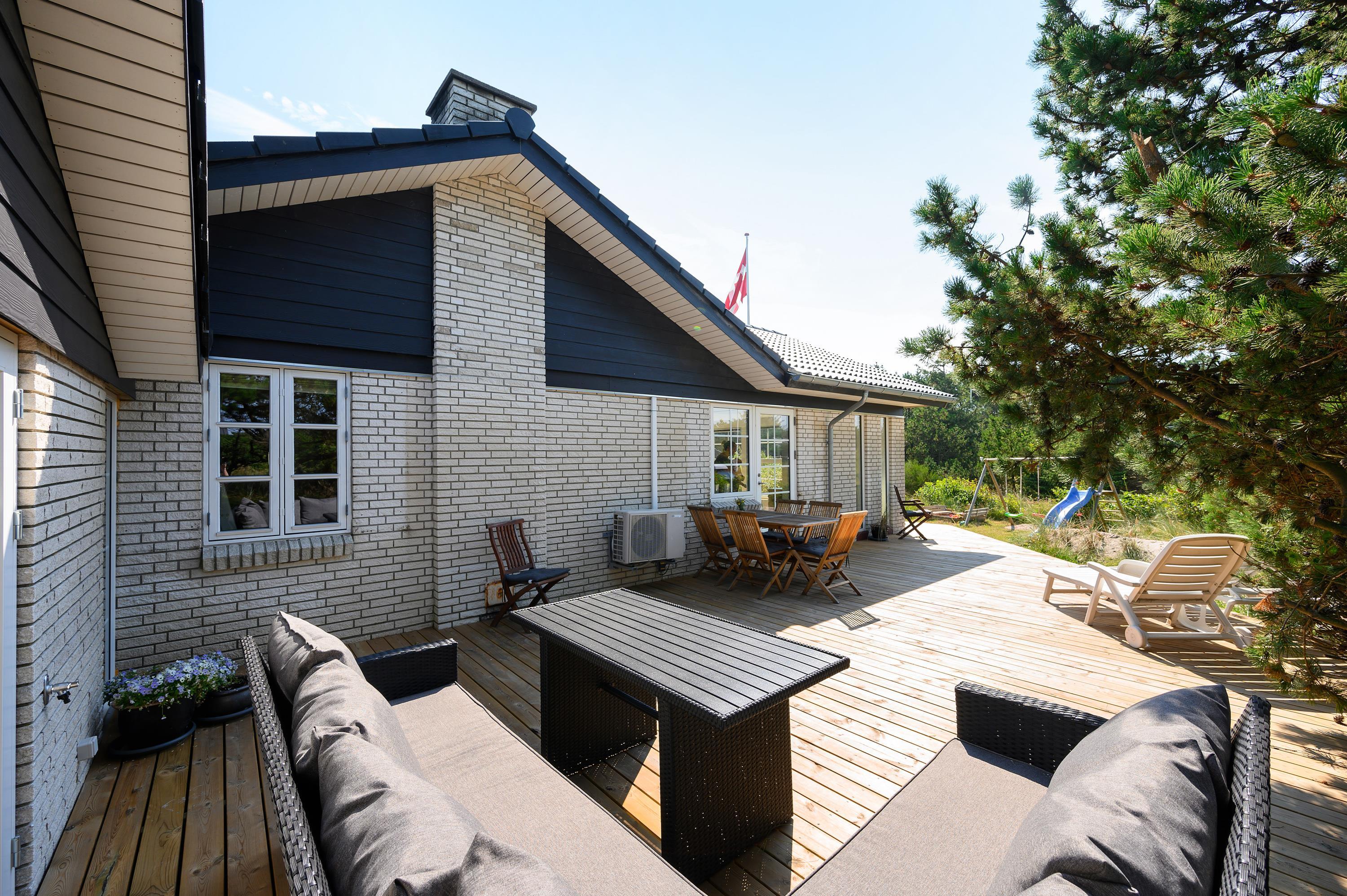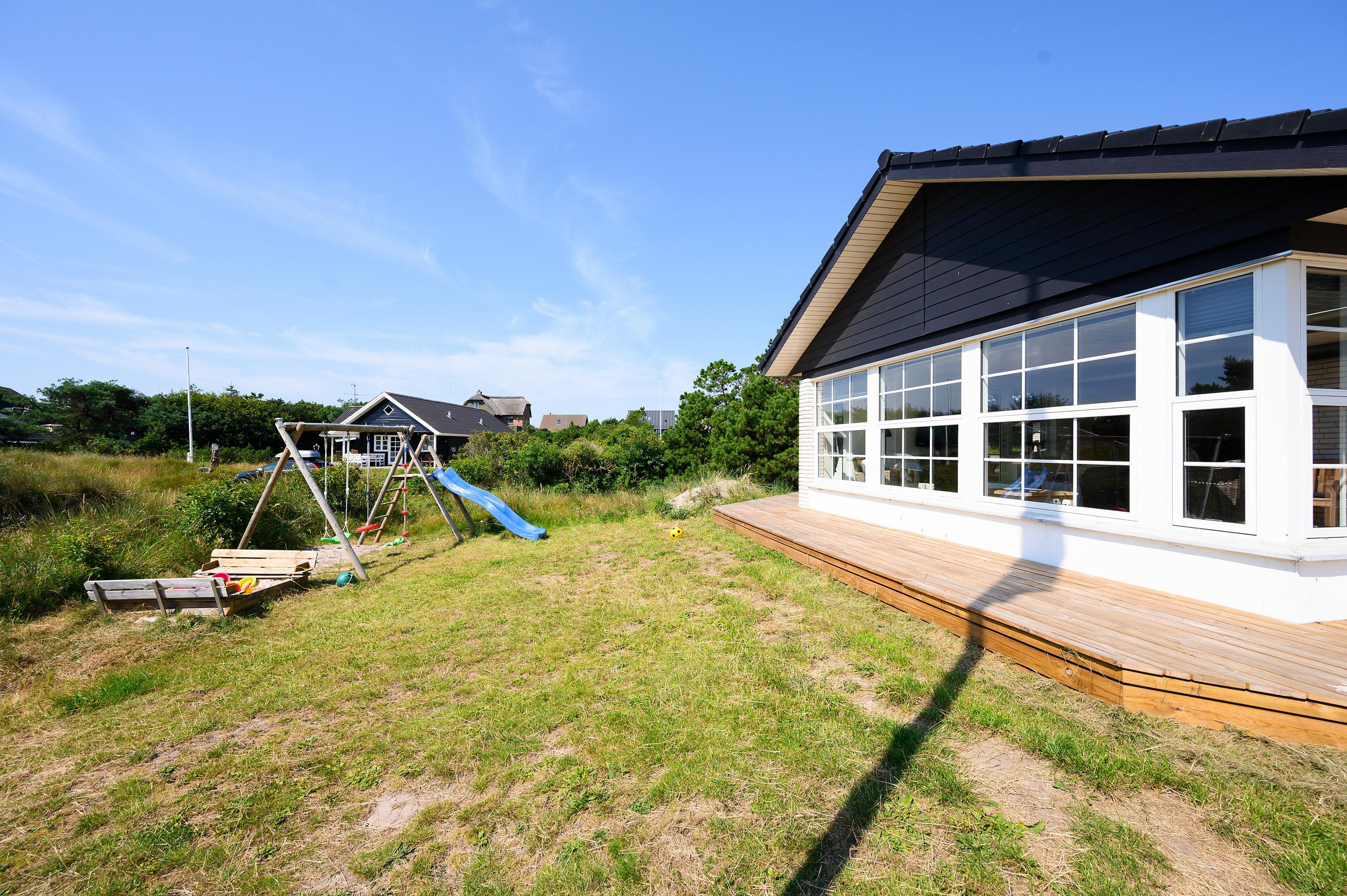 En stor træterrasse omgiver sommerhuset på Vejers Havvej 59, og I kan altid være sikre på at finde et godt sted i solen, hvor I kan sætte jer til rette i havemøbler og liggestole. Fra terrassen kan I holde øje med børnene, mens de leger i haven, hvor der er både gyngestativ og sandkasse.