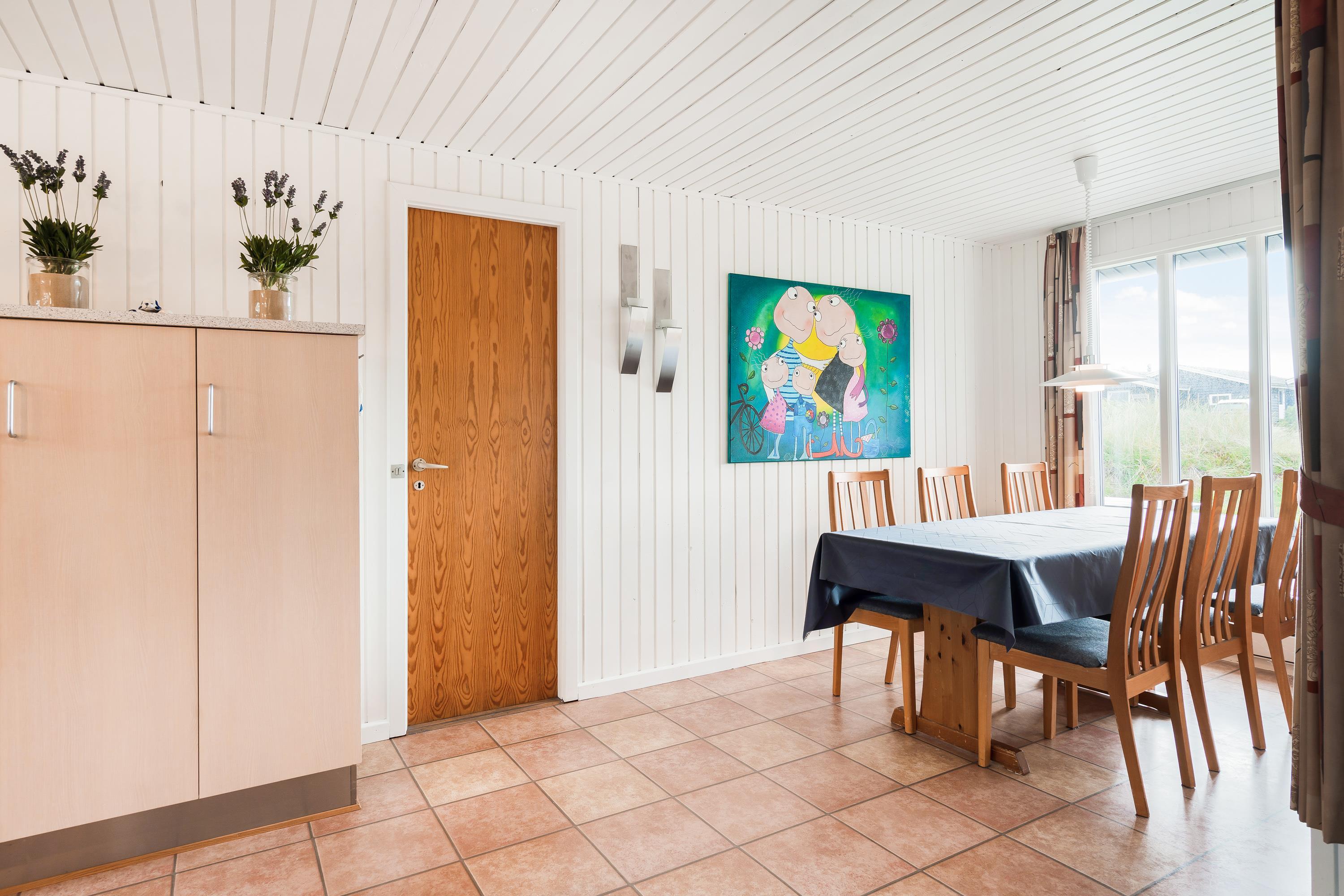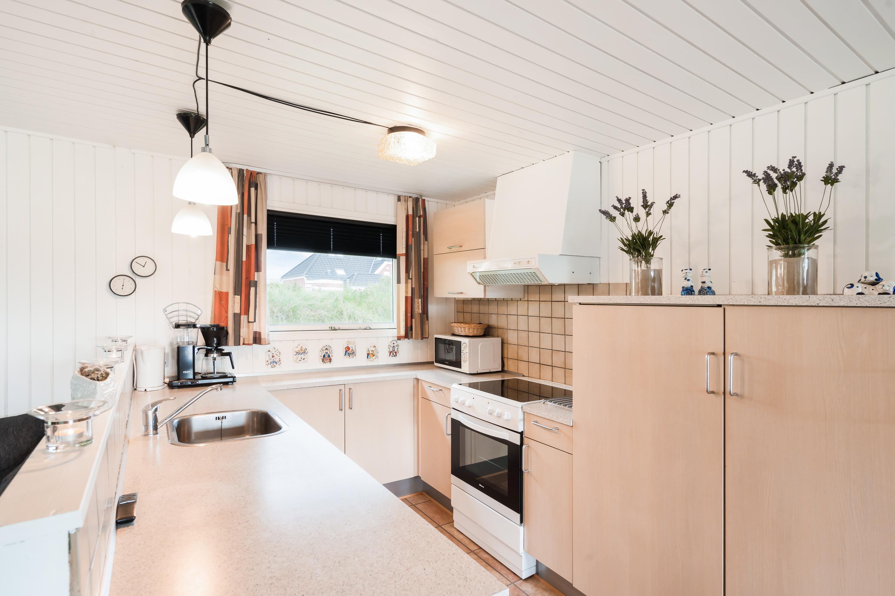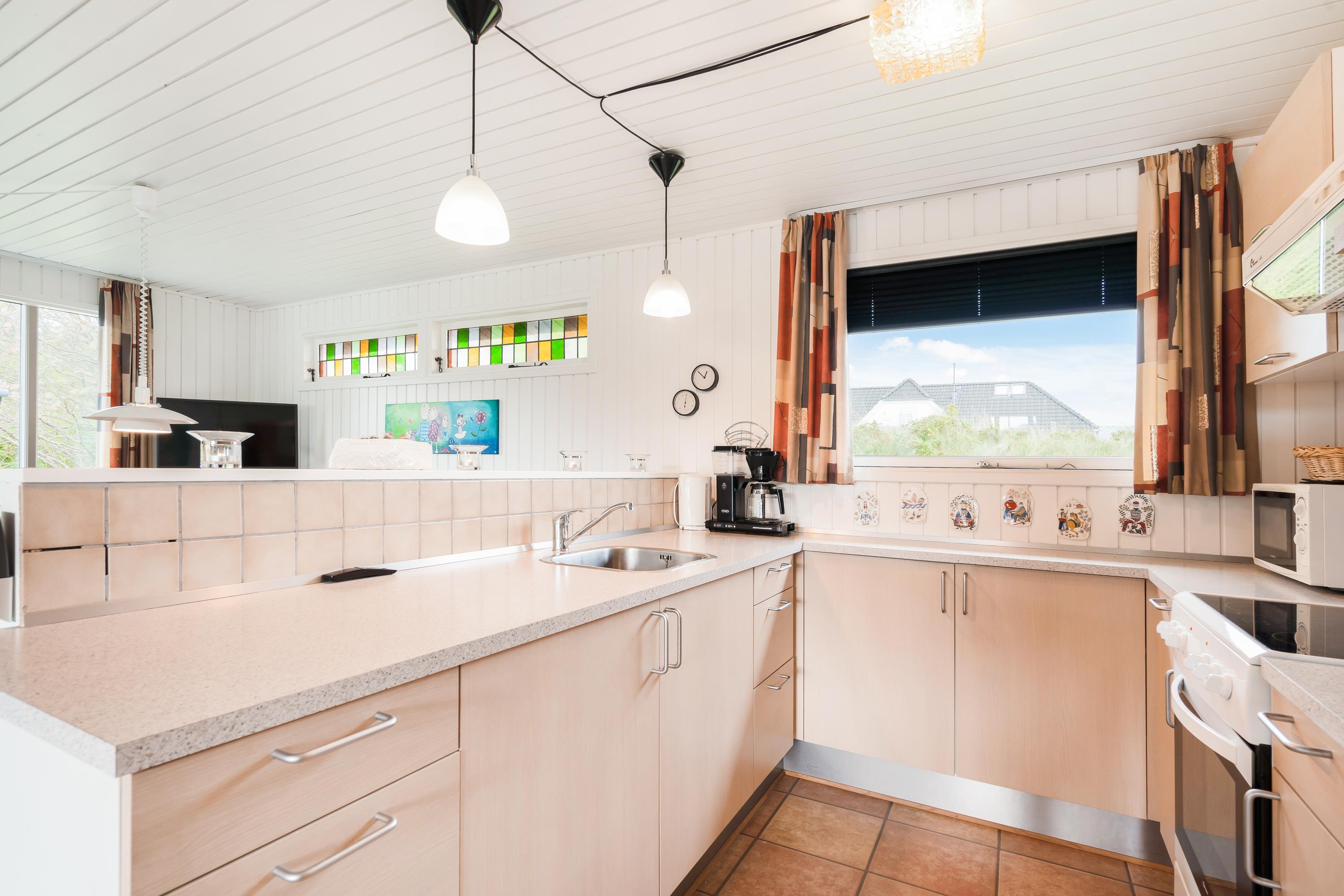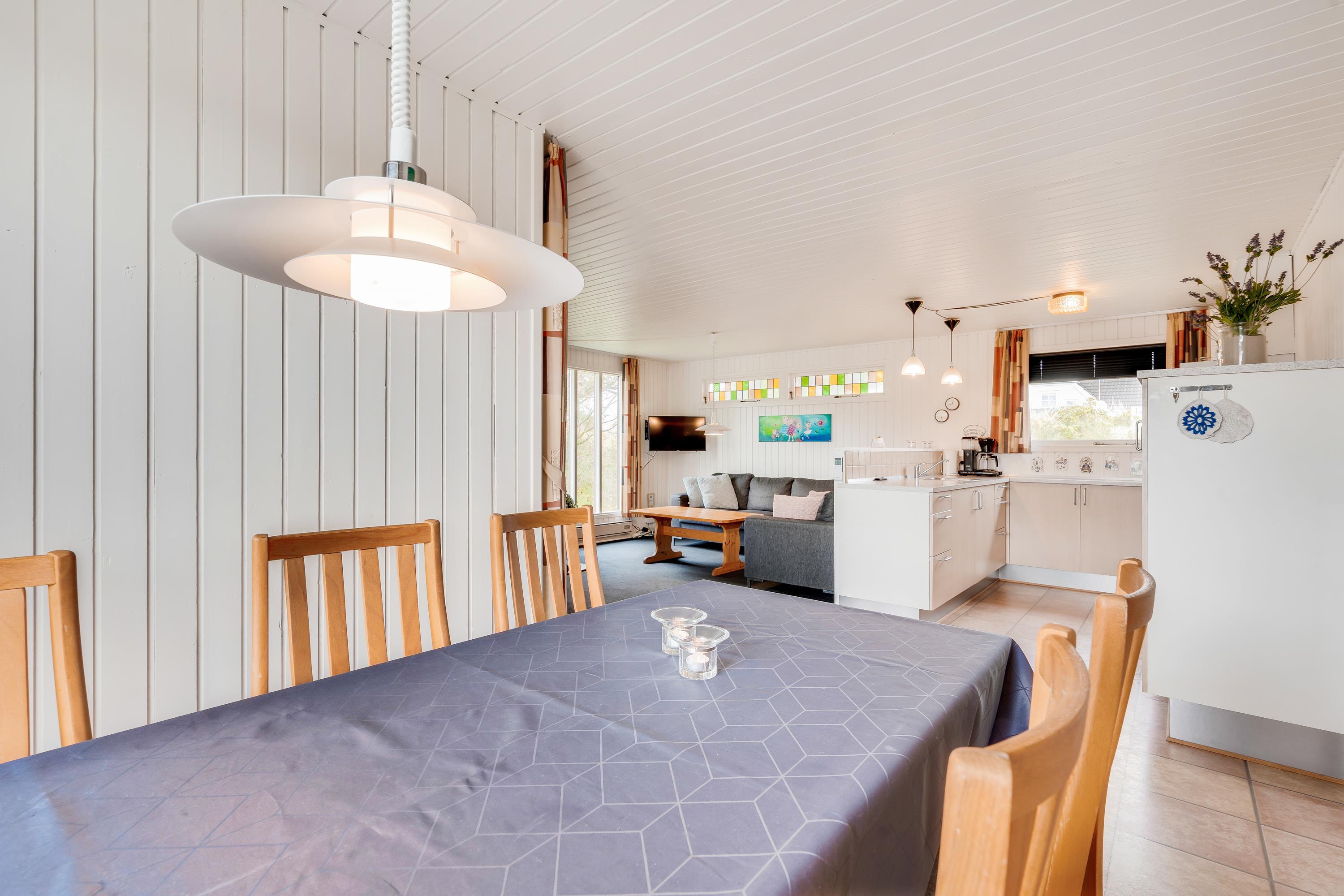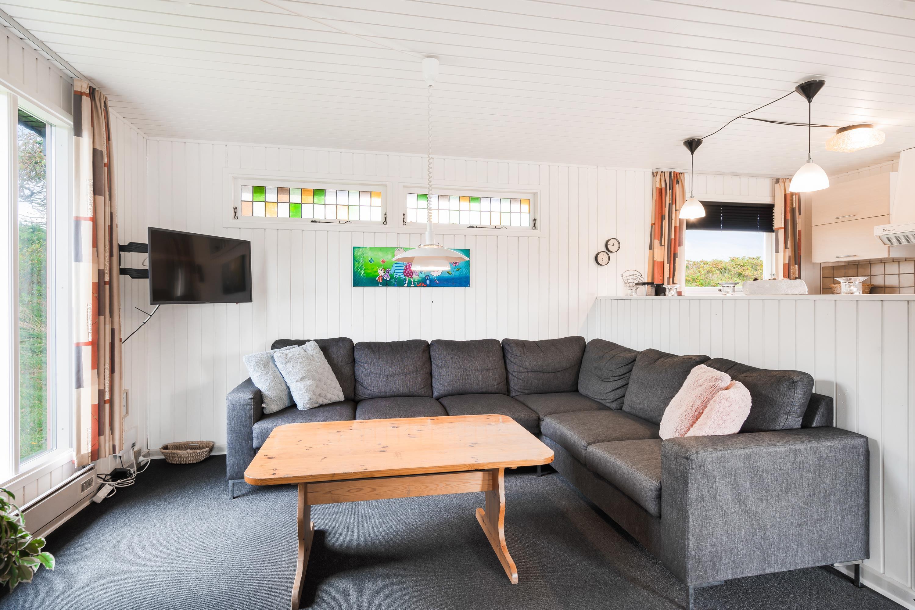 Sommerhuset er hyggeligt indrettet med personlige detaljer, der sørger for, I kan føle jer godt tilpas og hjemme i indretningen. Stuen ligger i åben forbindelse til køkkenet, så I får en følelse af at være sammen, selv om I laver forskellige ting. Måske slapper nogen af på sofaen, mens ilden knitrer i brændeovnen og andre er i gang med at forberede en lækker frokost med lokale råvarer.