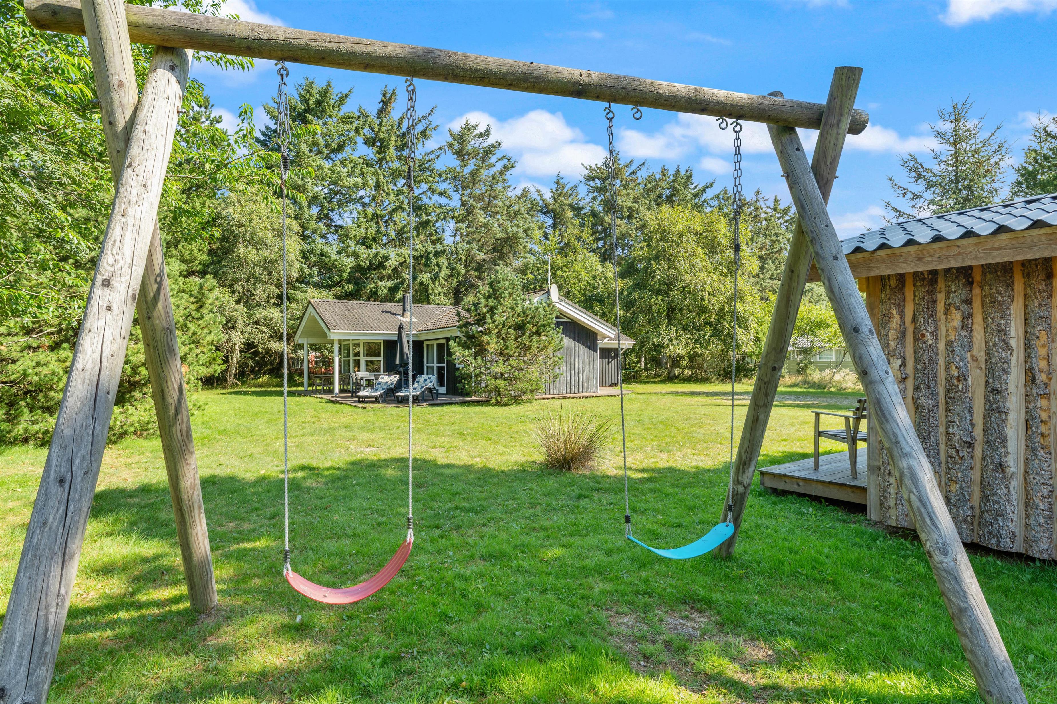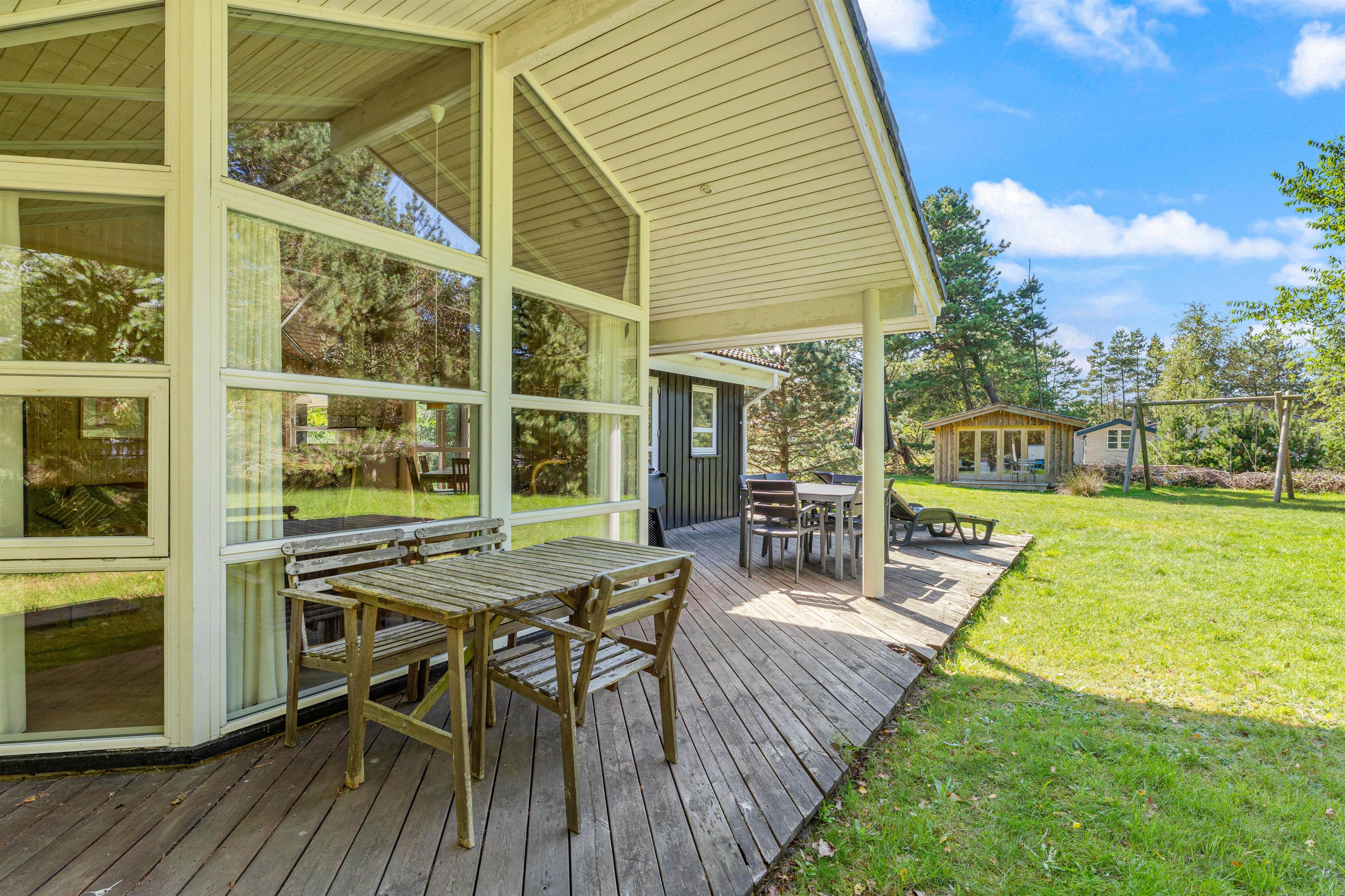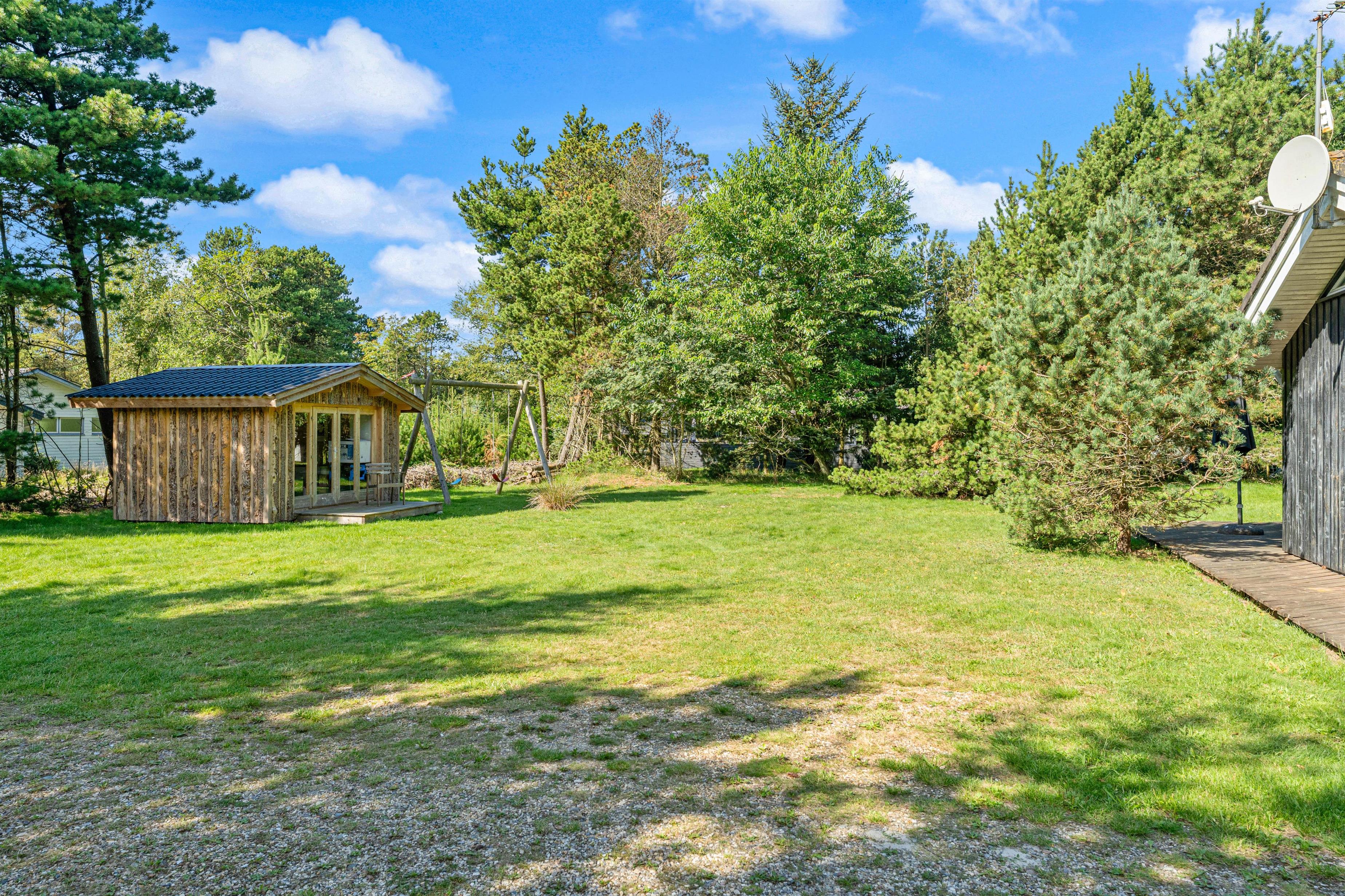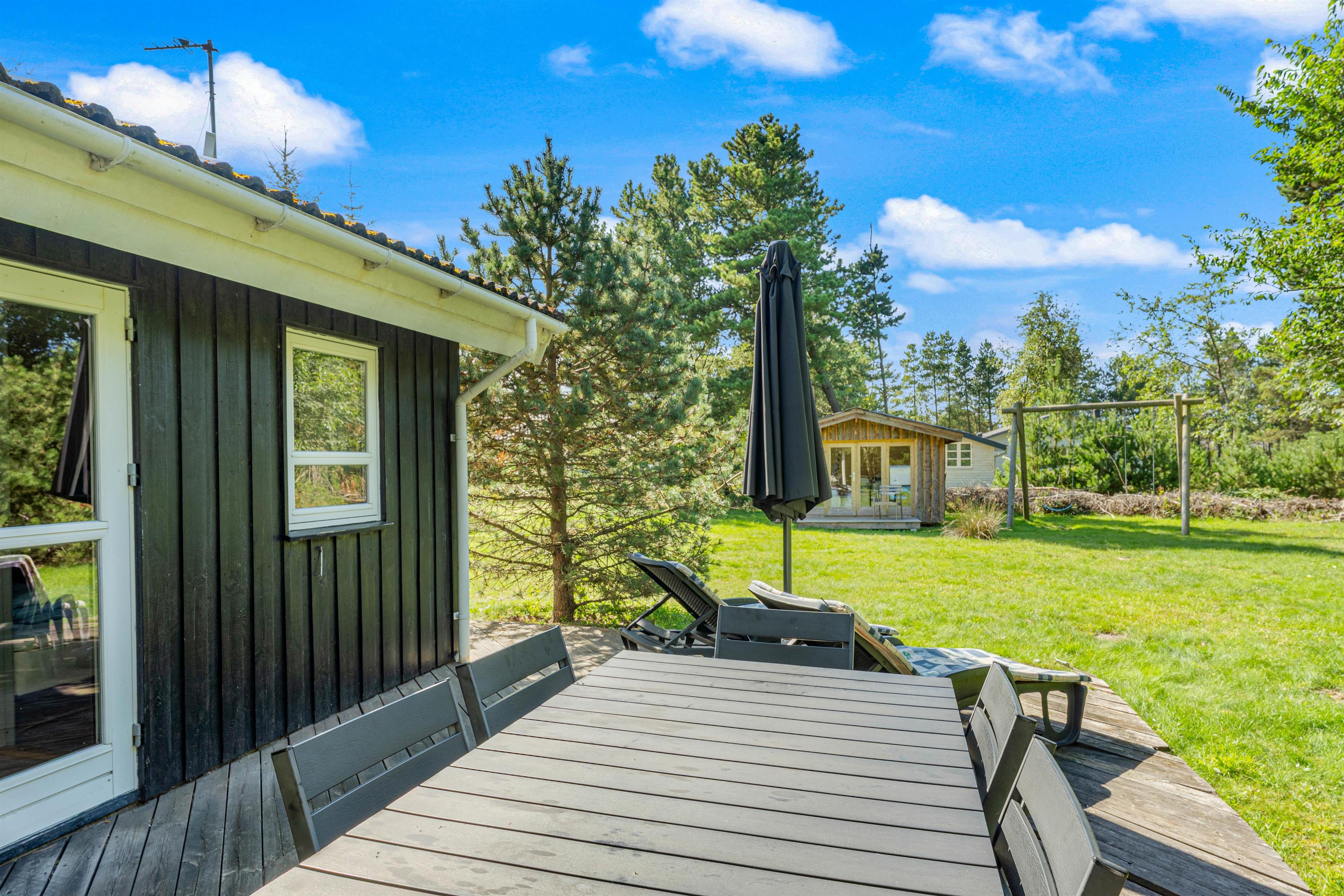 Feriehuset ligger på en stor naturgrund omgivet af høje træer. Her kan I helt ugeneret nyde de dejlige solskinsdage på terrassen, mens fuglene kvidrer i trætoppene, og ungerne spiller bold på græsplænen.