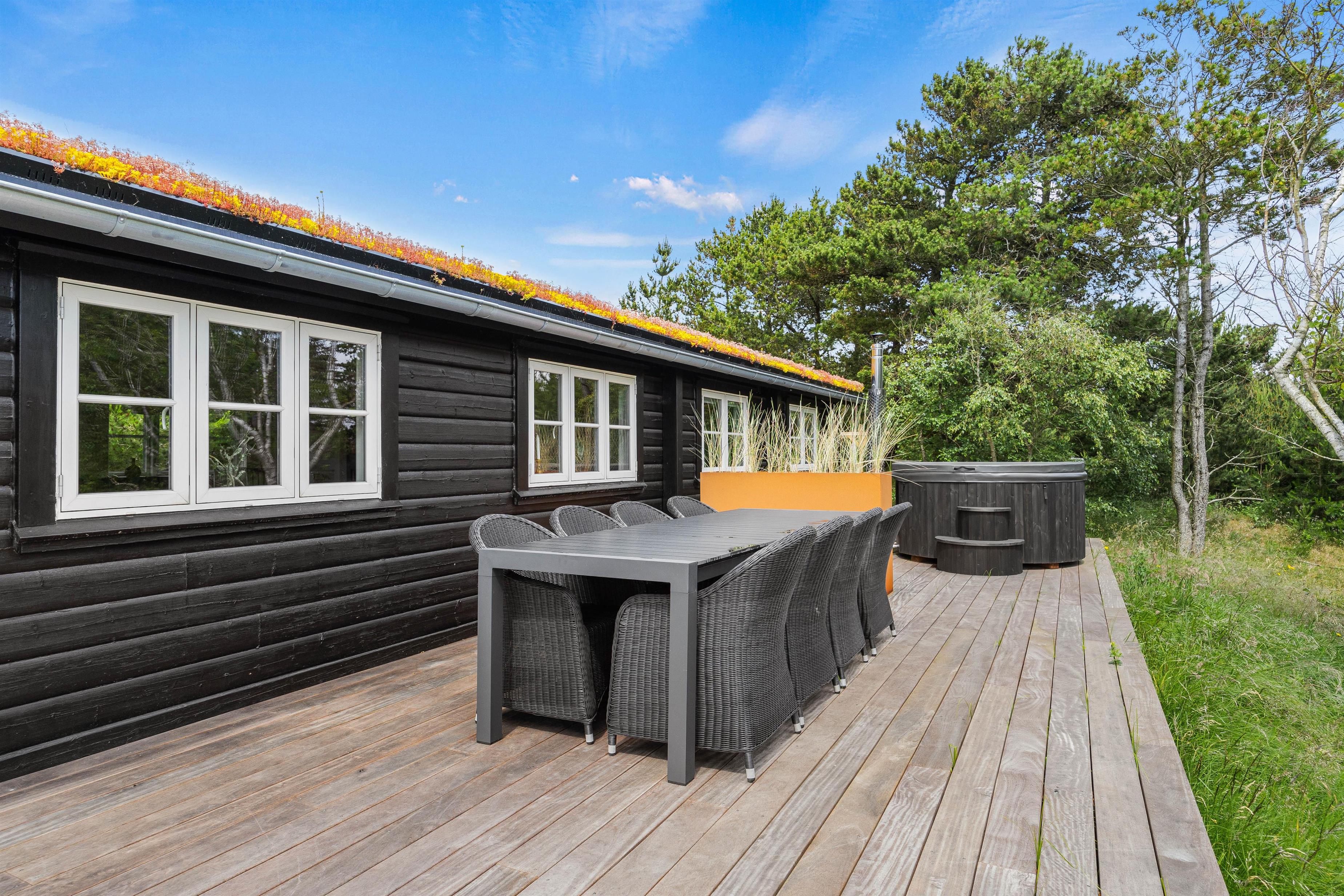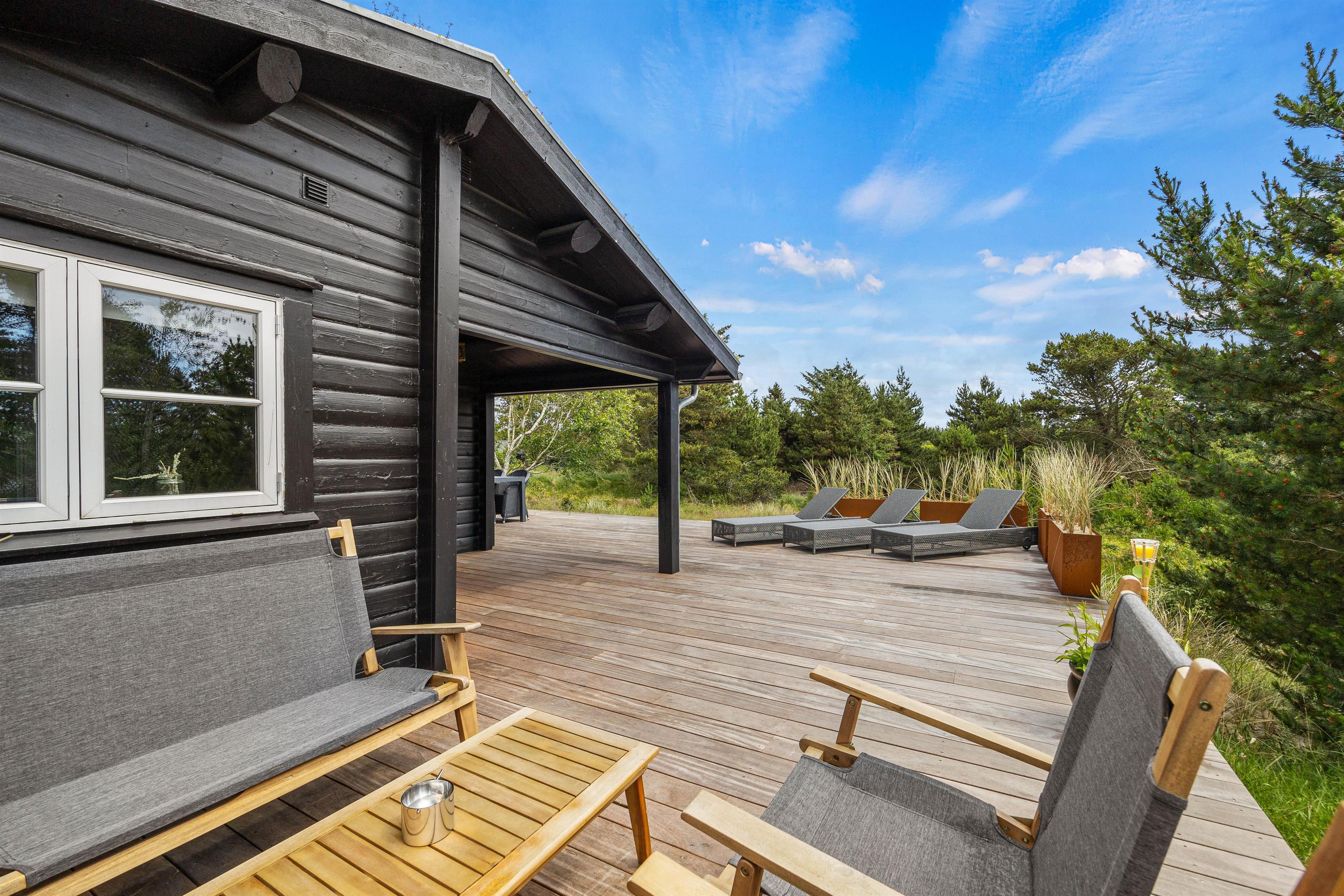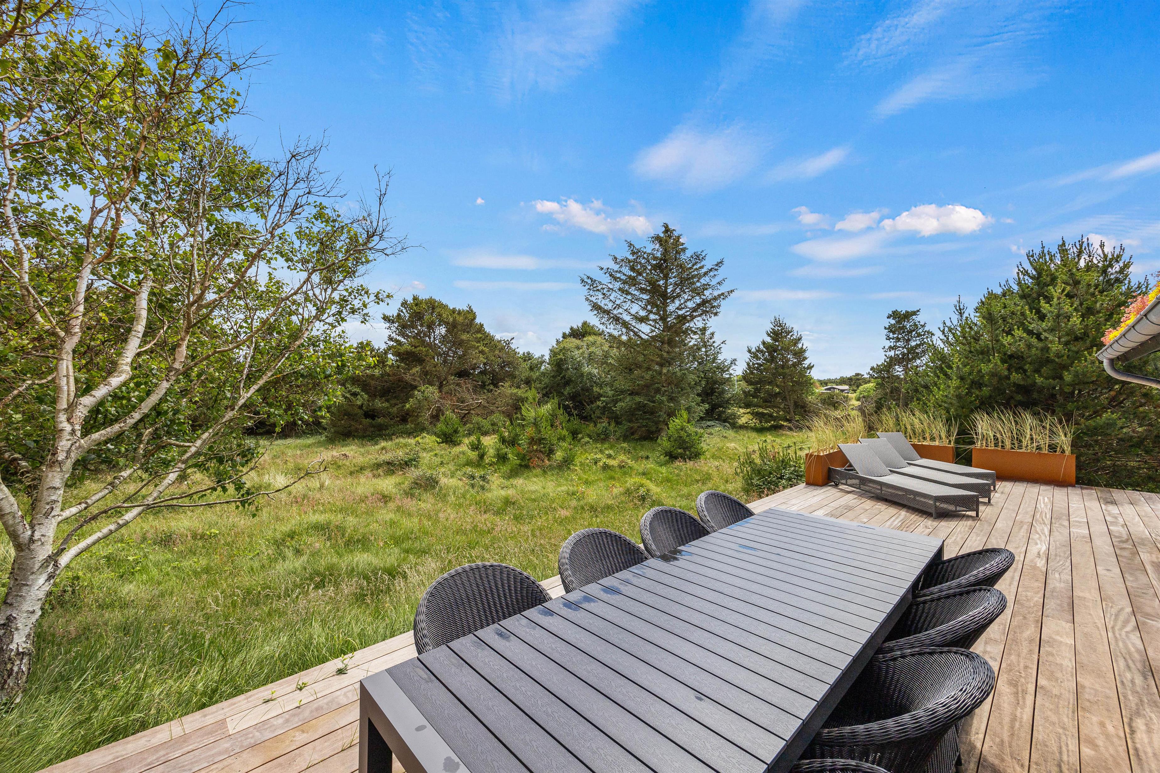Feriehuset ligger let hævet på en klit. Det betyder, at du kan finde en god plads i solen omkring huset det meste af dagen. Der er skabt flere siddepladser på alle sider. På hovedterrassen er der havemøbler og liggestole, så I kan slappe af i solen. Under den overdækkede del af terrassen, kan du sætte dig godt til rette med en kop kaffe i loungemøblerne. Der er selvfølgelig også en grill, så grillmesteren kan få frit spil. Det udendørs boblebad opvarmes af en brændeovn, og her kan I slappe af i det varme vand under fri himmel hele året rundt.