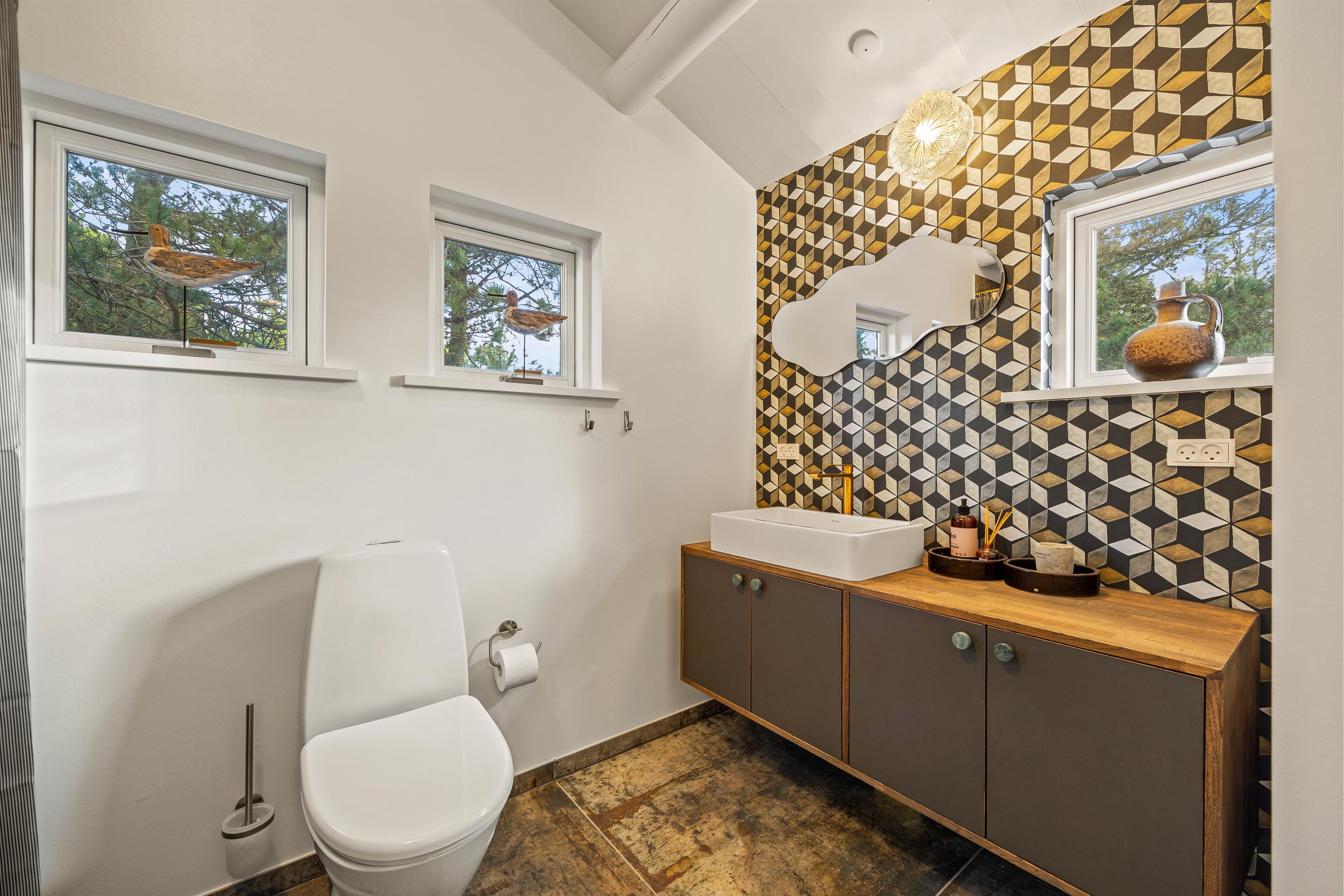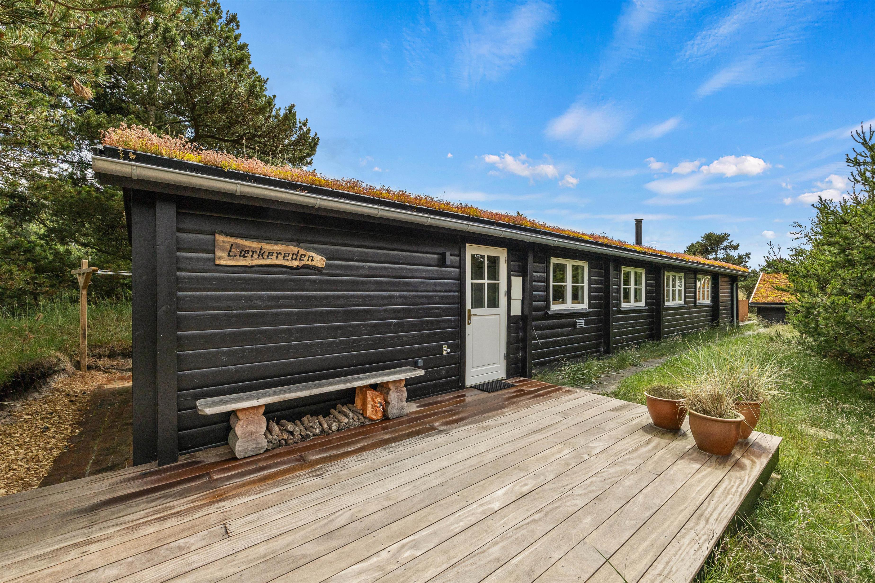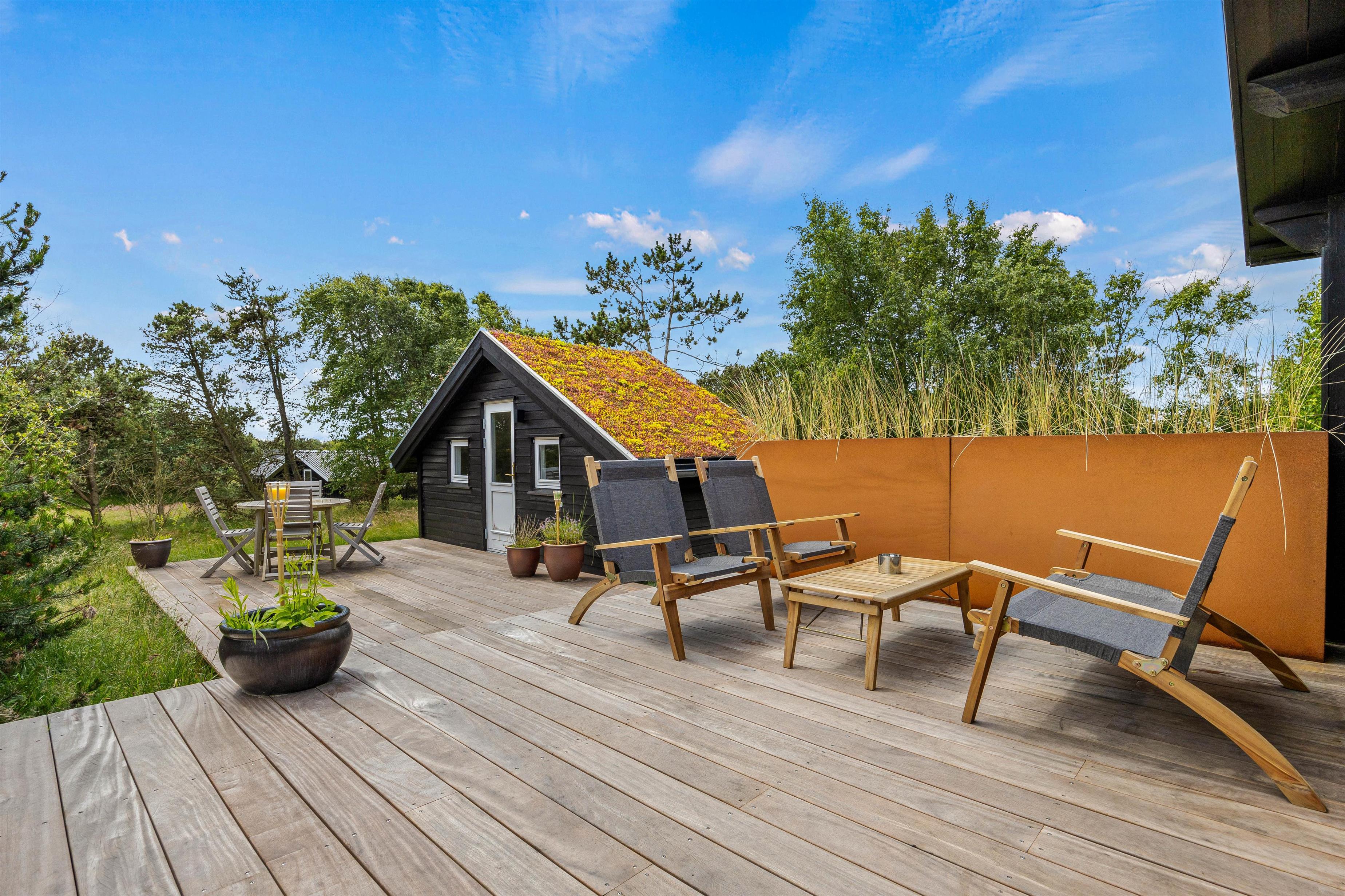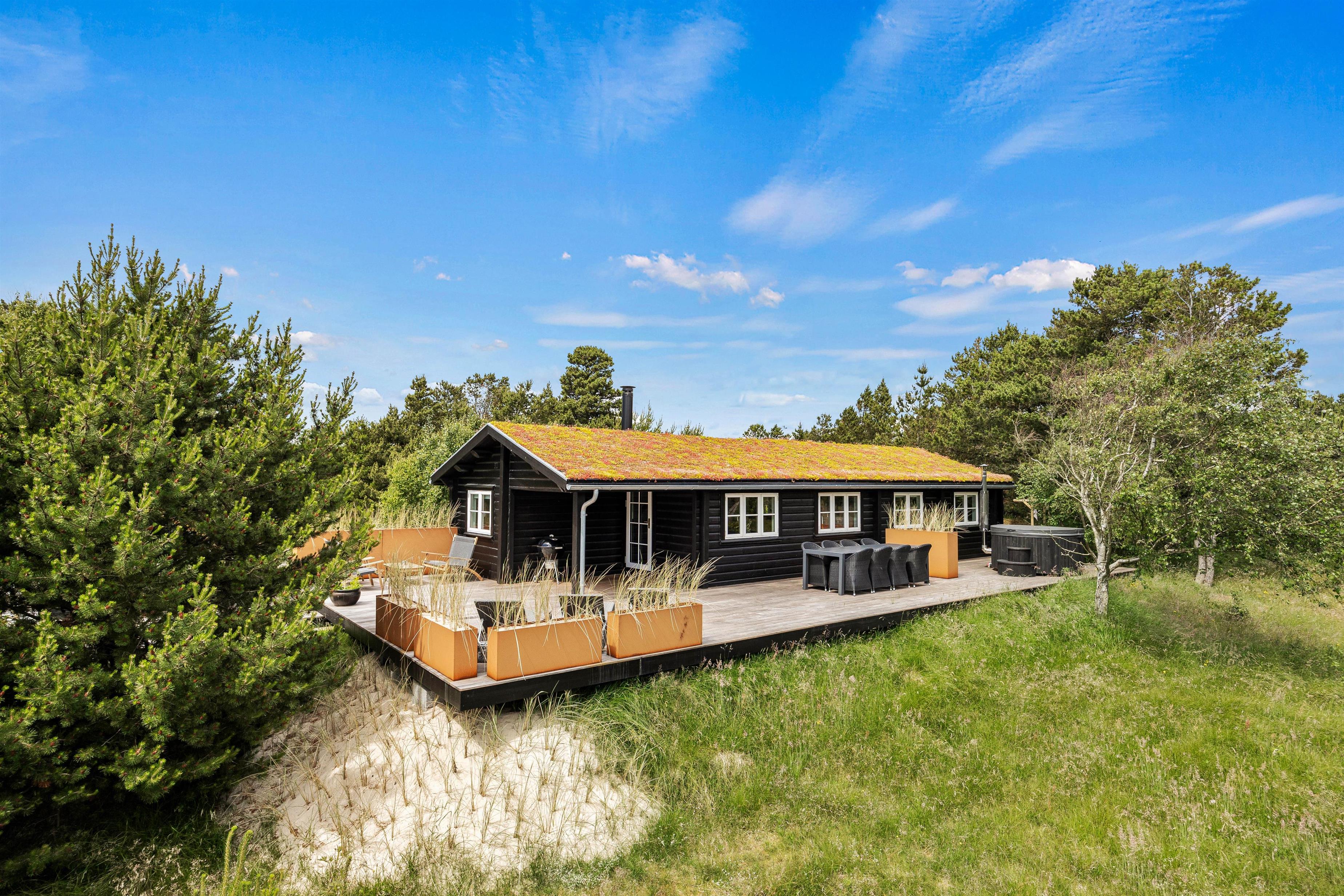Feriehuset ligger let hævet på en klit. Det betyder, at du kan finde en god plads i solen omkring huset det meste af dagen. Der er skabt flere siddepladser på alle sider. På hovedterrassen er der havemøbler og liggestole, så I kan slappe af i solen. Under den overdækkede del af terrassen, kan du sætte dig godt til rette med en kop kaffe i loungemøblerne. Der er selvfølgelig også en grill, så grillmesteren kan få frit spil. Det udendørs boblebad opvarmes af en brændeovn, og her kan I slappe af i det varme vand under fri himmel hele året rundt.