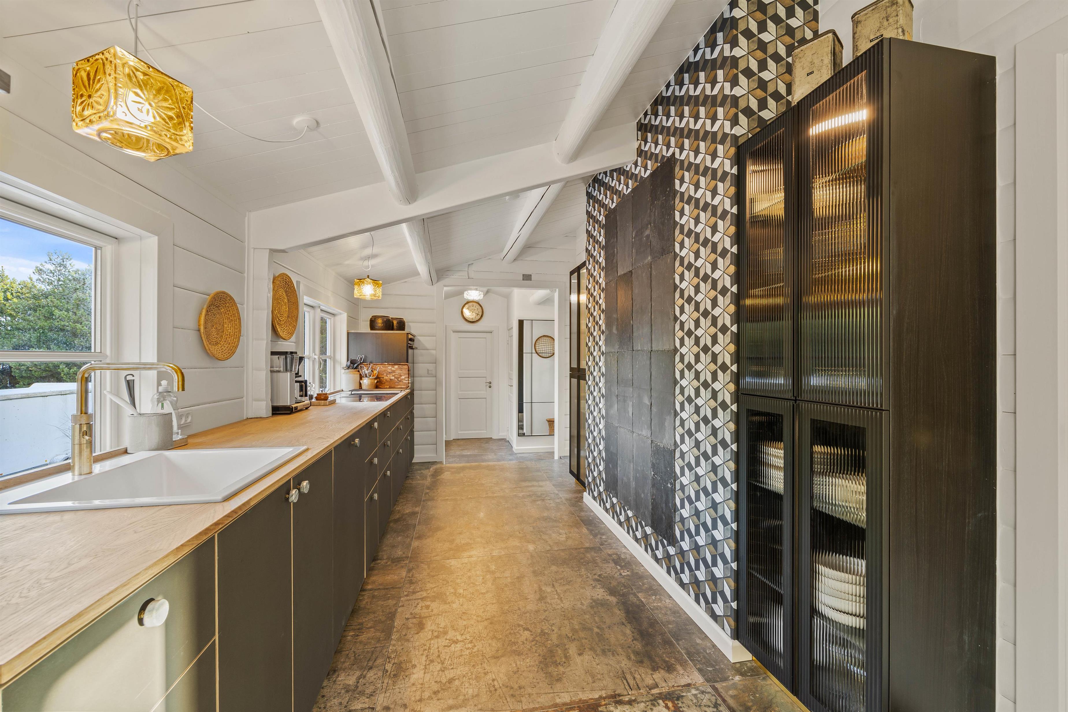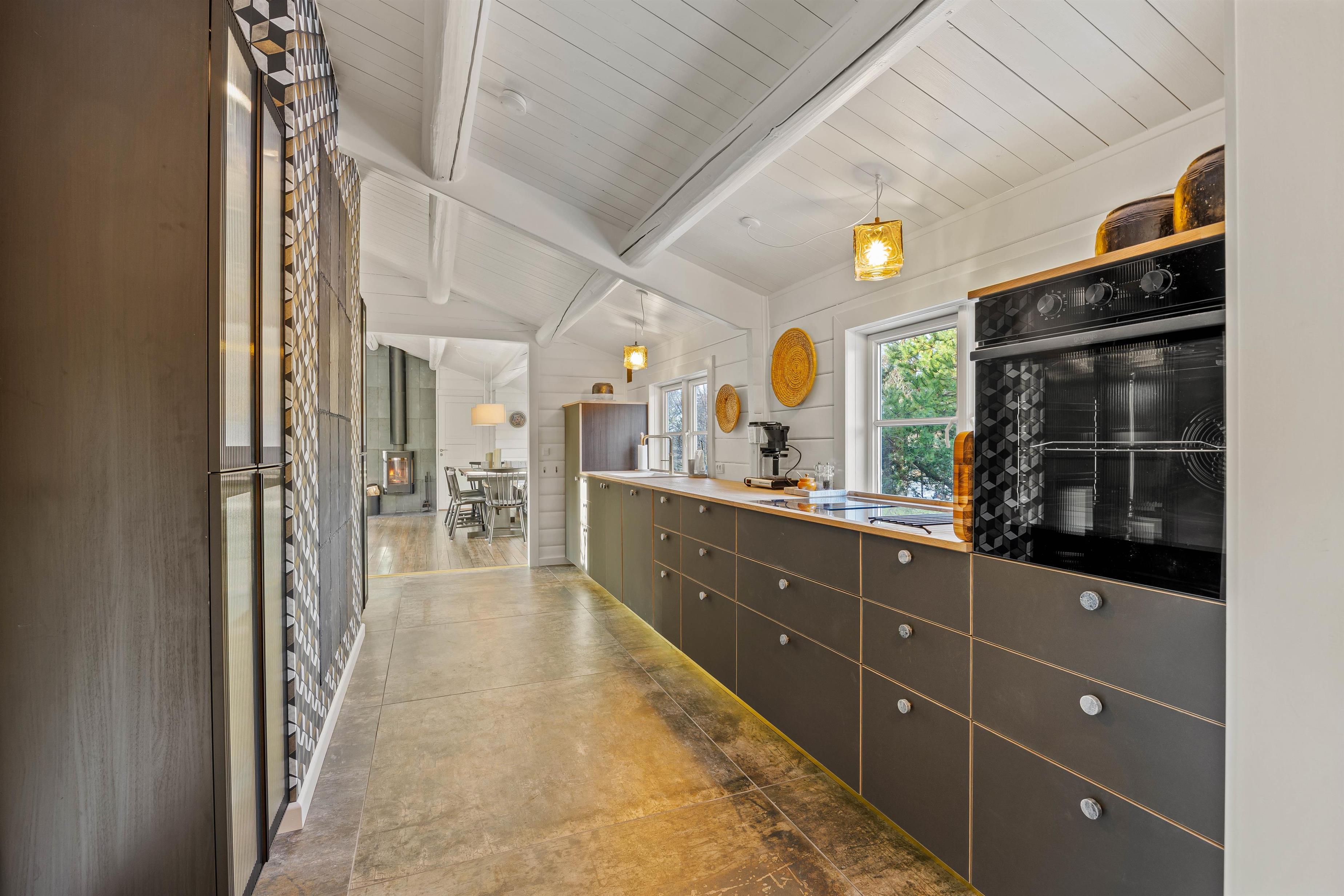 En åben gang fører ind til det fantastiske nye køkken. En ovn i ståhøjde, induktionskogeplader og en lang bordplade med udsigt over landskabet gør madlavningen til en leg og der er naturligvis hjælp til opvasken.