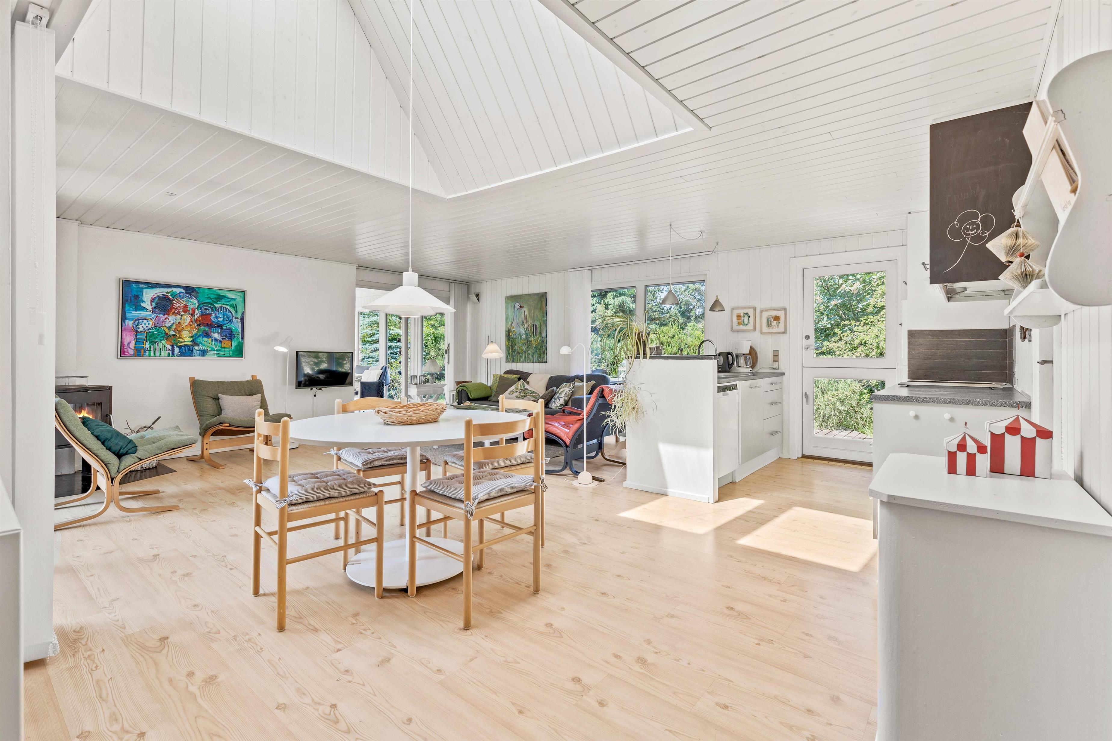 Imens ilden knitrer i brændeovnen og spæder varme og hygge, kan I slappe af i køkken-alrummet, sætte jer til rette i lædersofaen med en god bog eller sammen tilberede et lækkert måltid i det åbne køkken. Fine detaljer som lysskakten over spisebordet giver en dejlig atmosfære.