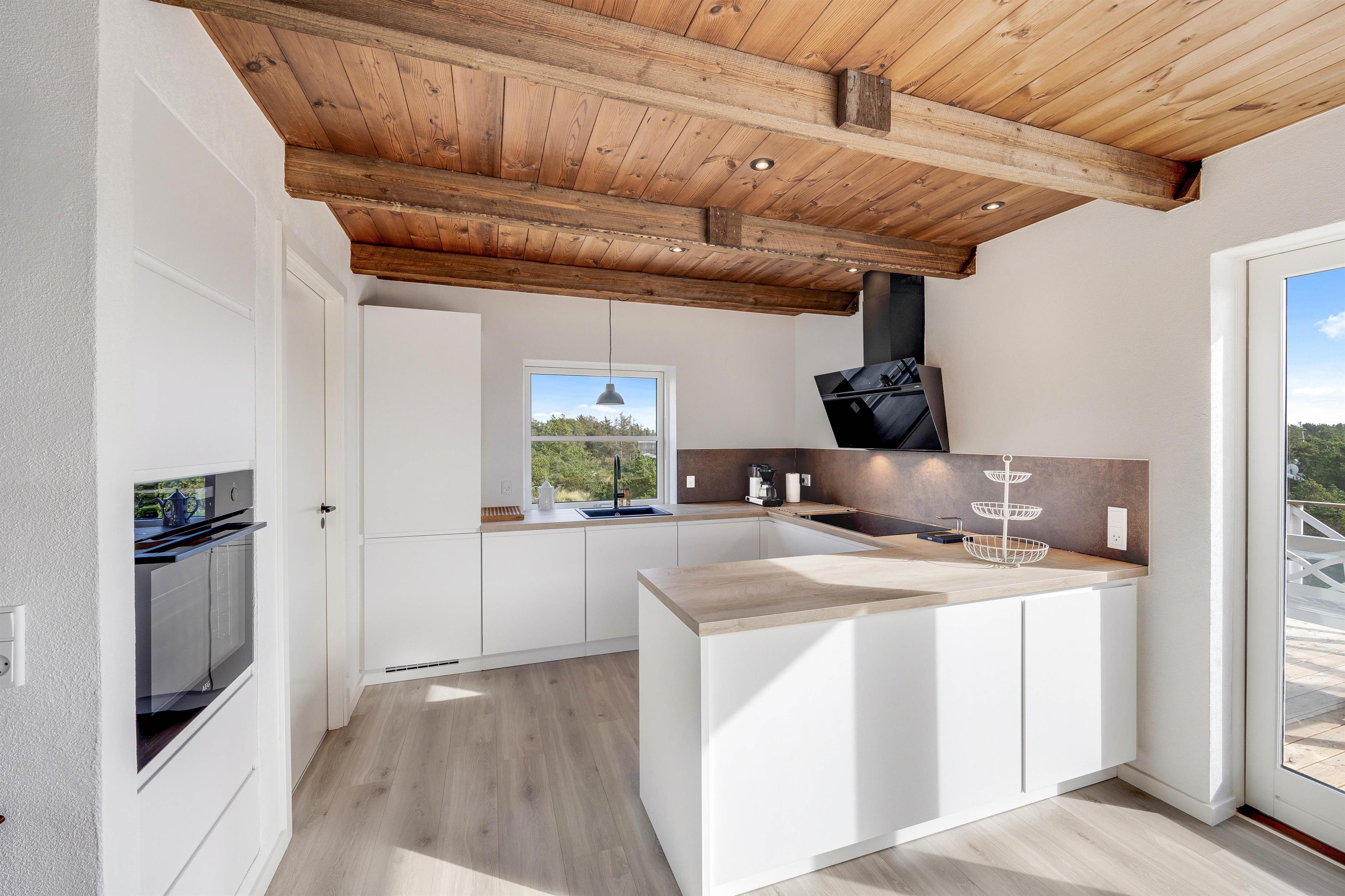 Sommerhusets køkken er forenet med stuen og spisepladsen i alrummet, som kommer til at være jeres samlingspunkt på ferien. I alrummet er rammerne sat for skønne feriestunder for hele ferieflokken, hvor I både kan lave mad i køkkenet, se film i tv’et og spille sjove spil omkring bordet, mens brændeovnen fuldender feriestemningen i baggrunden. I alrummet har I desuden gulvvarme, der holder fødderne varme.
