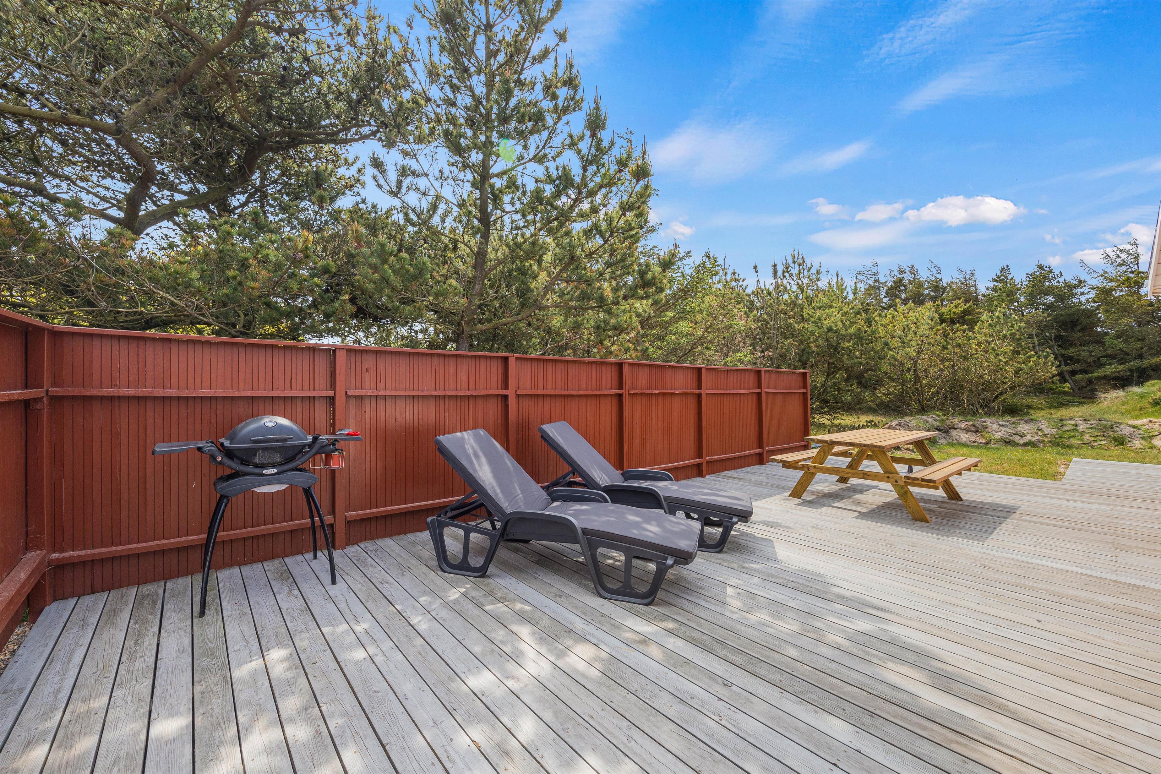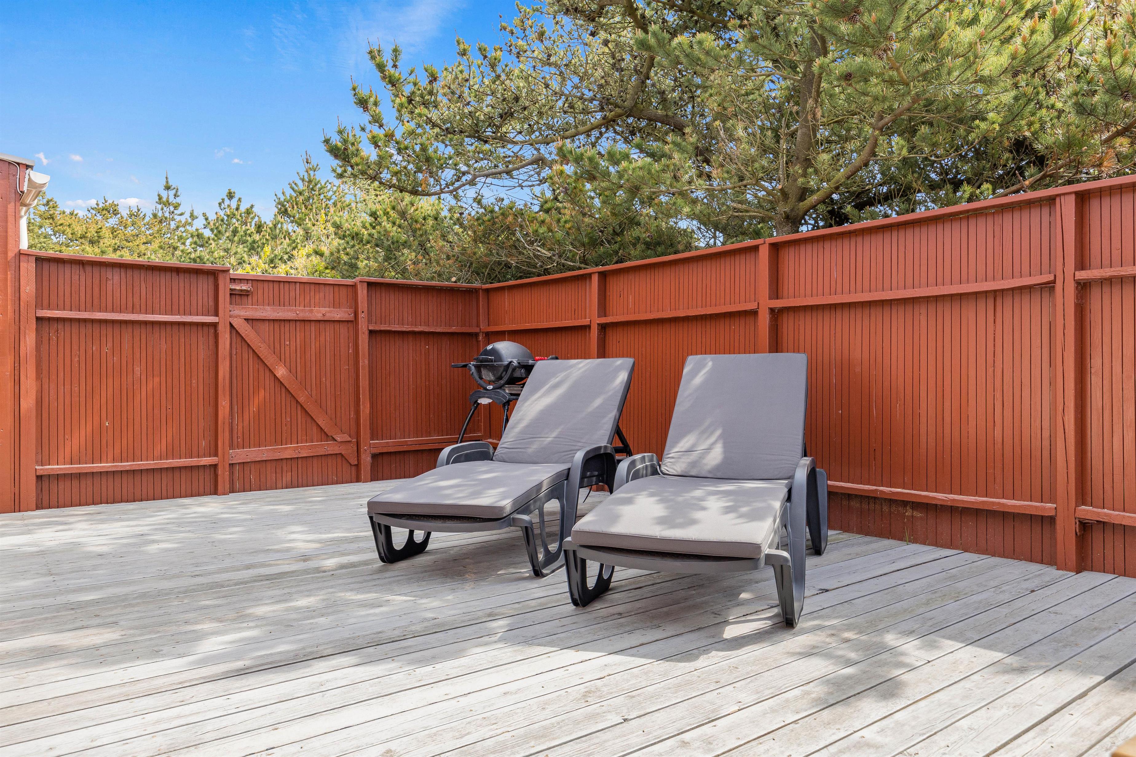 På den overdækkede træterrasse er der liggestole til en afslappende lur i den friske luft. Her finder I også grillen, hvor I kan tilberede jeres bøffer eller pølser sidst på dagen. Der er desuden en solcelleopvarmet udebruser, som kan benyttes i sommerhalvåret. Udebruser er lukket fra 1. november til 1. april på grund af frostsikring.