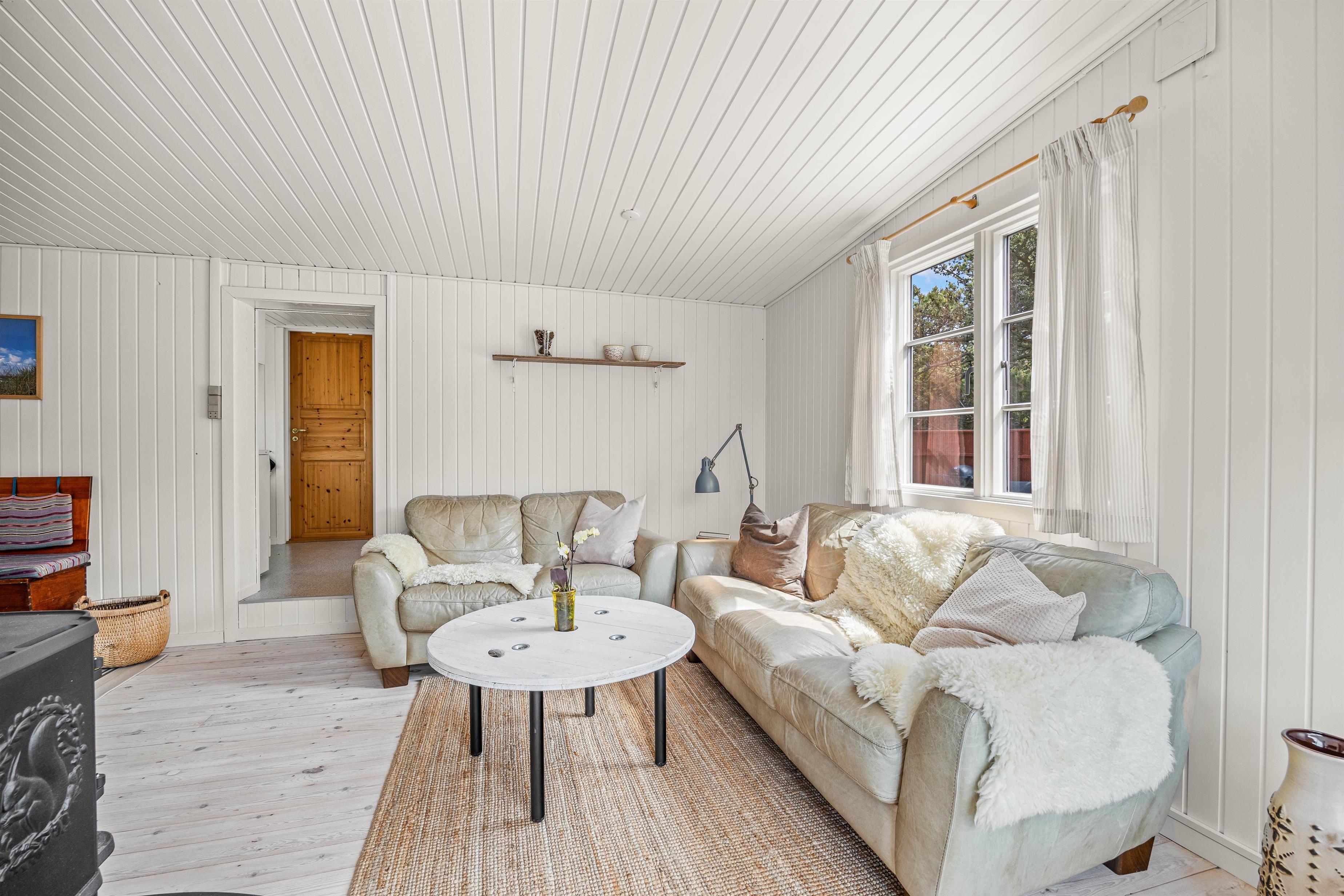 I stuen mødes I af en blanding af lyse farver, puder, brændeovn og fine møbler, der giver rummet en meget hyggelig atmosfære. De store vinduer lukker en masse lys ind i rummet og giver jer en vidunderlig udsigt over lyng og marehalm. Når opvarmningen skal gå lidt hurtigere, kan I tænde den energivenlige varmepumpe og feriehuset vil snart være opvarmet.