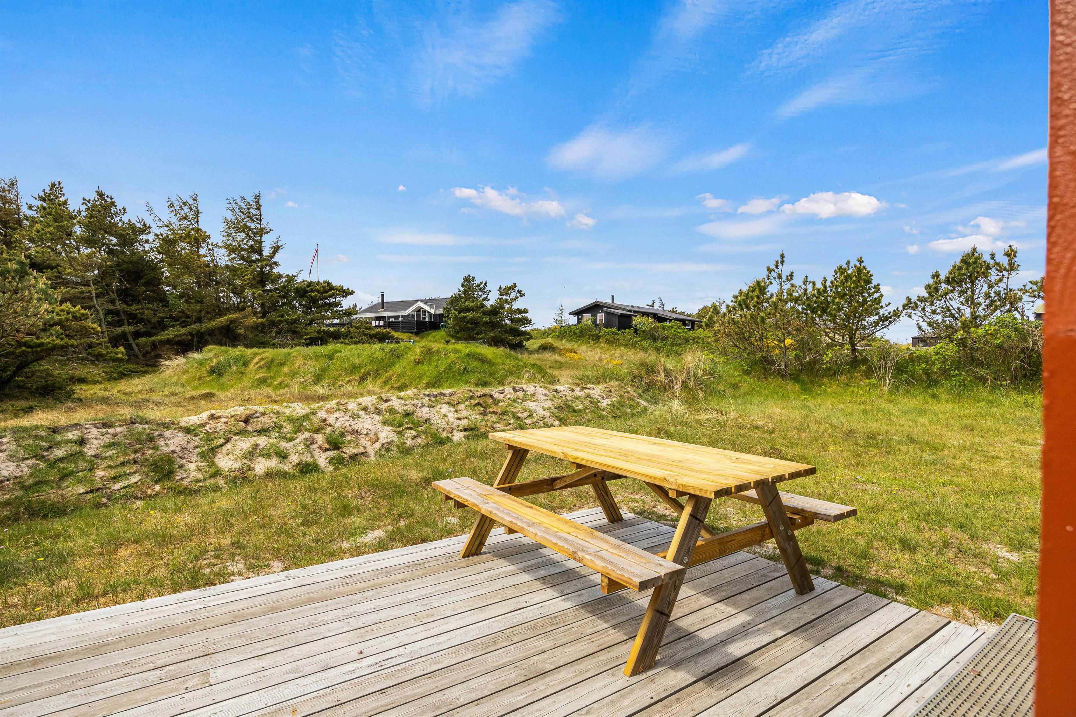 Feriehuset ligger i læ, hvor I på alle tider af døgnet kan fange et par solstråler på de forskellige terrasser. På den ene side grænser en lille fyrretræslund op til feriehuset, hvor I måske er heldige at få besøg af en kronhjort eller 2.