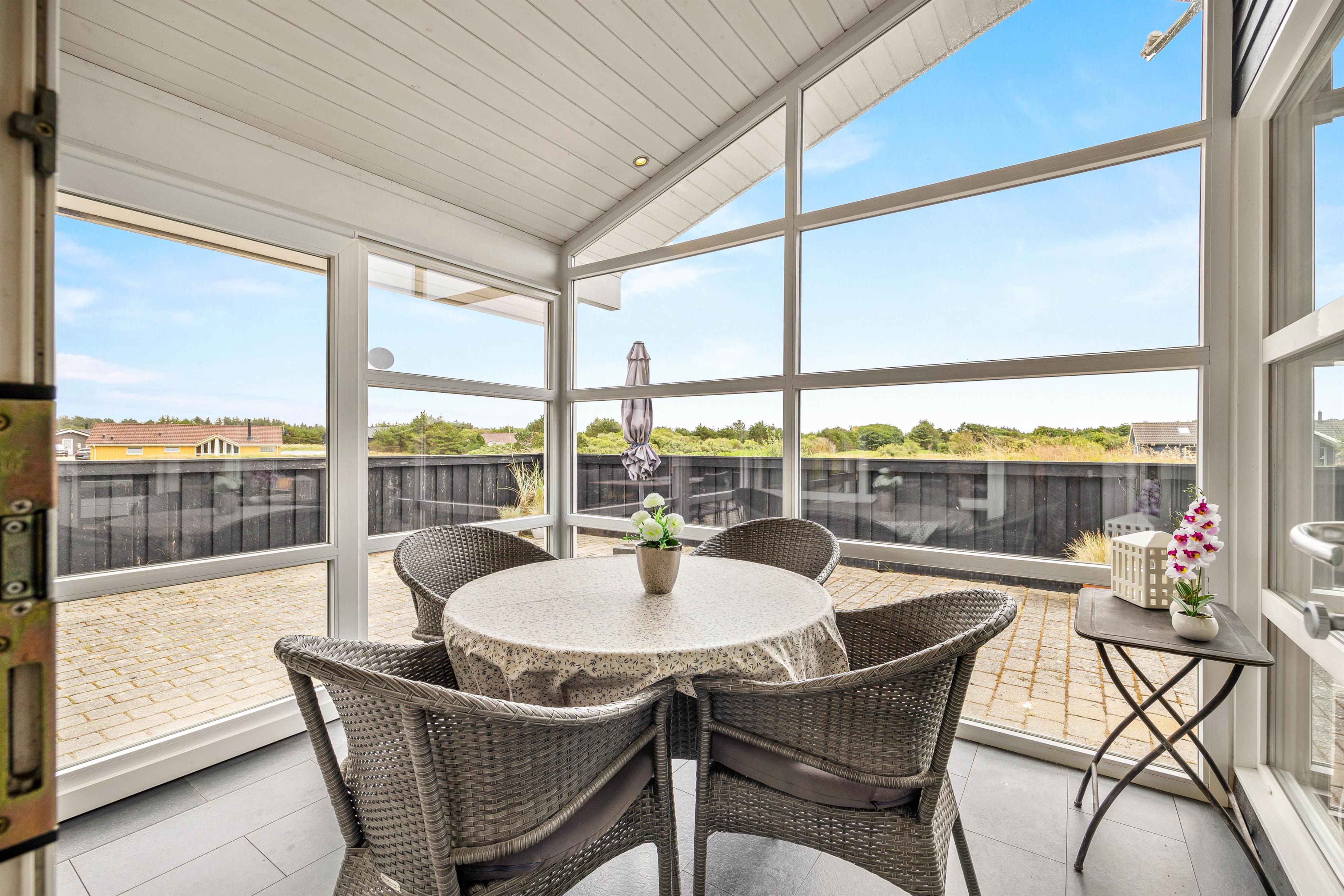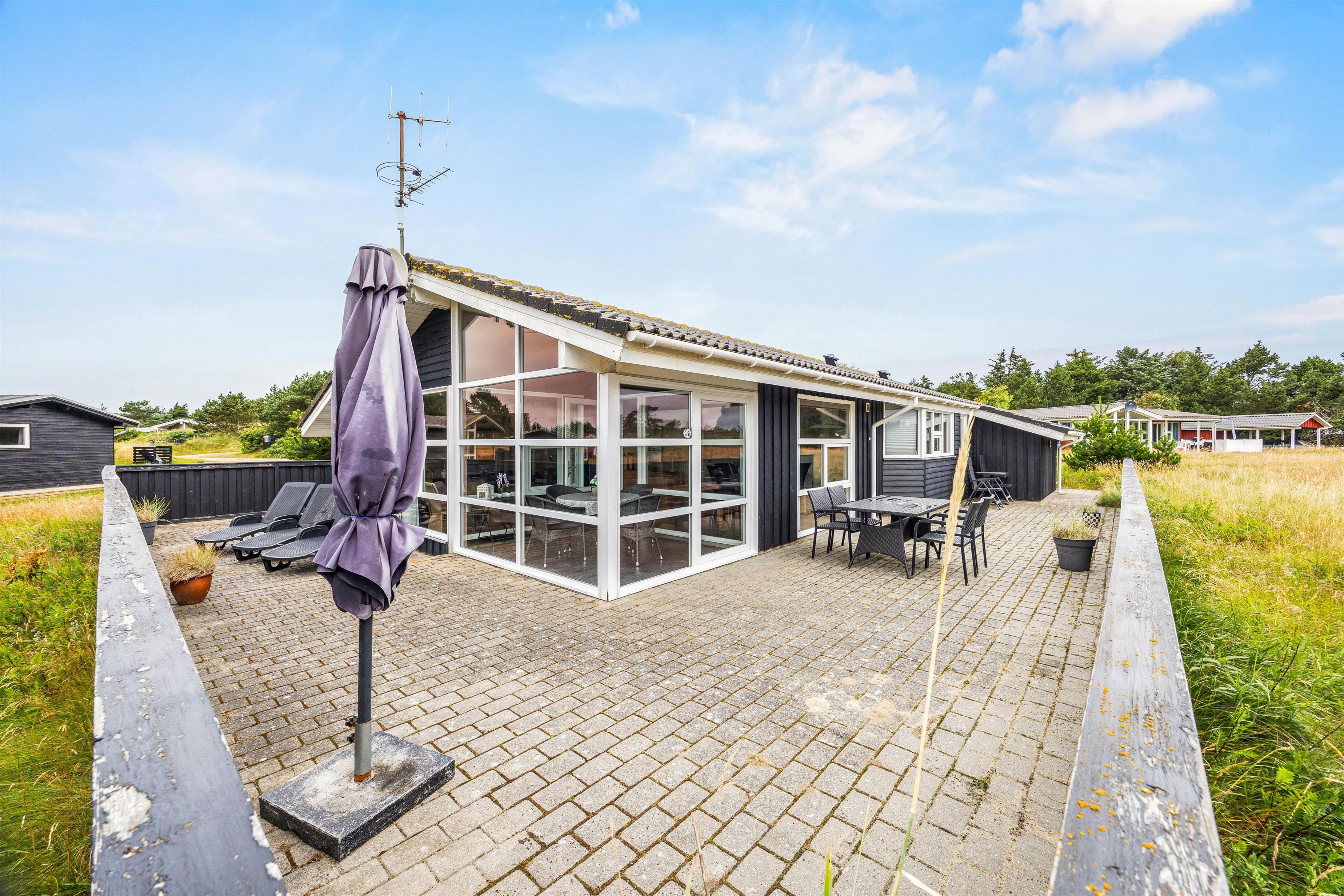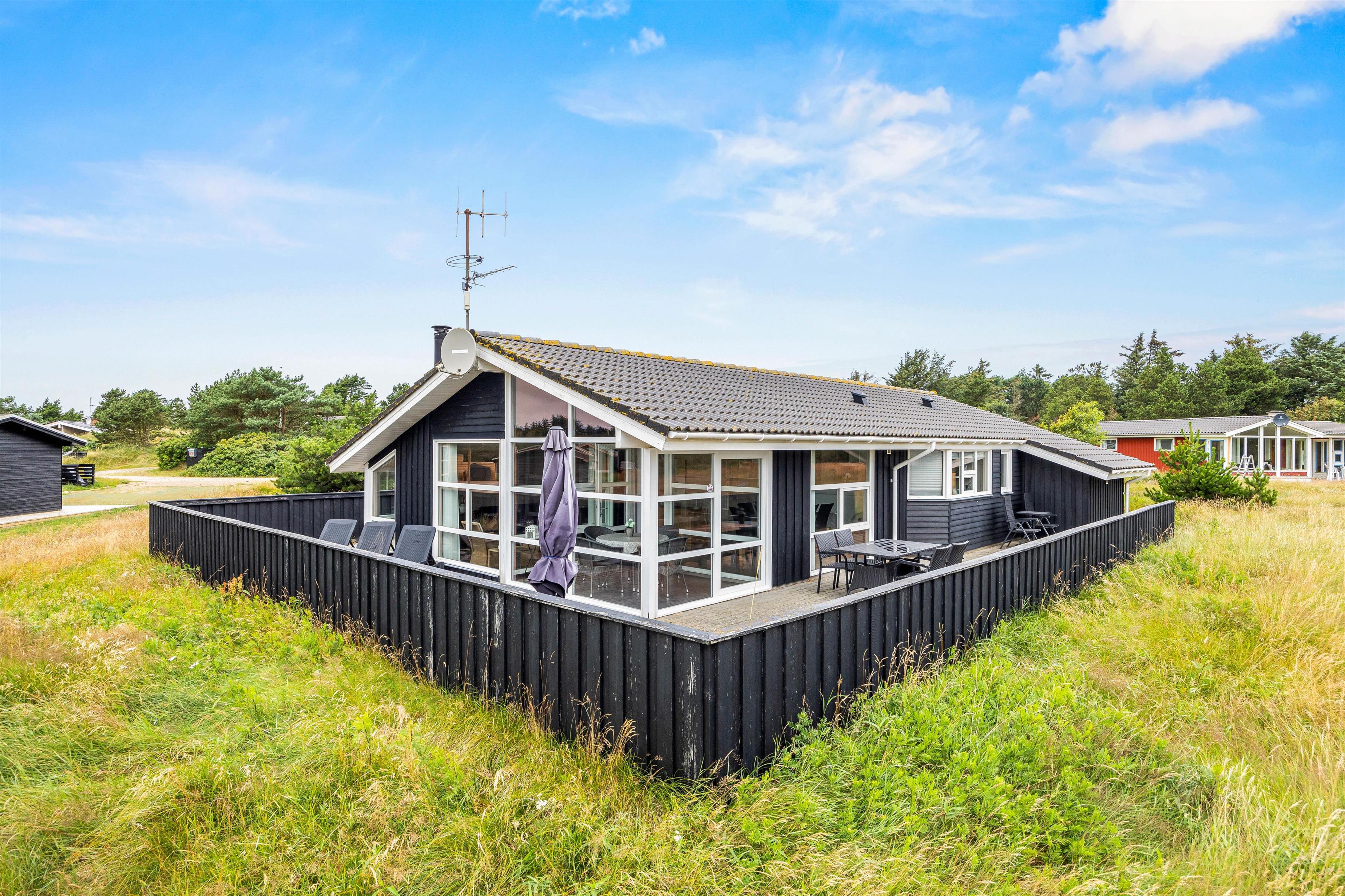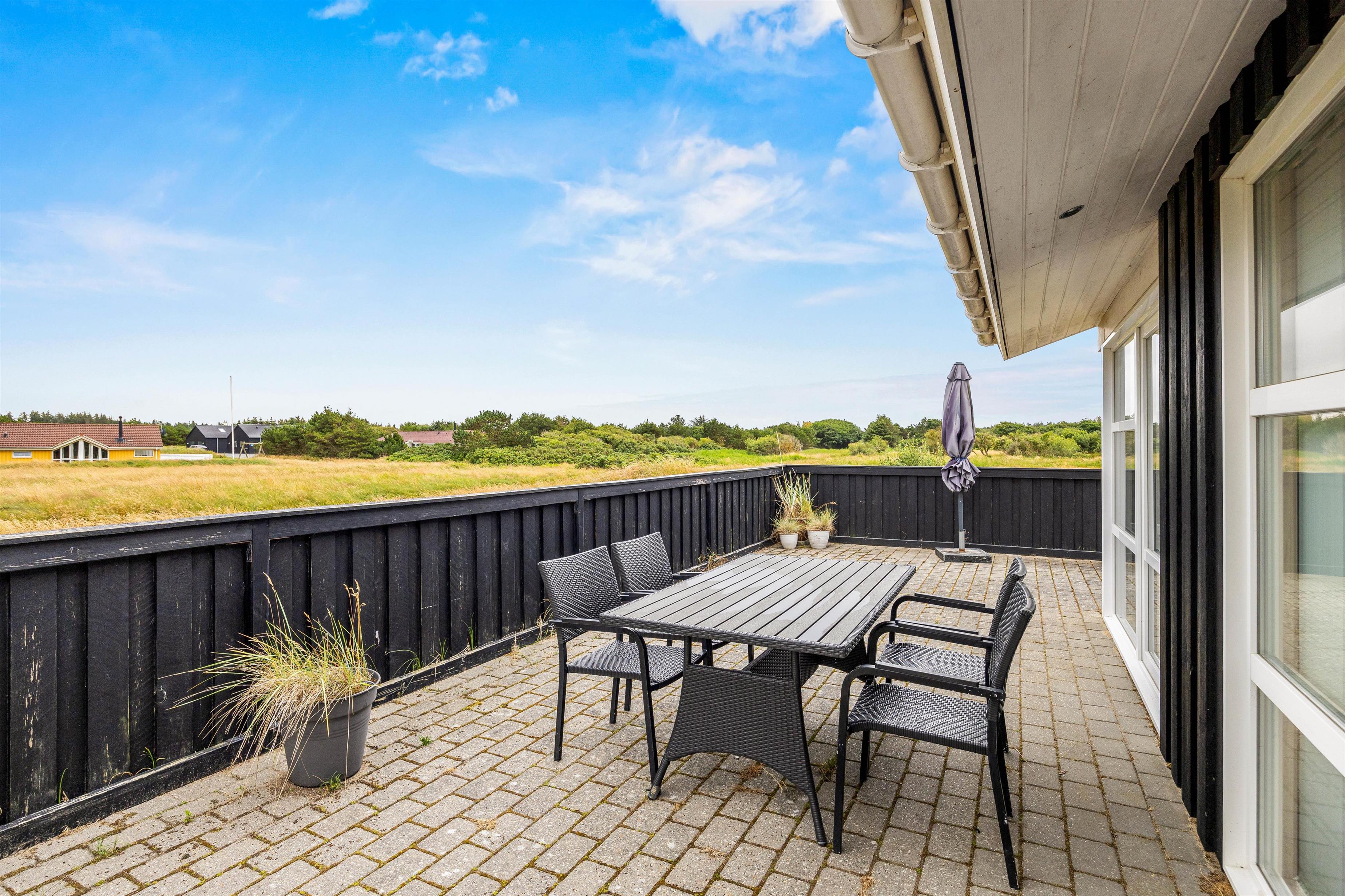 Den 1500 kvm store naturgrund har masser af plads til afslapning og aktiviteter udendørs. På den delvist afskærmede terrasse, der omgiver feriehuset på 3 sider, kan I arrangere hyggelige grillaftener. Afhængigt af solens position og vindretning kan I altid finde en rolig plet i den friske havluft. Tag solbad i de komfortable liggestole, eller træk jer tilbage i havemøblerne og nyd en kop kaffe eller en kølig drink i den friske luft.