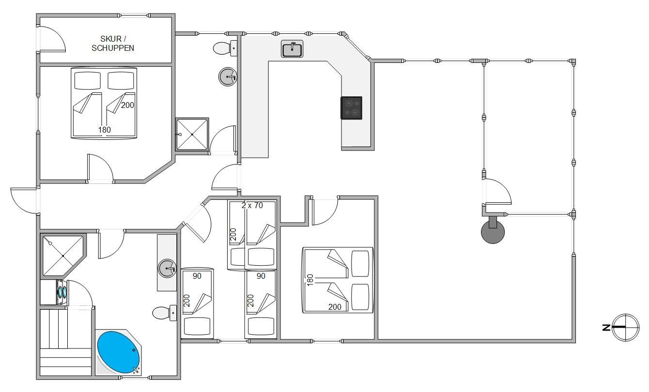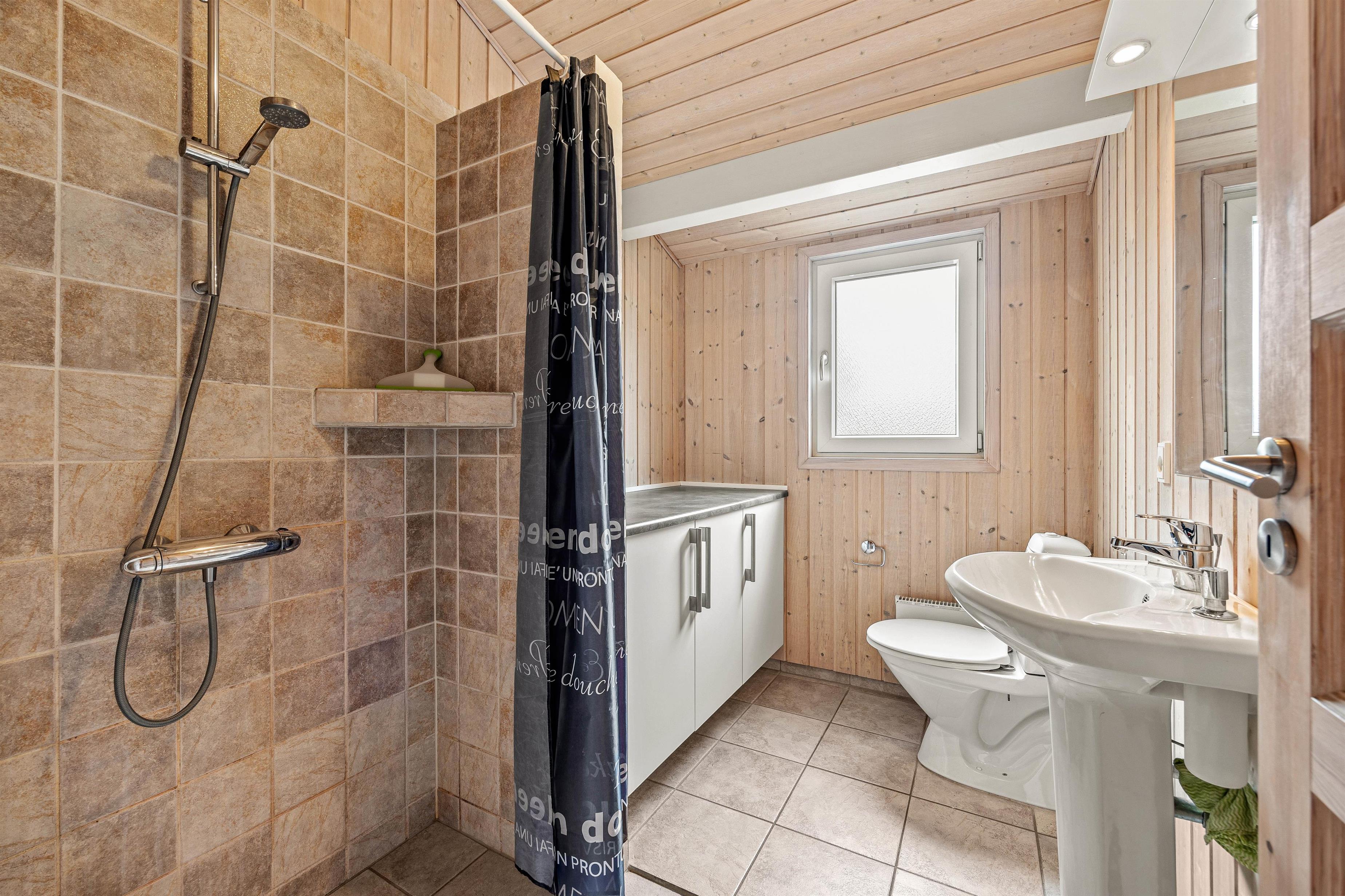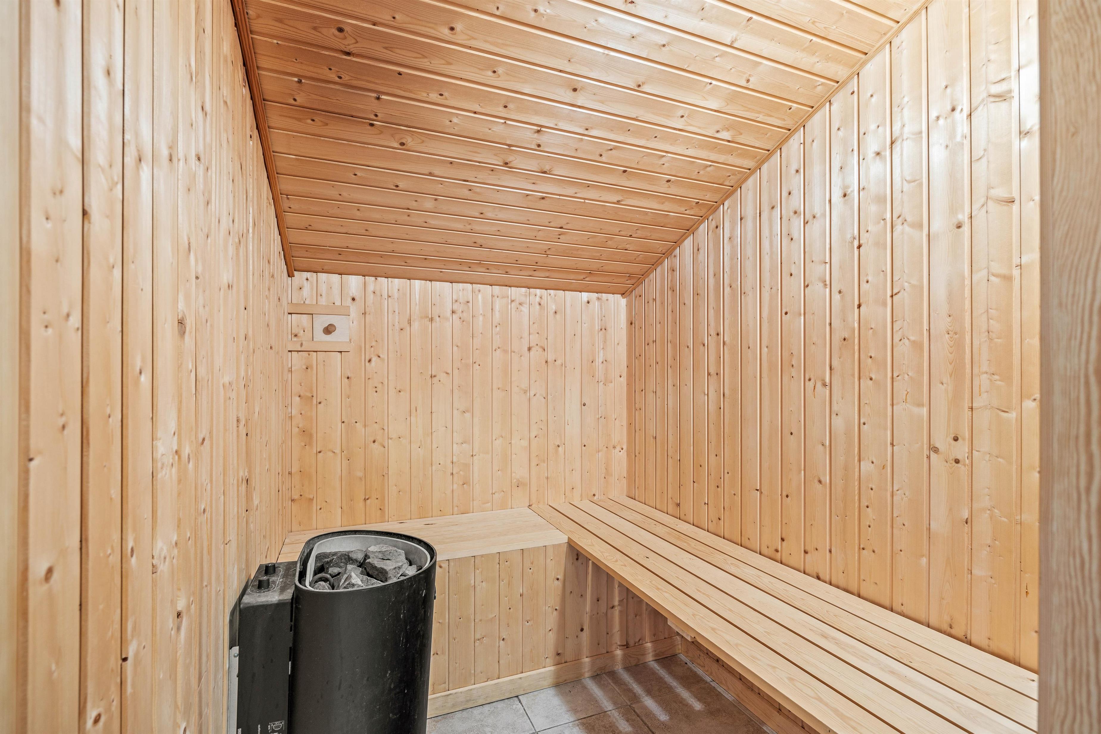 Feriehuset har desuden 2 rummelige badeværelser med brusebad og gulvvarme. Det store badeværelse giver adgang til infrarød sauna og spa. Her kan I slappe af i det varme vand eller nyde en lang saunatur. De hyggelige soveværelser har god opbevaringsplads. Der er 1 soveværelse med dobbeltseng og 2 soveværelser med hver 2 enkeltsenge, så I kan fordele jer, som det passer jer bedst.