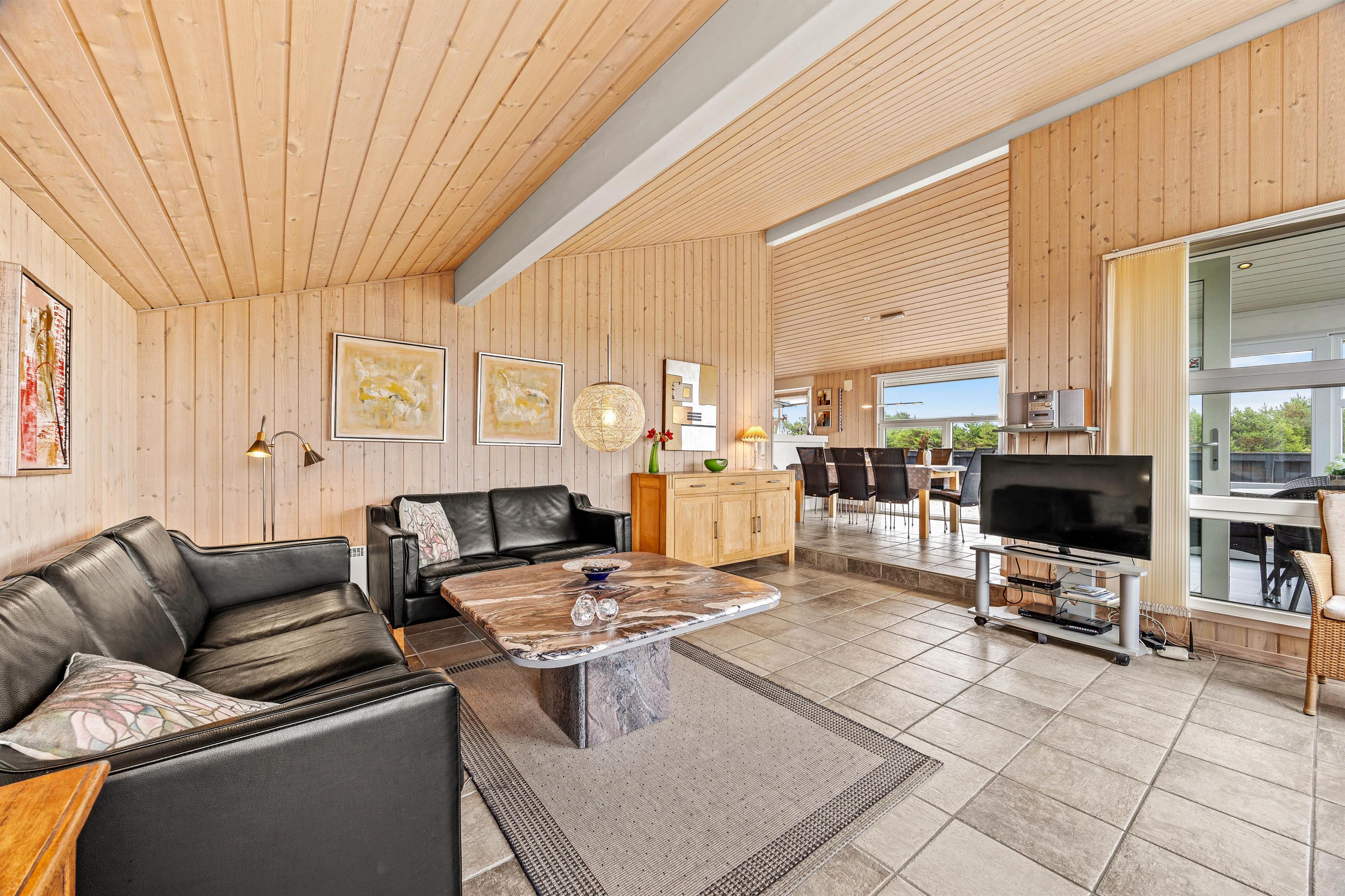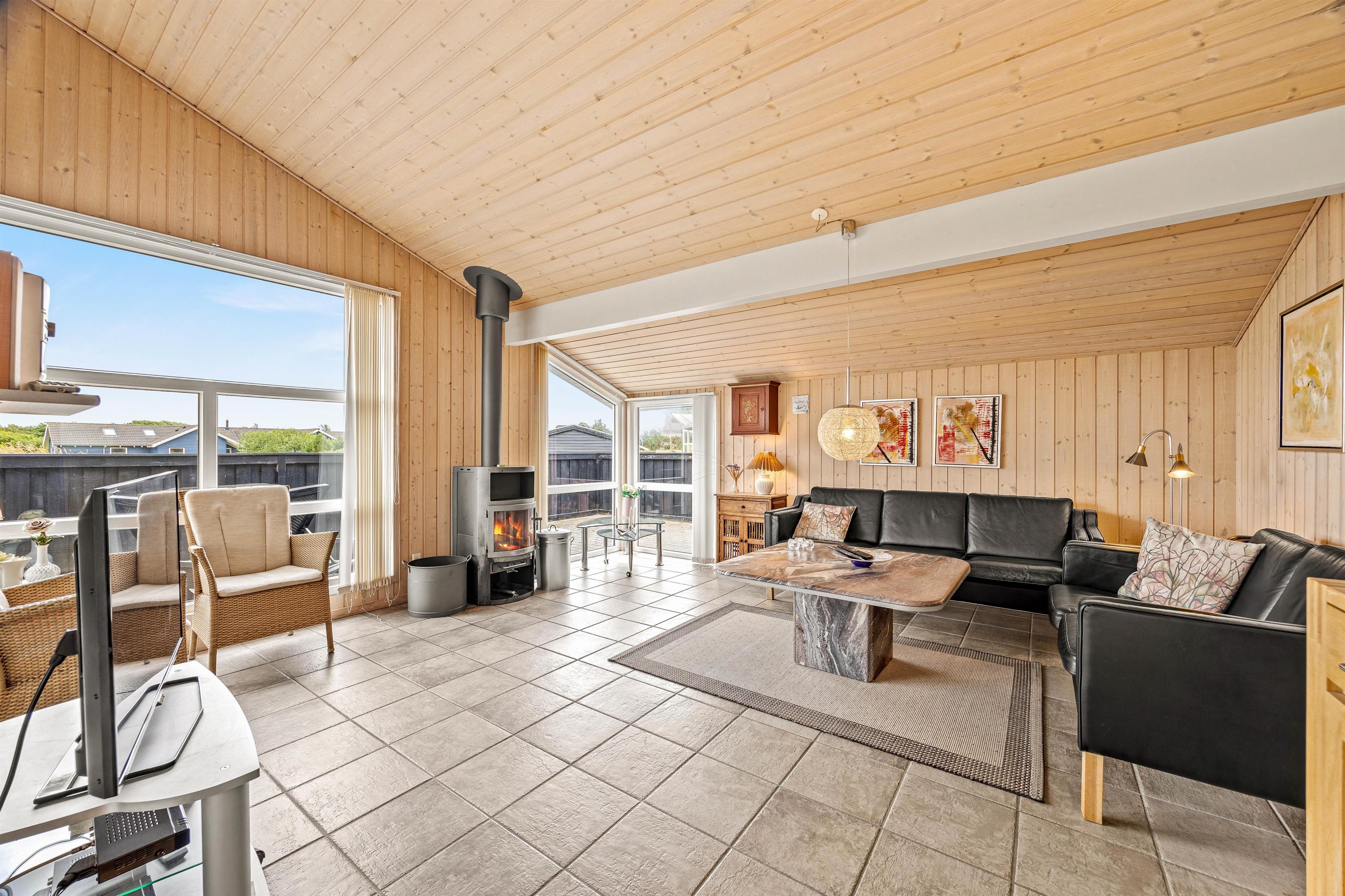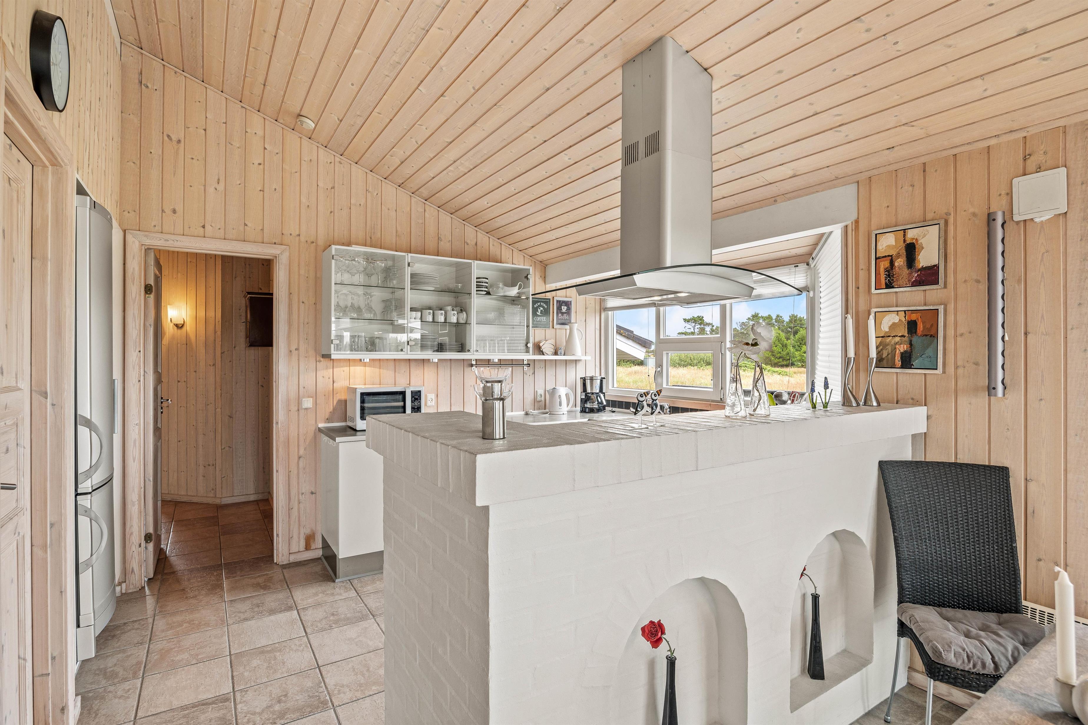 Det stemningsfyldte feriehus på Aavej 10 er indrettet med sans for detaljer. Den lyse opholdsstue har lyse gulve med gulvvarme, træbeklædte vægge og lofter op i kip. Et fint lysindfald gennem de brede vinduespartier er med til at give en lys og let atmosfære. Med ild i brændeovnen kan I her nyde hyggelige TV-aftener eller trække jer tilbage med en god bog. I det moderne, åbne køkken med induktionskomfur og opvaskemaskine kan I tilberede lækre måltider. En muret bar adskiller køkkenet fra spiseområdet, hvorfra I har direkte adgang til udestuen. Her kan I også nyde udsigten til naturen på kølige dage og aftener.