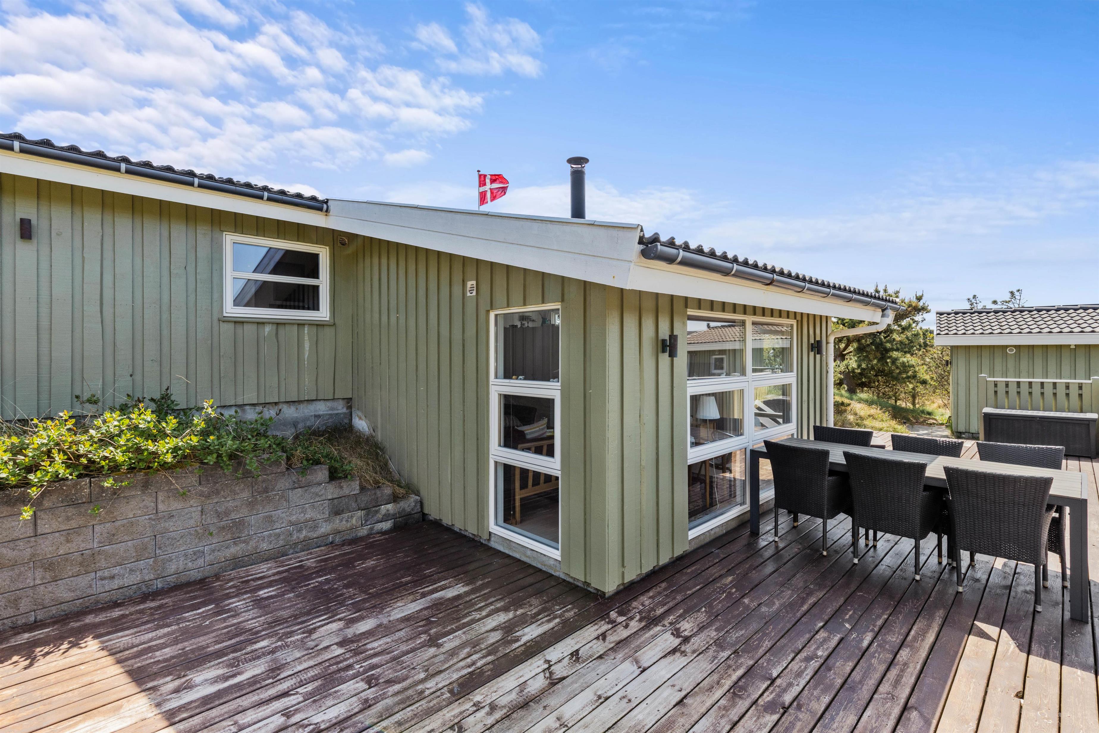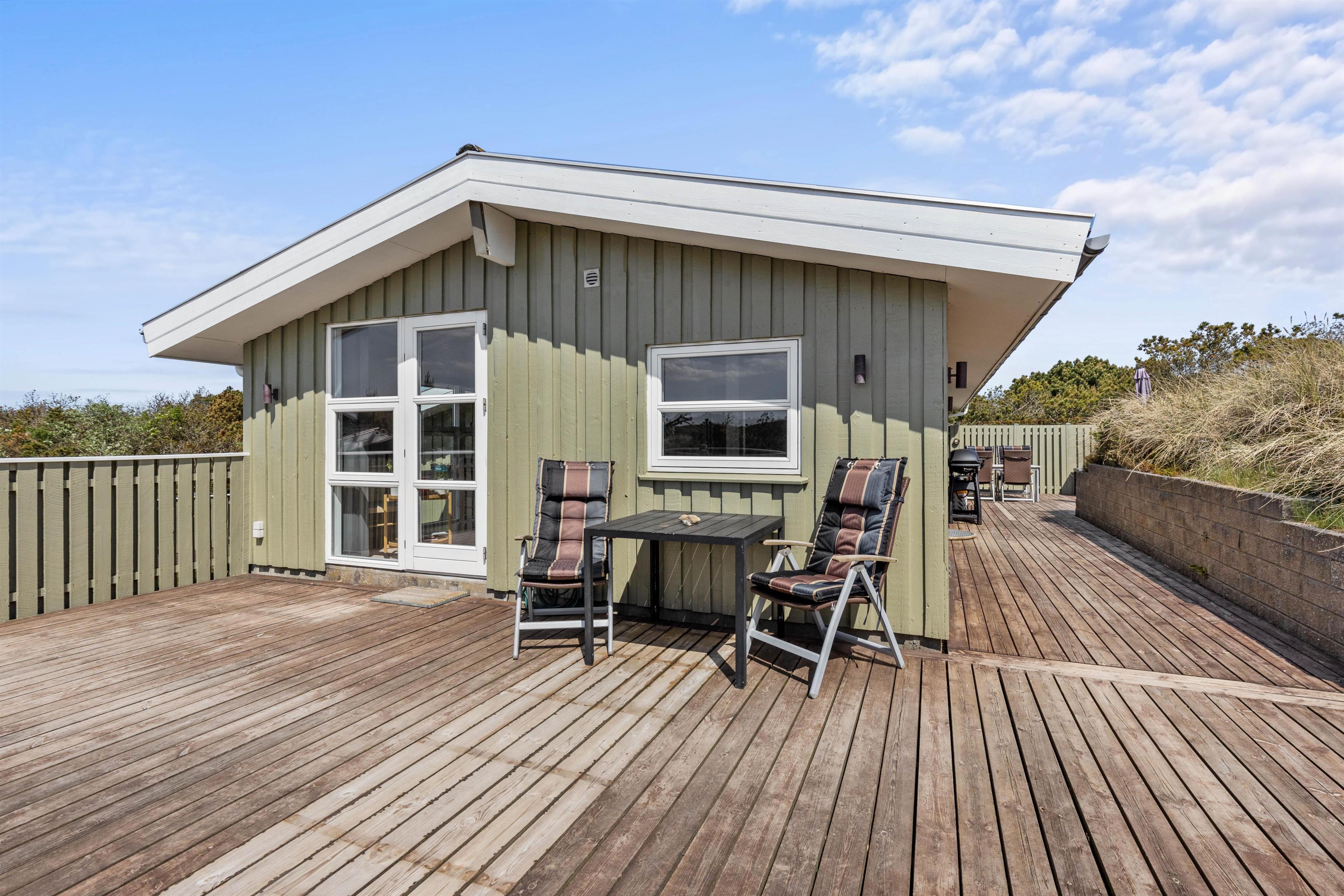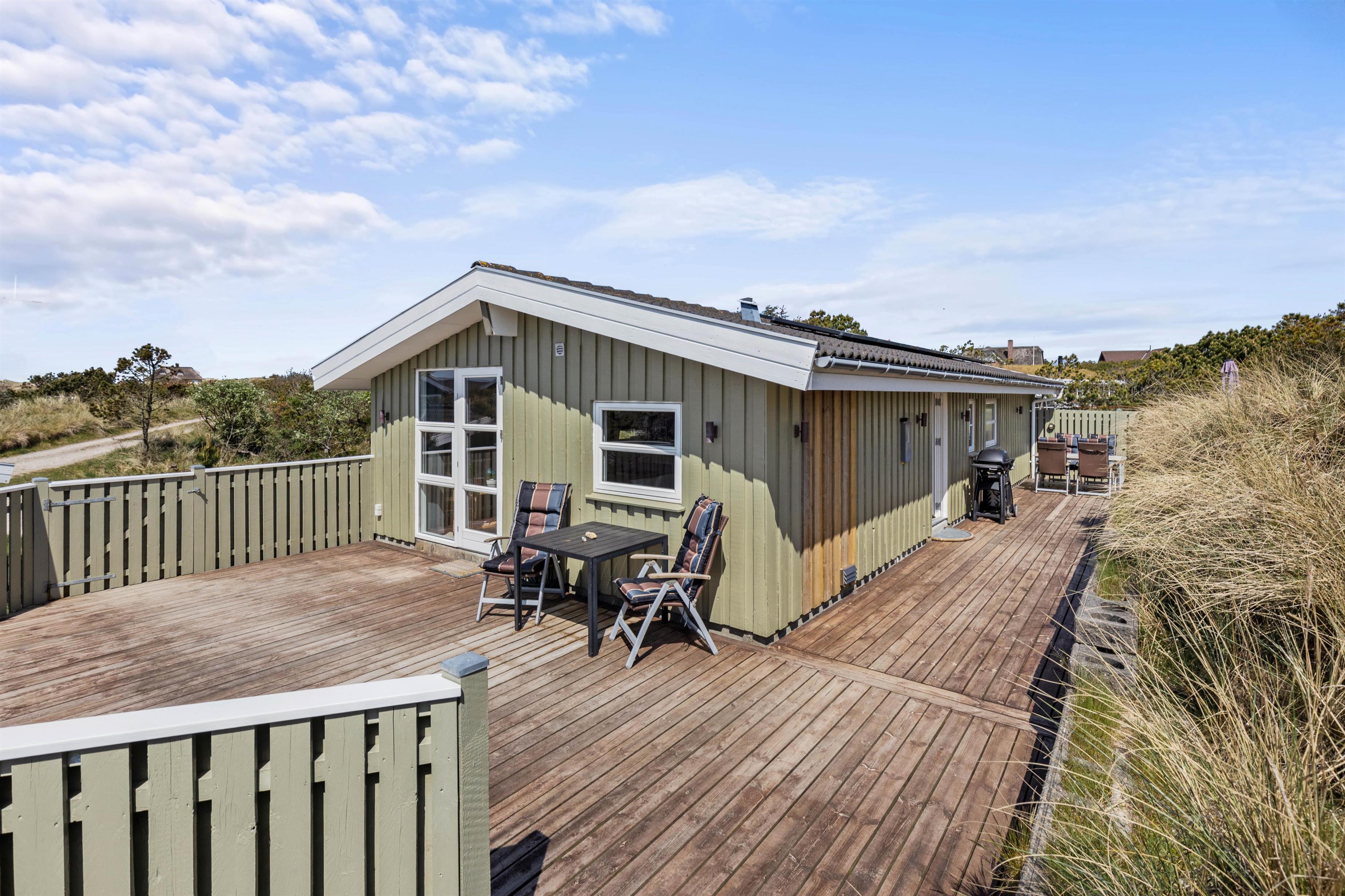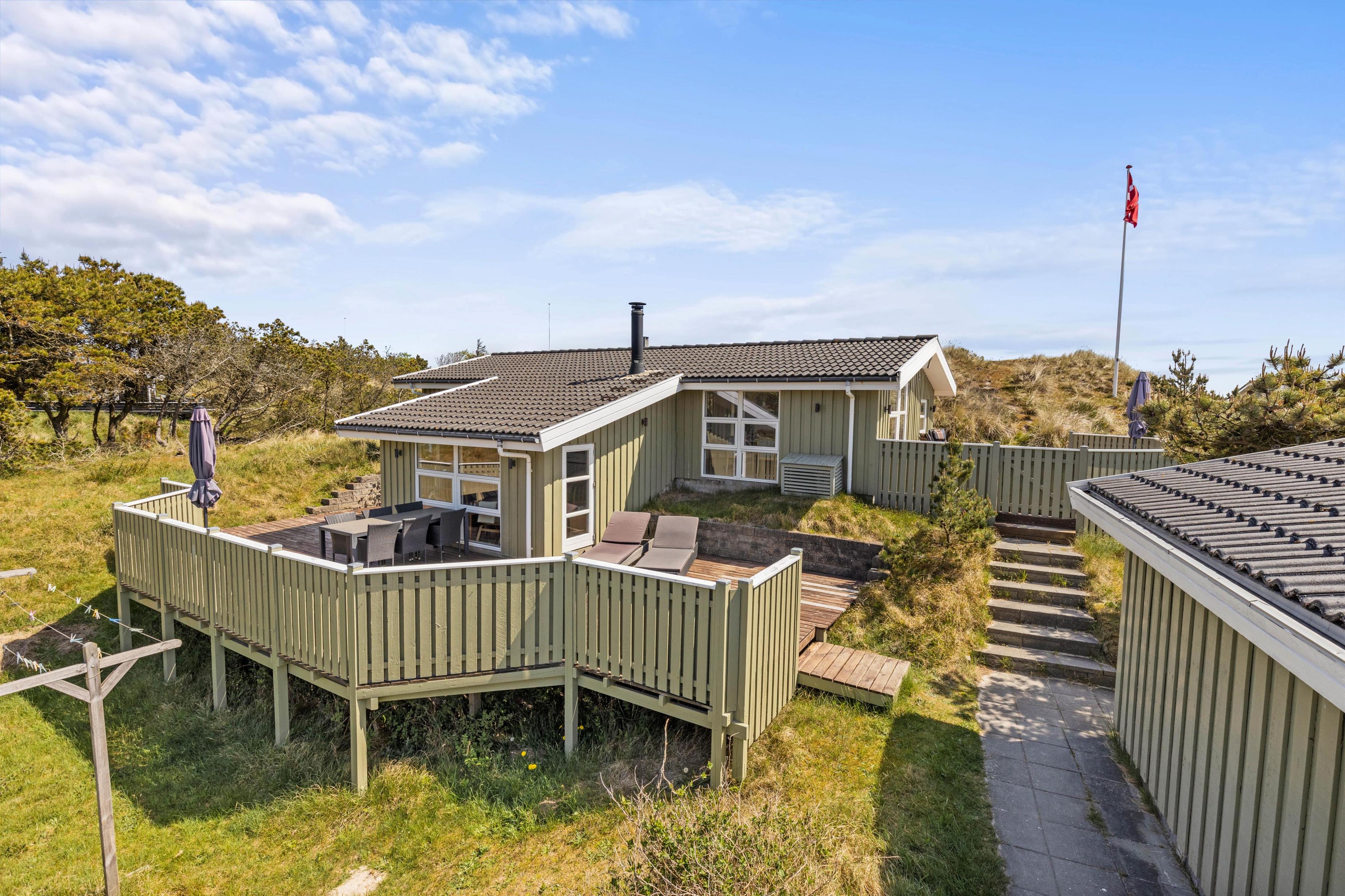 Midt i det vestjyske klitlandskab i Vejers Strand ligger dette hyggelige feriehus og venter på jer. Det fine træhus rummer plads til 6 gæster og byder på en venlig indretning. Den store terrasse gemmer på flere små kroge, hvor I kan nyde solen i fred og ro - og så er strømforbruget helt gratis!