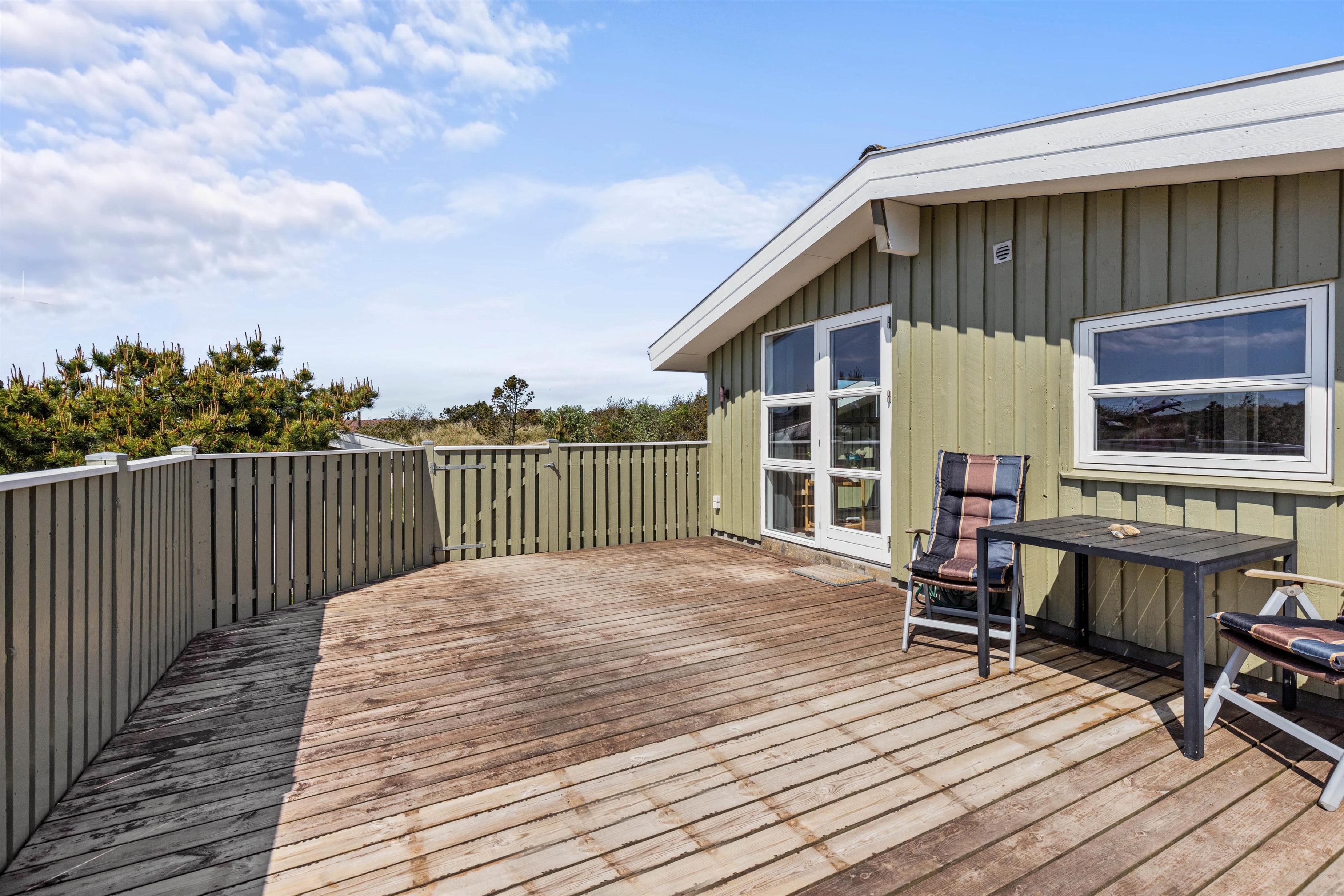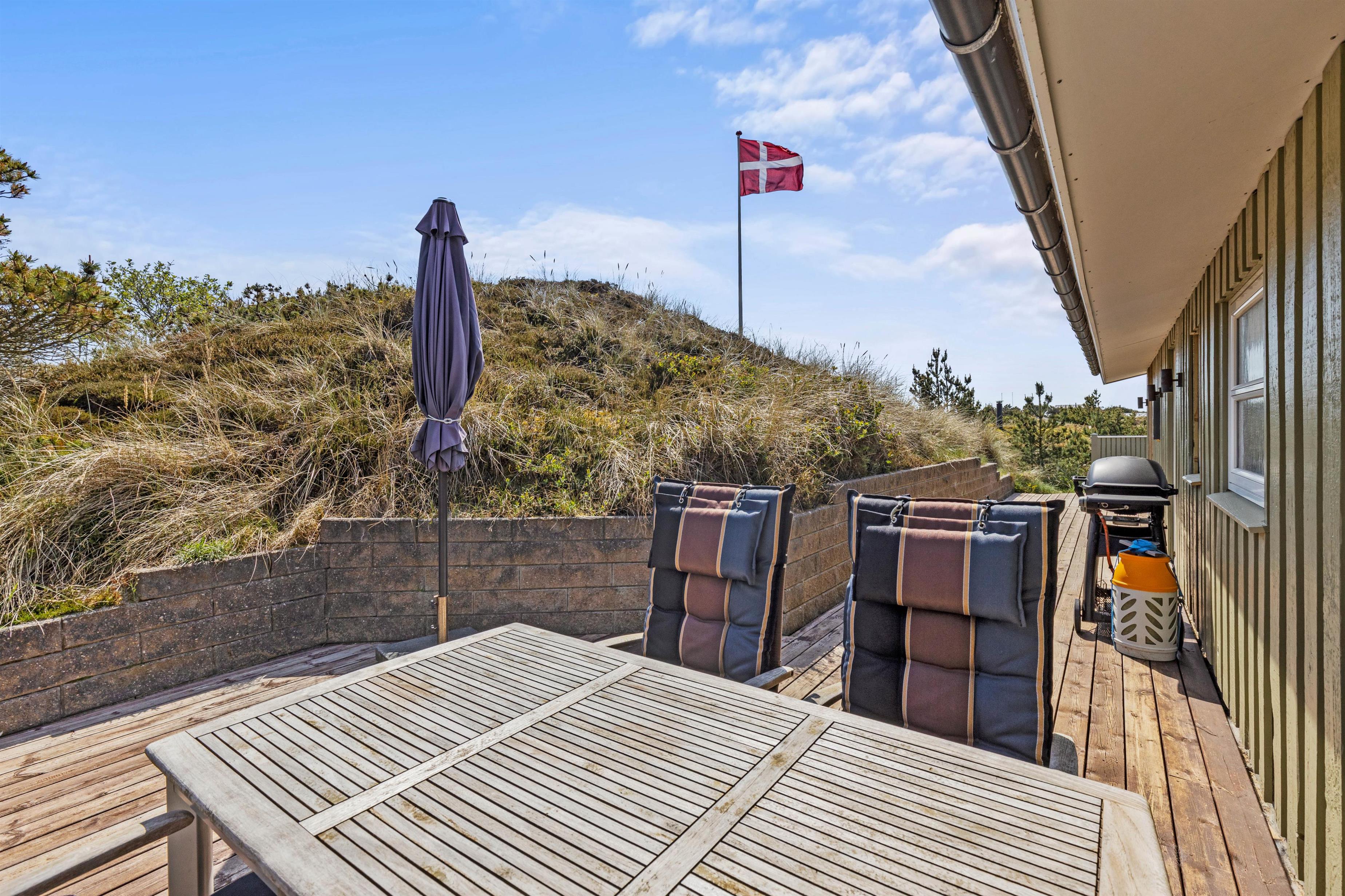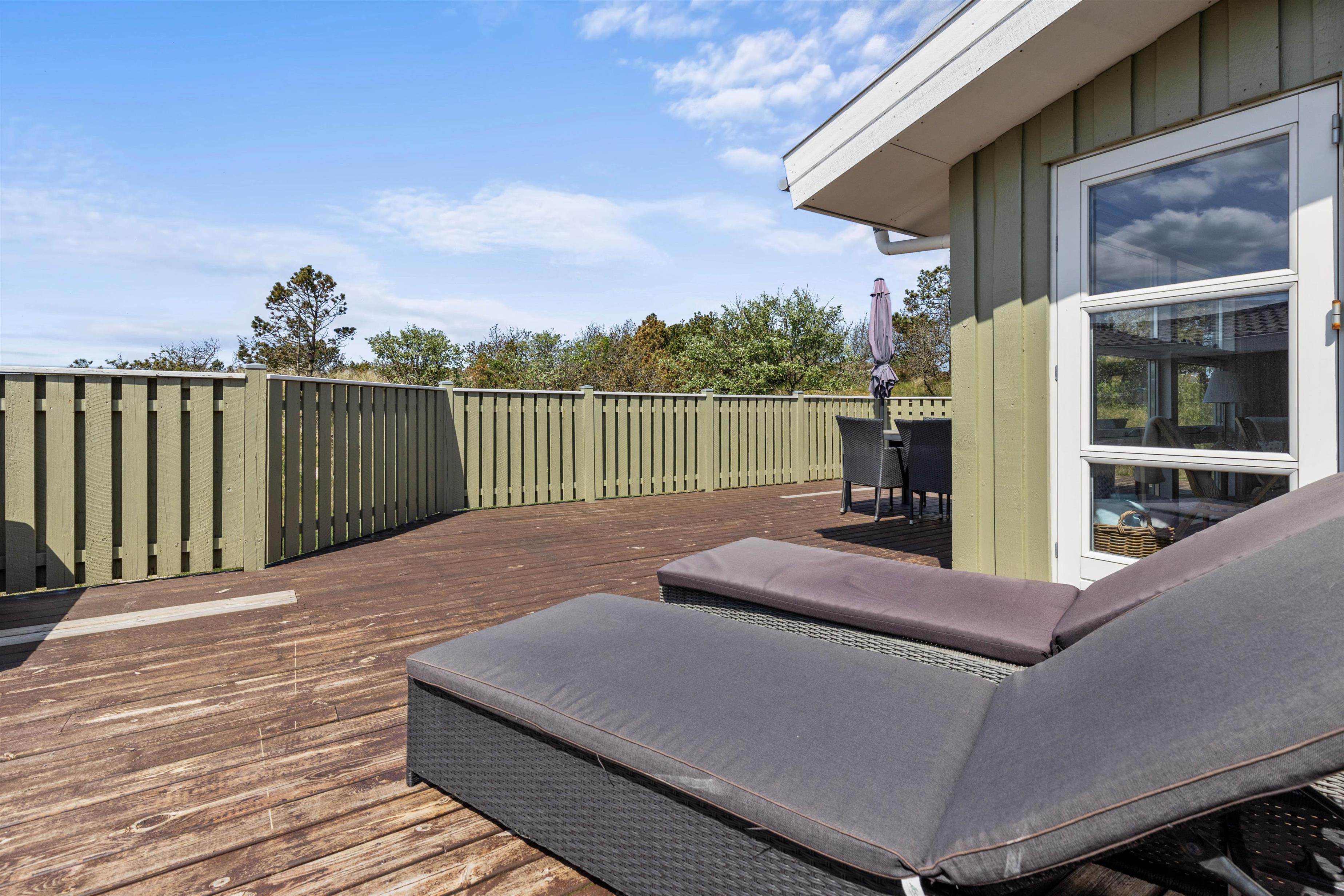 Rundt om feriehuset løber en stor, afskærmet træterrasse. Her finder I masser af små kroge, hvor I kan sidde i god ro og fred på de varme solskinsdage med en spændende bog og lidt koldt at drikke. I kan også finde liggestolene frem og sole jer på ægte charter-manér.