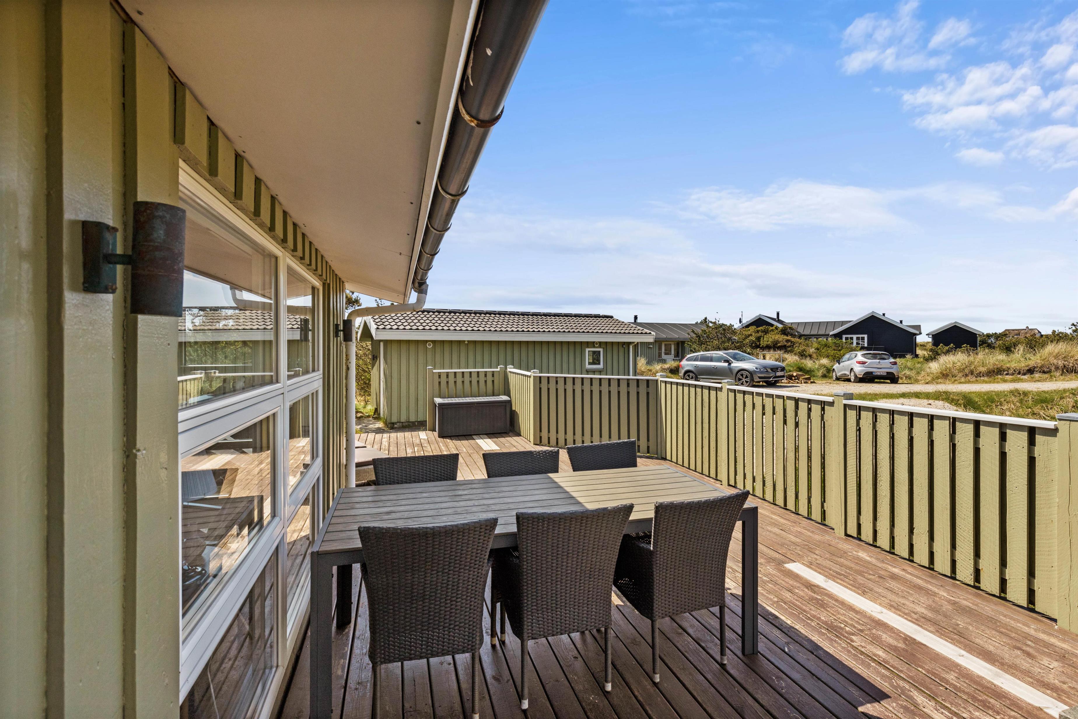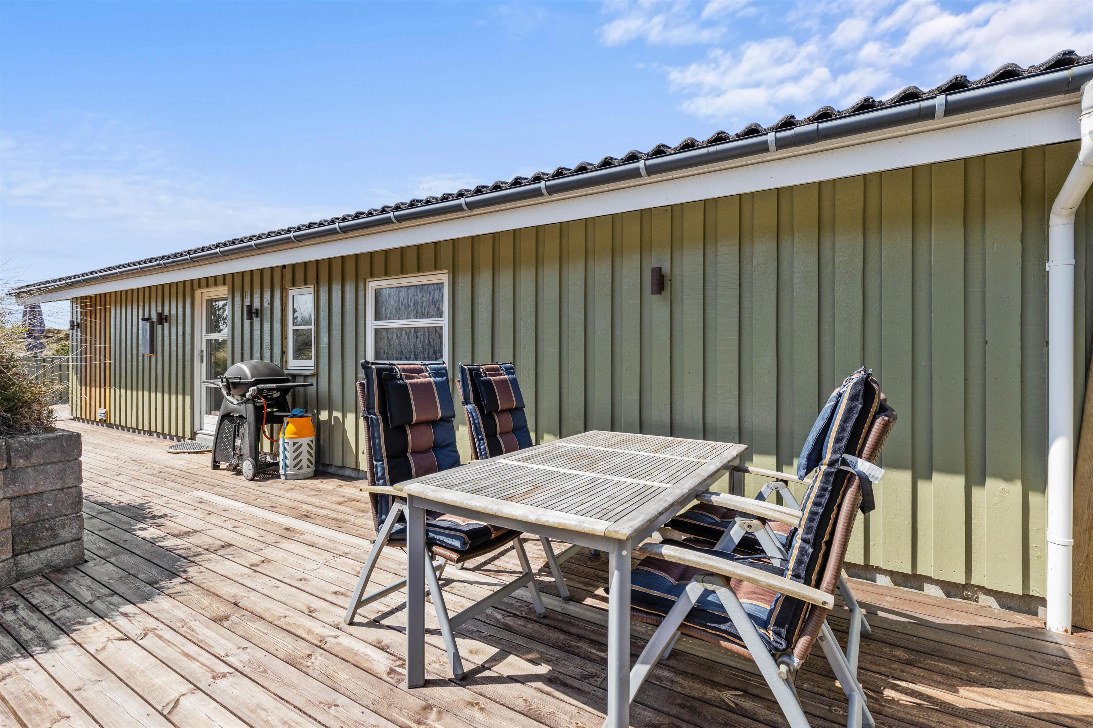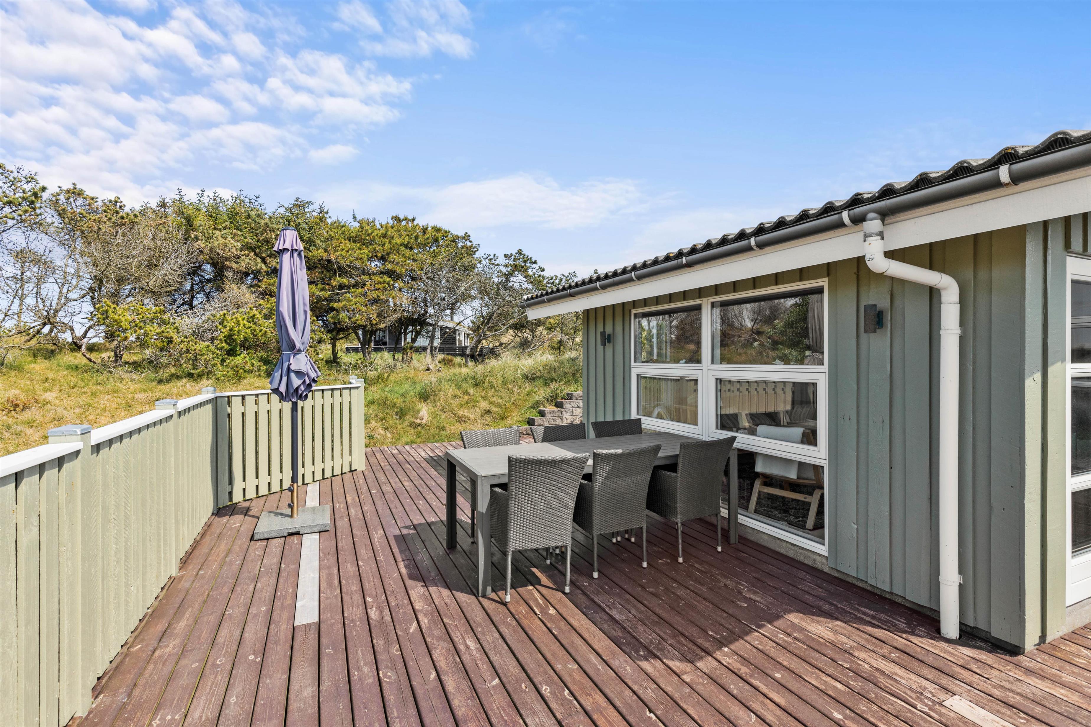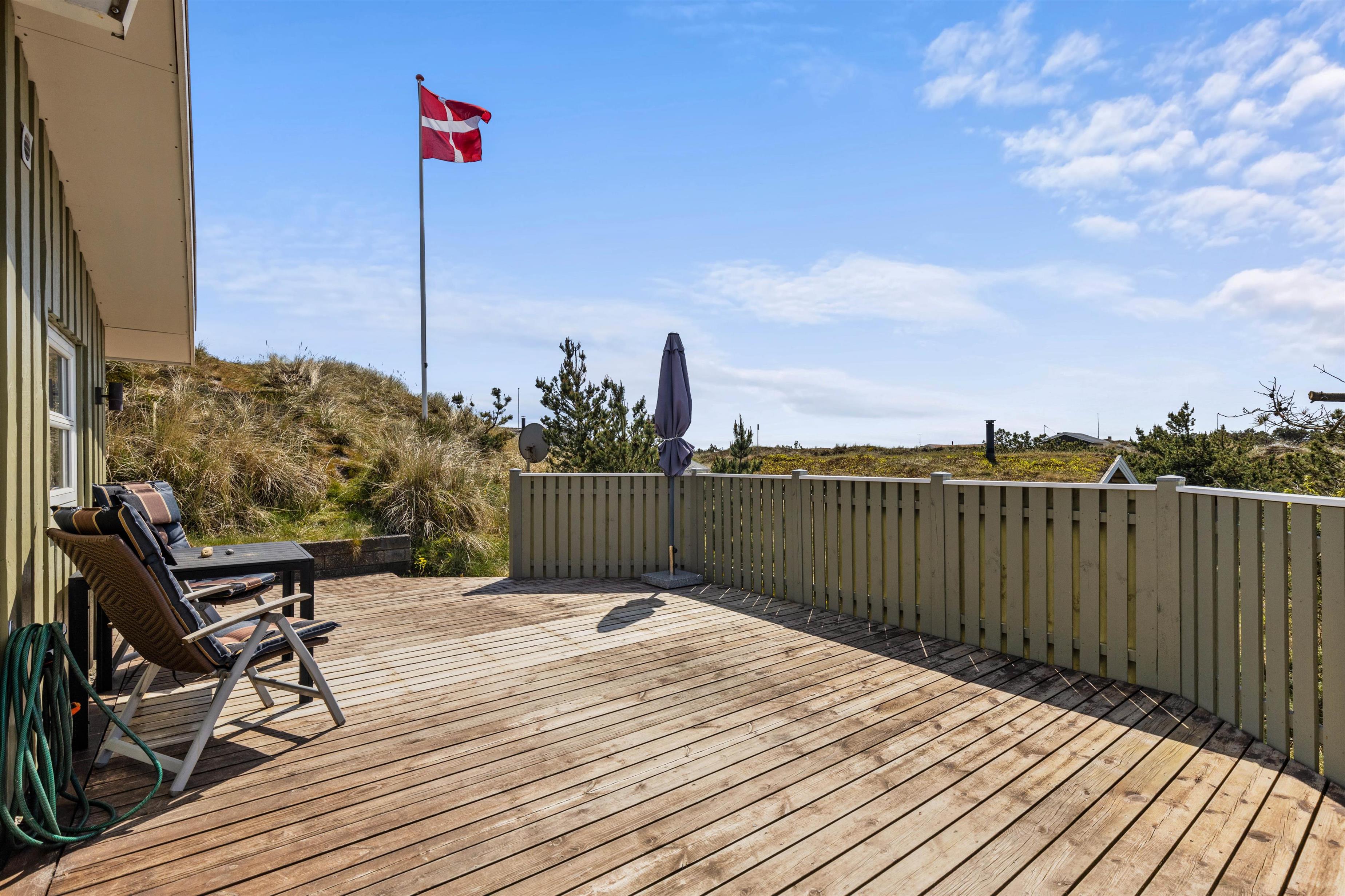 Rundt om feriehuset løber en stor, afskærmet træterrasse. Her finder I masser af små kroge, hvor I kan sidde i god ro og fred på de varme solskinsdage med en spændende bog og lidt koldt at drikke. I kan også finde liggestolene frem og sole jer på ægte charter-manér.