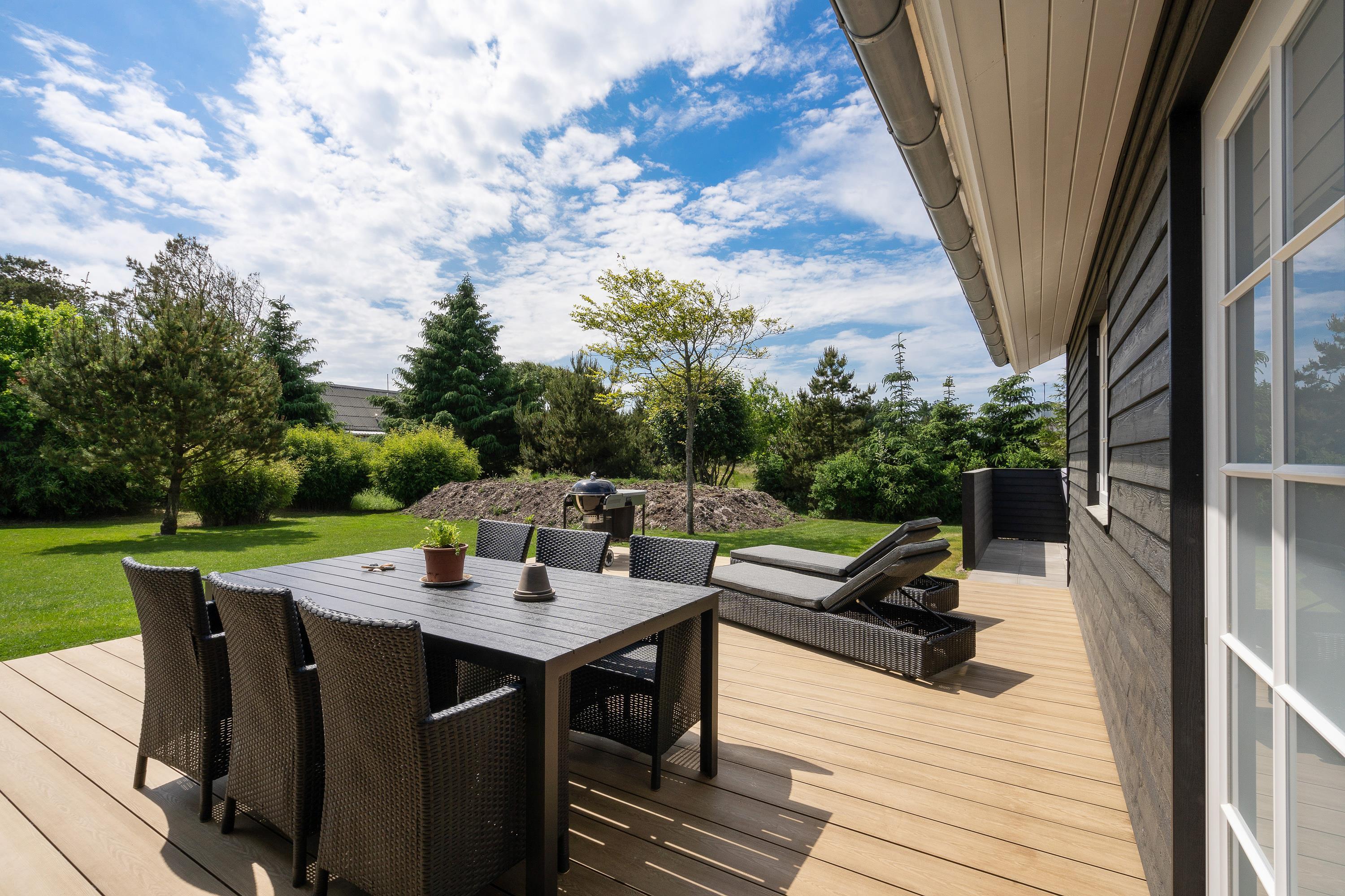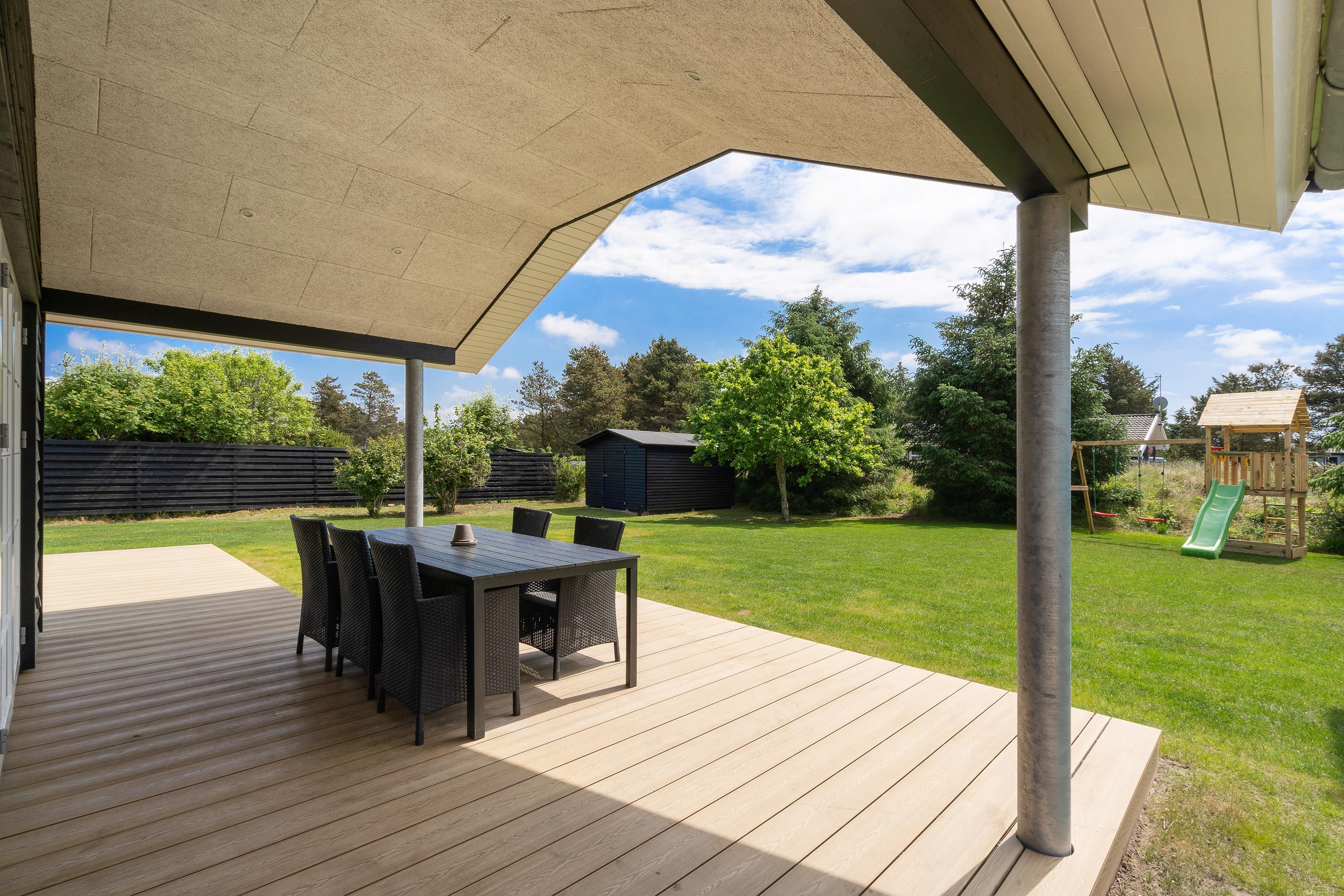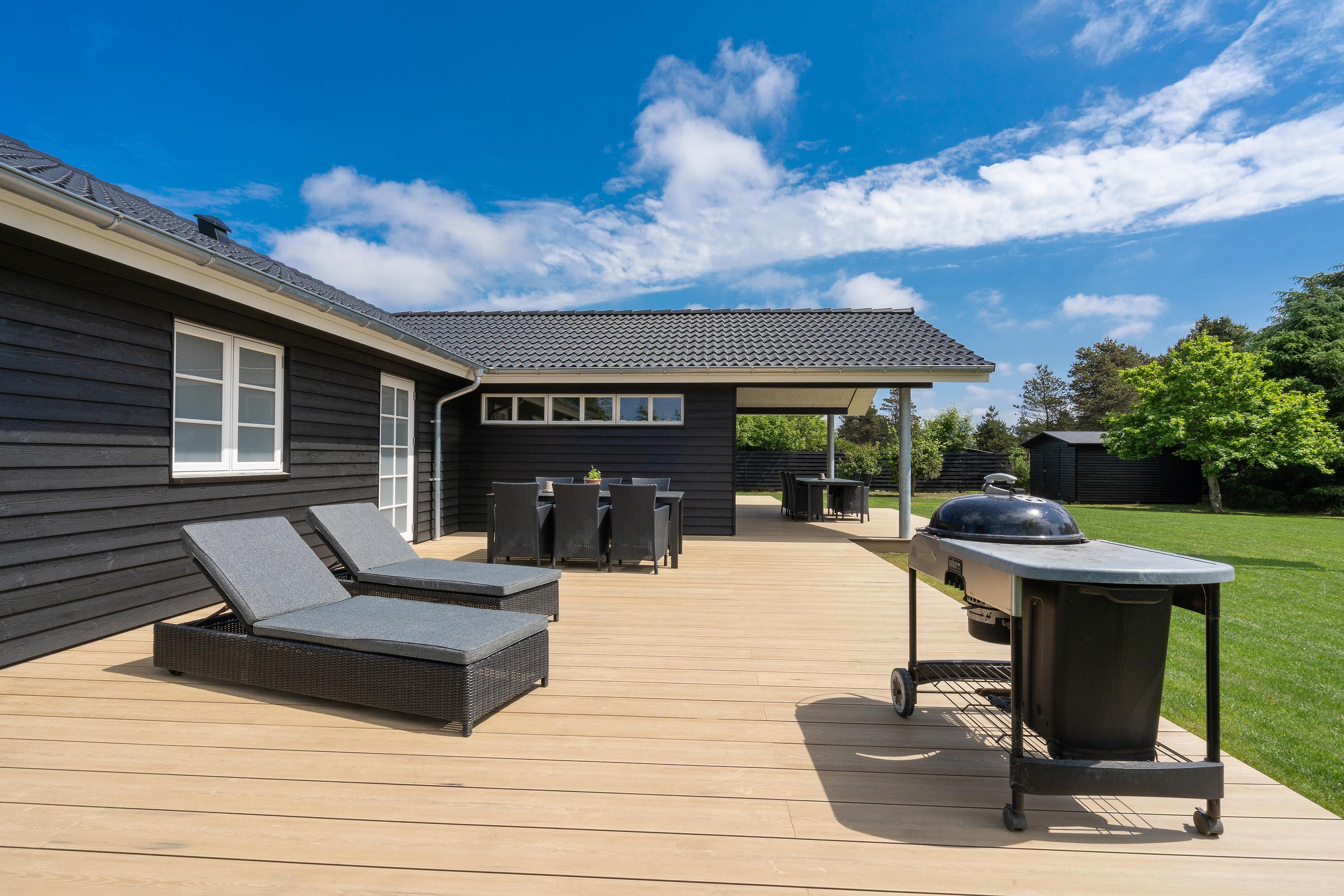 På den store terrasse står der havemøbler klar, så I kan hygge med hele flokken. Imens de mindste leger på feriehusets gynger, og de mellemste er på opdagelse med fiskestængerne ved Strib Sø, kan de voksne slappe af på liggestolene eller måske forberede lidt lækkert til grillen til aftensmaden. Da en del af terrassen er overdækket, behøver I ikke lade vejret diktere, om det er tid til udeliv eller ej.