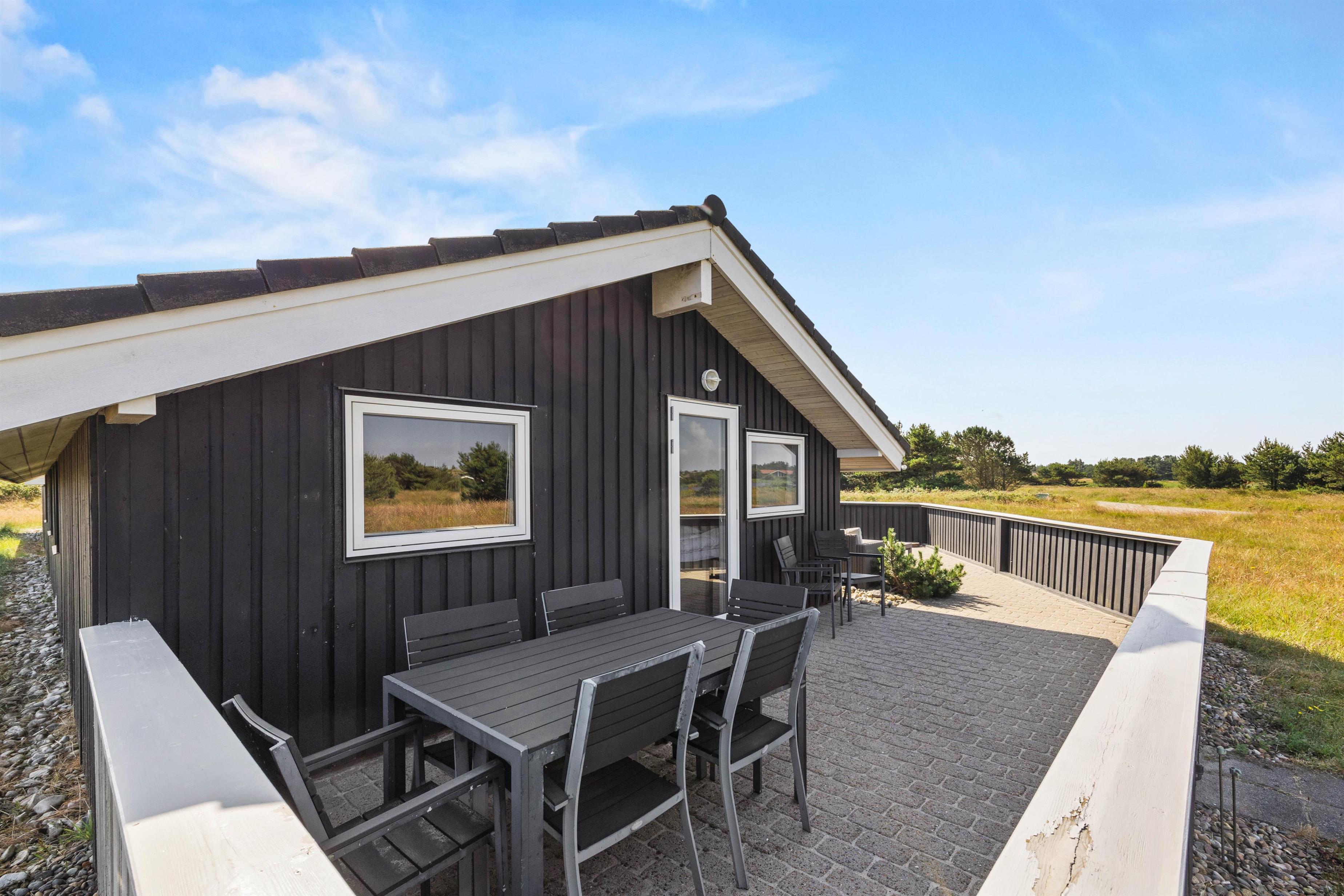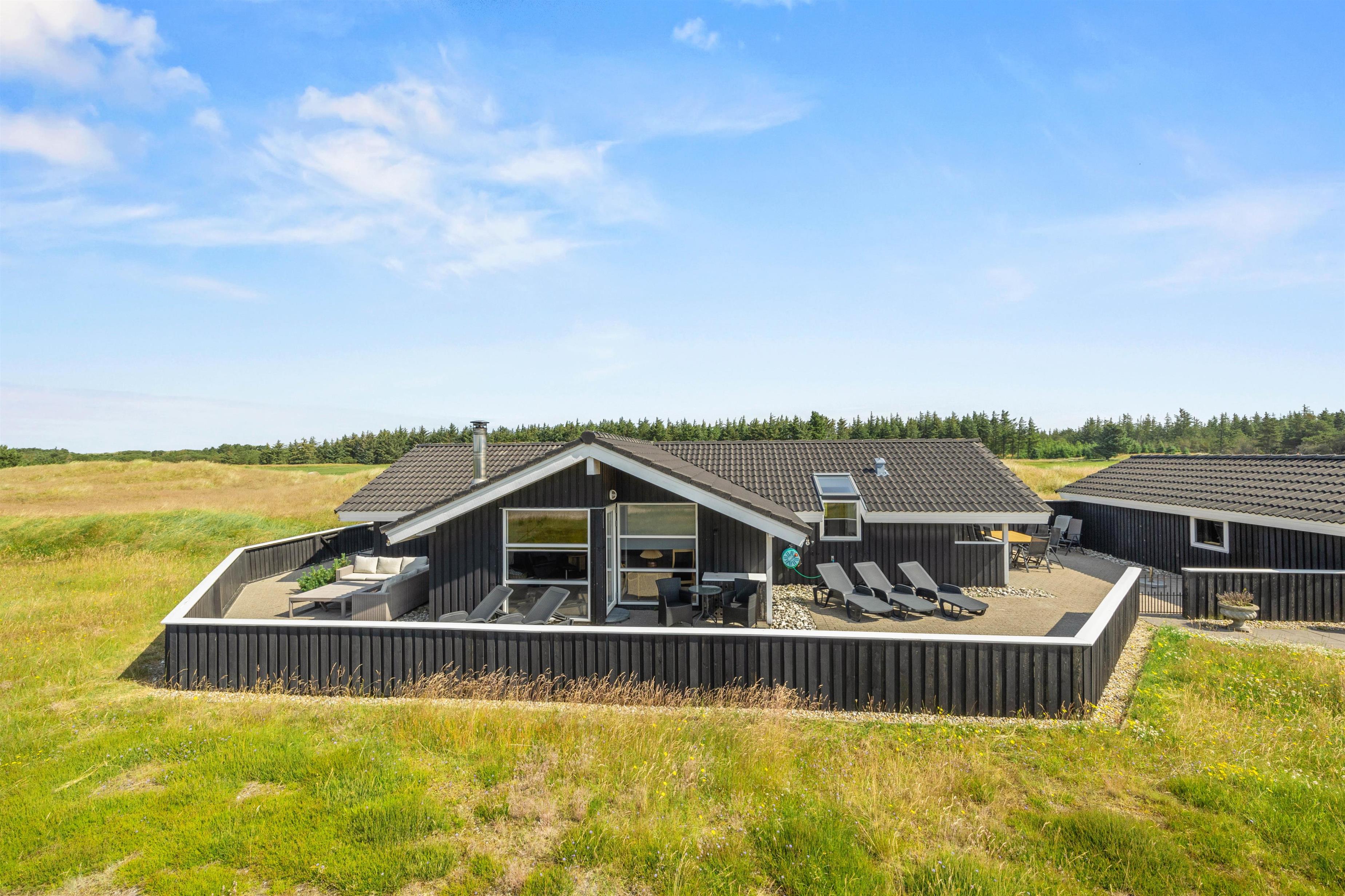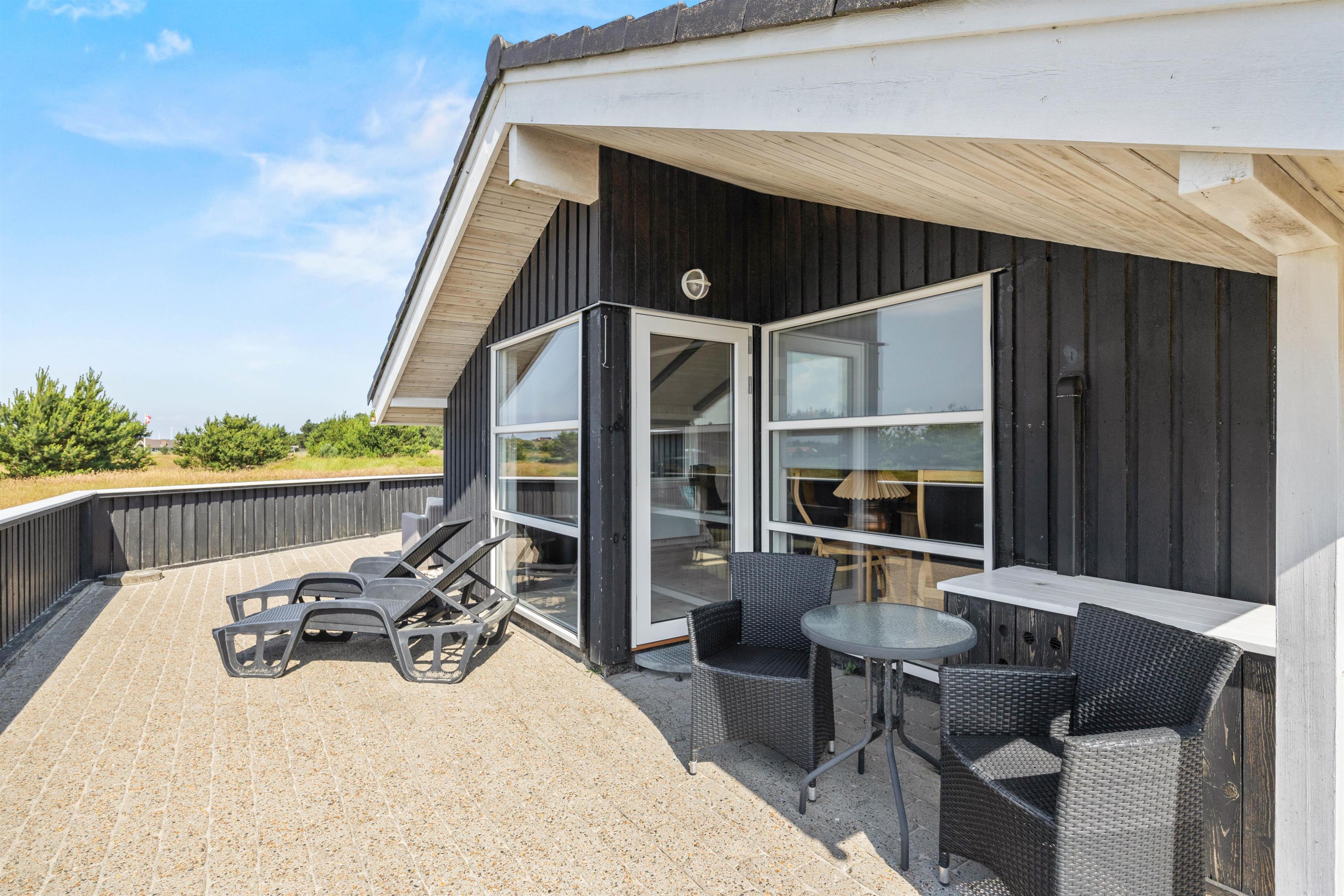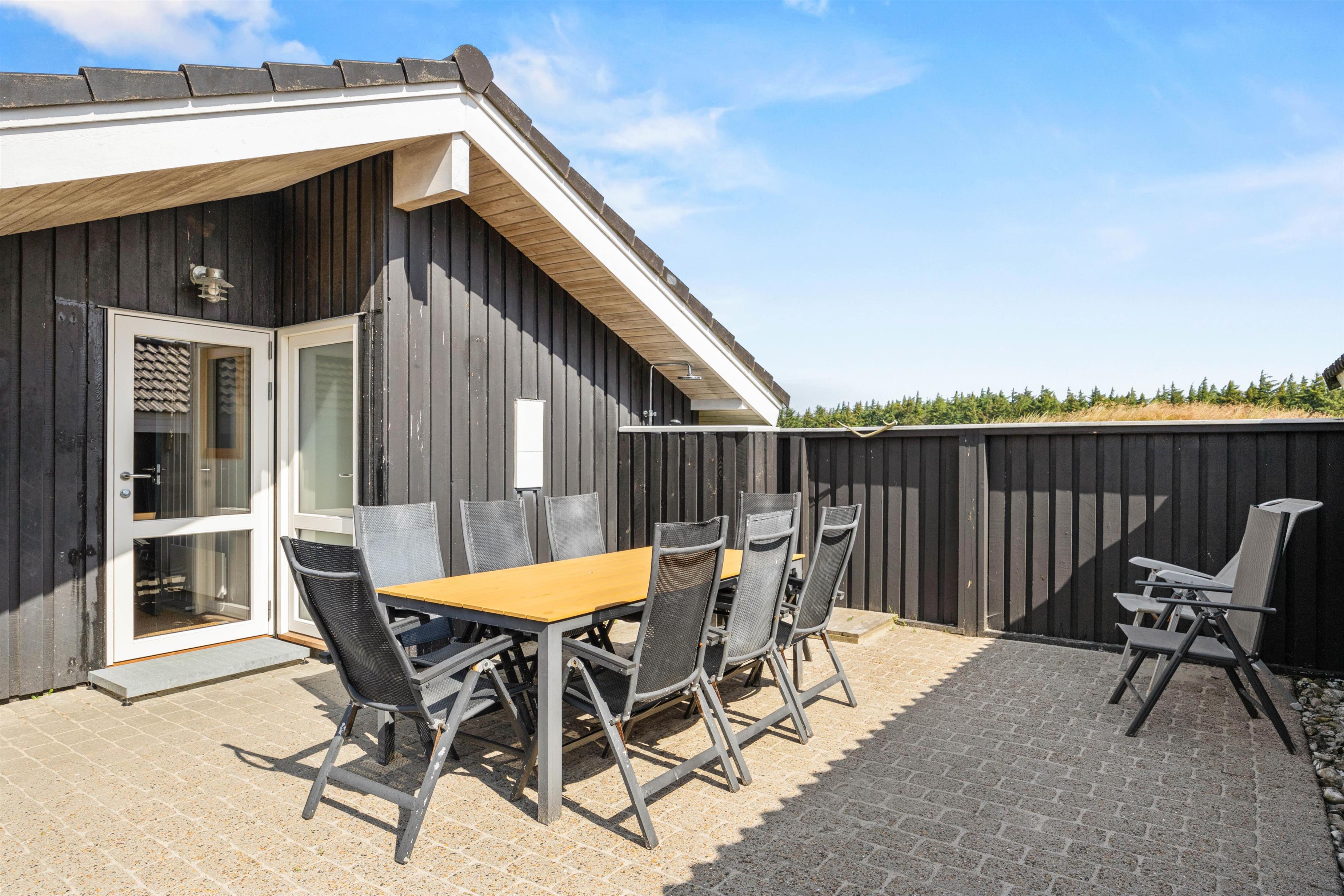 Feriehuset ligger på en 2000 m² stor naturgrund lige ved siden af en privat fiskesø og har et skønt terrasseområde, hvorfra I kan nyde den fantastiske vidtrækkende udsigt. Terrassen er lukket af til alle sider af et halvhøjt træhegn, og I kan nyde i den friske luft i flere forskellige siddegrupper. Der er liggestole til solbadning, og i sommerhalvåret (april til november) kan I hoppe under den udendørs bruser for at køle af bagefter. Om sommeren kan du nyde den skønne aftenstemning med en menu fra gasgrillen og et køligt glas rosé.