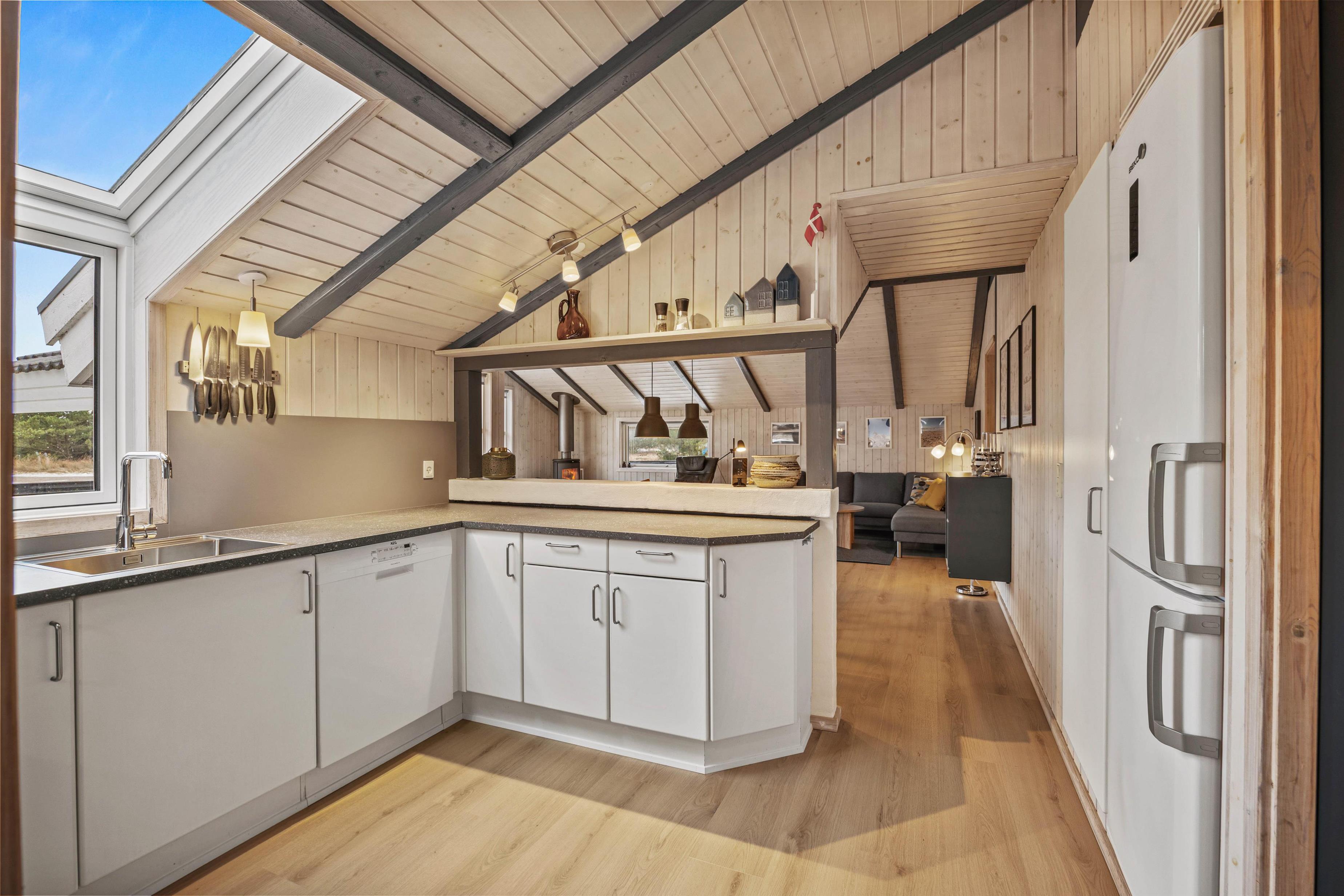 Køkkenet er lidt adskilt fra stuen med mur og udstyret med alt, hvad I har brug for til lidt kulinariske udfoldelse på jeres ferie i Danmark. Der er naturligvis hjælp at hente til opvasken.