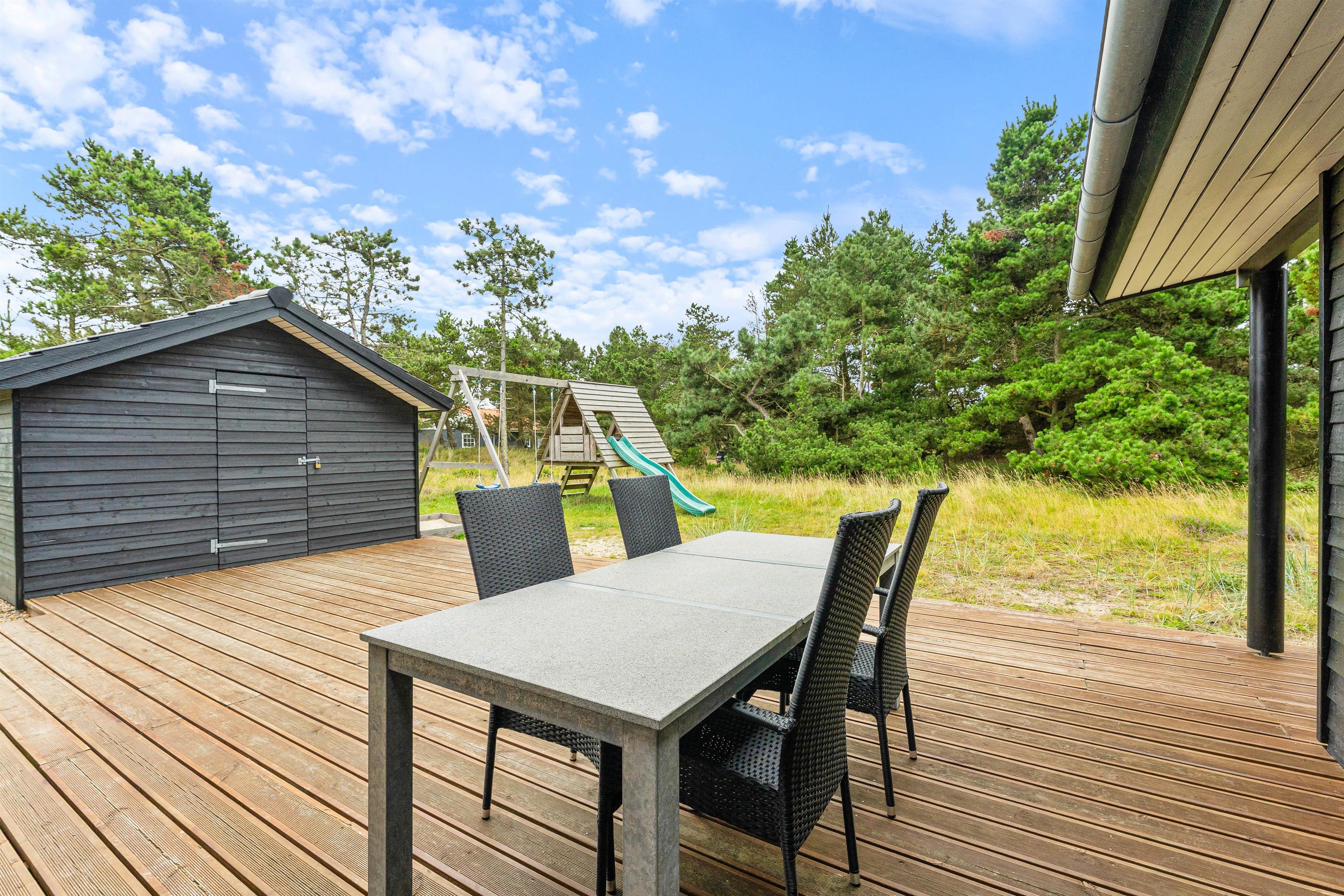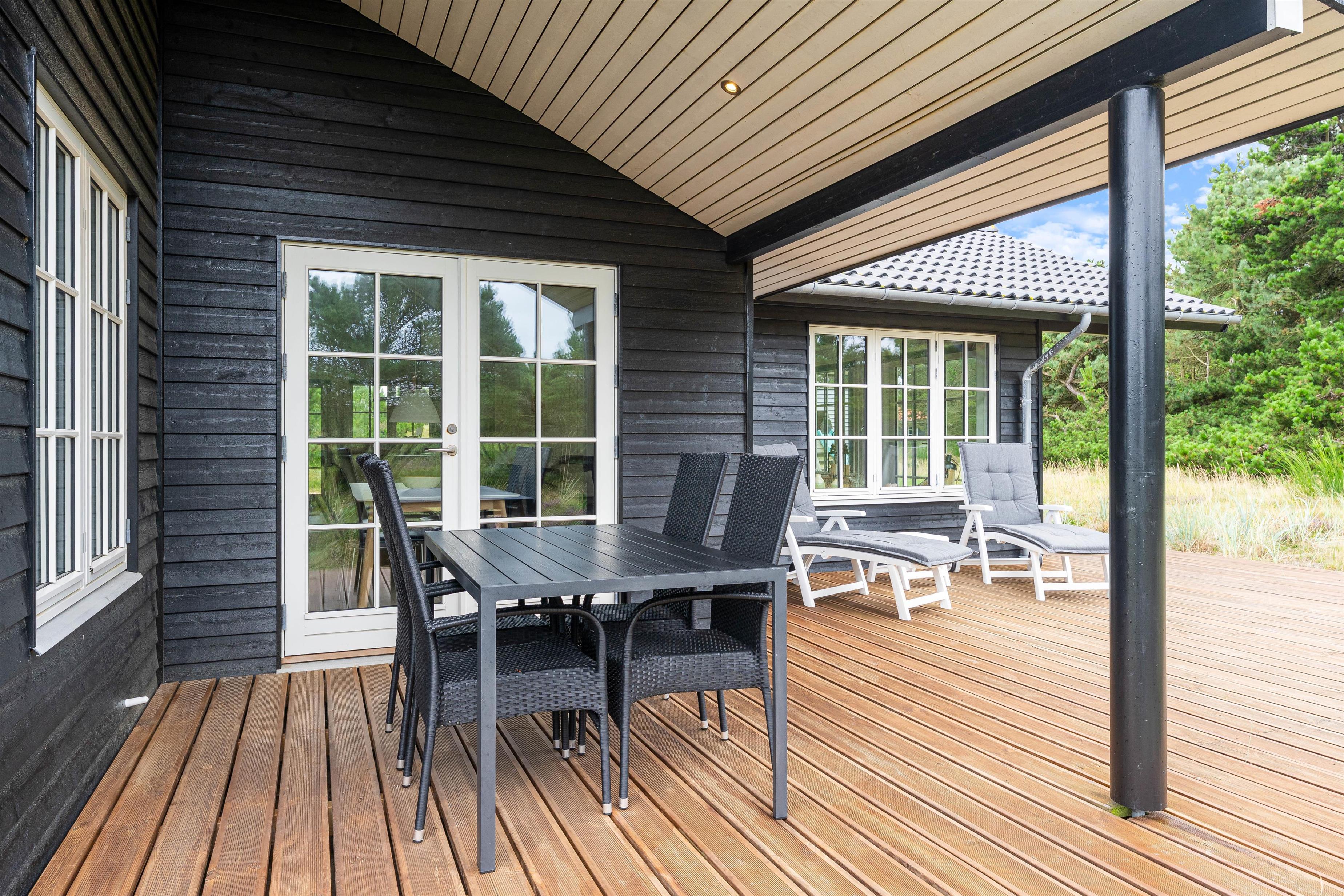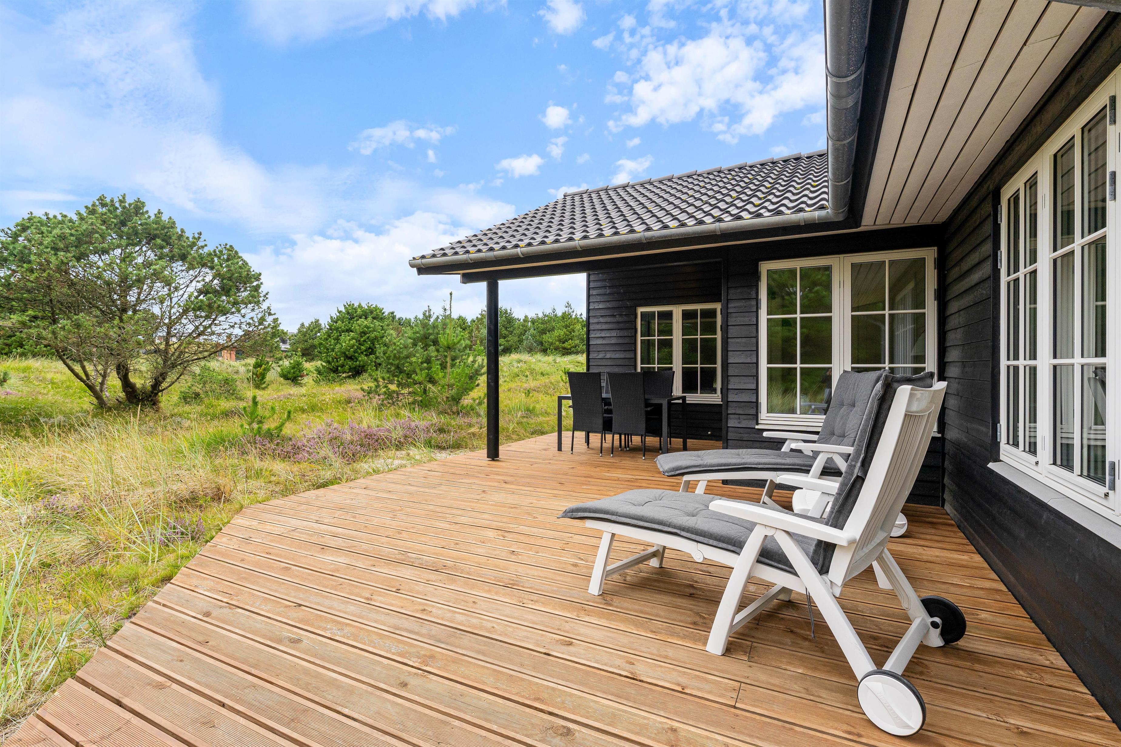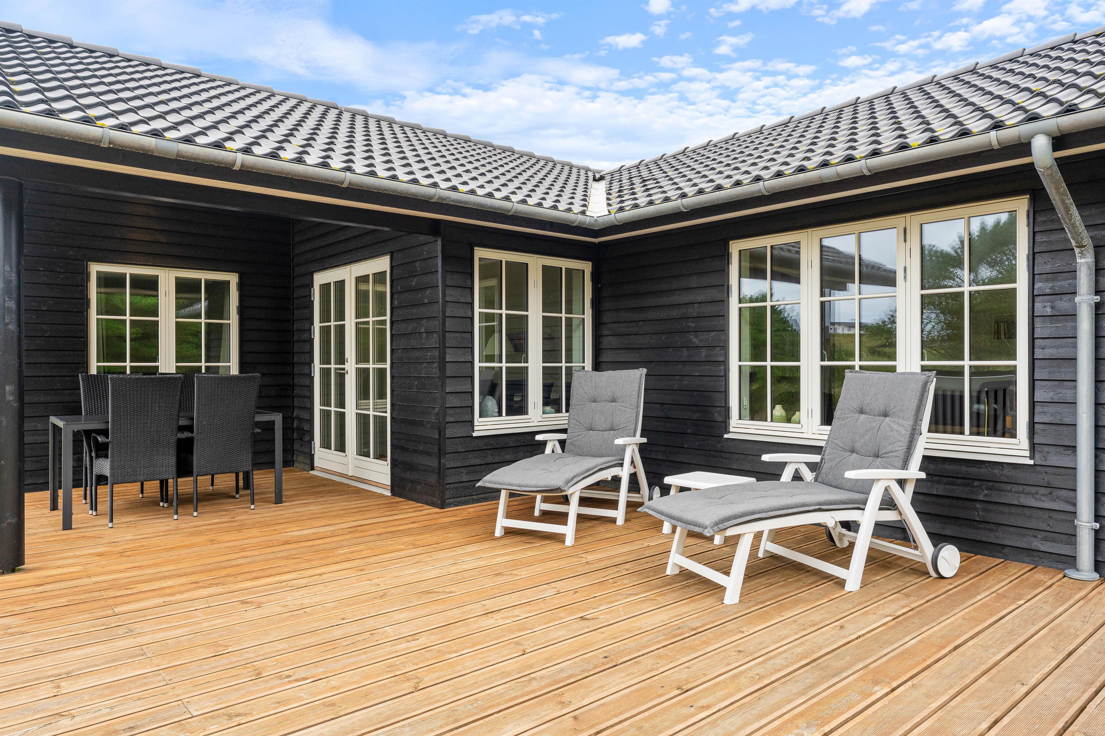 Fra stuen er der flere udgange til den store terrasse, som næsten omgiver hele huset. Her kan I rigtig nyde feriedagene og den naturskønne udsigt, mens I slapper af i liggestolene eller spiser frokost i solen rundt om havebordet.