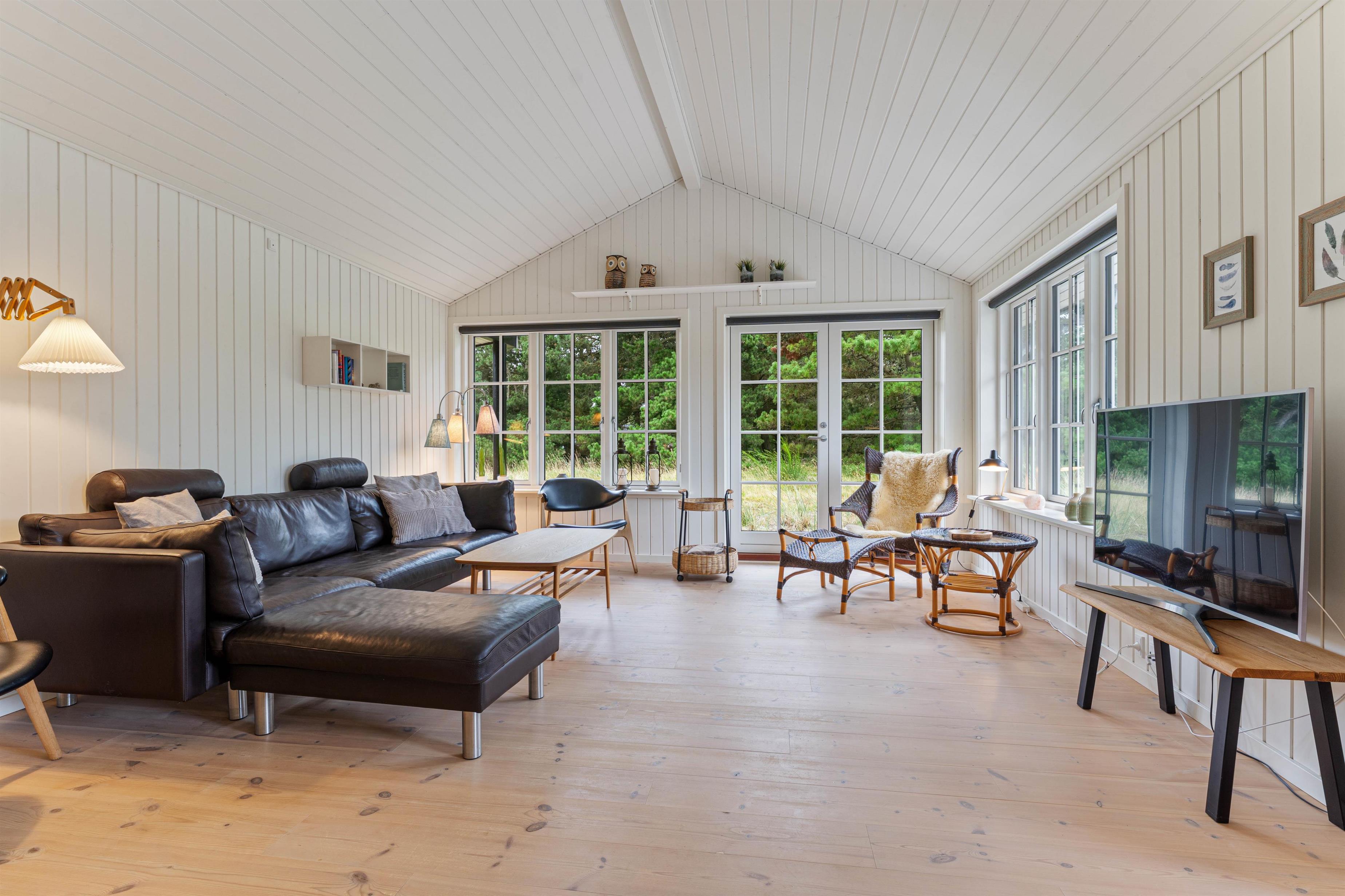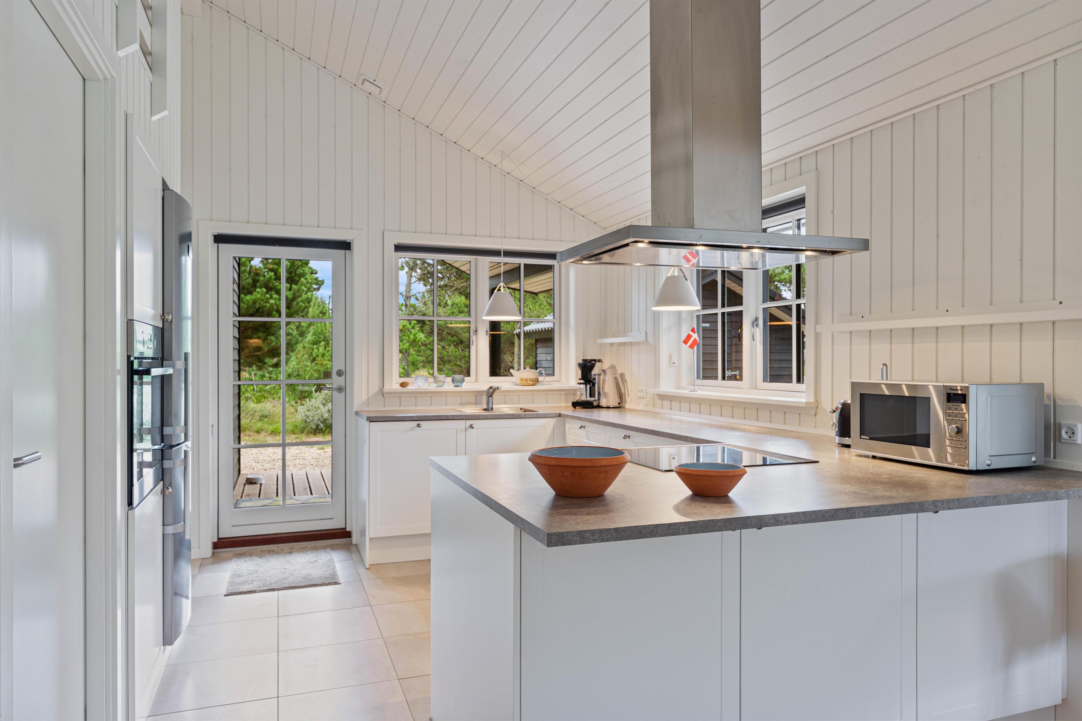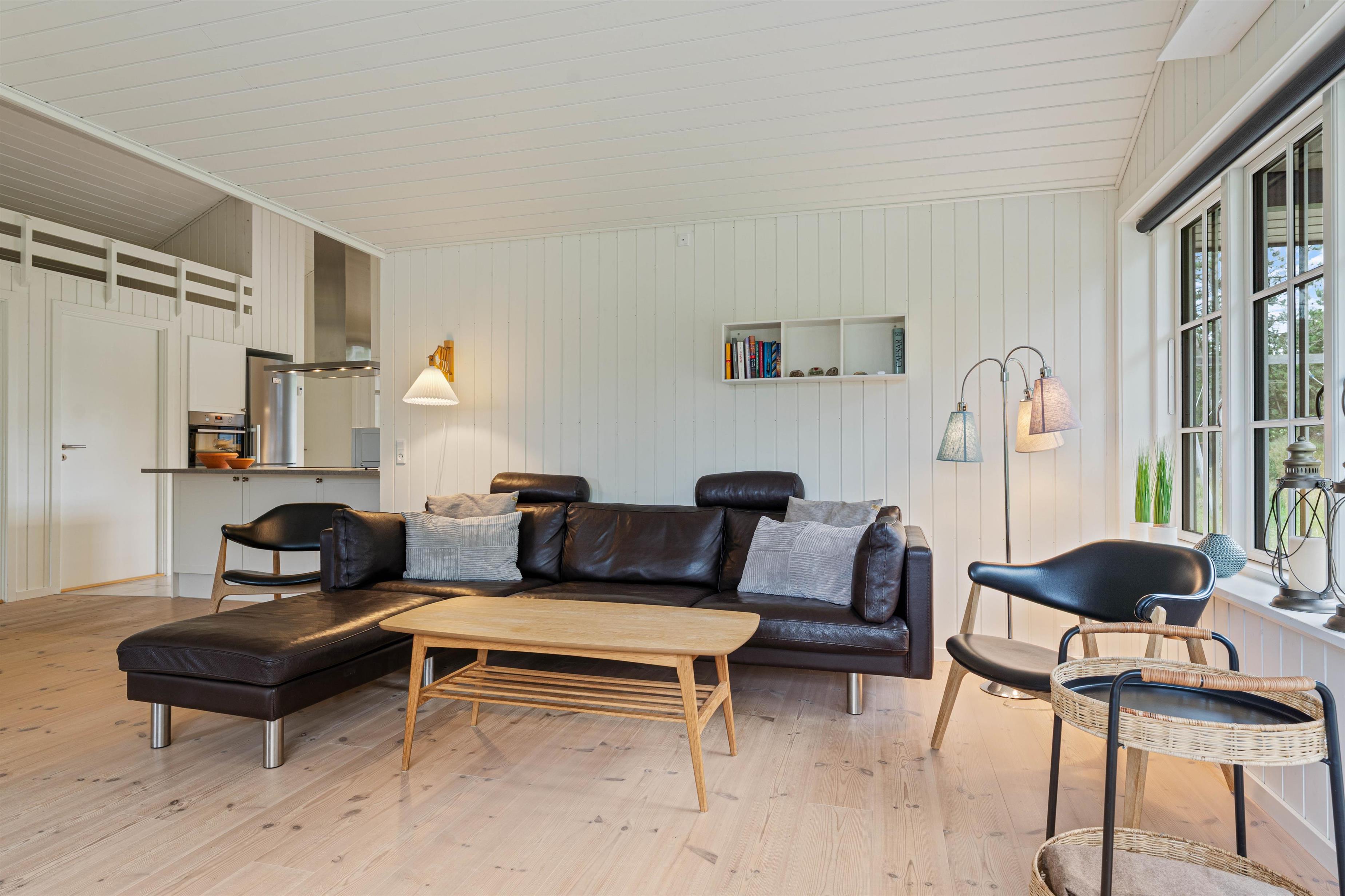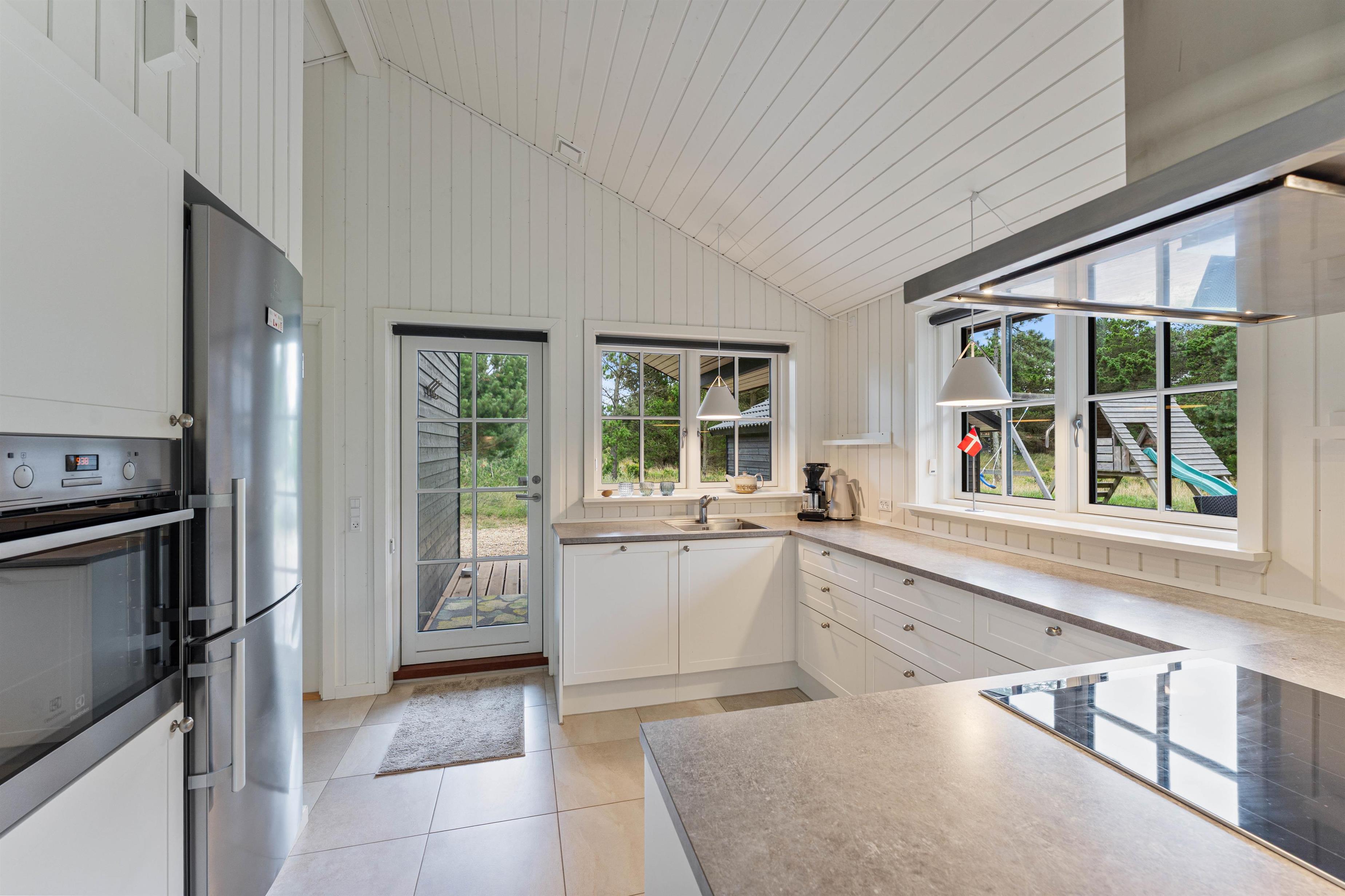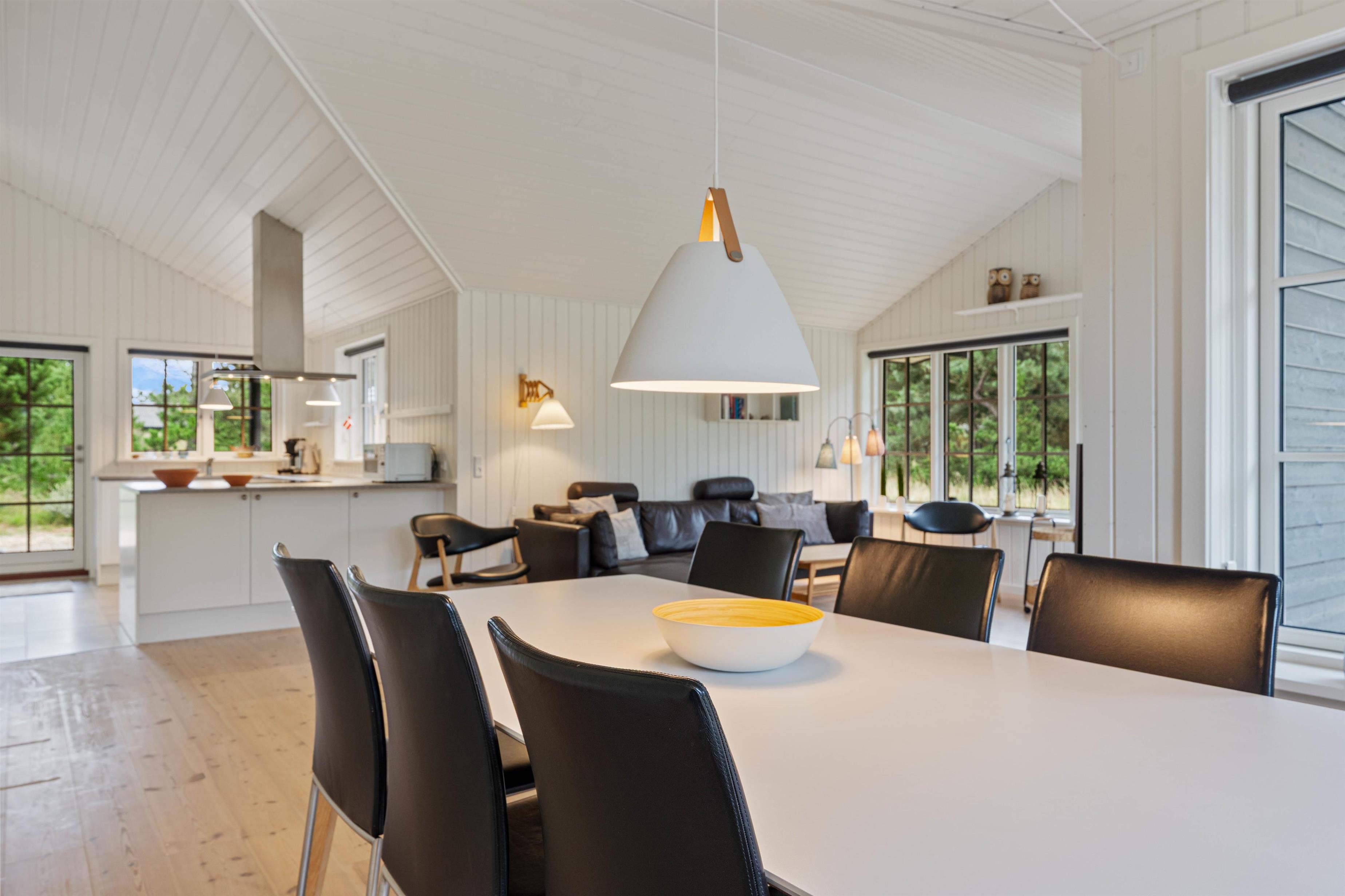 Husets hjerte er det åbne fællesrum, som forener køkken og stue og giver rig mulighed for samvær og feriehygge. De store vinduespartier inviterer solens stråler indenfor og giver jer en flot udsigt til den grønne naturgrund.
