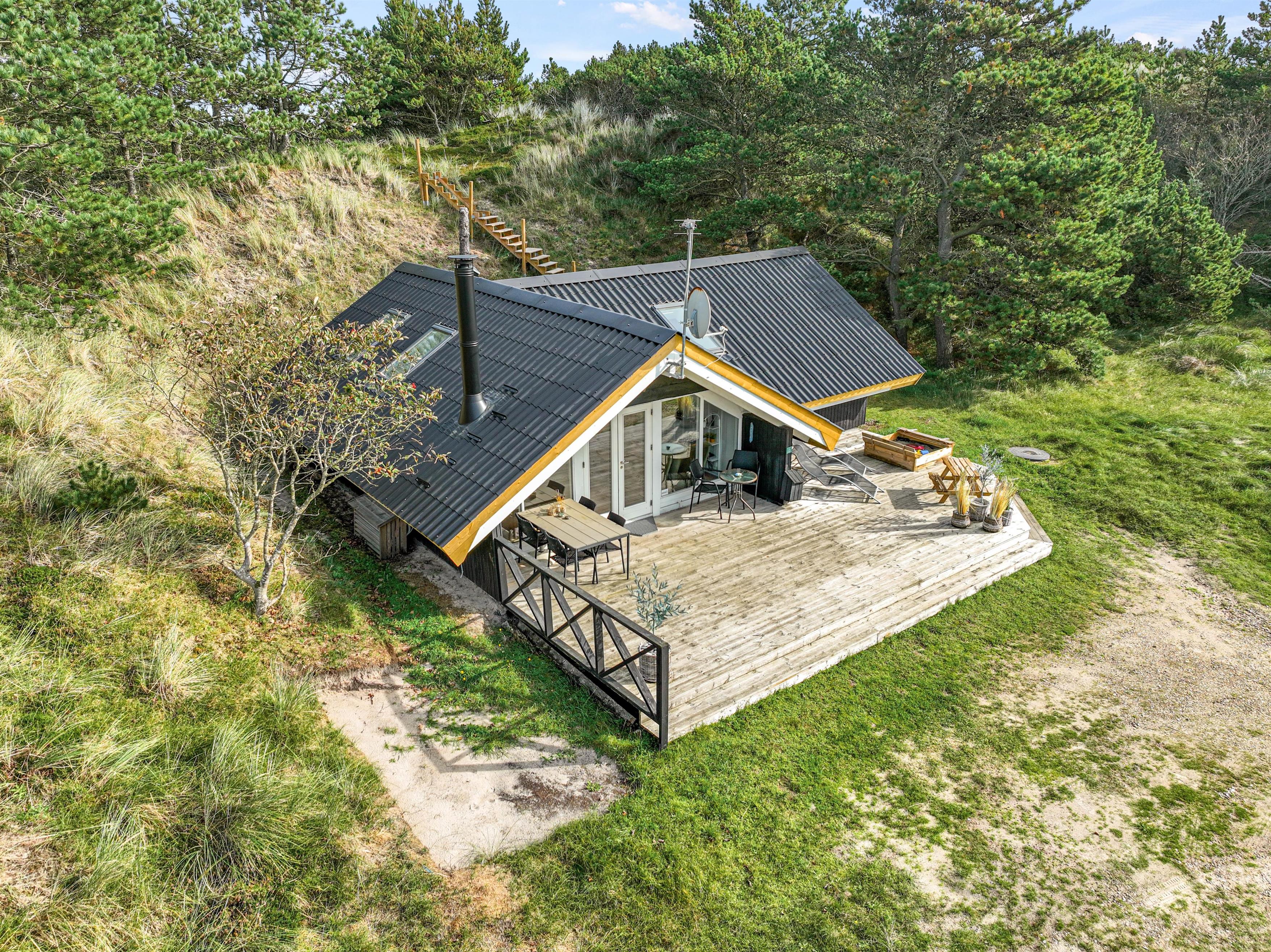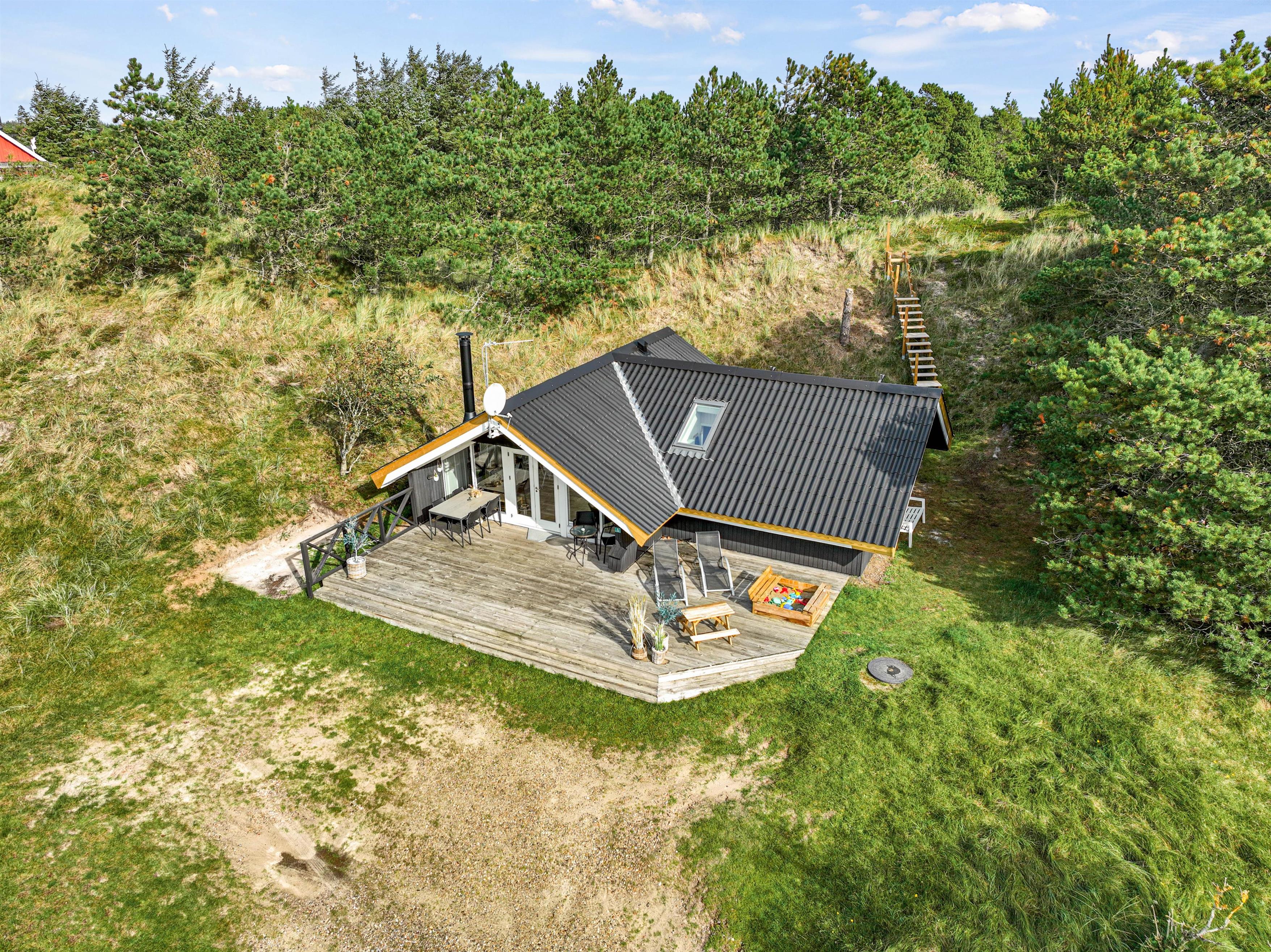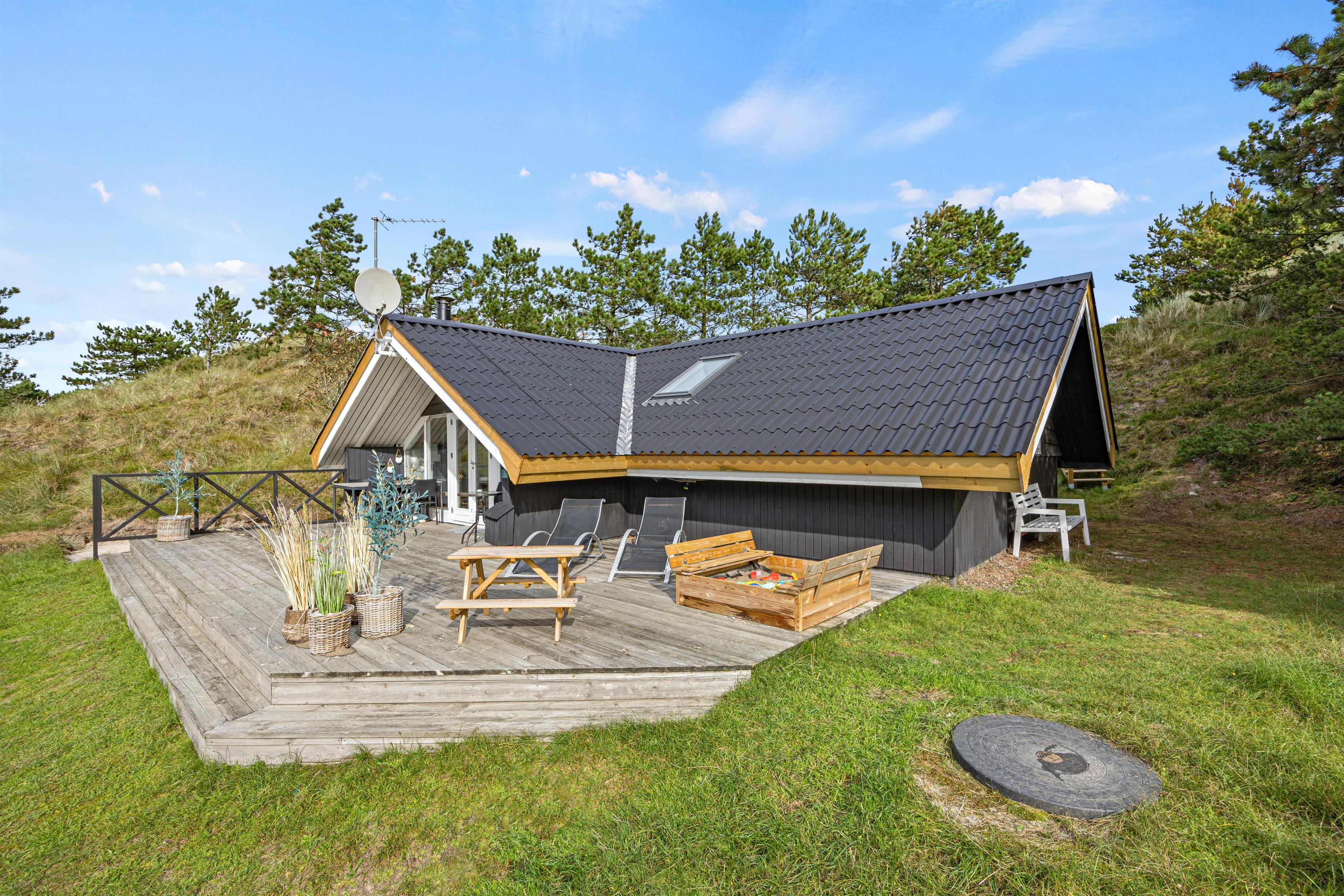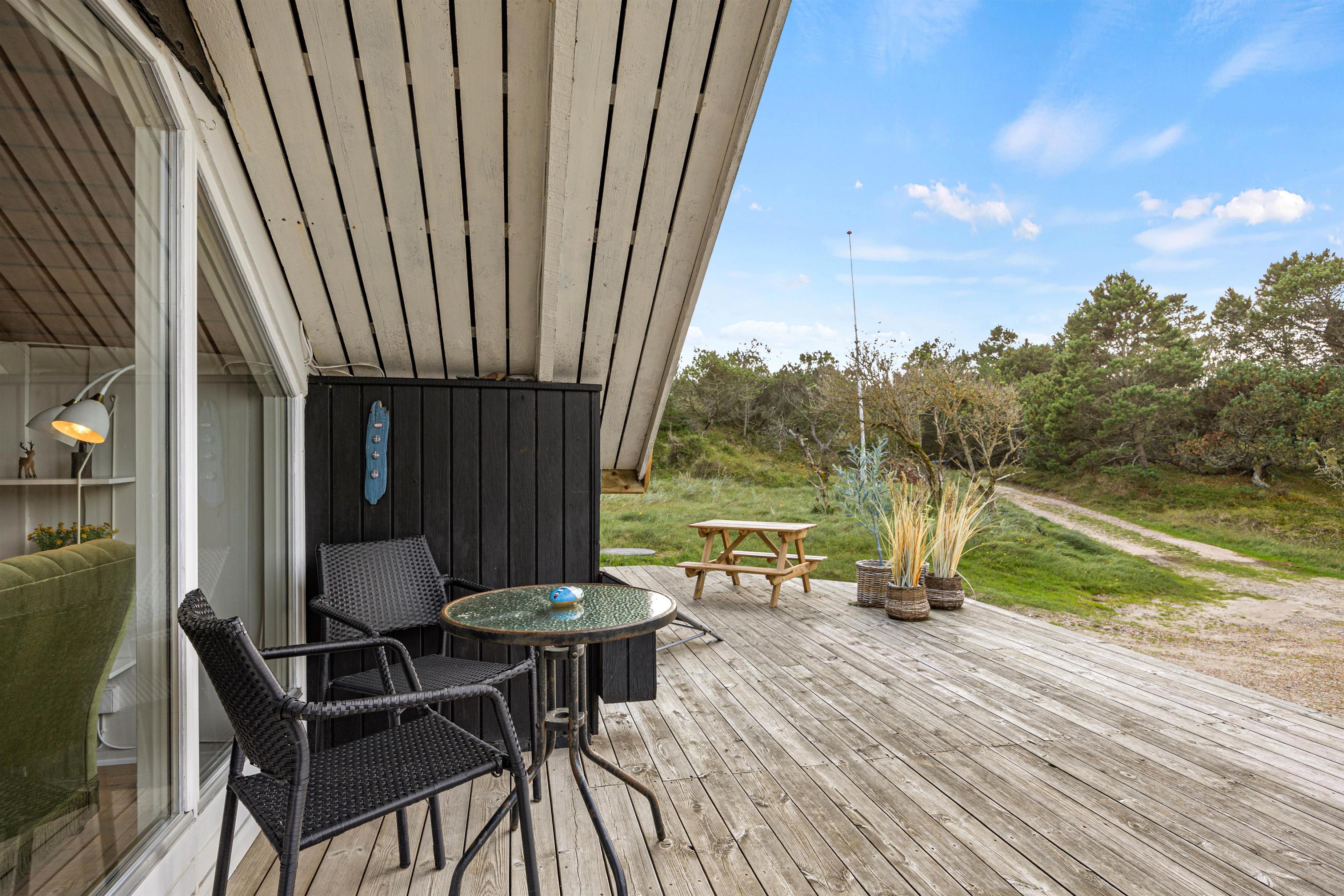 Fra feriehusets stue er der udgang gennem dobbeltdørene, til den store sydvestvendte træterrasse, som giver ideelle betingelser for at nyde solen hele dagen og den smukke solnedgang om aftenen. Her er både plads til bord med havestole, en hyggekrog, 2 liggestole, et bænkebord og en sandkasse til børnene. Der står også en gasgrill til jeres rådighed.