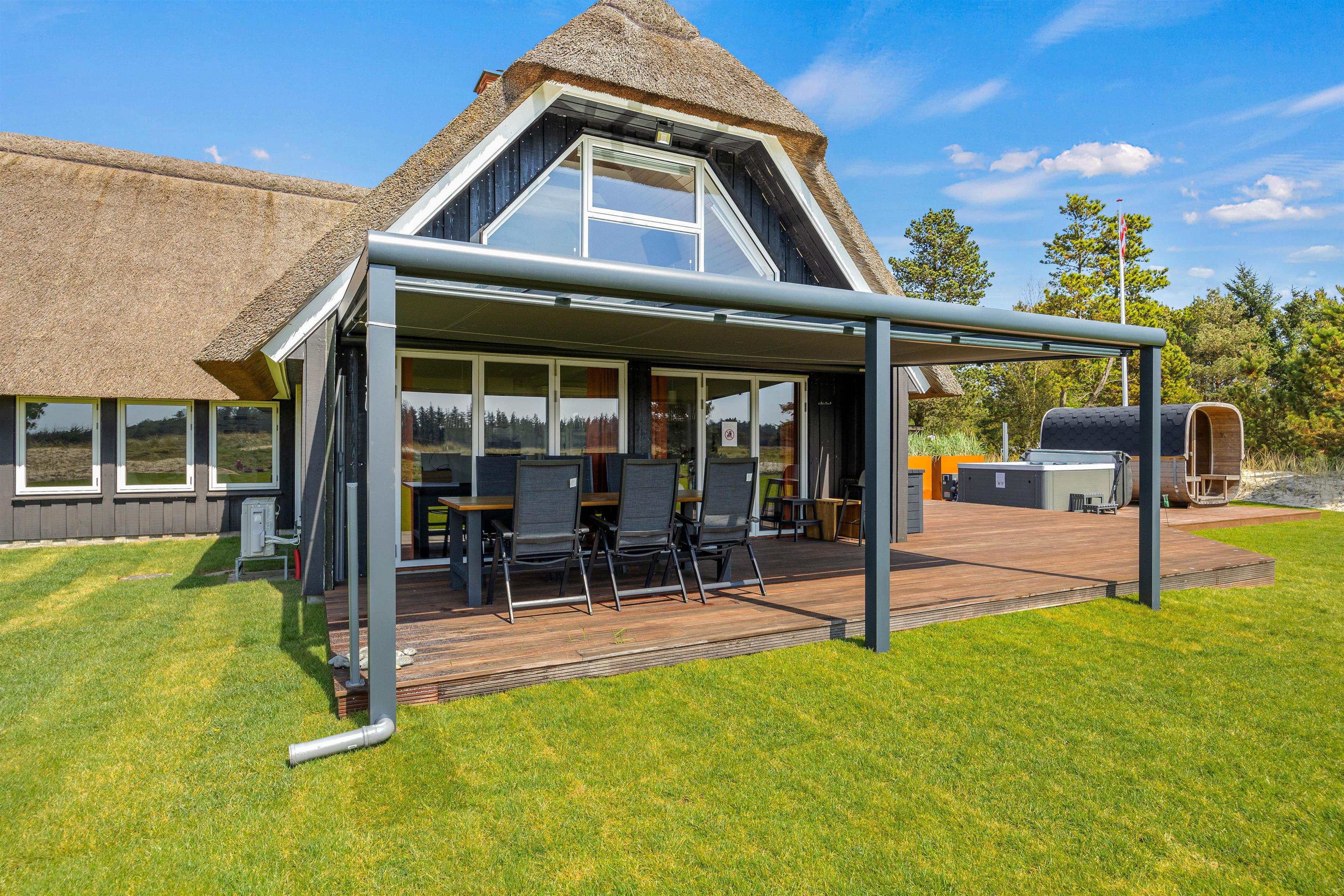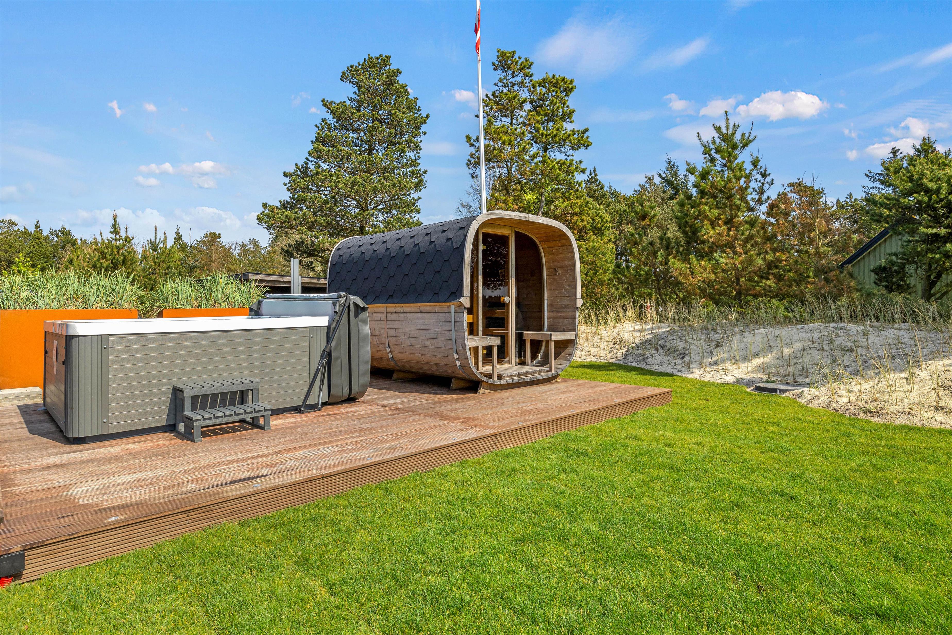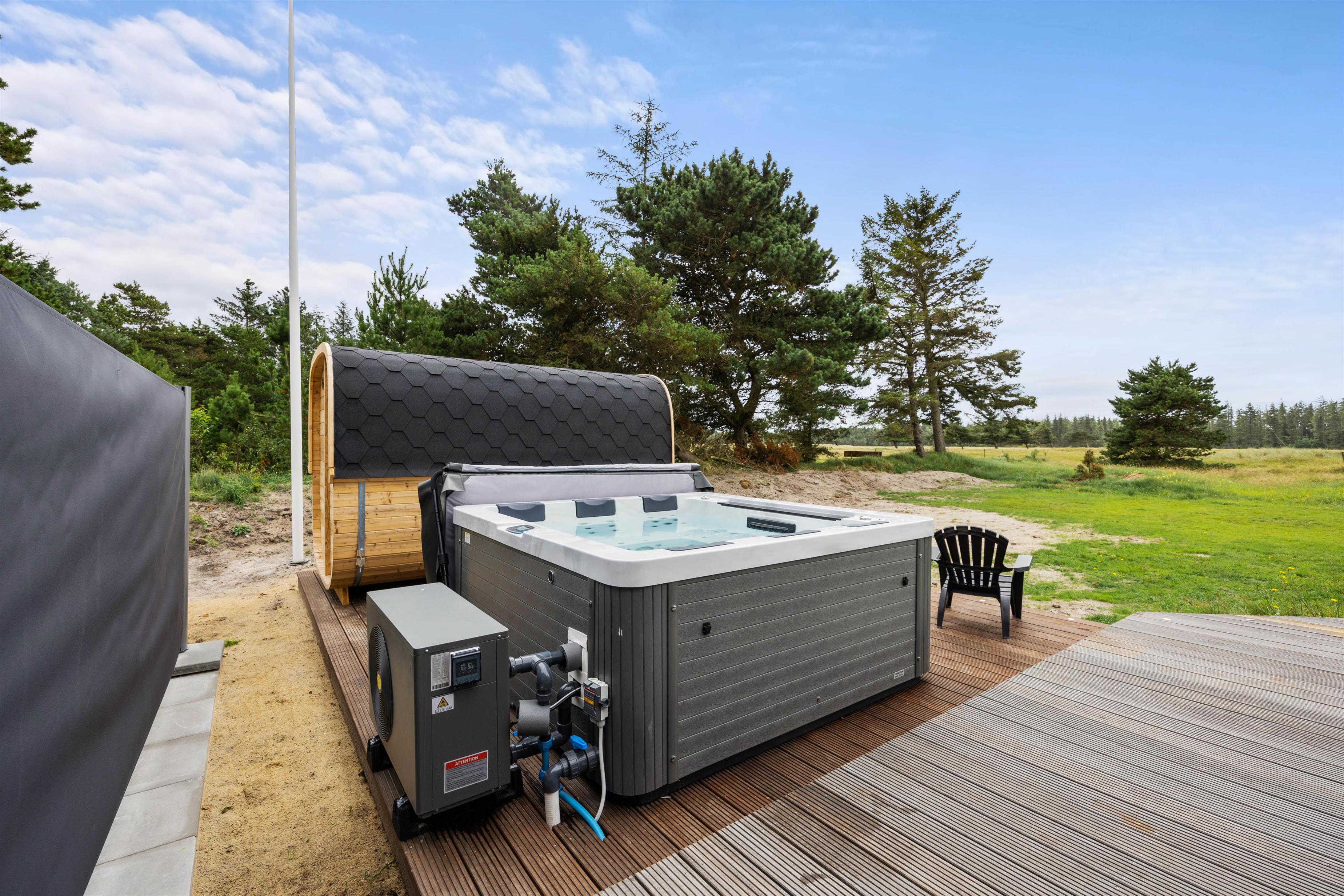 Det er ikke kun sommerhusets indre, der imponerer. Der er også fulgt op på den luksuriøse atmosfære i udearealet. Først og fremmest står et udendørs spabad – også med egen energieffektiv varmepumpe – og en saunatønde klar til at give jer uforglemmelige wellnessoplevelser med Vejers’ rolige naturomgivelser som kulisse.