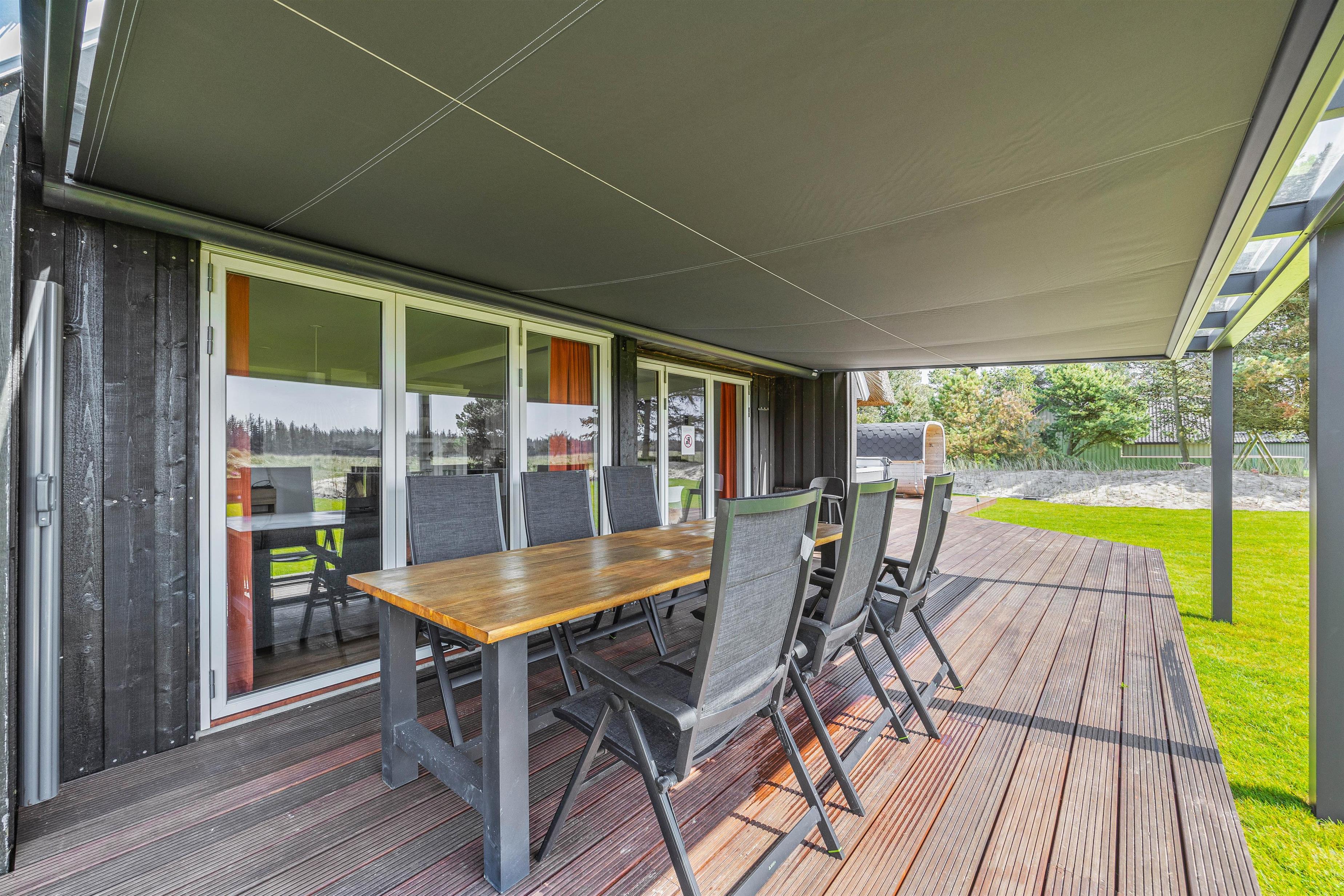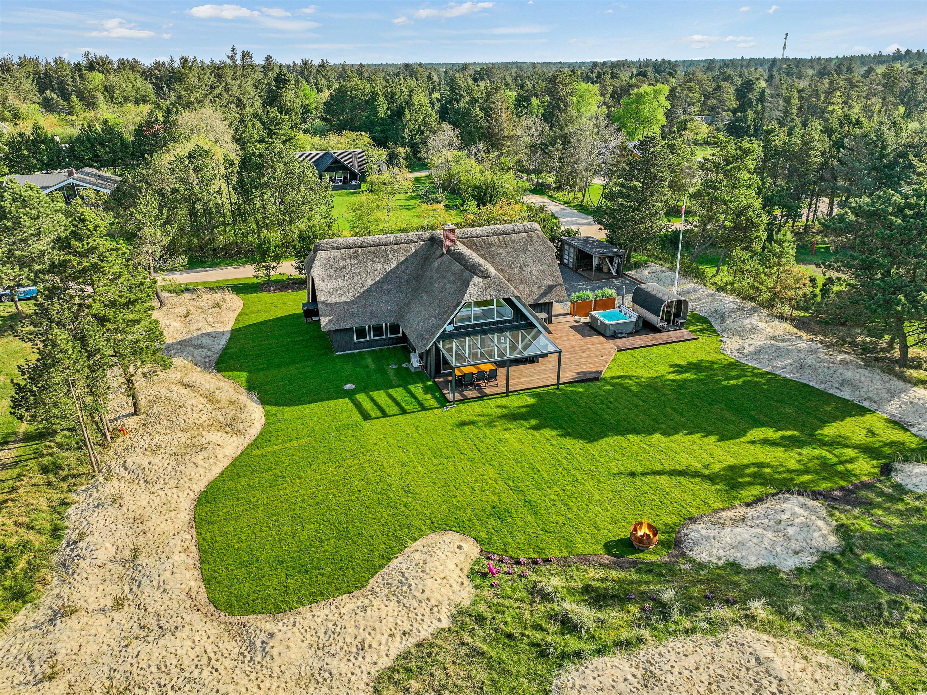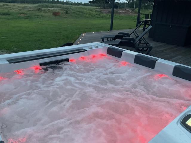 Det er ikke kun sommerhusets indre, der imponerer. Der er også fulgt op på den luksuriøse atmosfære i udearealet. Først og fremmest står et udendørs spabad – også med egen energieffektiv varmepumpe – og en saunatønde klar til at give jer uforglemmelige wellnessoplevelser med Vejers’ rolige naturomgivelser som kulisse.