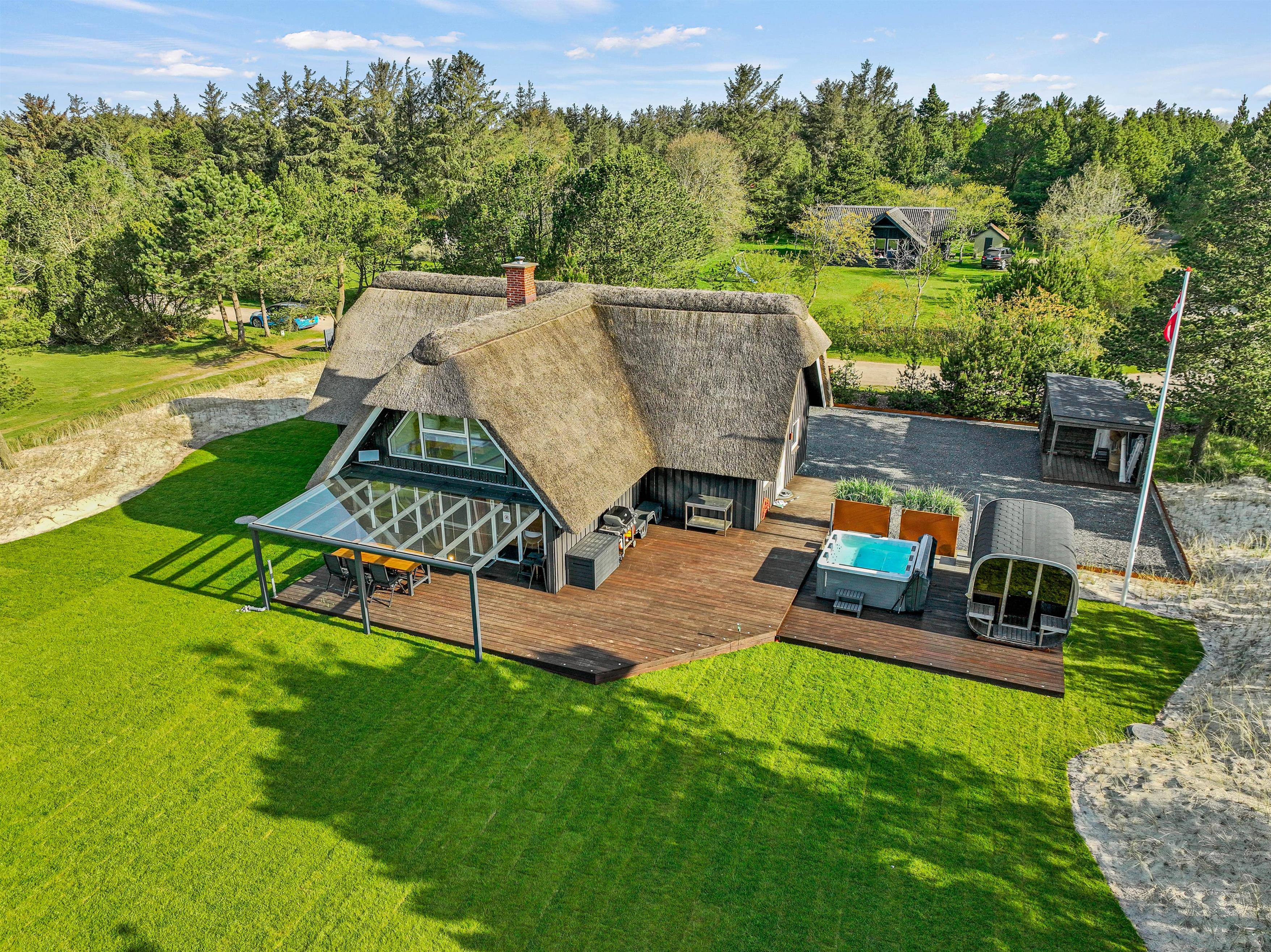 Velkommen på Aarrildsøvej 18 i Vejers Strand: Adressen, der garanterer dig en ferieoplevelse i særklasse. Det femstjernede sommerhus kombinerer topmoderne faciliteter som swimmingpool, udendørs spabad og saunatønde med en førsteklasses beliggenhed ud til et åbent engområde – med jævnligt visit fra områdets majestætiske krondyr.