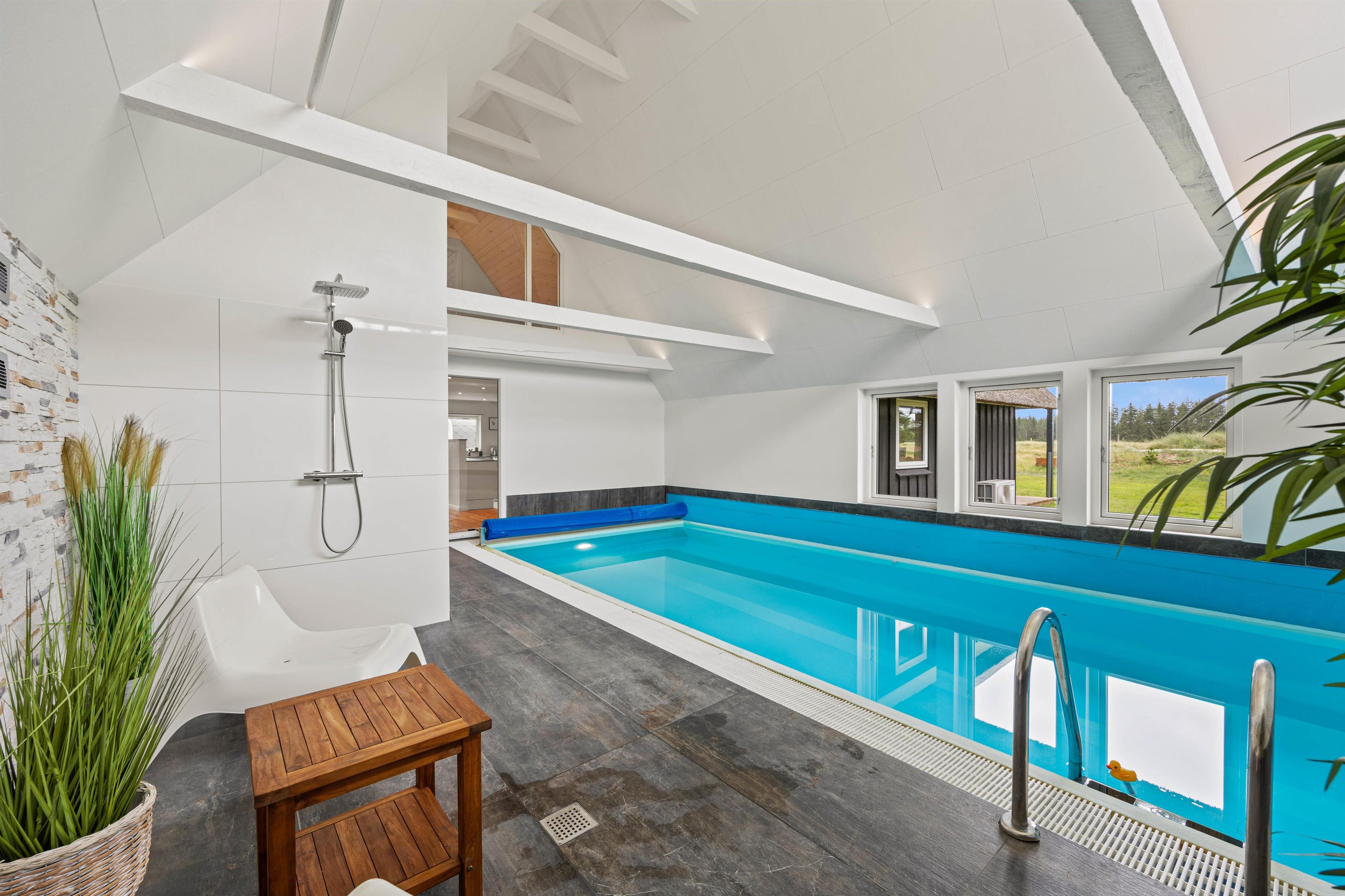 Et af sommerhusets største highlights er den indendørs swimmingpool, hvor du kan nyde en forfriskende dukkert, uanset vind og vejr. Poolen opvarmes desuden af sin egen energibesparende varmepumpe, så du skal ikke bekymre dig om høje elregninger på bagkant.