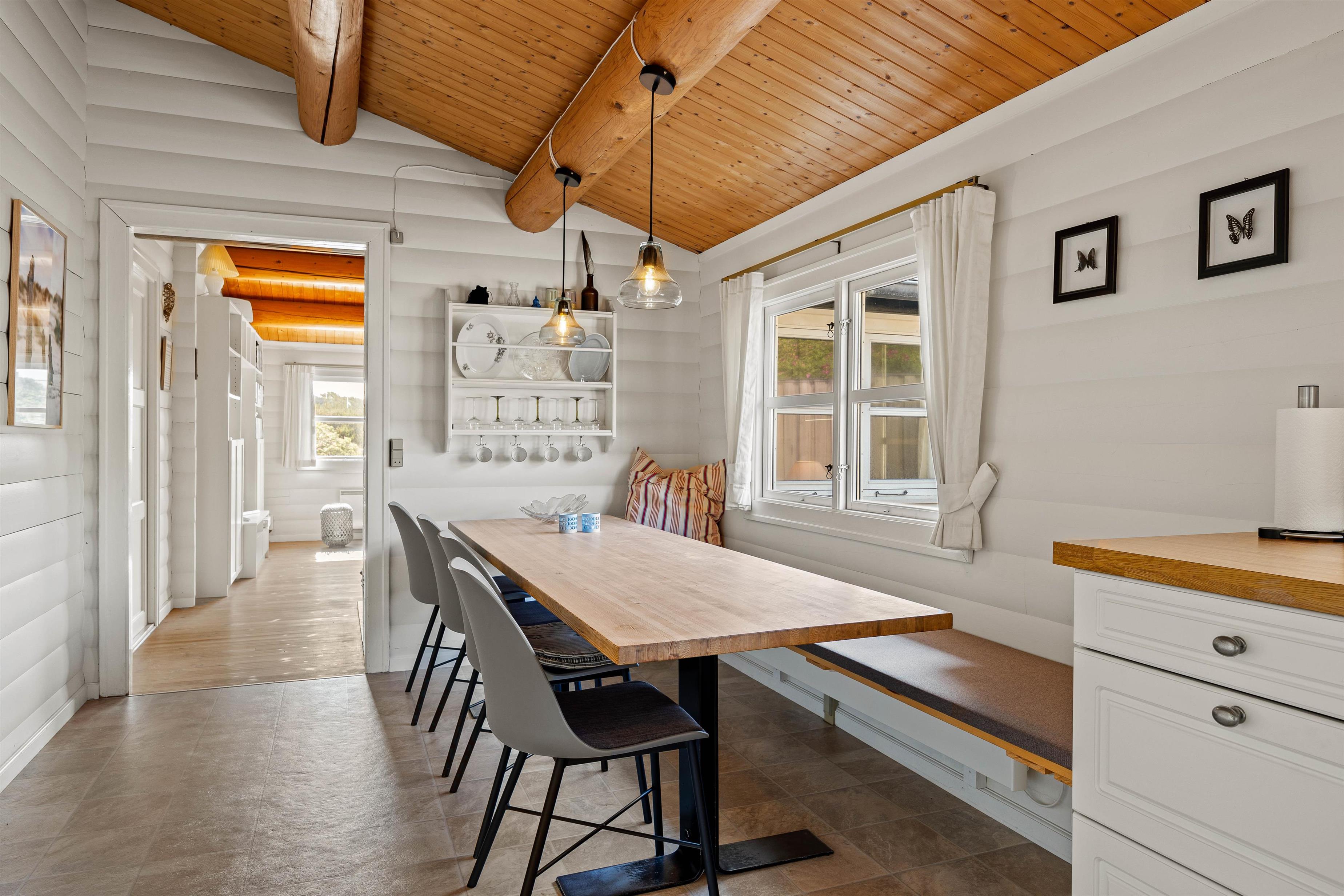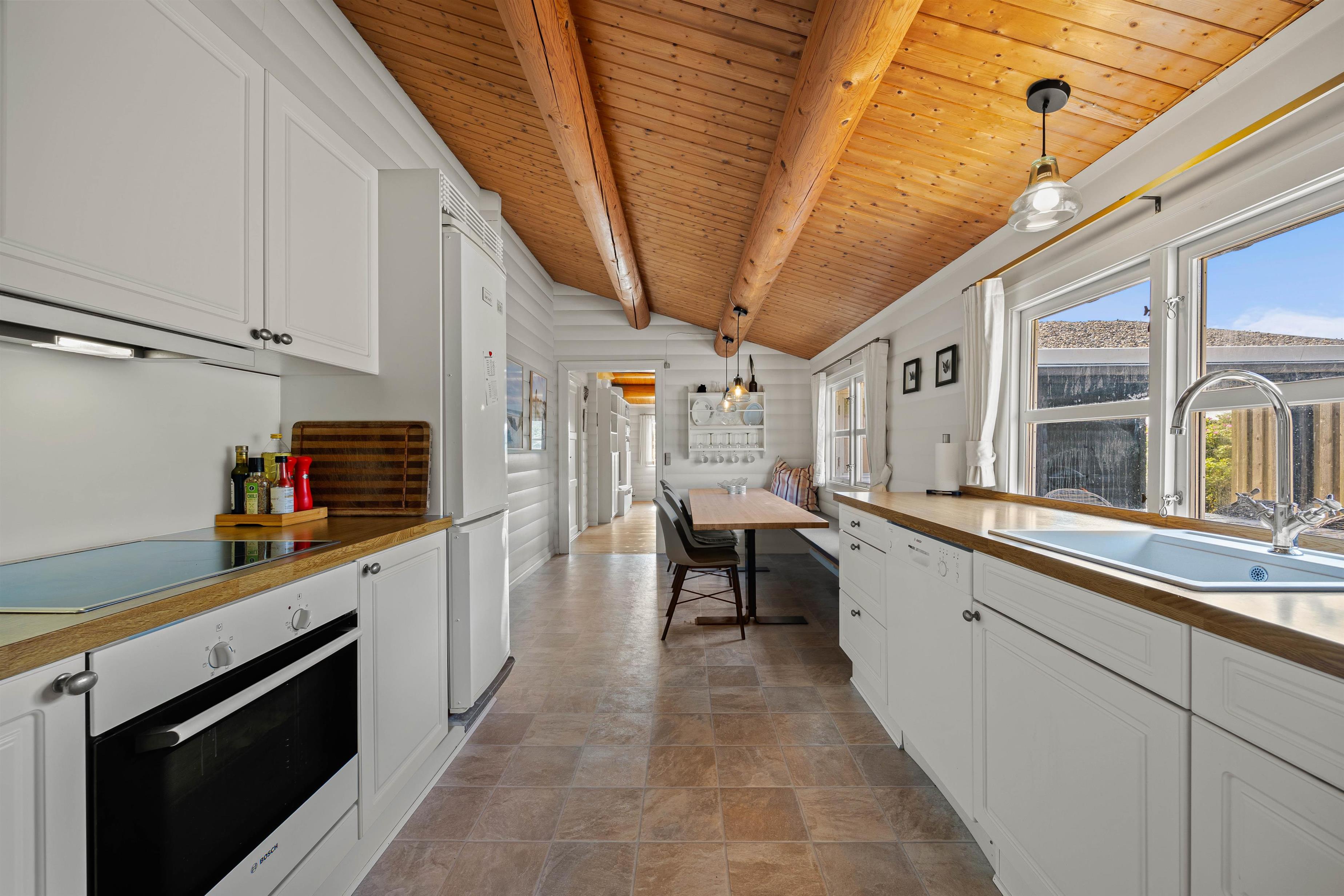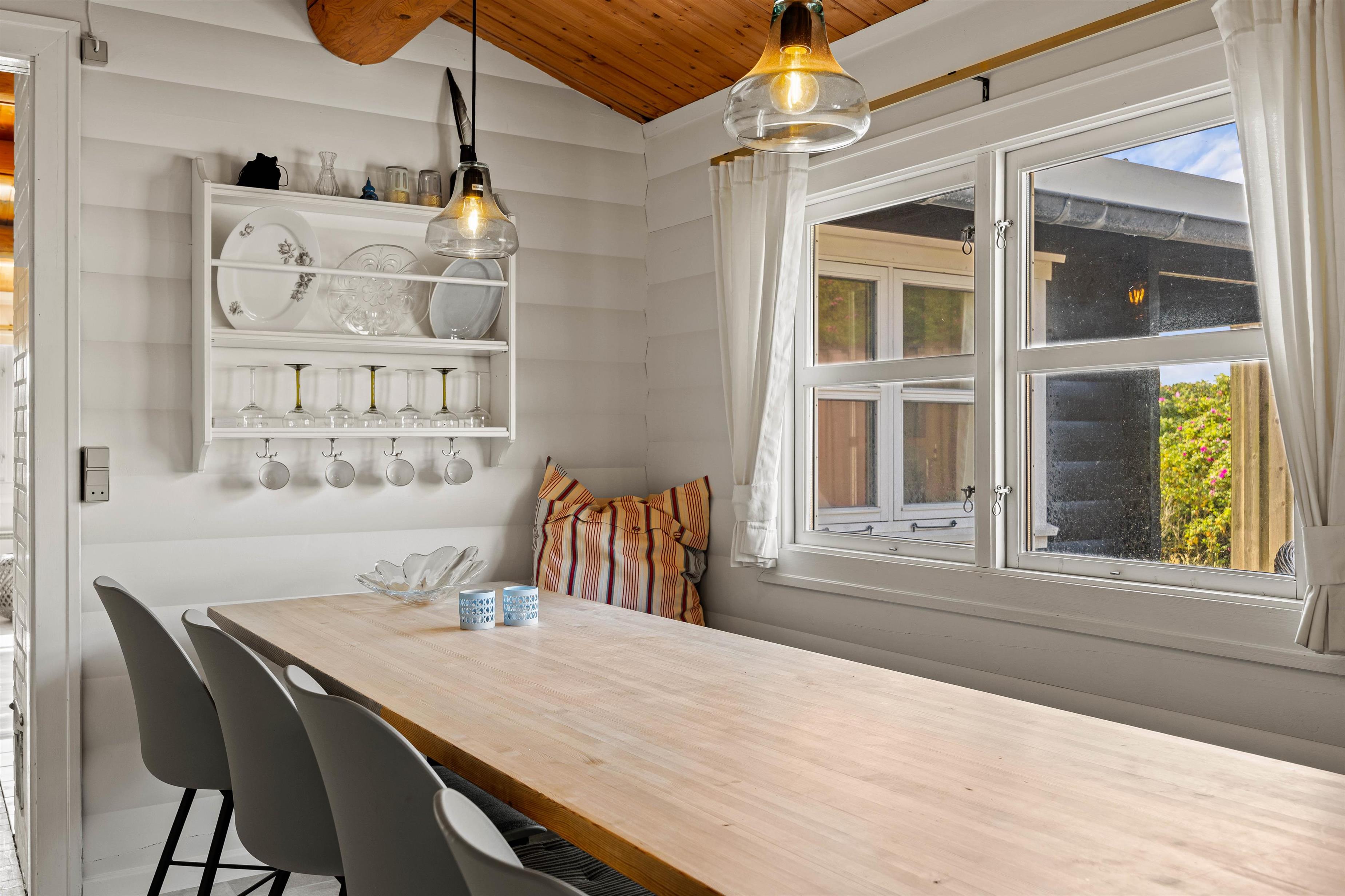 På Rosenvej 19 kan fire feriegæster holde en skøn ferie i rolige omgivelser. Indretning er lys, enkel og i klassisk sommerhusstil med trælofter og -vægge. Her er plads til hygge og samvær i den store stue, hvor brændeovnens varme breder sig. Ildens knitren og den behagelige varme skaber den perfekte feriestemning, og selv hvis vejret viser sig fra sin kølige side, kan I gøre det behageligt og lunt. Sæt jer godt til rette i sofaen med jeres yndlingsfilm, som kan streames via sommerhusets Chromecast – eller nyd kaffen med en god bog i lænestolene. Fra stuen er der åbnet op ind til spiseområde og køkken. Det lille køkken er udstyret med alt, hvad hjertet begærer. Tilbered et lækkert måltid sammen, mens der spilles brætspil ved spisebordet. Mens der laves mad, kan I nyde udsigten over klitterne.