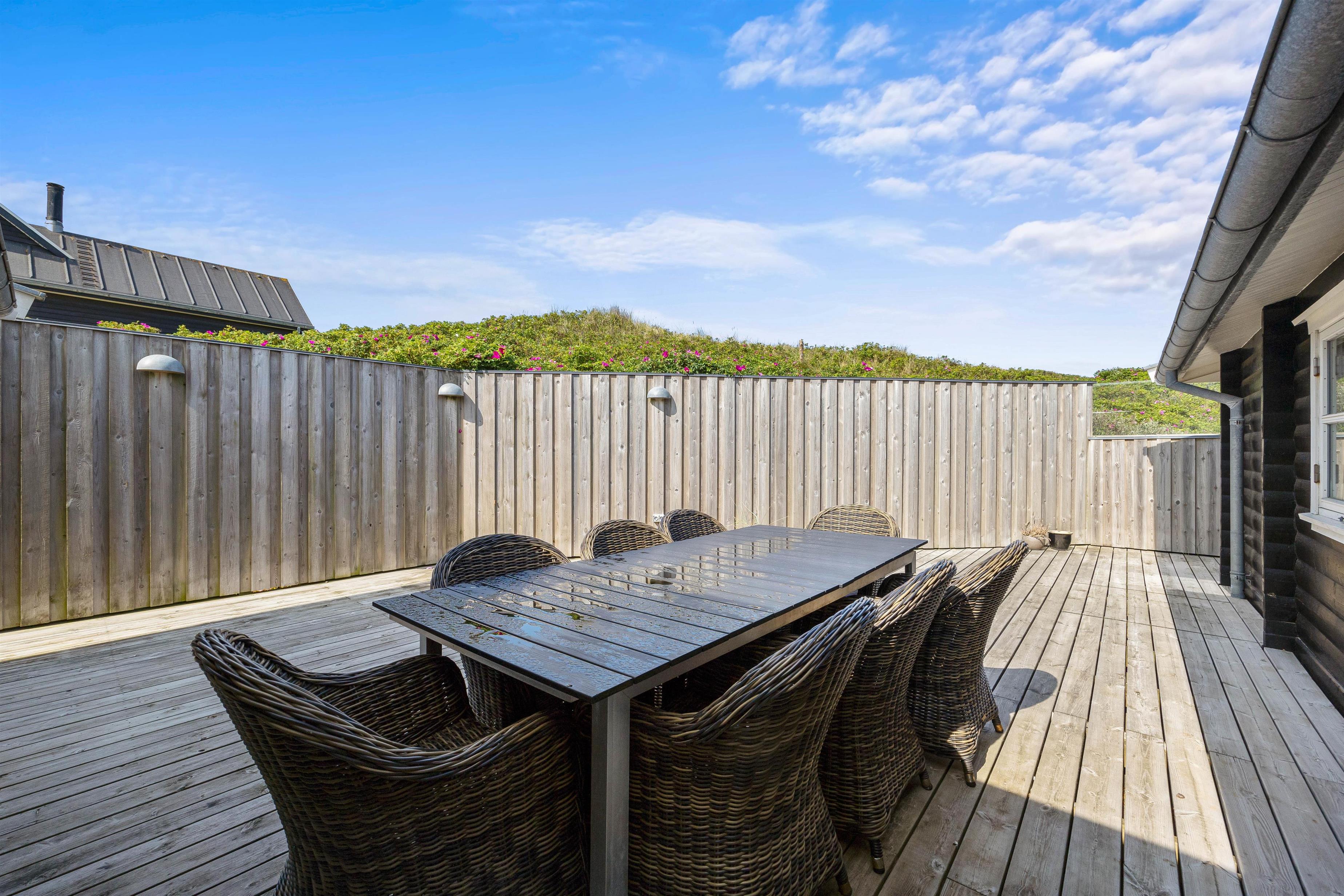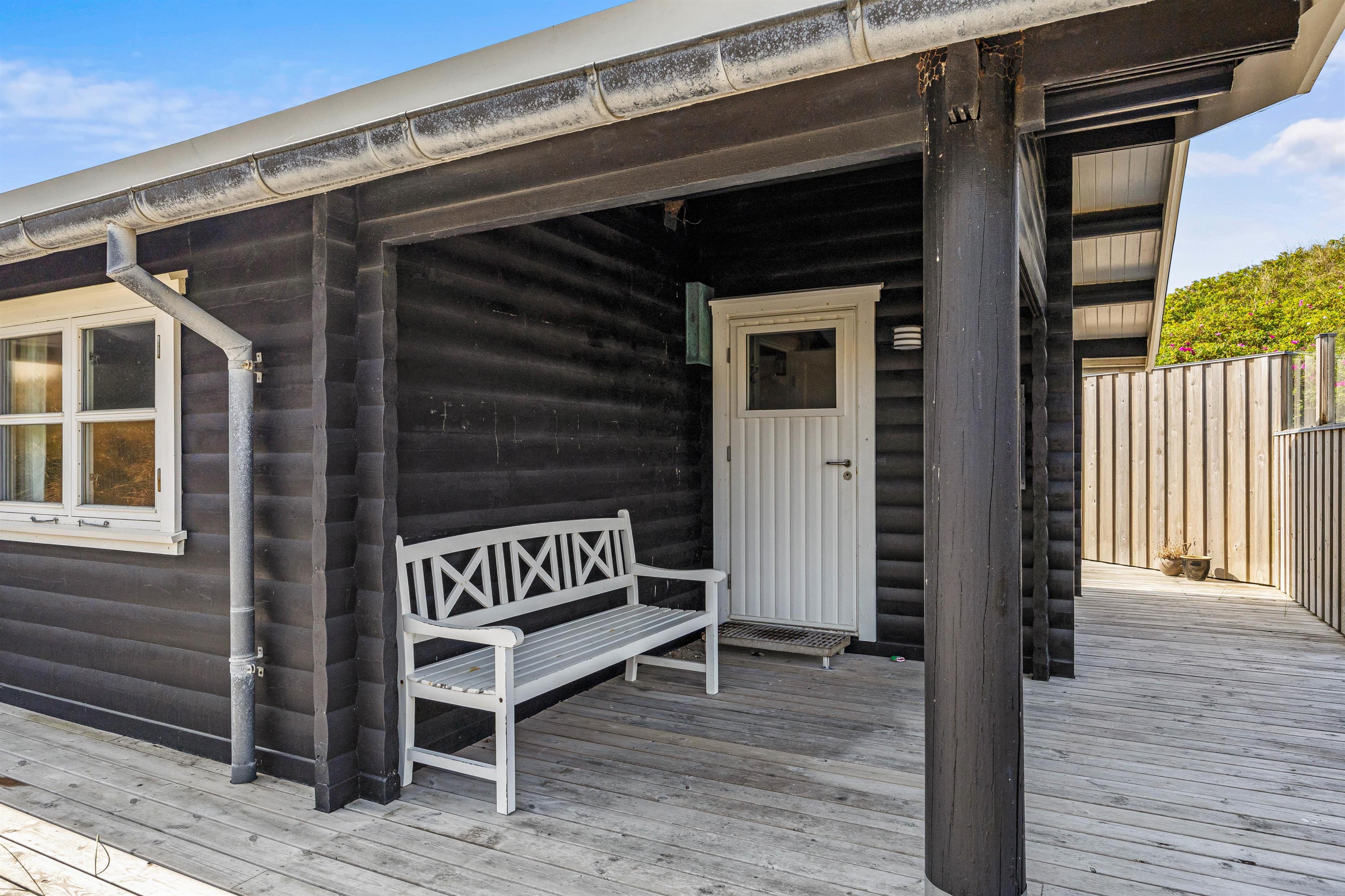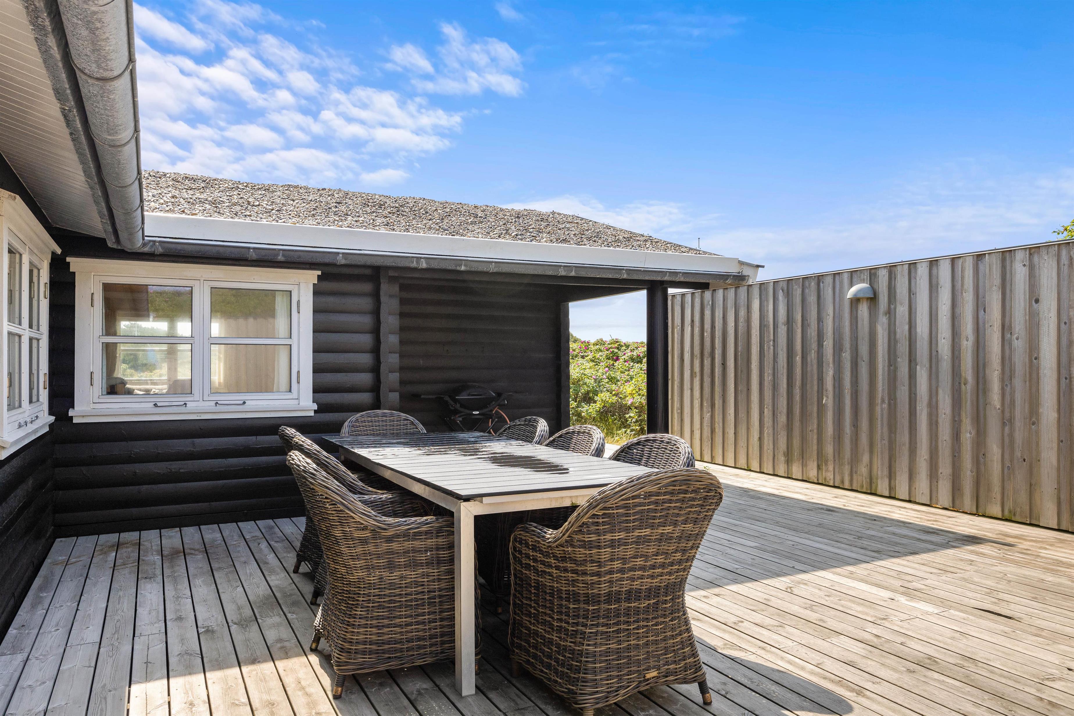 Sommerhuset omsluttet af en skøn træterrasse, som er afskærmet på hele sydsiden. Her venter havemøbler og liggestole på jer, og I kan altid finde et solrigt spot eller, hvis det er nødvendigt, et læ- og skyggefuldt sted at slappe af. Til den perfekte sommeraften hører sig grillmad til – tilbered et lækkert måltid på sommerhusets gasgrill og sæt jer til rette om bordet med en kold cola eller et godt glas rosé.