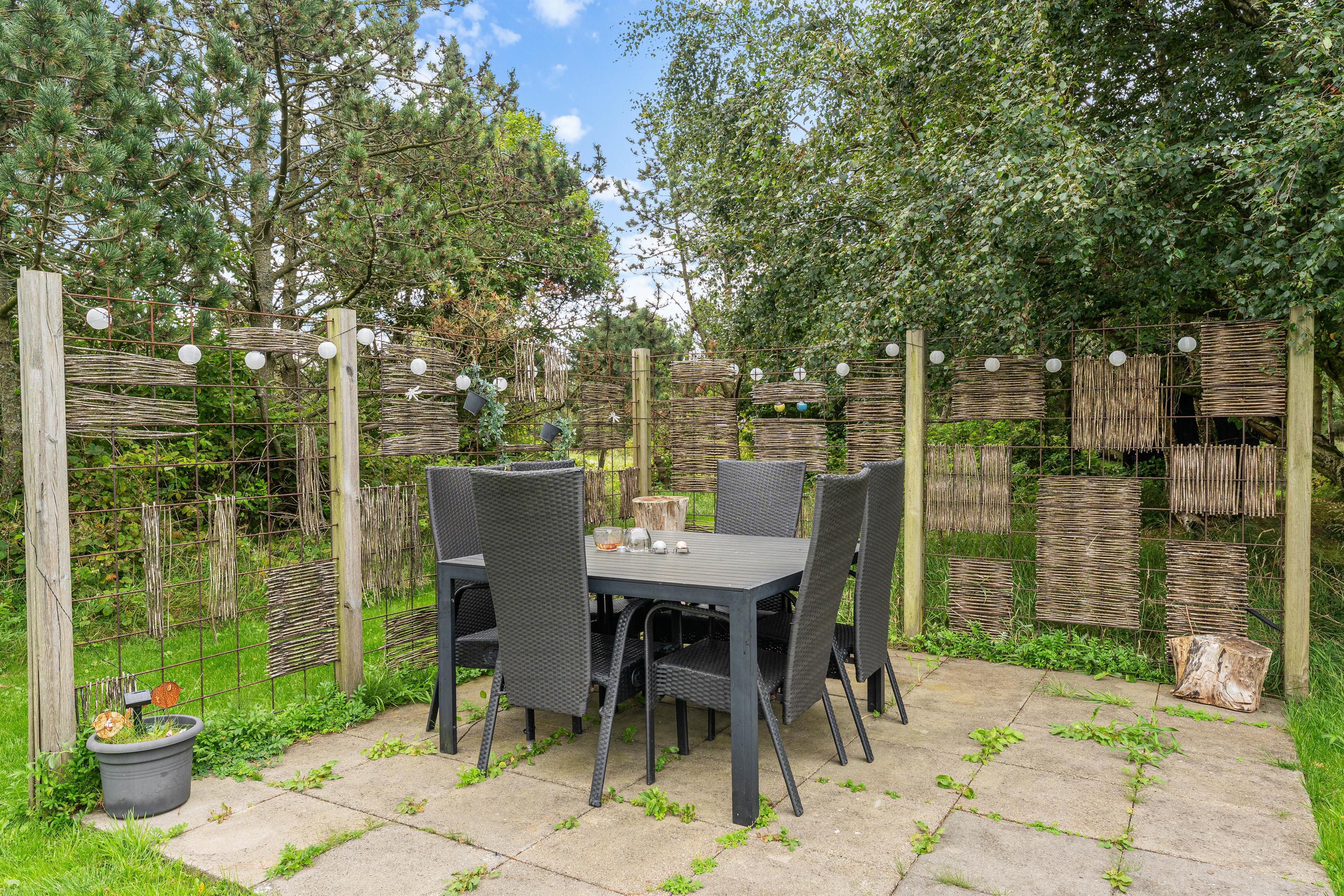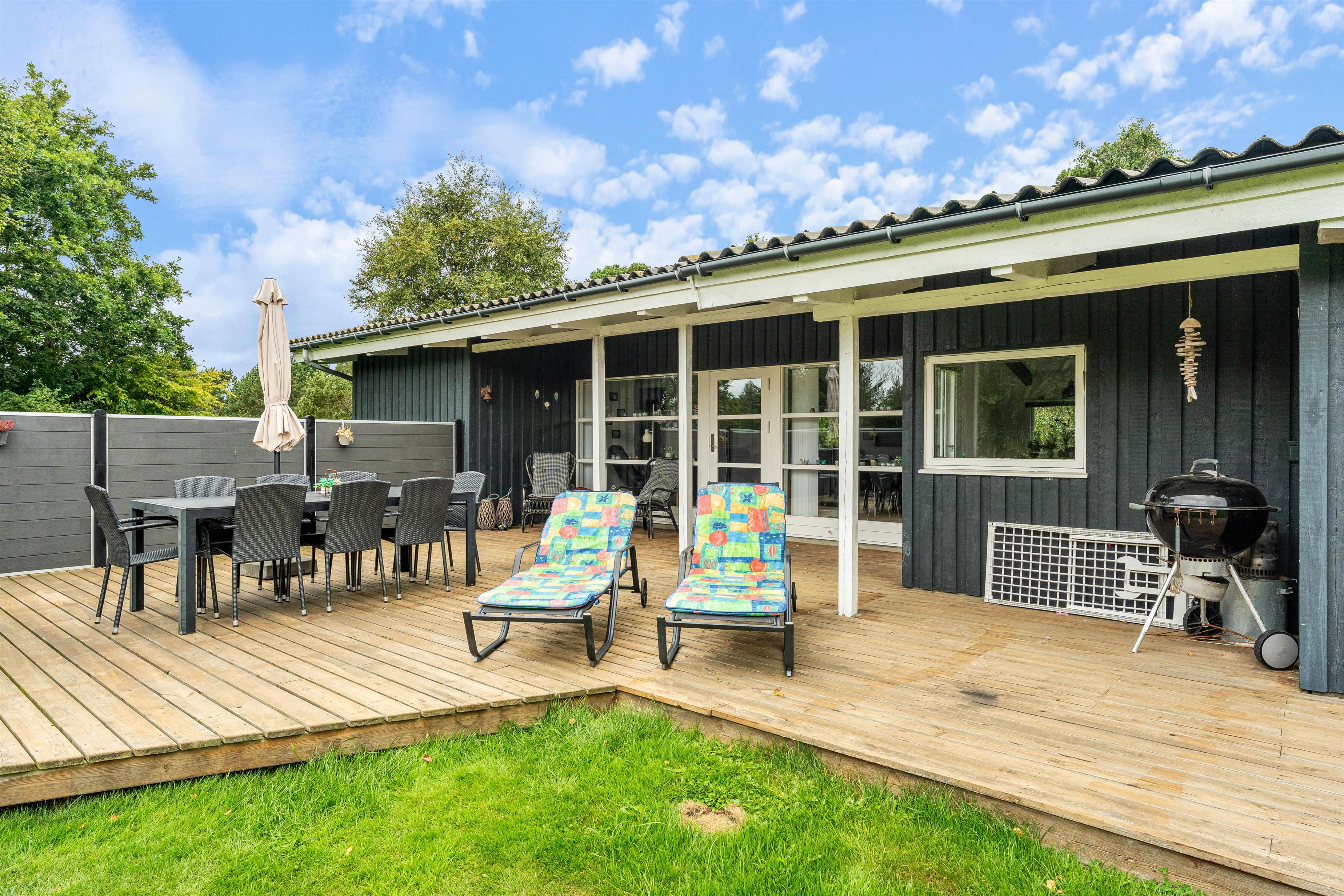 De udendørs omgivelser er helt i top. Fra stuen kommer I ud på den store terrasse, som både har en overdækket og afskærmet del. På den store græsplæne kan børnene og hunden få lov til at tumle, mens I tager en slapper i liggestolene eller får en kop kaffe ved havebordet og stadig kan holde øje med dem.