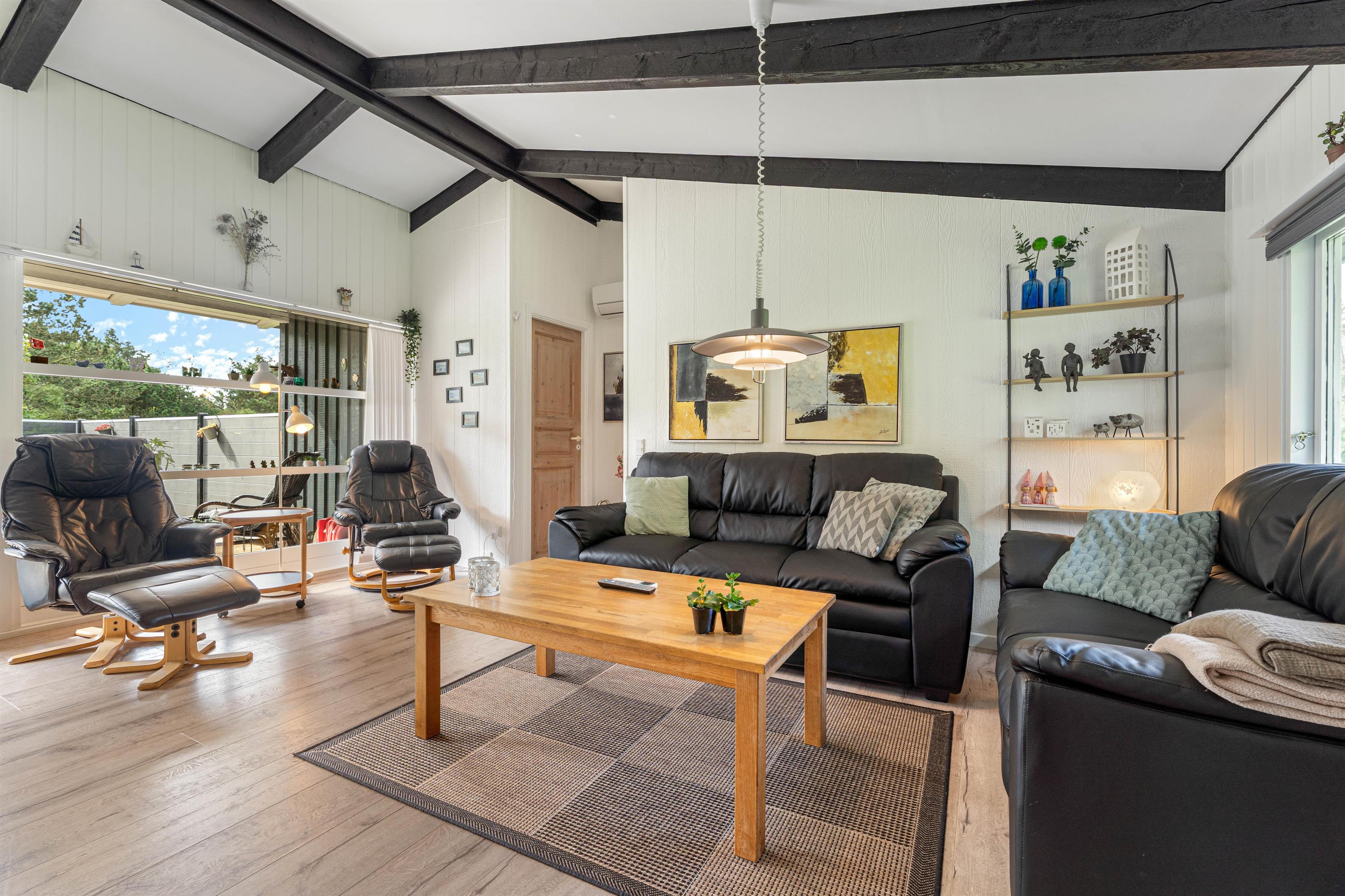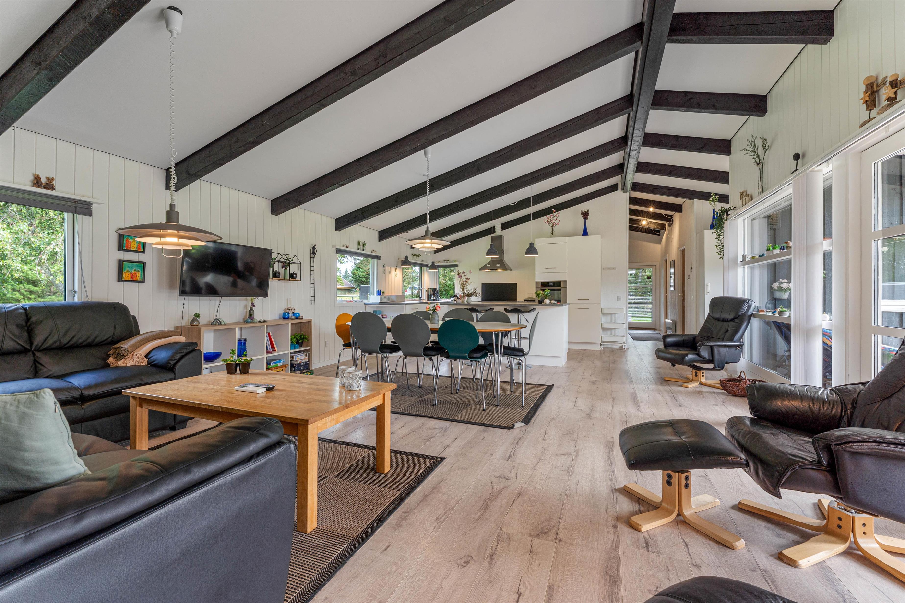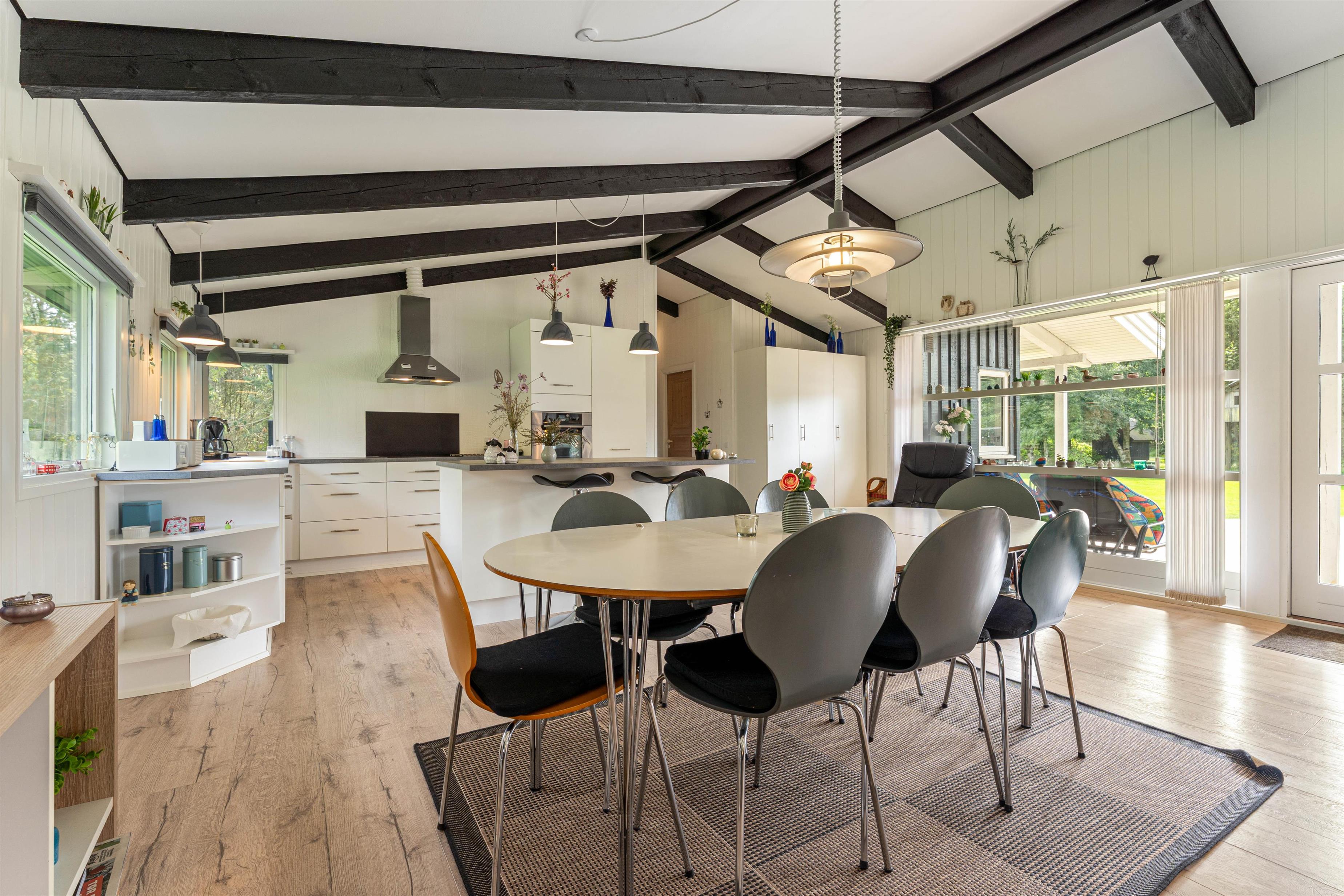 Der er lagt op til mange hyggelige stunder i det store opholdsrum, hvor stue og køkkenalrum er slået sammen og de store vinduespartier giver udsyn til den grønne have og sørger for et godt lysindfald.