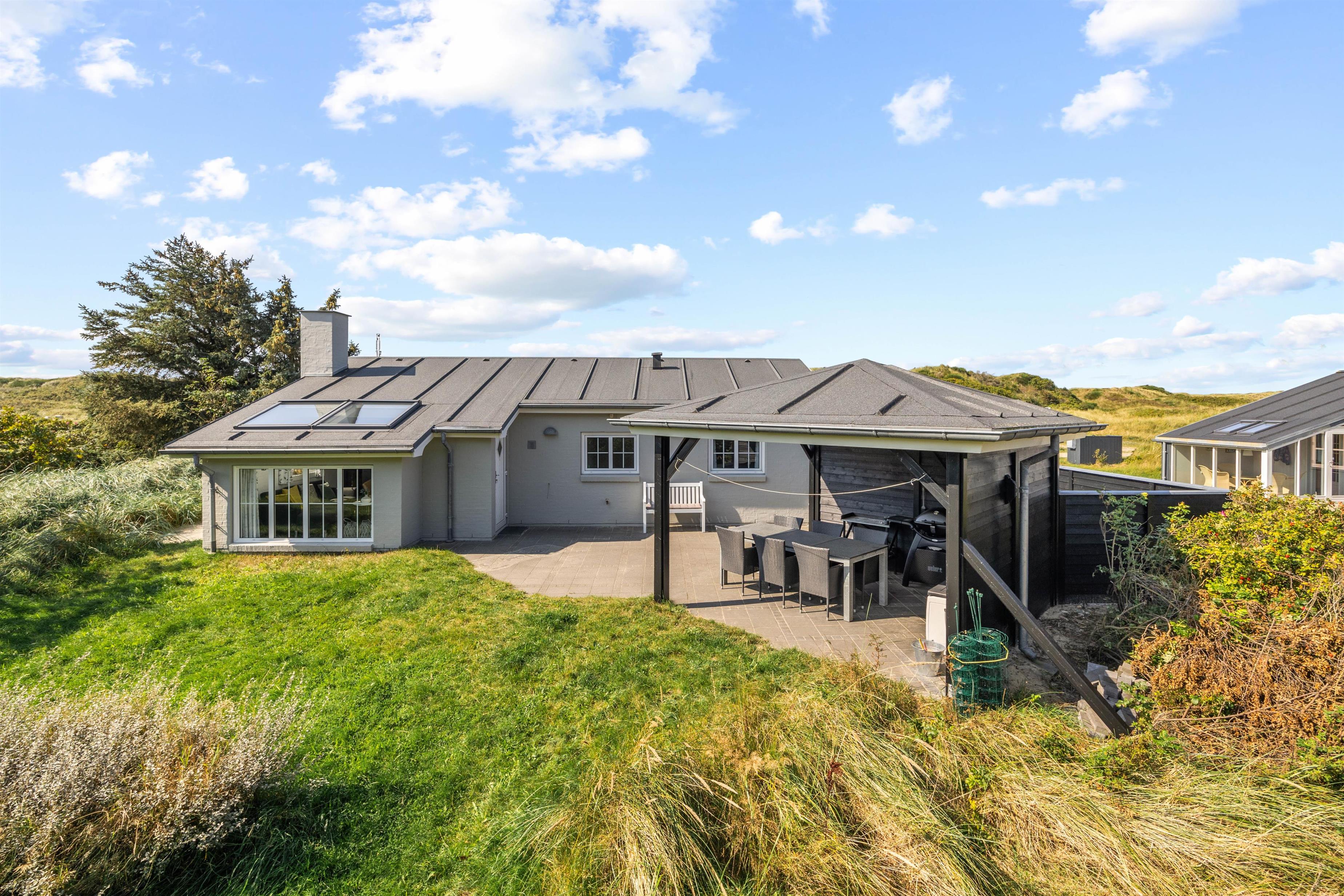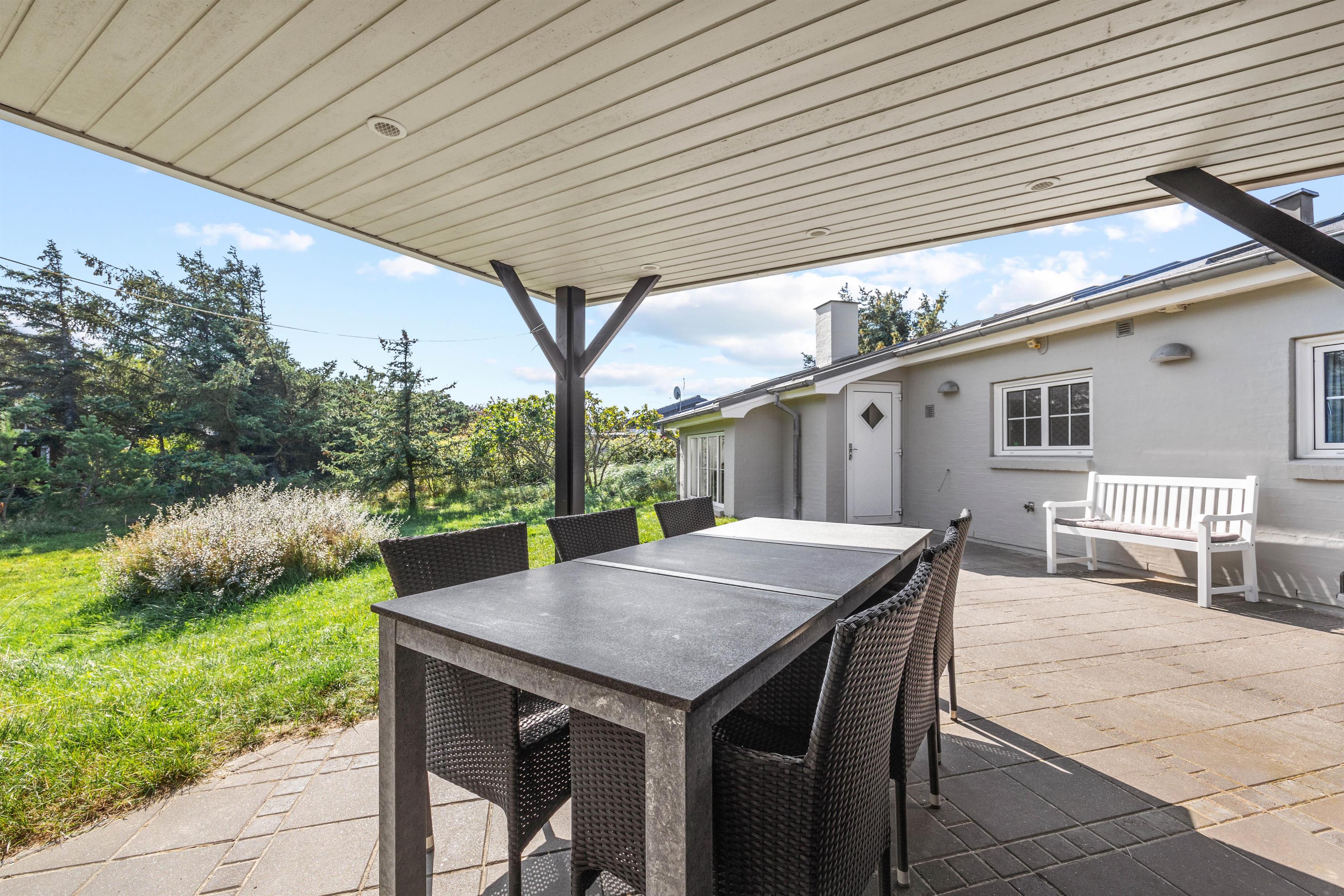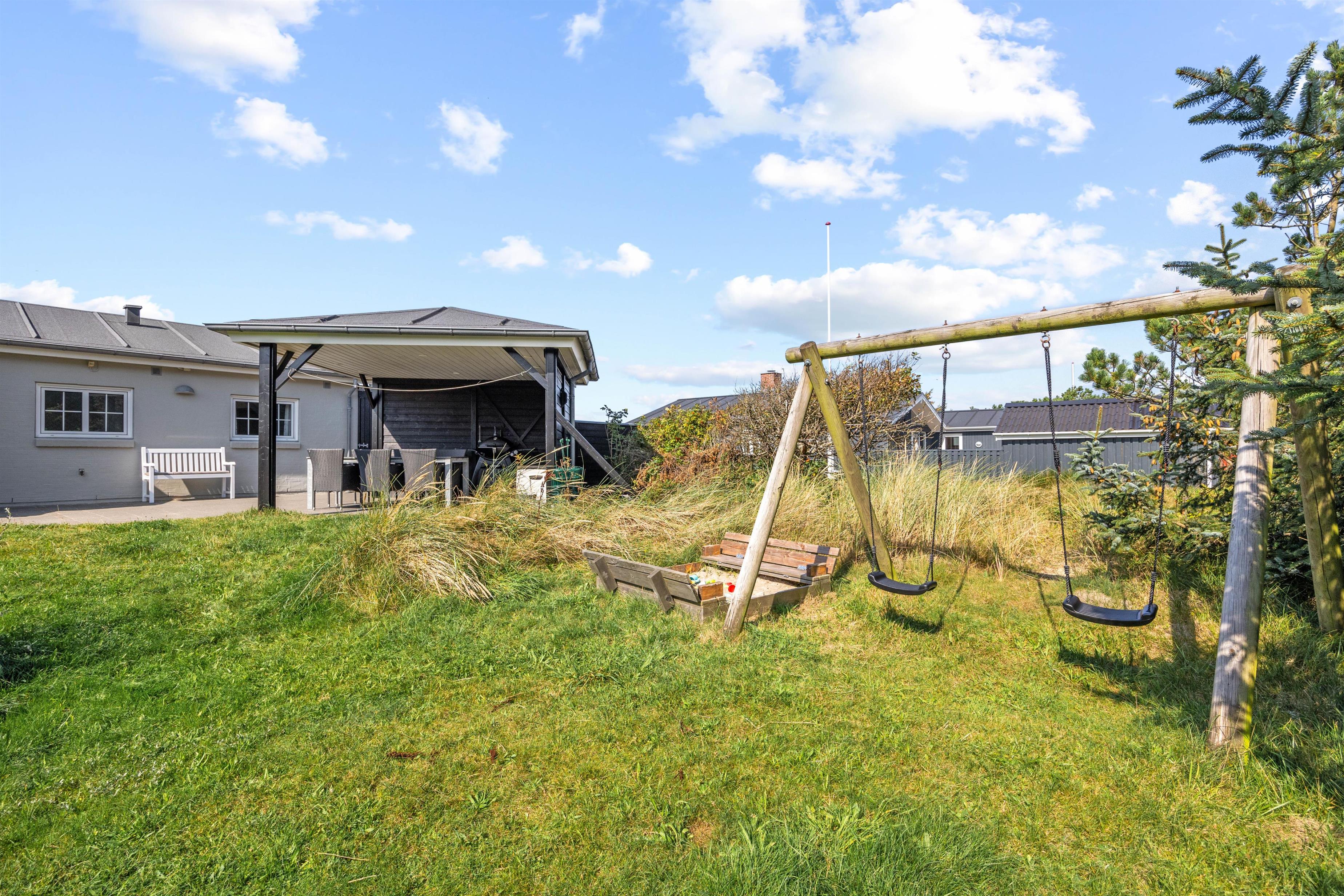 Husets terrasse er både afskærmet og har en overdækket pavillon, så I kan nyde den friske luft og tilberede middagen på grill i al slags vejr. Der er gode havemøbler og liggestole, så I kan dase i solen på de varme sommerdage. Både børnene og hundene vil elske at tumle på græsplænen, og til de mindste feriegæster er der gyngestativ og sandkasse.