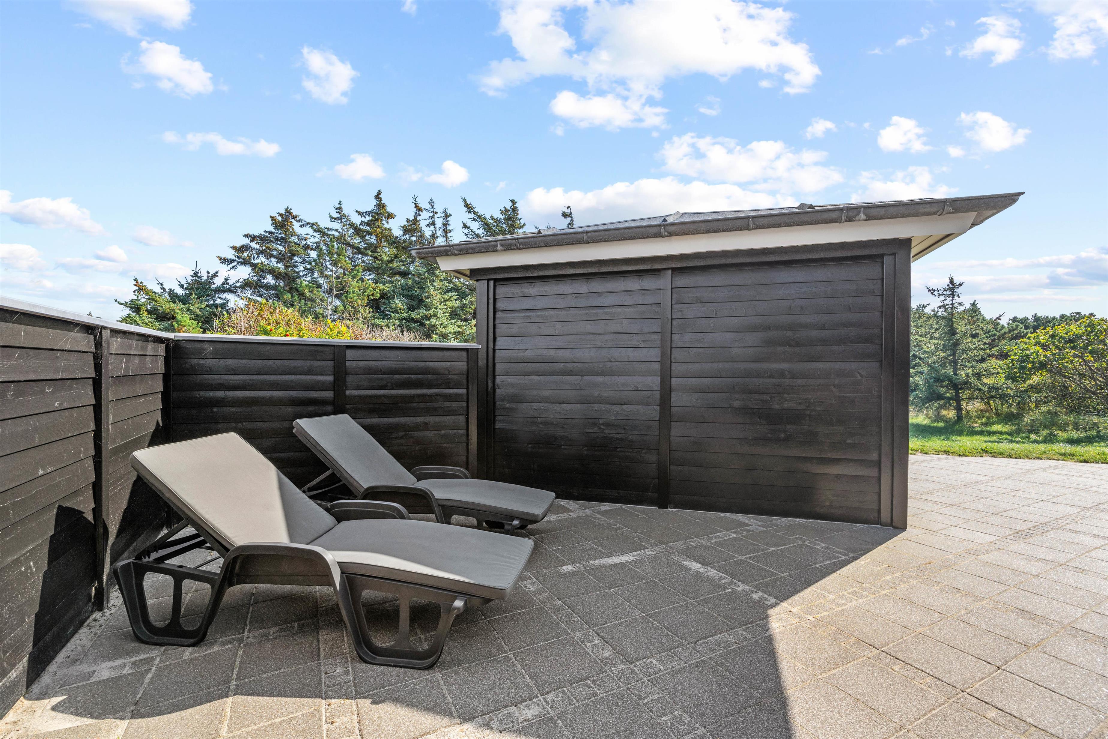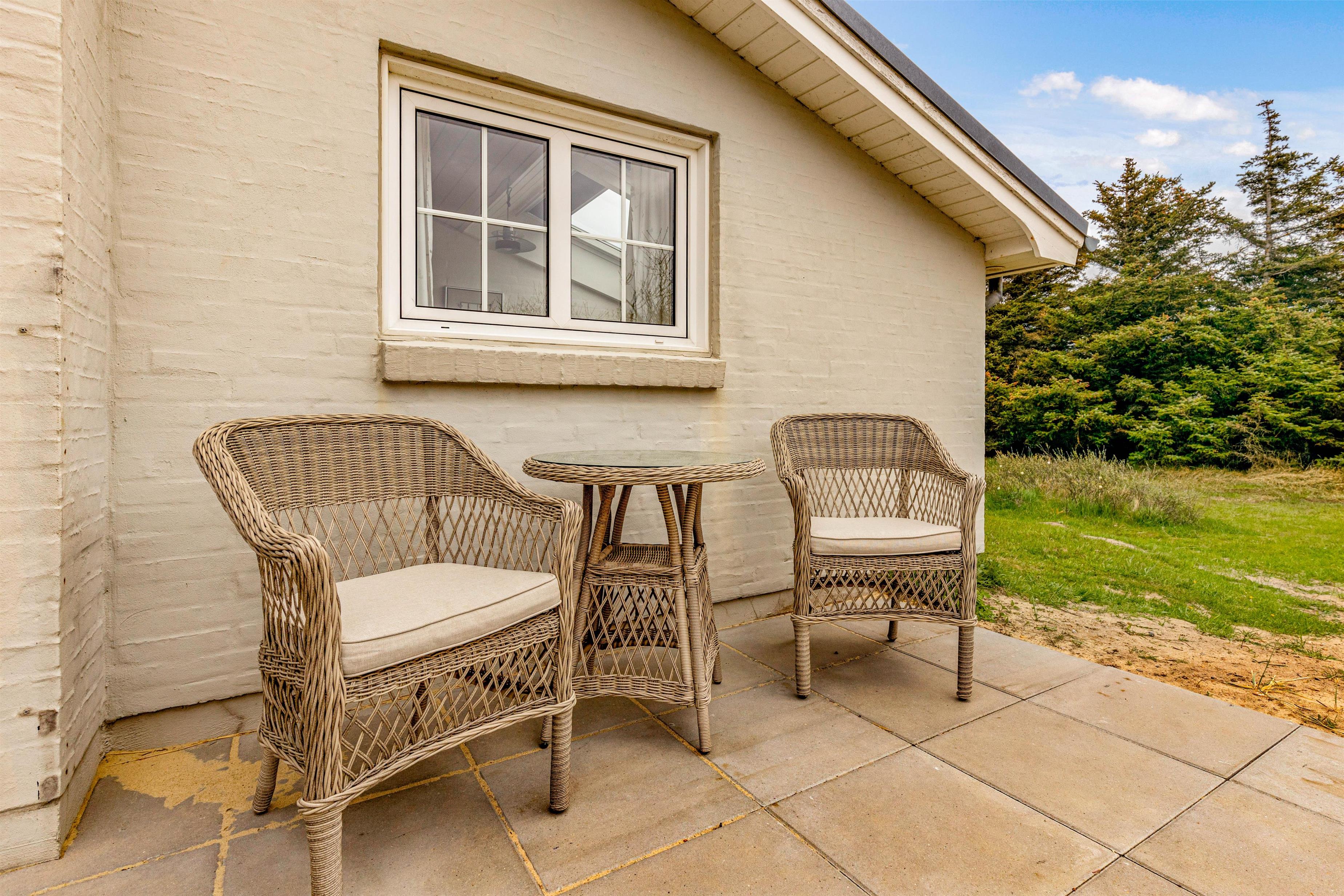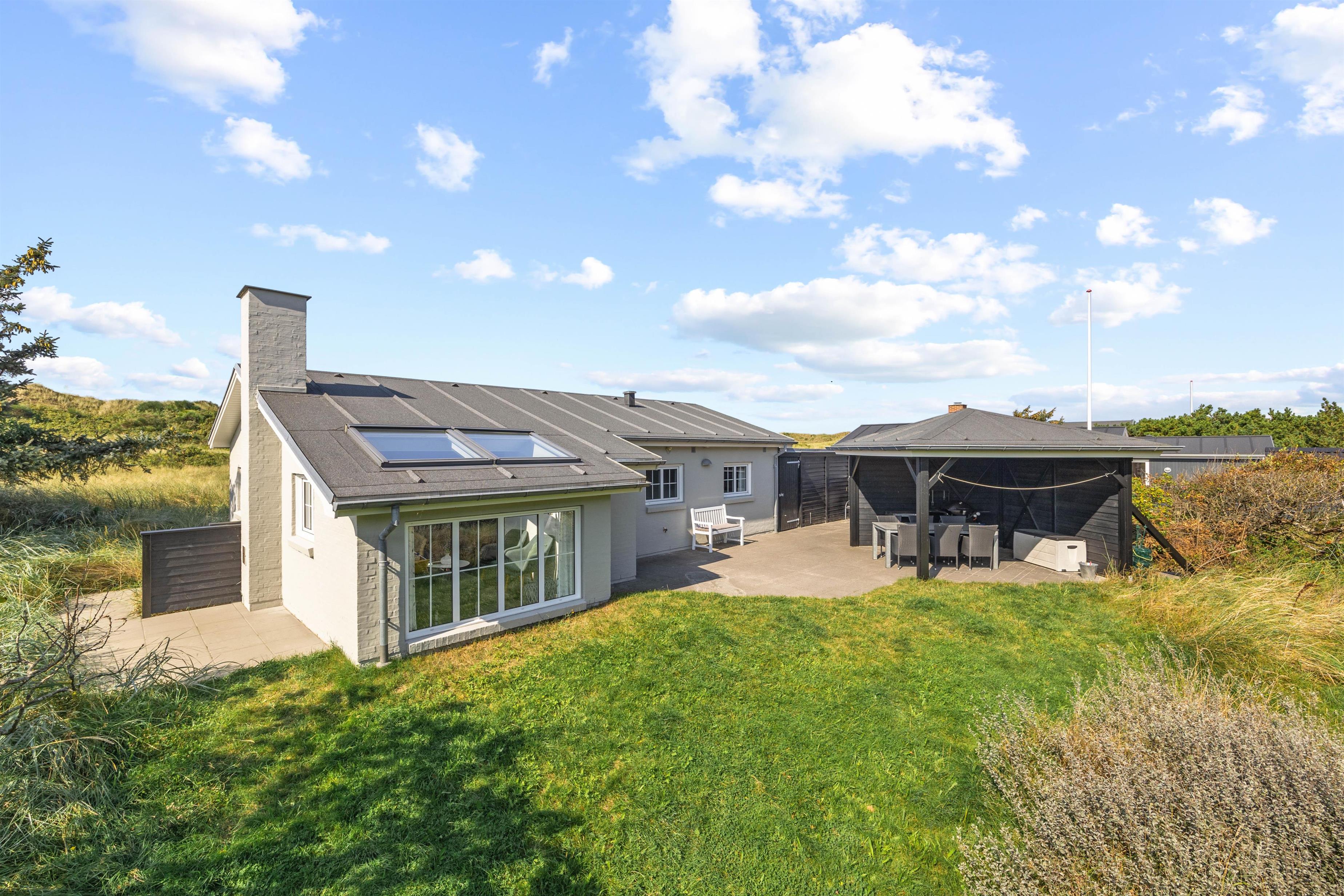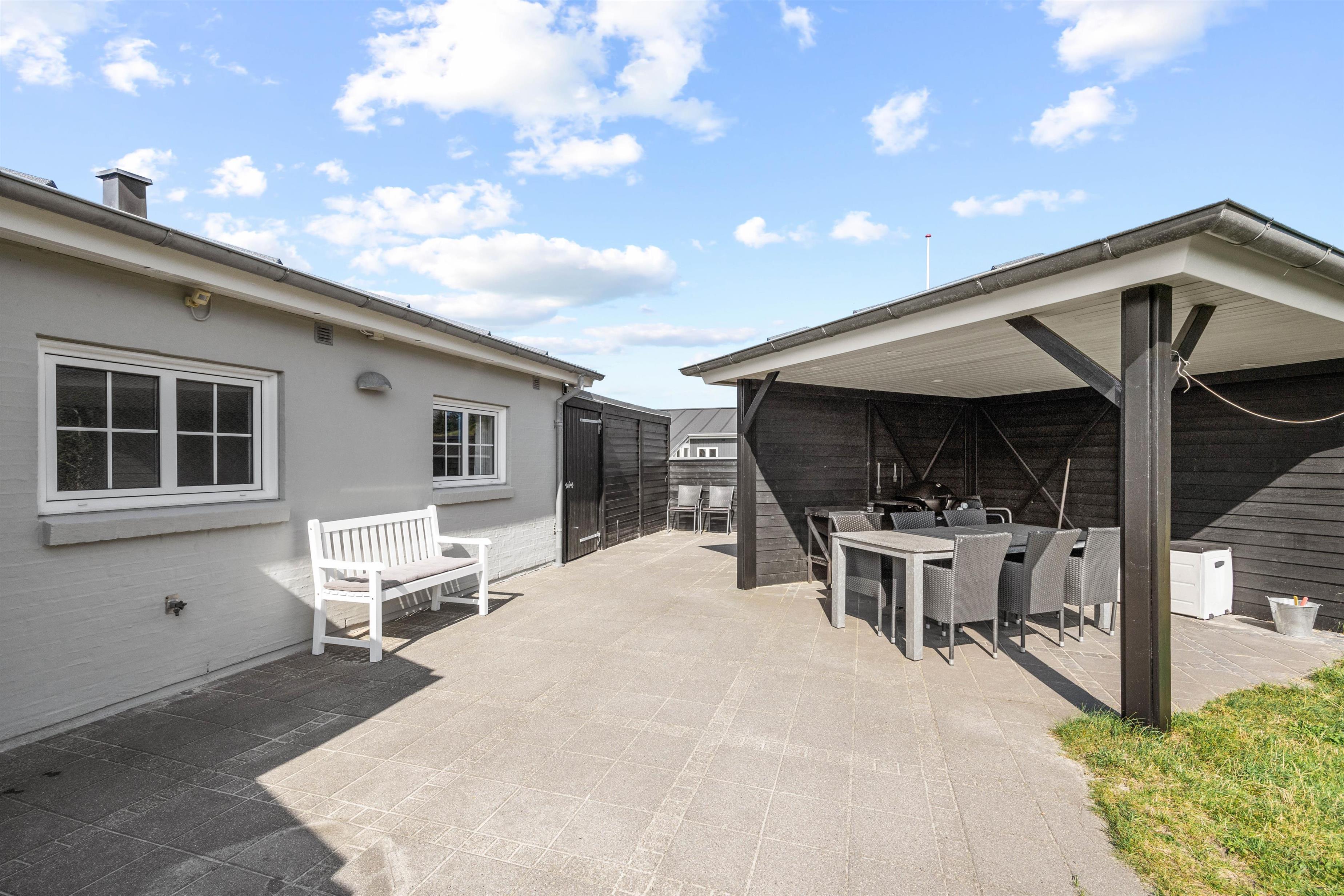 Husets terrasse er både afskærmet og har en overdækket pavillon, så I kan nyde den friske luft og tilberede middagen på grill i al slags vejr. Der er gode havemøbler og liggestole, så I kan dase i solen på de varme sommerdage. Både børnene og hundene vil elske at tumle på græsplænen, og til de mindste feriegæster er der gyngestativ og sandkasse.