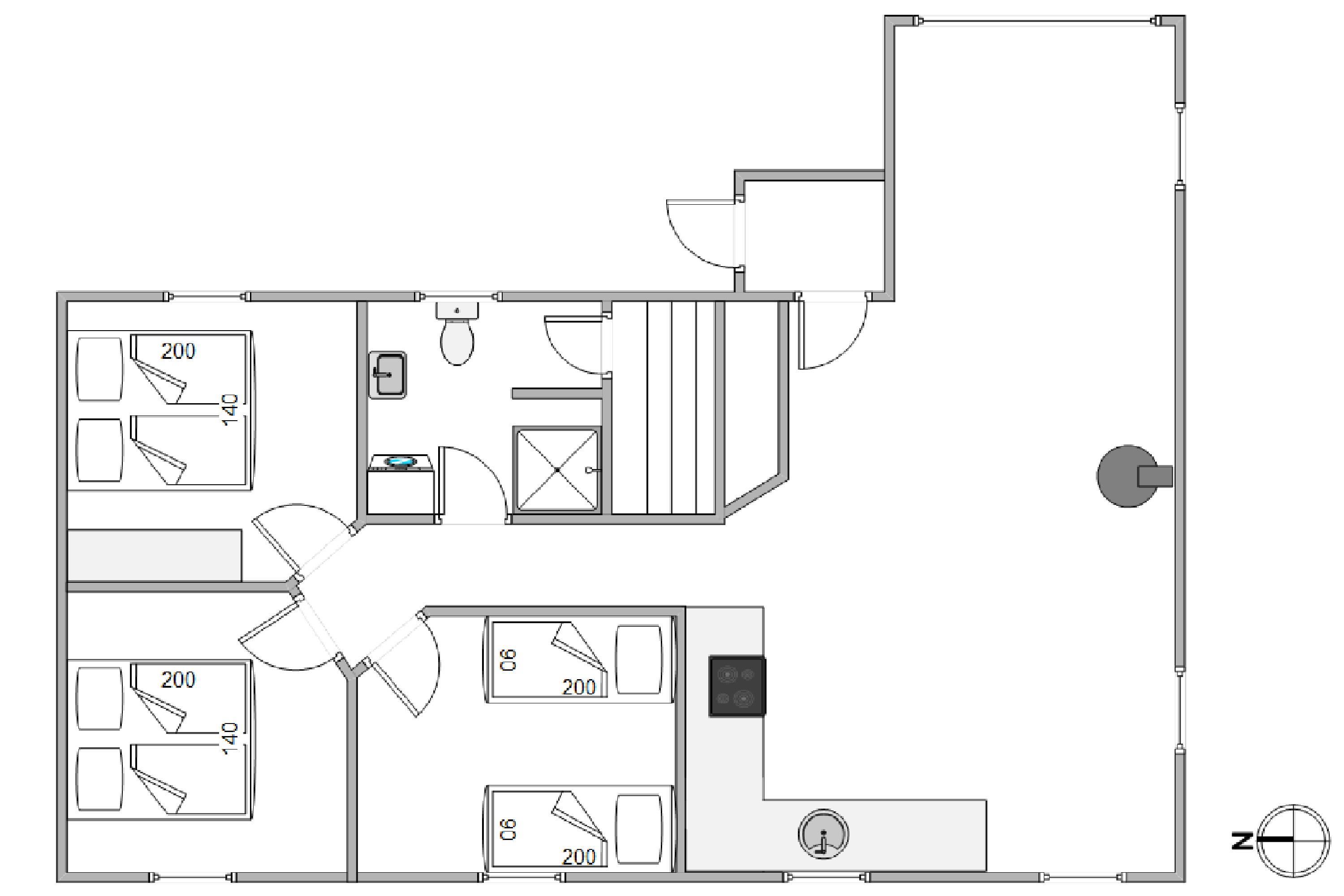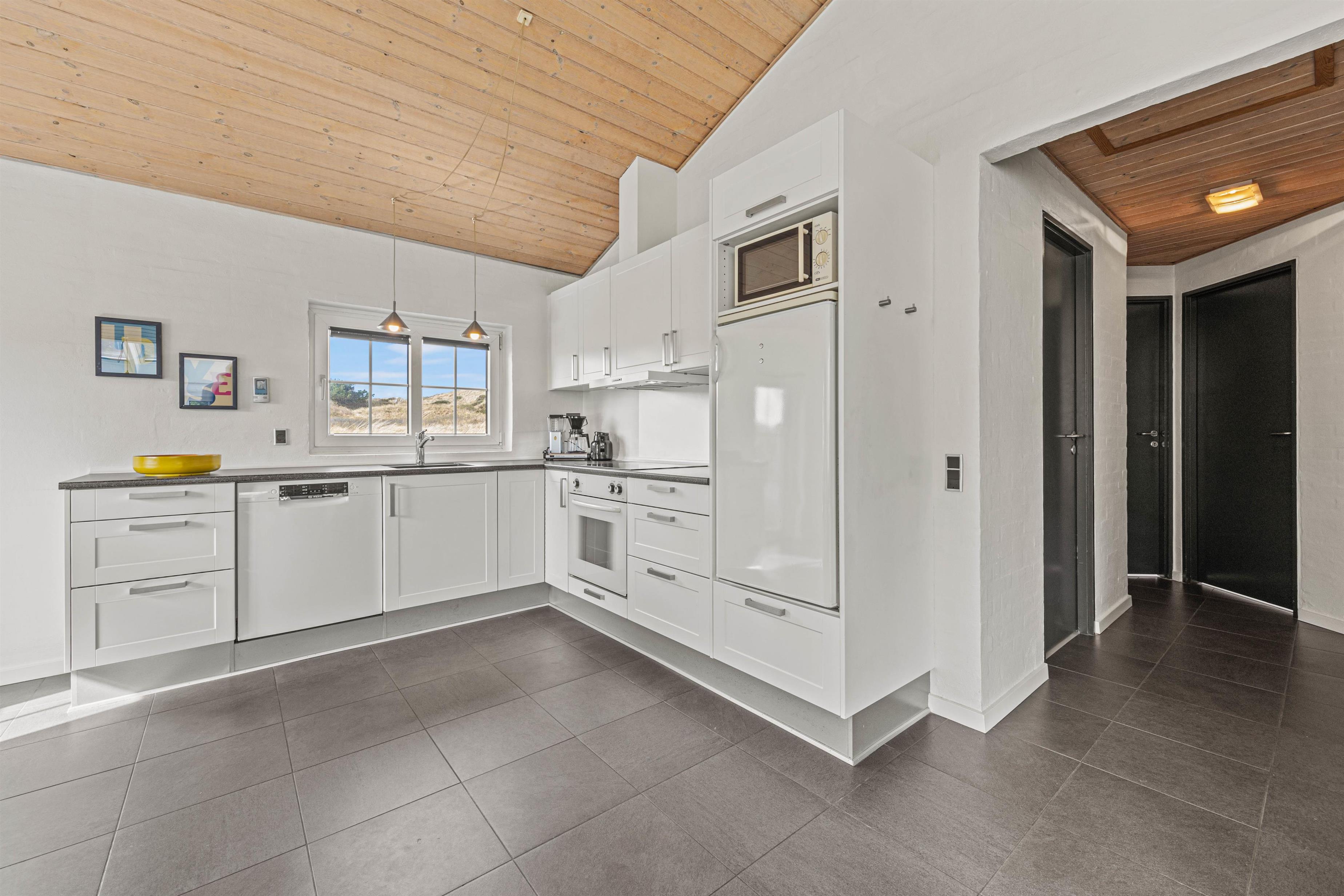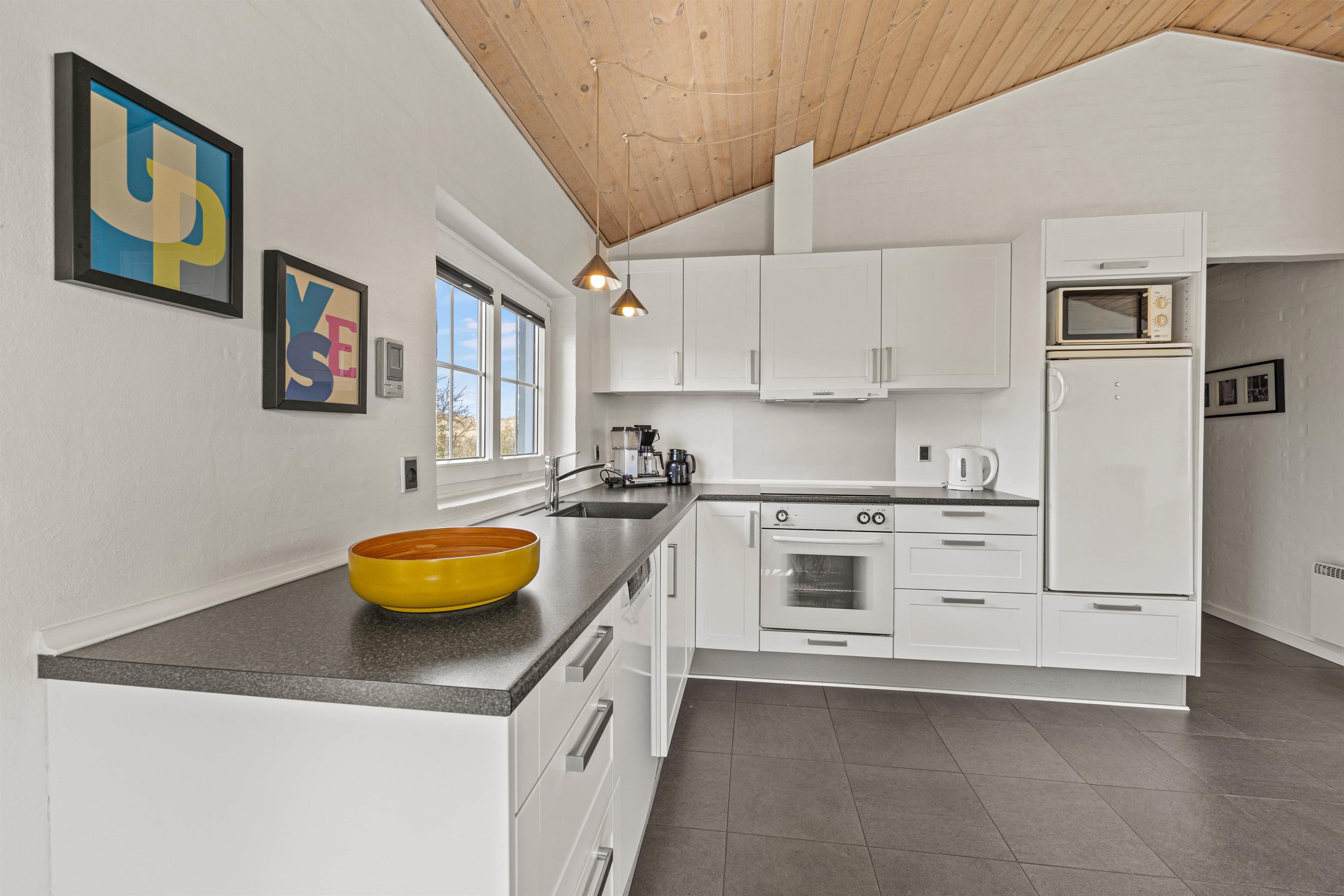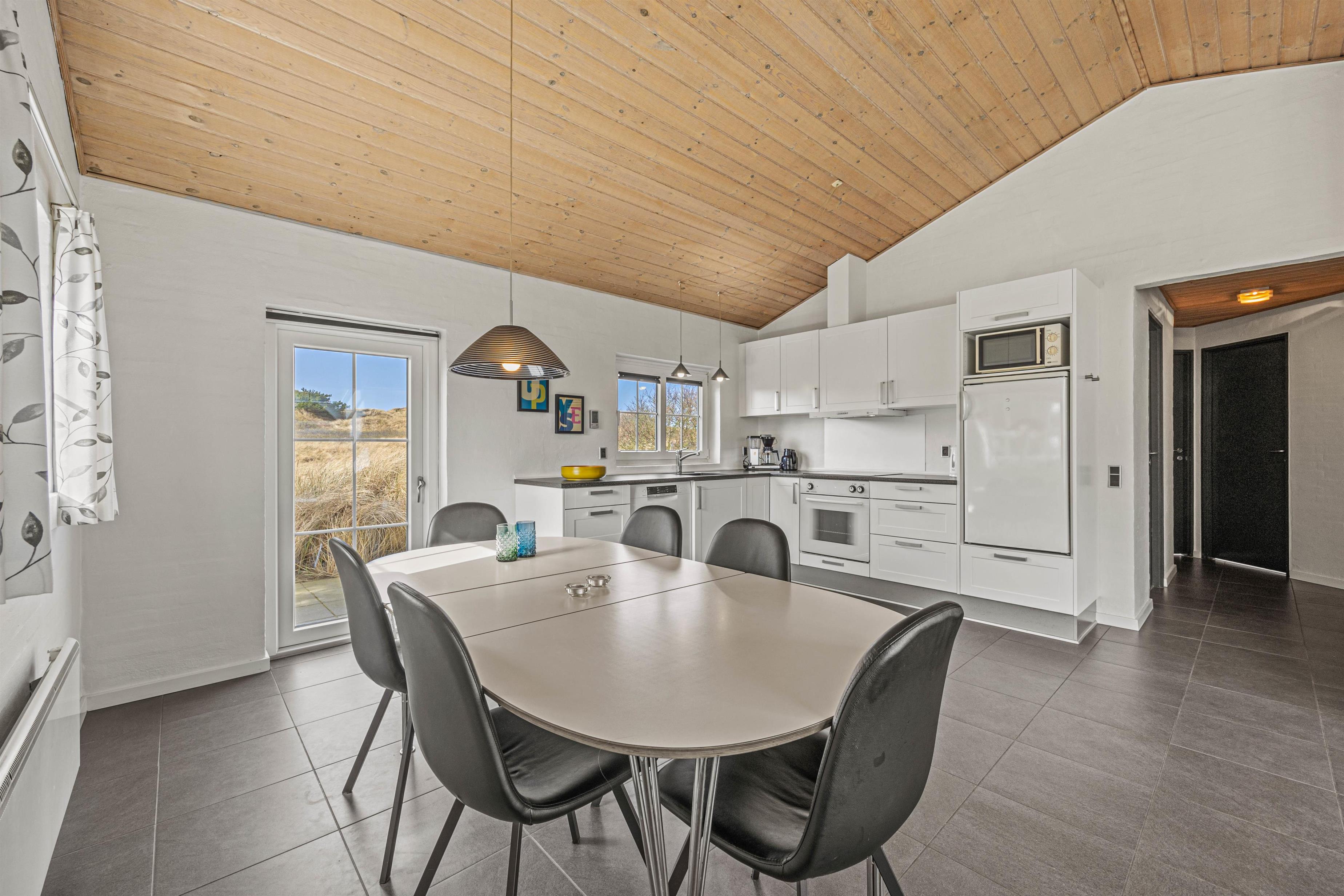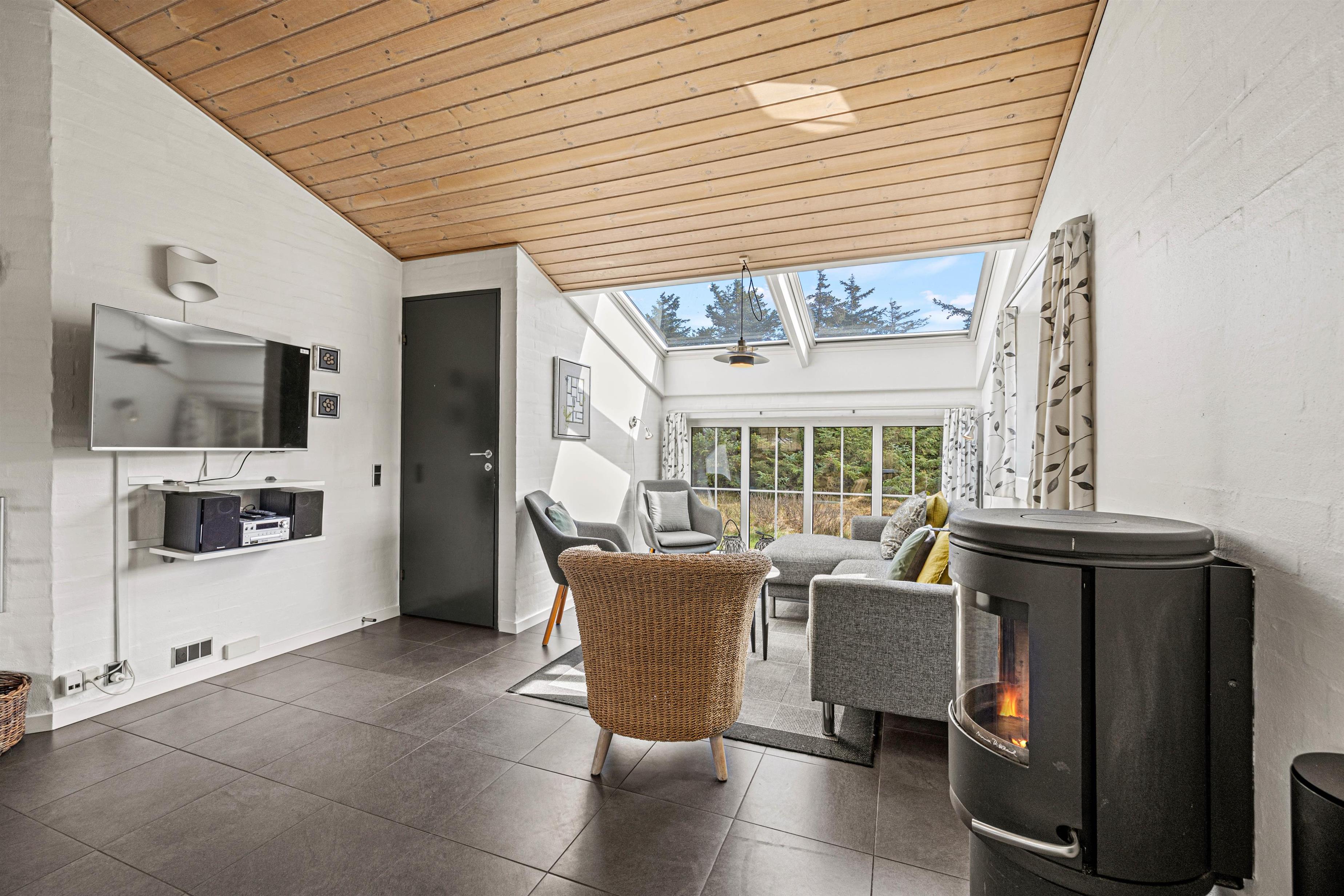 Husets hjerte er det åbne opholdsrum, der forbinder stue og køkkenalrum i ét stort fællesrum. Her står også den hyggelige brændeovn, som spreder varme og god stemning på selv den koldeste feriedag.