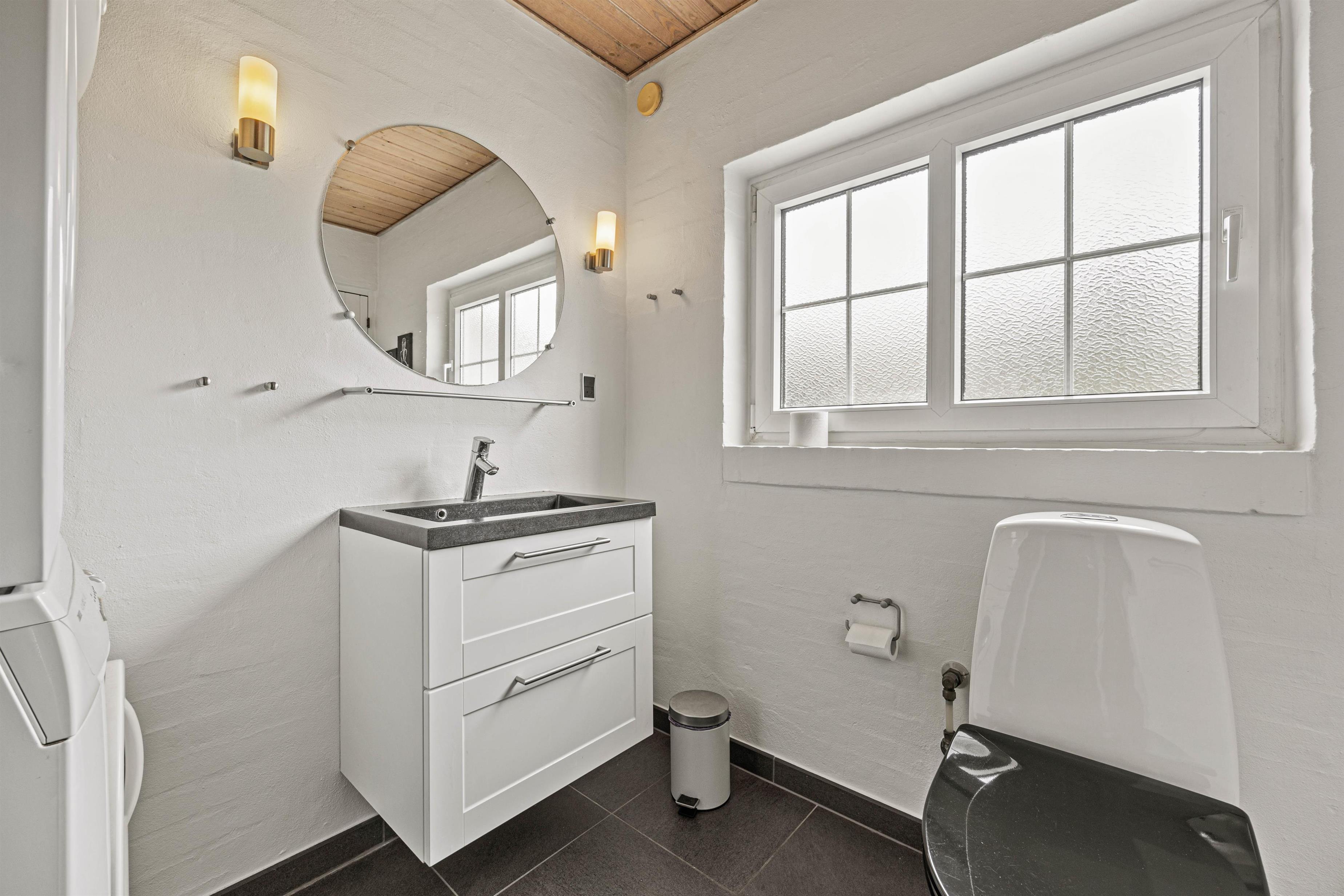 Det gode badeværelse er både udstyret med vaskesøjle, gulvvarme og indgang til husets skønne sauna, hvor I kan nyde lidt ekstra selvforkælelse efter en gåtur langs vandet eller gennem hedelandskabet.