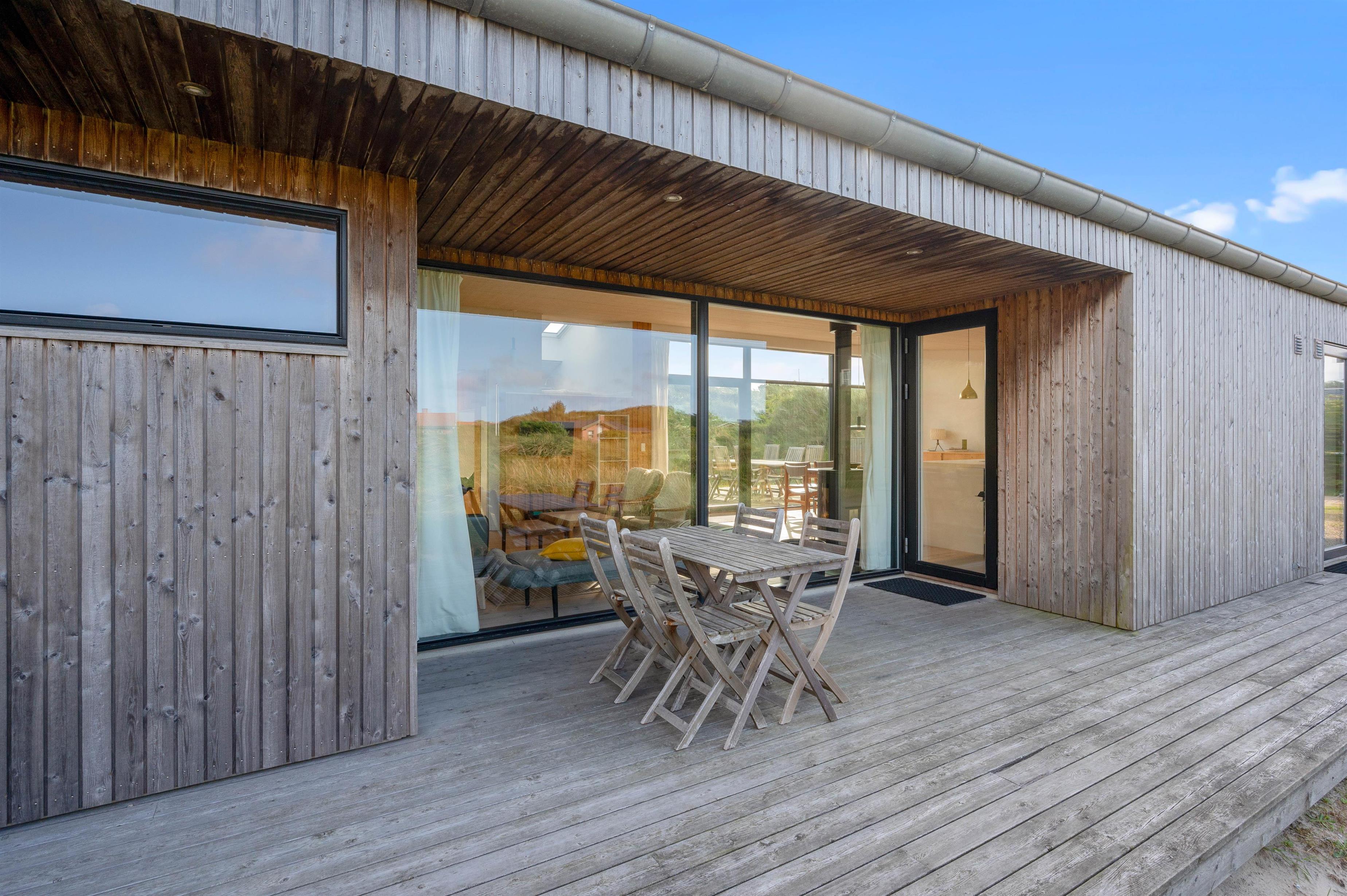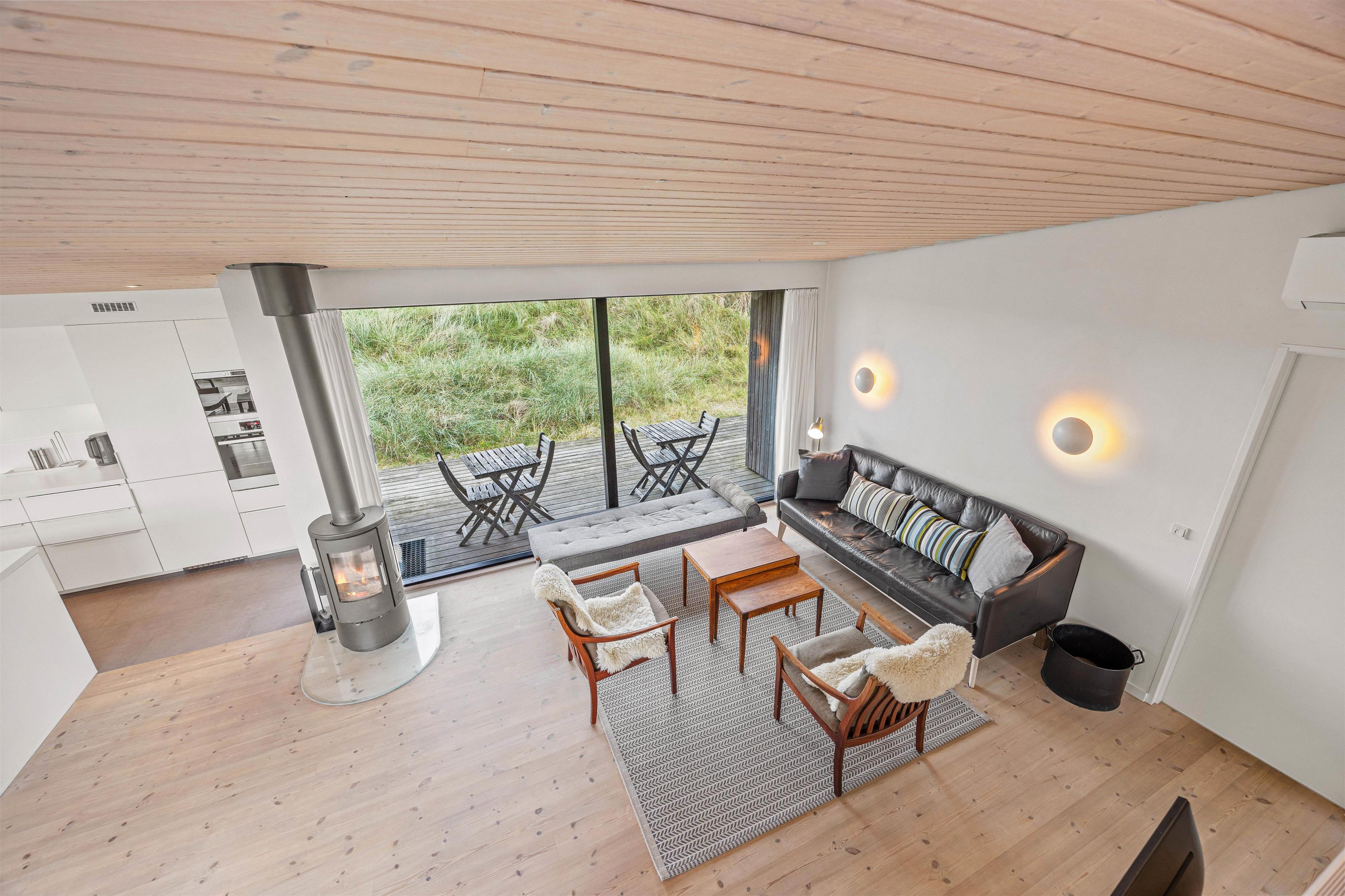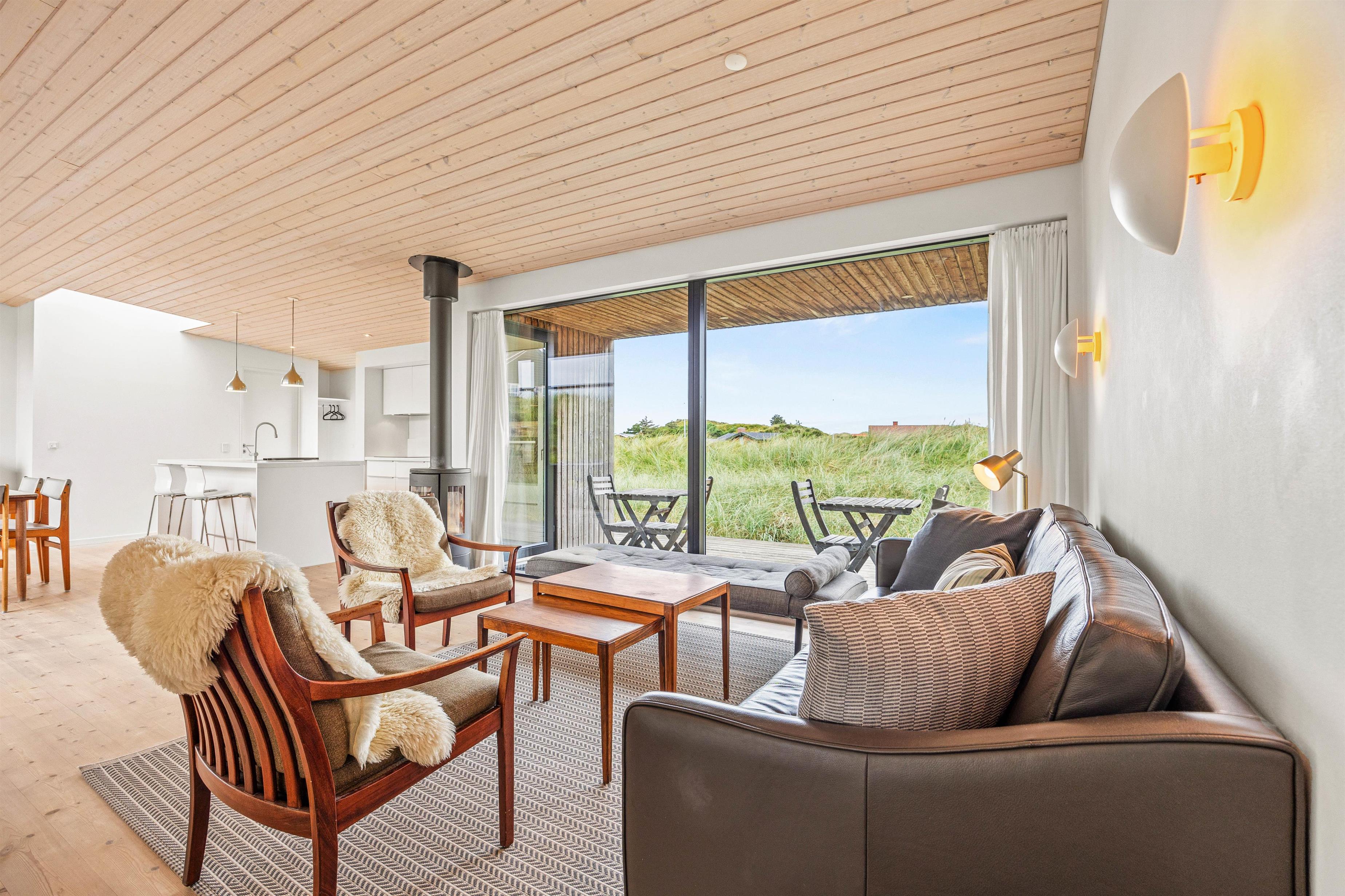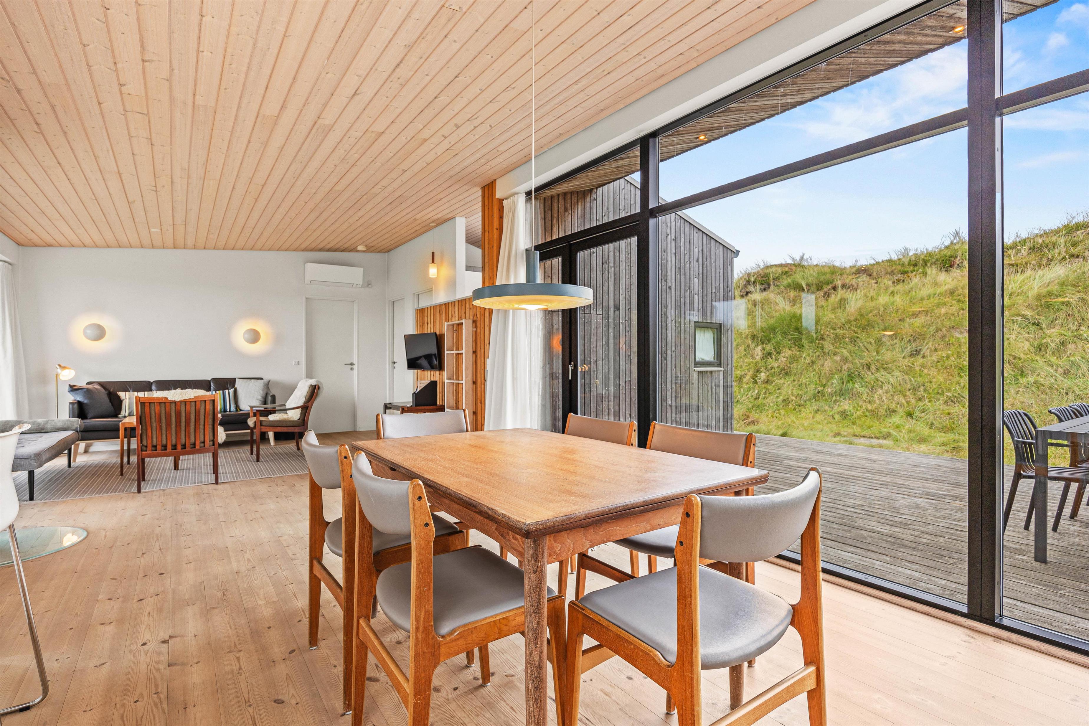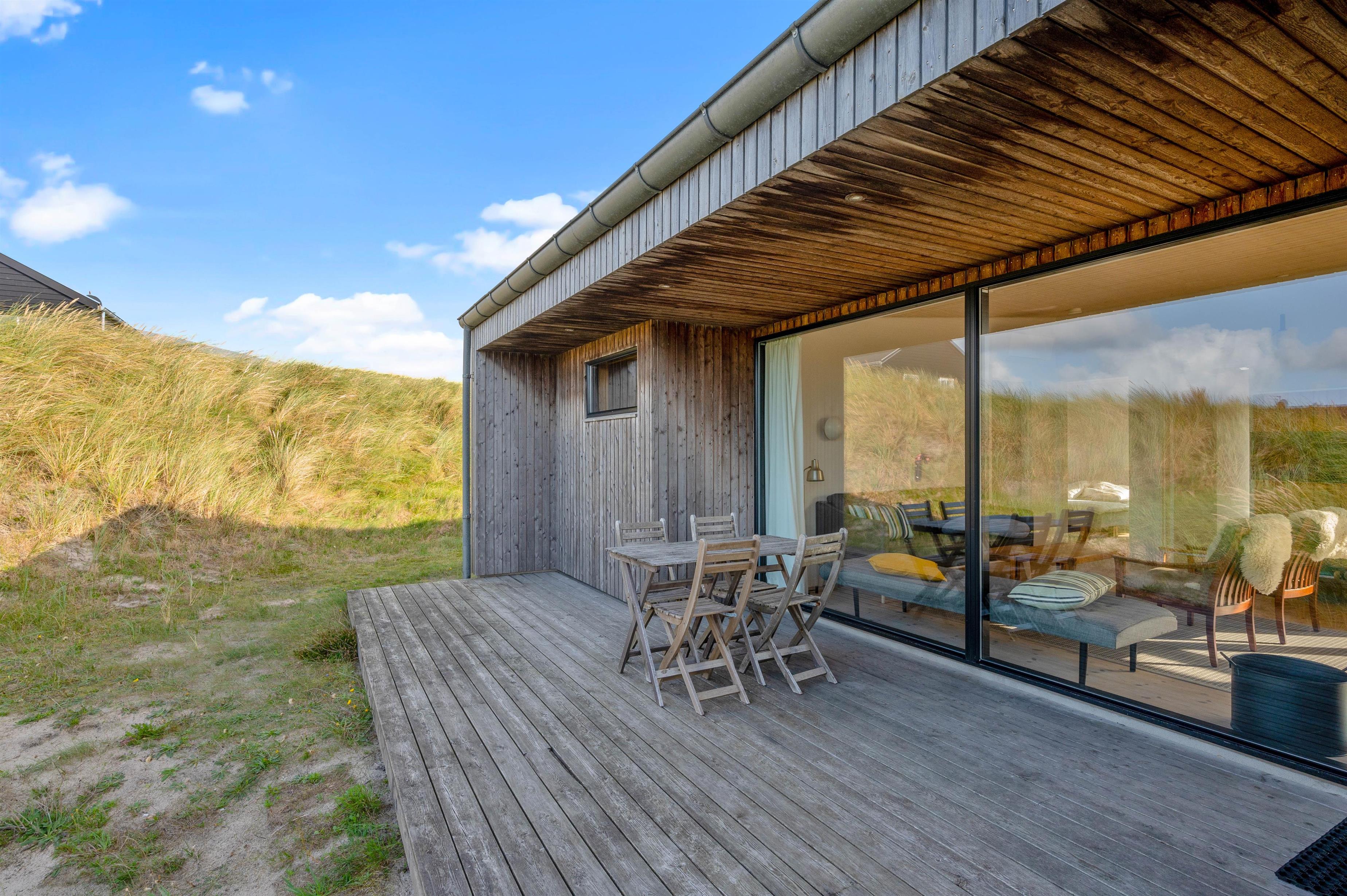 De store vinduespartier og ovenlysvinduer lukker masser af lys ind i sommerhuset, der skaber en god atmosfære at være i, og giver en god udsigt til den omkringliggende natur og de smukke klitter.