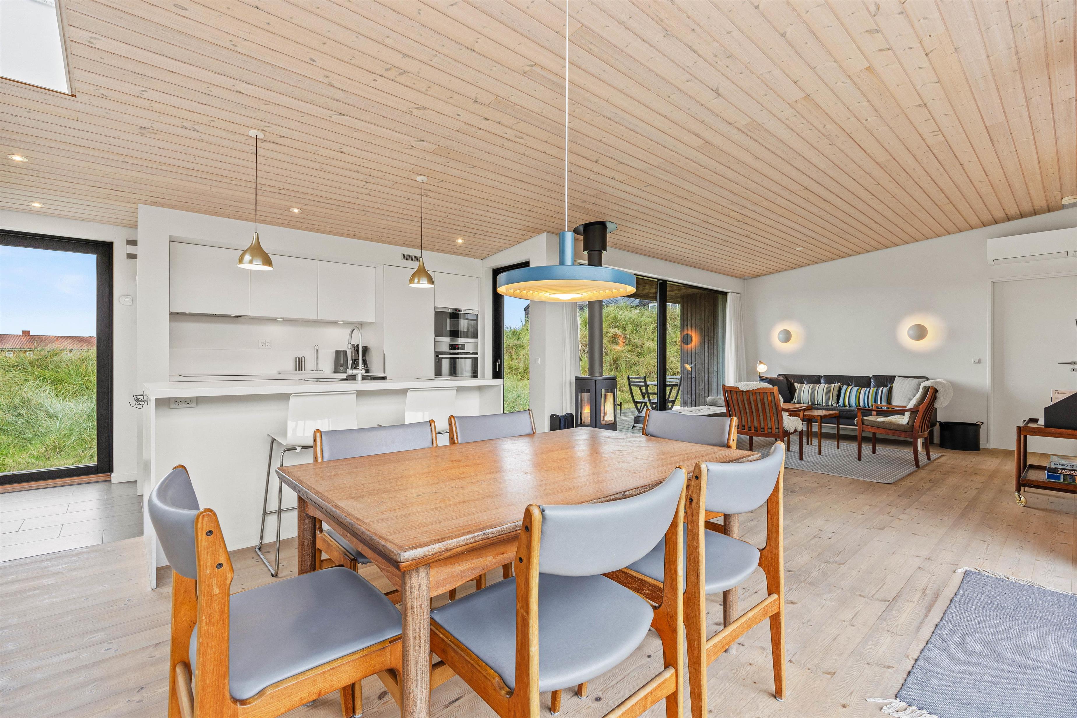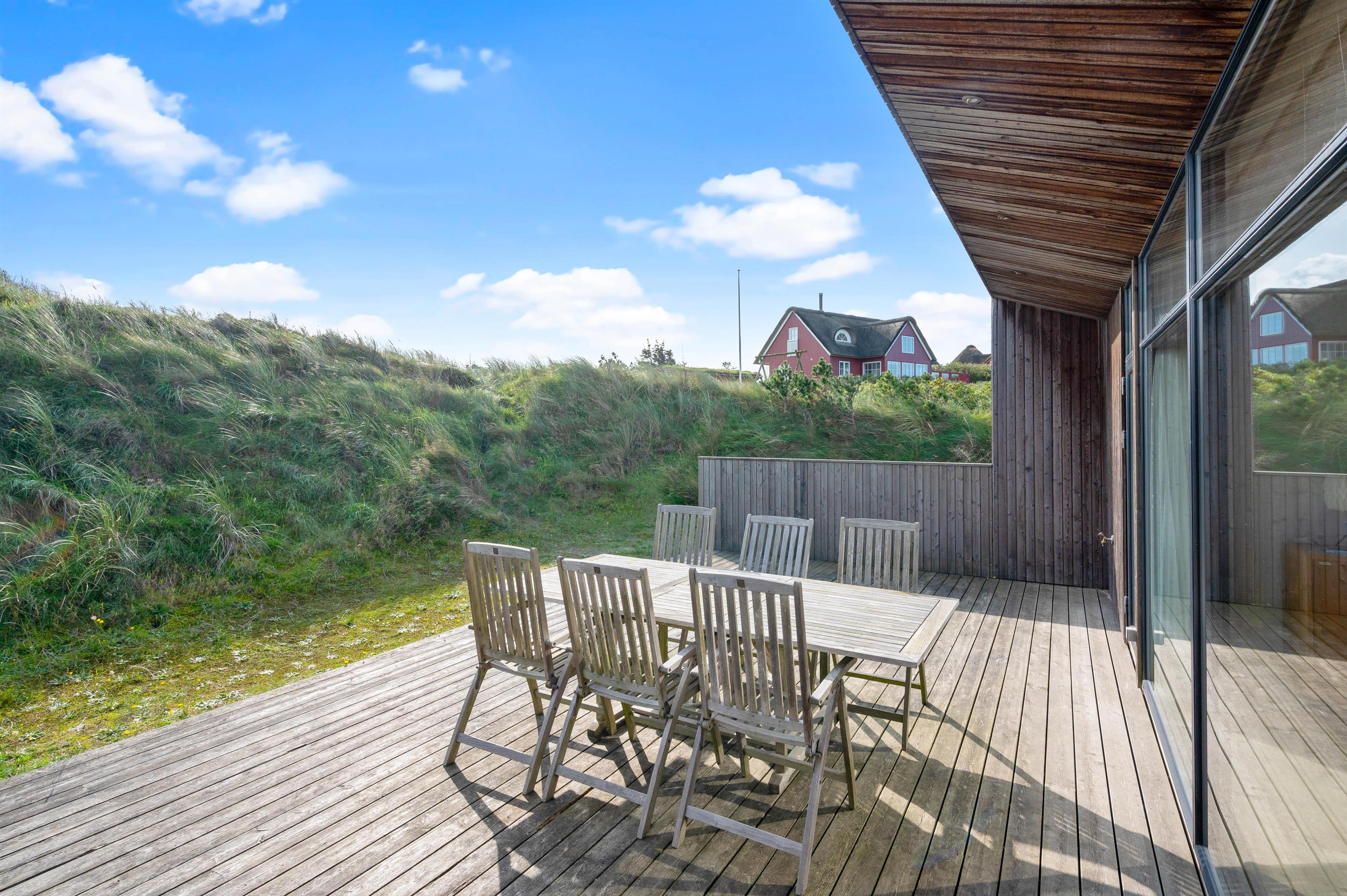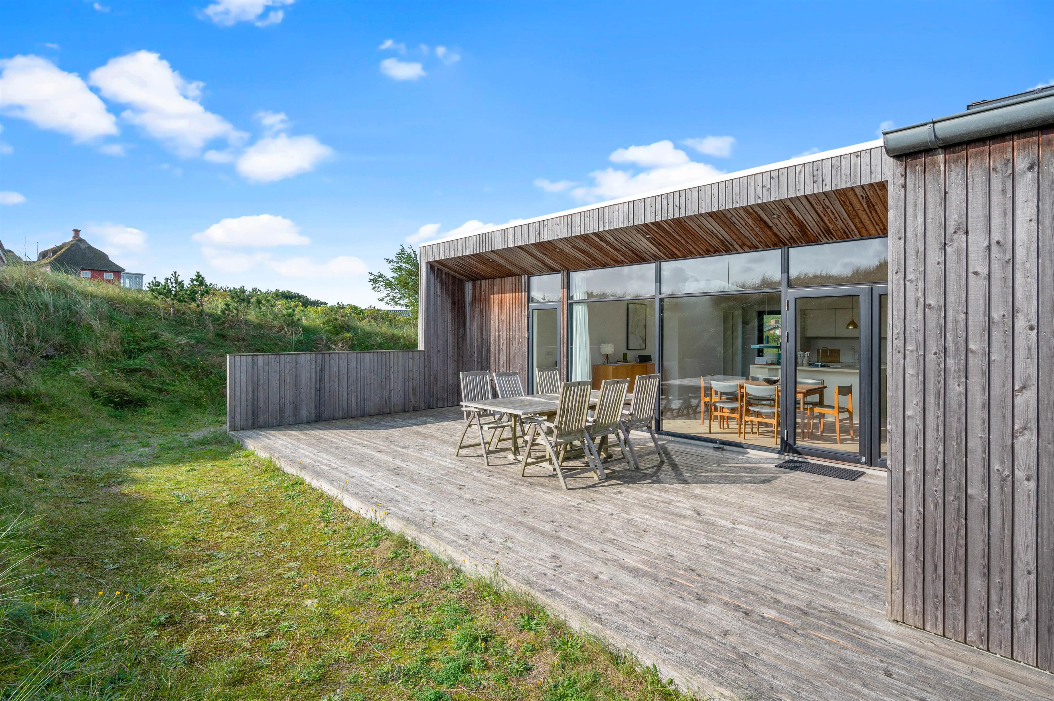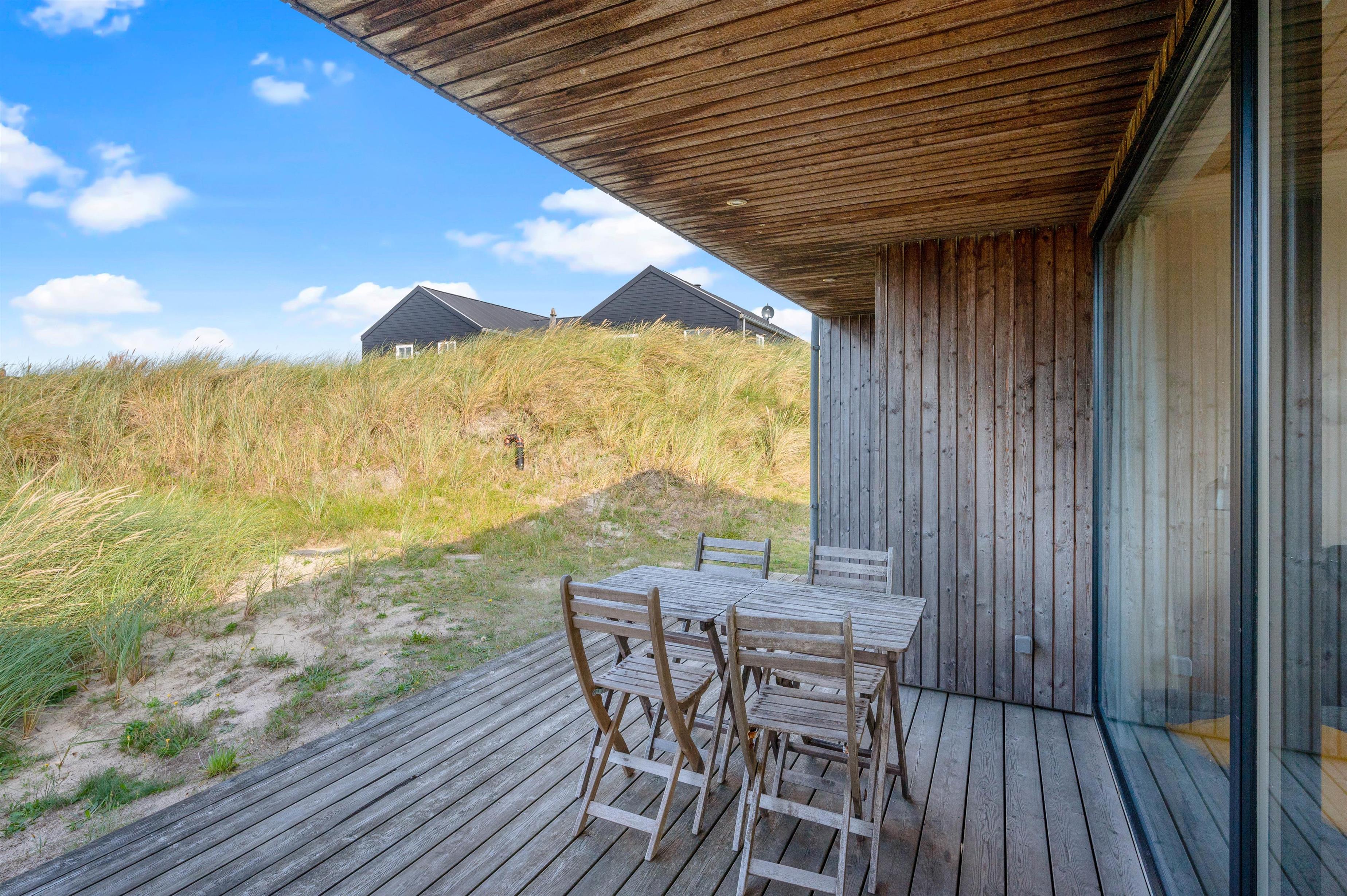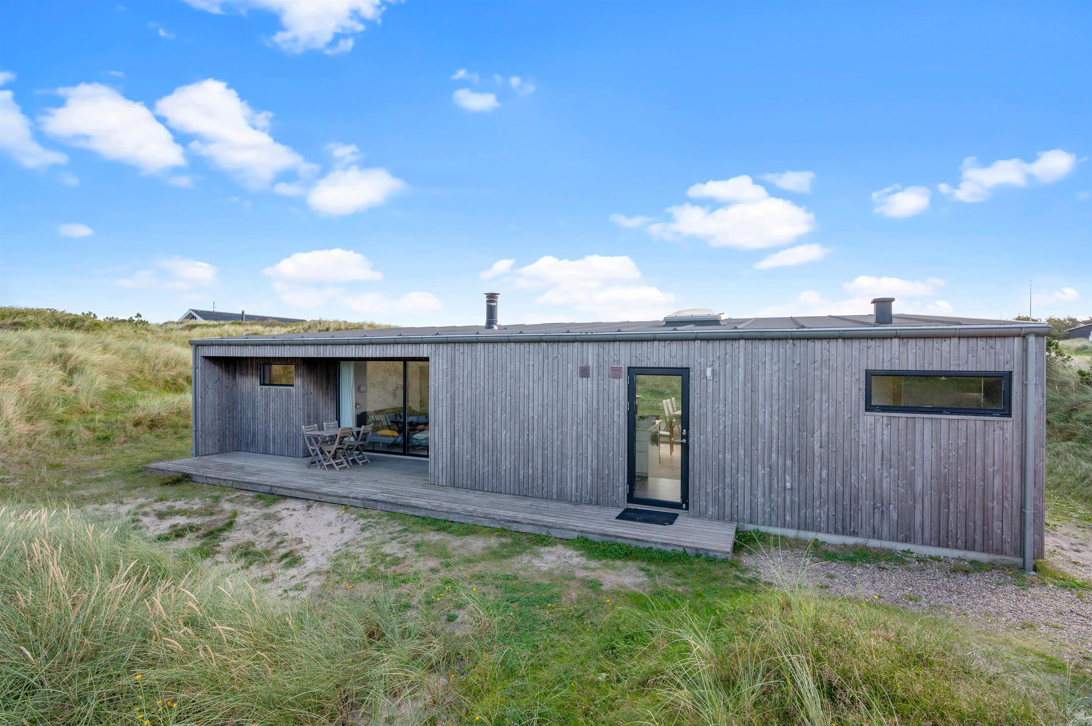 De store vinduespartier og ovenlysvinduer lukker masser af lys ind i sommerhuset, der skaber en god atmosfære at være i, og giver en god udsigt til den omkringliggende natur og de smukke klitter.
